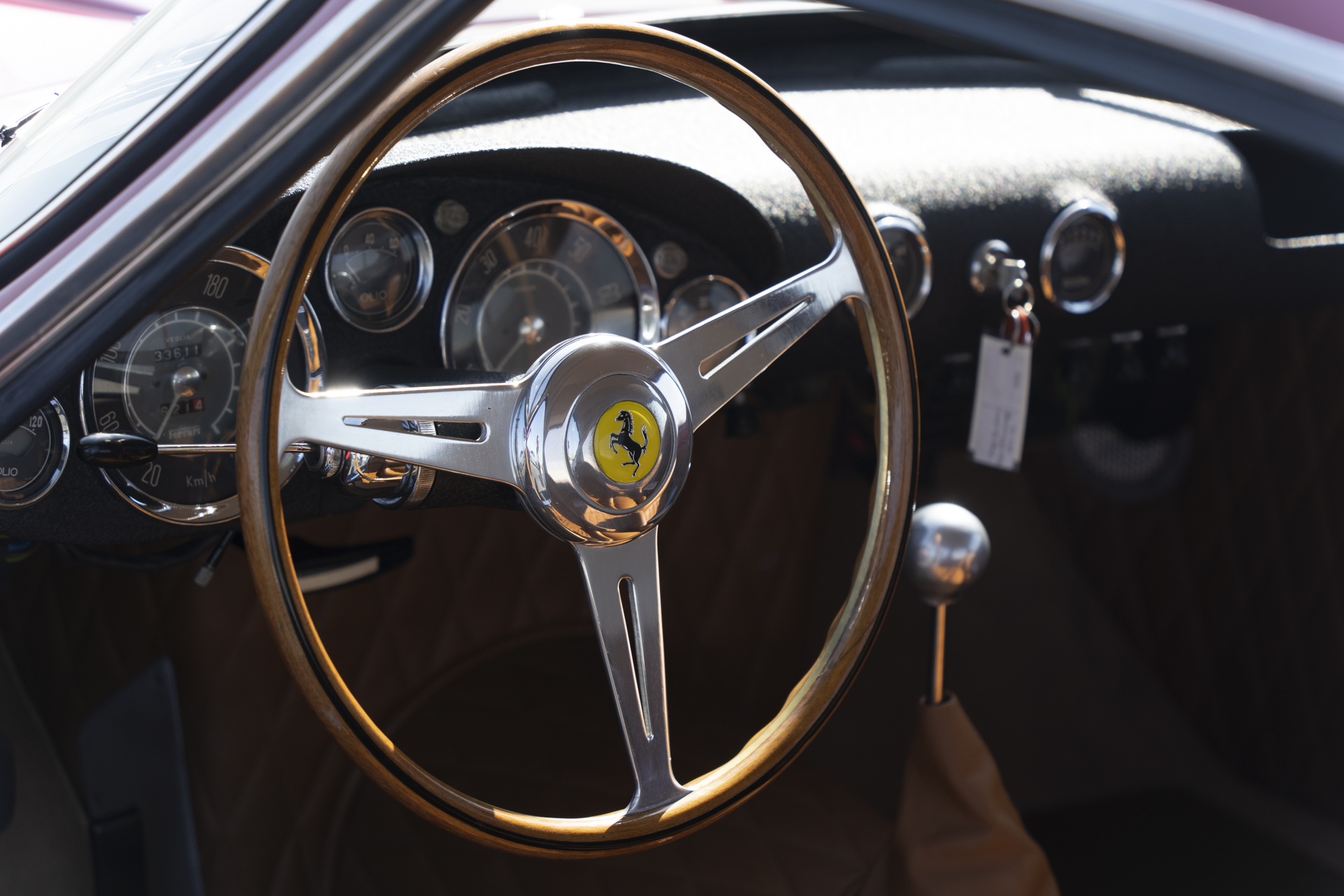 The interior is a journey back in time to performance racing with just enough GT flavor embodied in the leather finishes and properly stitched diamond panels. The correct leather straps and proper buckles lay out along the rear package shelf while the diamond pattern continues into the center console. The seats feature a unique and novel side bolstering construction, allowing more lateral support in cornering (a relatively new feature for cars of this period). The door panels are finely finished with leather, adorned with window cranks, door handles, and delicately sculpted door pulls. The correctly finished black crinkle dashboard houses an array of excellent instruments with highly contrasting dial faces and wonderfully restored nomenclature. An array of correct toggle switches and accessory features continue to delight the eye. The beautifully restored steering wheel stands proud, emblematic of the Ferrari brand, while paying homage to the heritage of great cars that contribute to this lineage of sports cars. Overall the interior presents excellent finishes with little to no signs of use, only as intended when driven to shows or special events.