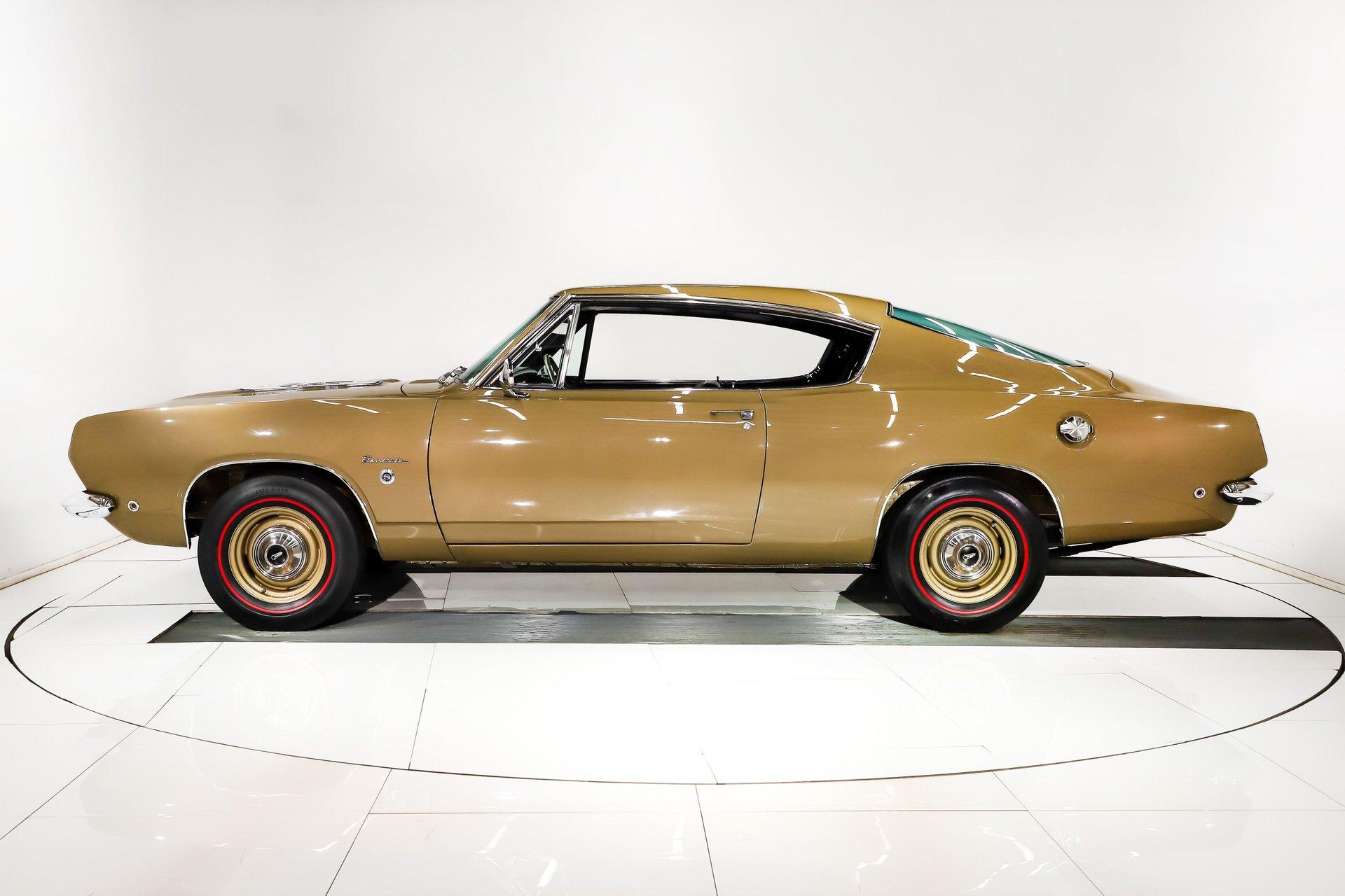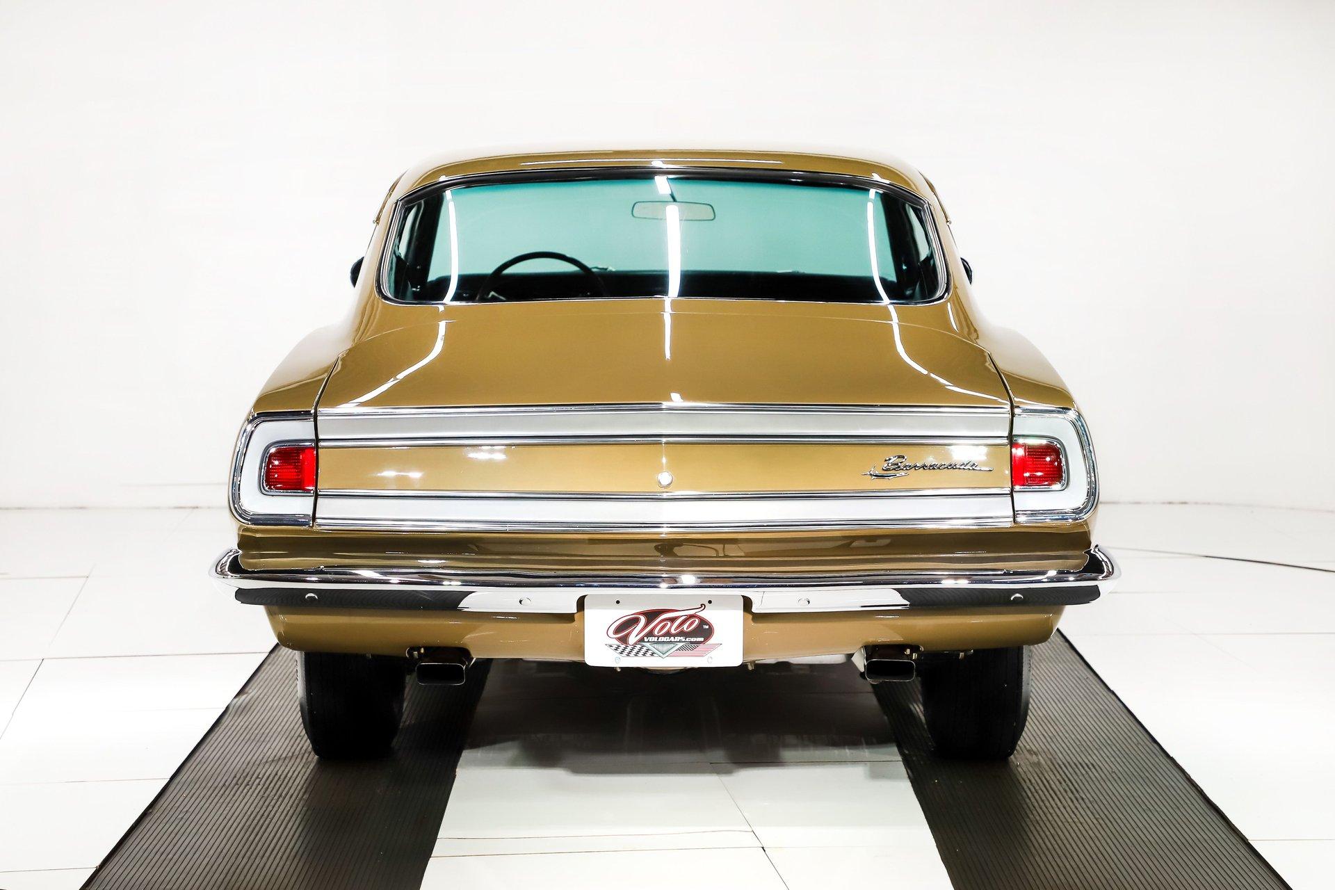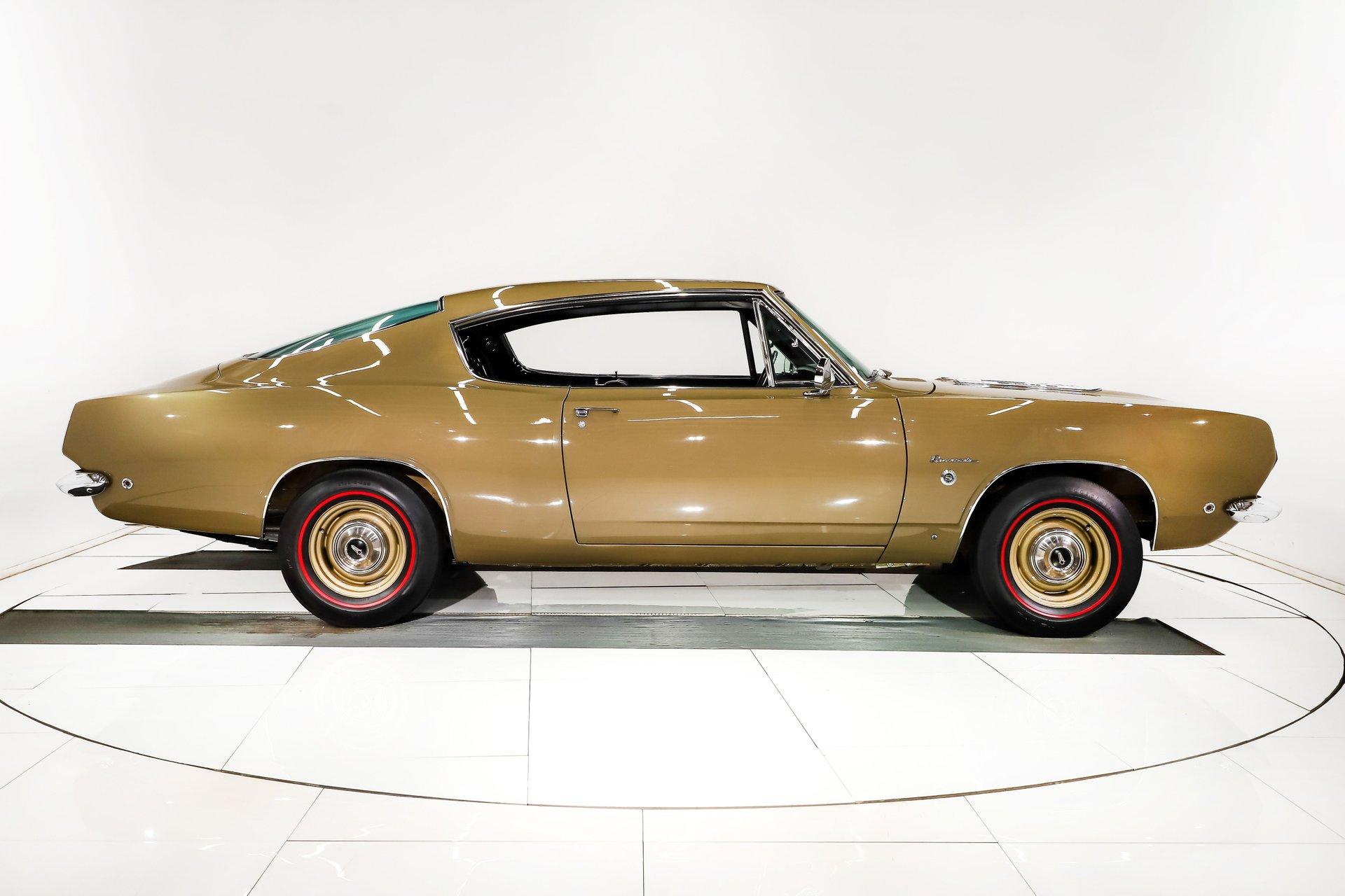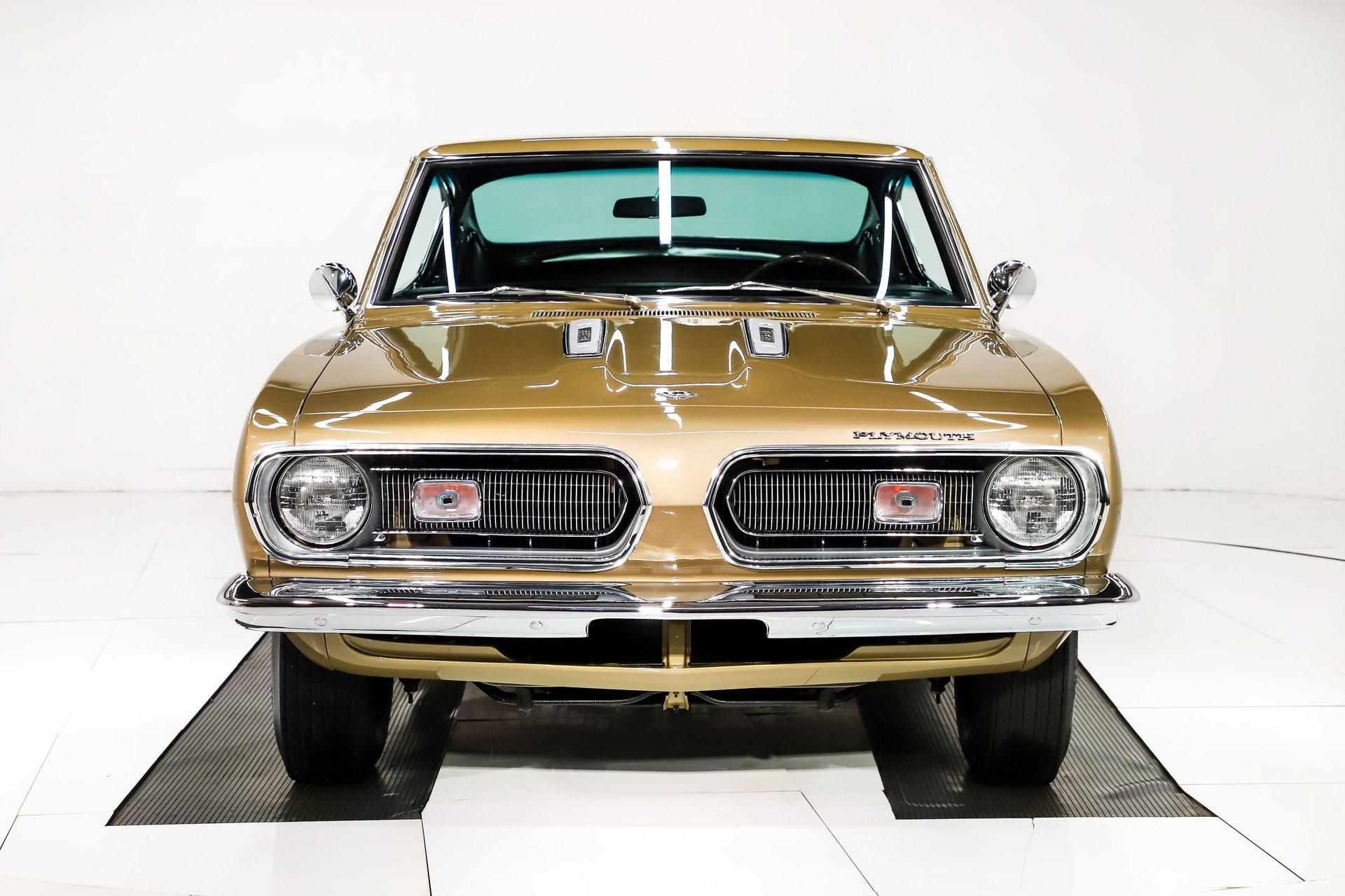 Rotisserie restored, detailed and dialed in! Rare Formula S with a 383 big block. Only 1,120 Barracudas were made with the 383 motor, this is 1 of 395 fastbacks with an automatic. The numbers stamped on the motor and trans match, the fender tag is still attached. This was Plymouth's pony car, same category as the Camaro and the Mustang. EXTERIOR: Great looking fastback roofline. Outstanding fit and finishes. Absolutely laser straight, no rust or damage. The gaps are precise, doors shut like new. Repainted it's original Ember Gold color. It's better than new, show quality glass finish. The Formula S has the chrome inserts on the hood, pop up gas cap and emblems on the fenders. All the chrome is mint, stainless is polished. Grills and tail panel are mint. Weather strips and seals were replaced. New windshield. Painted to match rims with poverty caps and new reproduction redline tires. INTERIOR: It's like new. Premium Legendary upholstery and door panels. The dash area is mint: knobs, trim, gauges, dash pads etc. It's aradio delete but hasa modern stereo below the dash. Very nice original console between the bucket seats. The rear seat folds flat, a 2+2! The deluxe wheel is restored like new. Interior lights work. ENGINE COMPARTMENT: The original VIN number matching Super Commando 383-300 hp was rebuilt and has some upgrades. It has a hotter cam, aluminum intake with a 750 Holley carb, electronic ignition and Jet Hot coated headers. Every component looks new. It has a reproduction Mopar battery bolted down properly. Correct radiator, shroud, clamps etc. The fender tag is attached and matches the car. The metal is as slick as the outside. It's a very detailed, show quality engine compartment. TRUNK COMPARTMENT: Under the lid, the jamb and the inside are painted slick. Under the mat is a matching painted rim and redline tire. New mat and weather strip. It opens into the interior. UNDERSIDE: This car is flipped on a rotisserie, every component was removed from the under the car. The floors are pristine metal prepped and painted Ember Gold. Every single component was rebuilt or restored and then reinstalled. These come with a special ride and handling package. The suspension front and back is completely rebuilt, upgraded with Koni gas shocks all around. The steering was rebuilt. The brake system was all rebuilt and it does have four piston disc brakes in front. The e-brake is all hooked up. The fuel system was replaced, the tank and the lines. It has stainless exhaust with x-pipe. Looking up at the motor it is spotless, starter looks new. The 727 Torqueflite was rebuilt and has a shift kit and a 2500 stall converter. The drive shaft was rebuilt, new u-joints. The rear end is an 8 3/4 with 3.23 Sure Grip gears. SERVICE: We inspected this car and it passed with flying colors, we took care of a couple rattles and that was all we found. This is from a very fussy seller. His cars are always showroom ready and dialed in mechanically. It's one of the exceptional ones. The new owner will be very happy. I, Jay Grams, take pride in personally writing the descriptions for virtually every car for about the last 30 years now. A significant amount of effort goes into fact checking. What I am offering is my professional impression of the vehicle. Our salesmen are happy to assist with descriptions and making sure your questions are answered. One great suggestion is letting us do a walk around video that explains the car's condition in detail. **These cars are displayed in a museum. If interested in a particular car make an appointment with a salesman to see that car. Without an appointment there is an admission fee to enter the showroom. If you buy a car, your admission will be refunded and you will be given a 1 year membership. 815 385 3644 9-5 central Sales@volocars.com Answered ASAP Disc brakes 3.23 Sure Grip Deluxe wheel Bucket seats Console Deluxe wheel Bluetooth stereo Poverty wheels Redline tires Dual mirrors
