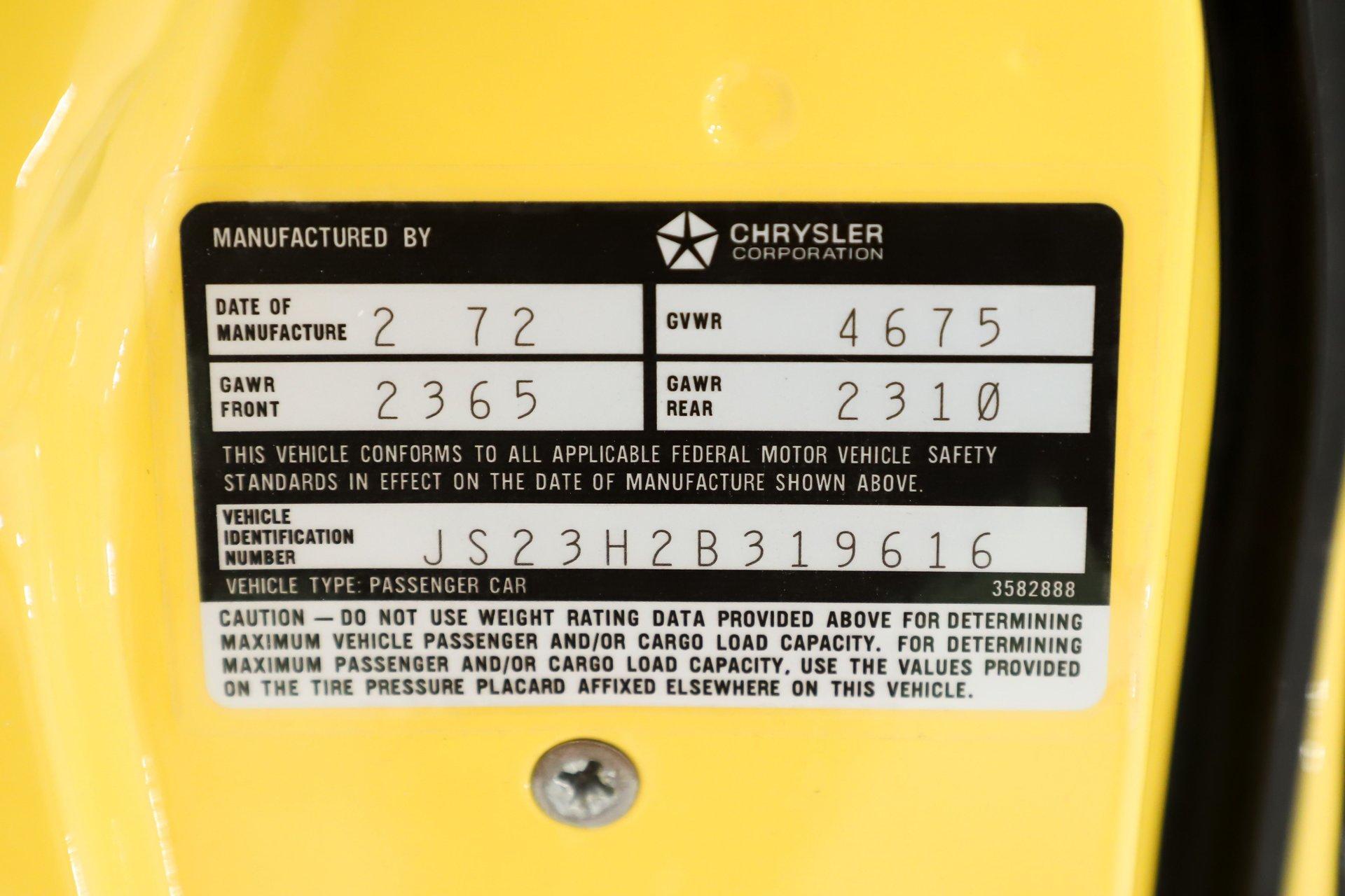 The Rallye replaced the R/T, this was the top dog Dodge of 1972. We just purchased 3 cars from the estate of a collector. Reportedly this car went through a $90,000 rotisserie restoration. It is a high-quality car: fit, finish and function! #s match motor. EXTERIOR: This is a sexy looking car! Great lines, eye popping color and stripes. The fit and finish is amazing, it is really straight. The panels fit precisely, I don't see any rust or damage. Factory the power bulge scooped hood and sport mirrors. The Top Banana Yellow paint is polished smooth like glass. Cool looking strobe stripe decals on each side. The vinyl top is replaced. All the glass is new. Up front the grill is restored, bumper, bezels, rubber fillers are mint. The rear bumper is new. The jambs are painted slick, weather strips and seals were replaced. INTERIOR: It is one of the nicest restored interiors I've seen. All the big items are restored, and all the little pieces look like new. Everything fits right. It has a new dash pad with factory speakers at each corner. It has Rallye gauges. All the wood grain, the heater control knobs, the vents factory AM-FM radio are mint. Even the glove box and ashtray look like new. The steering wheel is not worn. The center console and slap stick shifter arm like new. Seats have good cushions and are reupholstered with no wrinkles. All the side panel plastic trim is excellent. The headliner is excellent, dome light works. Carpet was replaced. ENGINE COMPARTMENT: The engine compartment is pristine. # match 340 motor has a performance rebuild. Upgraded with Edelbrock aluminum heads, Weiand intake, Edelbrock carb with electric choke and a set of coated headers. All the components look fresh and properly installed. It features power steering and power brakes. Runs cool with an aluminum water pump. The radiator, shroud, and clutch fan look new. The engine bay is detailed and painted gloss yellow. TRUNK COMPARTMENT: Under the trunk lid and jamb are glossy. Clean metal inside, no rust or patches that I found. It's all been painted yellow. New mat, weatherstrip, and seat insulation. UNDERSIDE: The front end has been completely rebuilt. All the bushings, ball joints, steering components etc. Upgraded with gas shocks at all 4 corners. In back the springs and bushings have been replaced. The fuel system including the tank was replaced. Custom made dual exhaust with welded joints, cross over pipe Superflow mufflers and the correct square tips going out through the valance. The brakes have been redone. It has disc in front, the e-brake assembly is hooked up. Looking up at the motor it's spotless. The casting codes and date are correct, the matching Vin number is stamped by the oil pan. The correct 727 Torqueflite automatic was rebuilt. In back is a restored 8 3/4 rear end with 3.55 gears. The metal floors and frame rails appear to be rock solid. They have been prepped and given a light undercoat. Nowhere near my most expensive car but it is one of my nicest! Fit, finish, and function are excellent. It's a good looker too. I, Jay Grams, take pride in personally writing the descriptions for virtually every car for about the last 30 years now. A significant amount of effort goes into fact checking. What I am offering is my professional impression of the vehicle. Our salesmen are happy to assist with descriptions and making sure your questions are answered. One great suggestion is letting us do a walk around video that explains the car's condition in detail. **These cars are displayed in a museum. If interested in a particular car, make an appointment with a salesman to see that car. Without an appointment there is an admission fee to enter the showroom. If you buy a car, your admission will be refunded, and you will be given a 1 year membership. 815 385 3644 9-5 central Sales@volocars.com Answered ASAP Power steering Power disc brakes Sport mirrors Strobe stripes Magnum wheels Bucket seats Console Rallye gauges