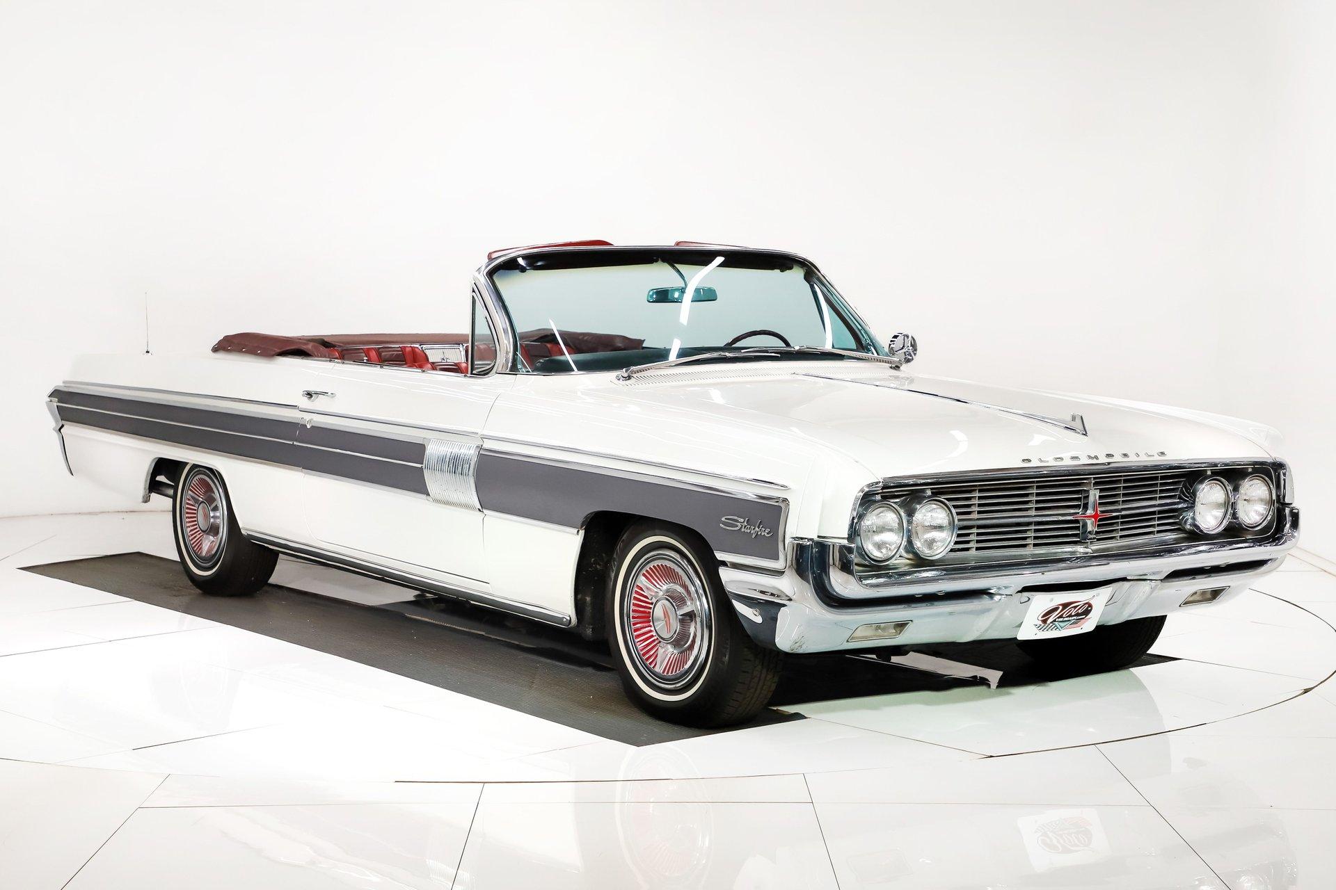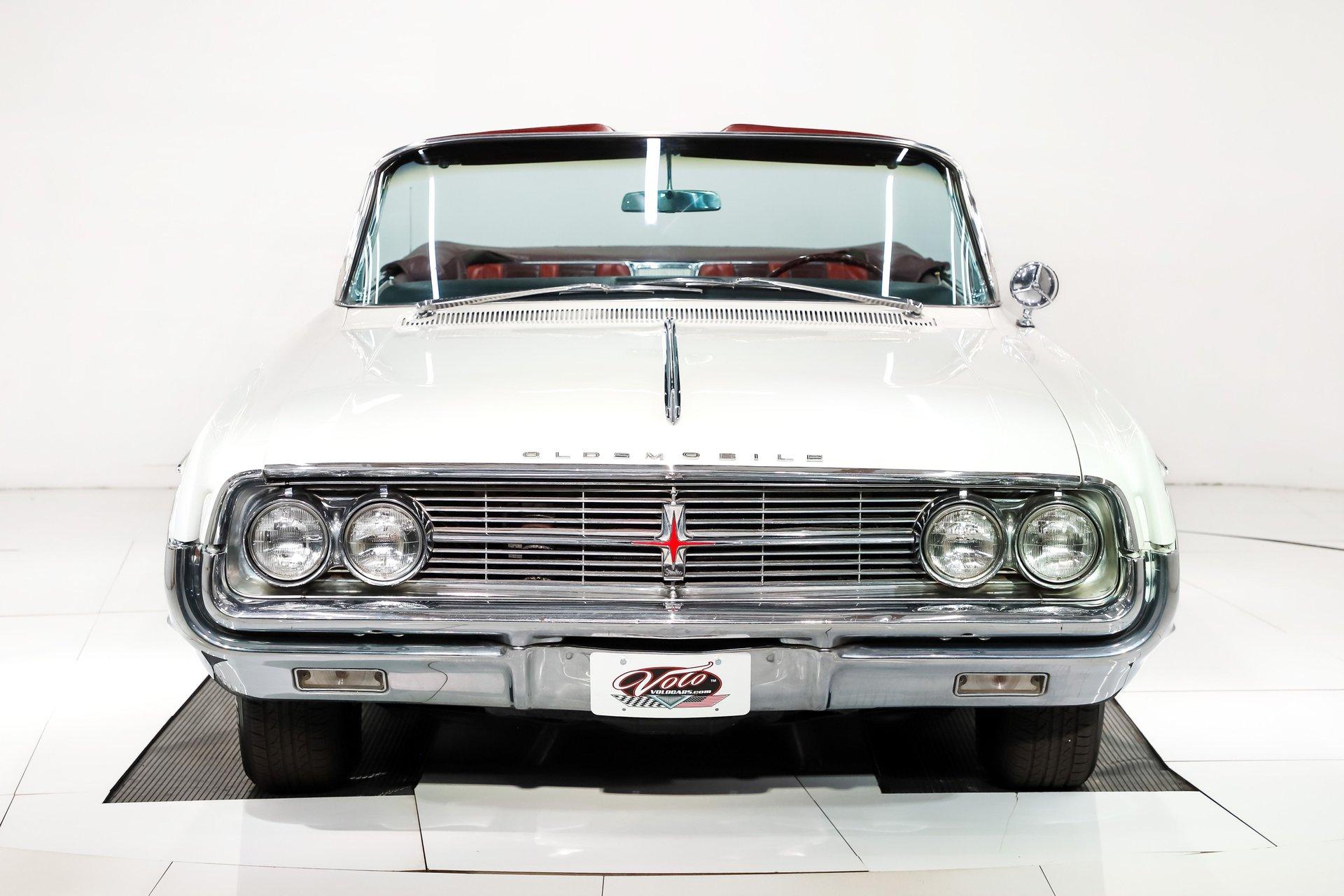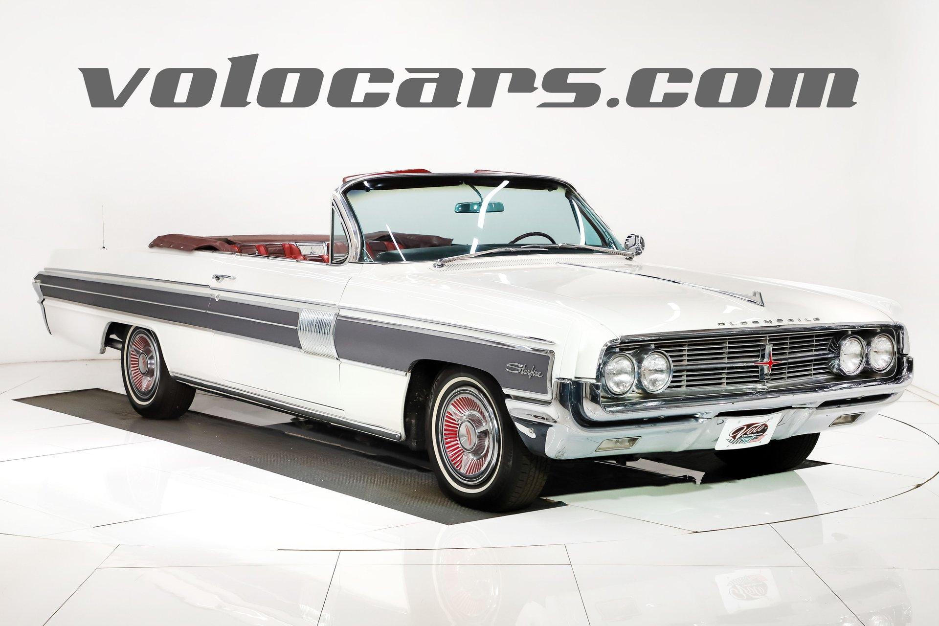 This was the highest price car Oldsmobile had to offer, top of the line! It offers performance and style with a very luxurious interior and unique exterior trim. EXTERIOR: Overall it's a great looking car. I would be proud to go to any cruise night or car show with it. Very solid, straight and fits good. The paint is a white metal flake that is smooth and glossy. It's an older paint job with minor flaws if you look for them. The chrome and trim are original and present nicely. There is a dent in the rear bumper. Original glass, weather strips were replaced. Dark red convertible top looks sharp! INTERIOR: Best part of the car. Someone spent some coin on genuine leather upholstery! The door panels are really stylish, upper panels are new leather. The seats are really cool too; buckets in front and the back is shaped like buckets too. All leather seats including the sides. The dash is also very cool with lots of trim, shapes and check out the clear plastic over the glove box and the cool steering wheel! Even the pedals have style. There is a modern stereo hidden in the glove box. Features include a console with a tachometer, power windows and seat, wonderbar radio, front seat belts and speed warning indicator. ENGINE COMPARTMENT: It has a powerful 394 motor making 345 horsepower. Everything looks stock, complete and proper. Features include factory air conditioning, power steering and power brakes. TRUNK COMPARTMENT: Giant trunk! Under the lid and jamb were repainted. It's lined in felt and has a custom floor panel. Underneath it is the spare and jack. There is also a CD changer and amp too. UNDERSIDE: Underneath the car appears to be solid and maintained as needed. The dual exhaust looks recent with glass pack style mufflers. The fuel tank has been replaced. The front end has been inspected and serviced. The shocks and springs look like they were replaced. The starter was just rebuilt. It has the original Hydramatic trans, the 1962 tag is still attached. SERVICE: We inspected the car and had the starter rebuilt, replaced the valve cover gaskets, gave it an oil change, and repaired a vacuum leak to the brake booster. This is a very unique, stylish car that is sporty and luxurious. Overall, it shows really well and drives beautifully. It has so much more to offer than a common Camaro or Mustang! I, Jay Grams, take pride in personally writing the descriptions for virtually every car for about the last 30 years now. A significant amount of effort goes into fact checking. What I am offering is my professional impression of the vehicle. Our salesmen are happy to assist with descriptions and making sure your questions are answered. One great suggestion is letting us do a walk around video that explains the car's condition in detail. **These cars are displayed in a museum. If interested in a particular car, make an appointment with a salesman to see that car. Without an appointment there is an admission fee to enter the showroom. If you buy a car, your admission will be refunded, and you will be given a 1 year membership. 815 385 3644 9-5 central Sales@volocars.com Answered ASAP Air conditioning Power steering Power brakes Power top Leather upholstery Bucket seats Console Seat belts Speed sentinel Tachometer Power windows Power seat