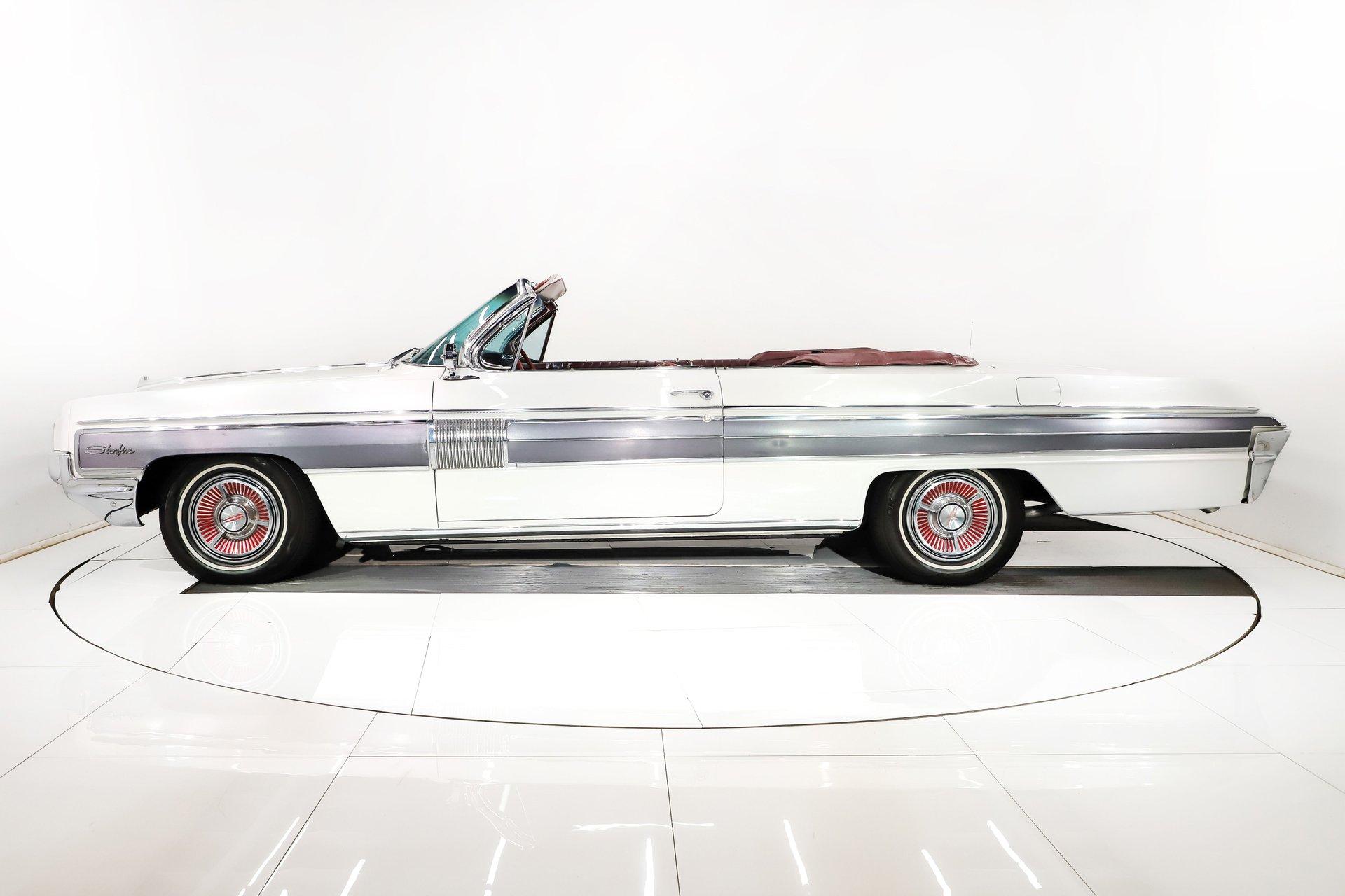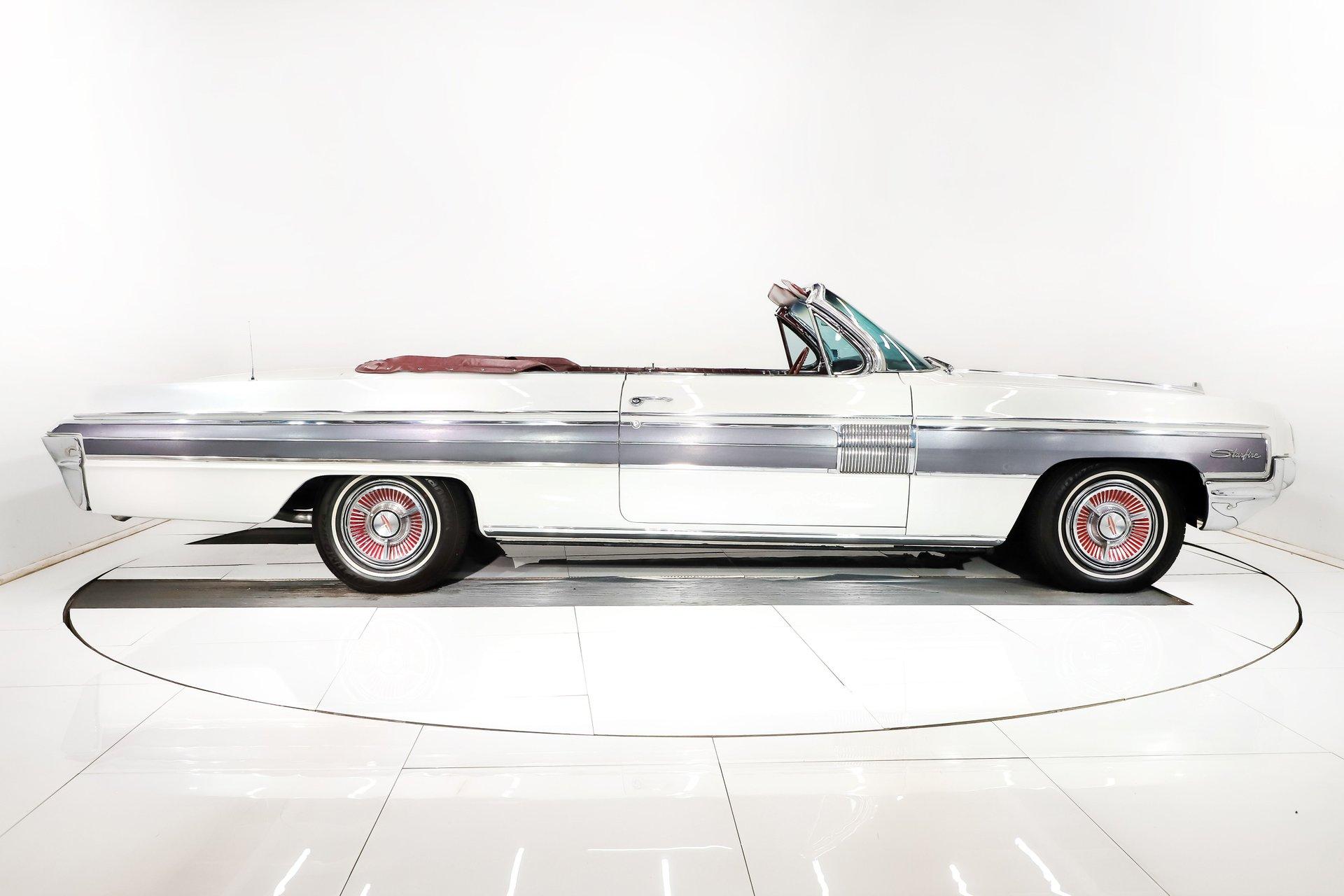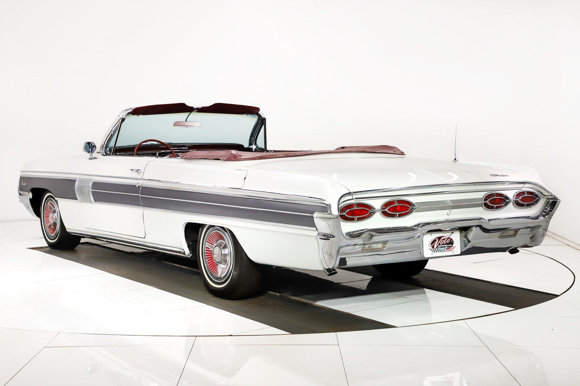This was the highest price car Oldsmobile had to offer, top of the line! It offers performance and style with a very luxurious interior and unique exterior trim. EXTERIOR: Overall it's a great looking car. I would be proud to go to any cruise night or car show with it. Very solid, straight and fits good. The paint is a white metal flake that is smooth and glossy. It's an older paint job with minor flaws if you look for them. The chrome and trim are original and present nicely. There is a dent in the rear bumper. Original glass, weather strips were replaced. Dark red convertible top looks sharp! INTERIOR: Best part of the car. Someone spent some coin on genuine leather upholstery! The door panels are really stylish, upper panels are new leather. The seats are really cool too; buckets in front and the back is shaped like buckets too. All leather seats including the sides. The dash is also very cool with lots of trim, shapes and check out the clear plastic over the glove box and the cool steering wheel! Even the pedals have style. There is a modern stereo hidden in the glove box. Features include a console with a tachometer, power windows and seat, wonderbar radio, front seat belts and speed warning indicator. ENGINE COMPARTMENT: It has a powerful 394 motor making 345 horsepower. Everything looks stock, complete and proper. Features include factory air conditioning, power steering and power brakes. TRUNK COMPARTMENT: Giant trunk! Under the lid and jamb were repainted. It's lined in felt and has a custom floor panel. Underneath it is the spare and jack. There is also a CD changer and amp too. UNDERSIDE: Underneath the car appears to be solid and maintained as needed. The dual exhaust looks recent with glass pack style mufflers. The fuel tank has been replaced. The front end has been inspected and serviced. The shocks and springs look like they were replaced. The starter was just rebuilt. It has the original Hydramatic trans, the 1962 tag is still attached. SERVICE: We inspected the car and had the starter rebuilt, replaced the valve cover gaskets, gave it an oil change, and repaired a vacuum leak to the brake booster. This is a very unique, stylish car that is sporty and luxurious. Overall, it shows really well and drives beautifully. It has so much more to offer than a common Camaro or Mustang! I, Jay Grams, take pride in personally writing the descriptions for virtually every car for about the last 30 years now. A significant amount of effort goes into fact checking. What I am offering is my professional impression of the vehicle. Our salesmen are happy to assist with descriptions and making sure your questions are answered. One great suggestion is letting us do a walk around video that explains the car's condition in detail. **These cars are displayed in a museum. If interested in a particular car, make an appointment with a salesman to see that car. Without an appointment there is an admission fee to enter the showroom. If you buy a car, your admission will be refunded, and you will be given a 1 year membership. 815 385 3644 9-5 central Sales@volocars.com Answered ASAP Air conditioning Power steering Power brakes Power top Leather upholstery Bucket seats Console Seat belts Speed sentinel Tachometer Power windows Power seat