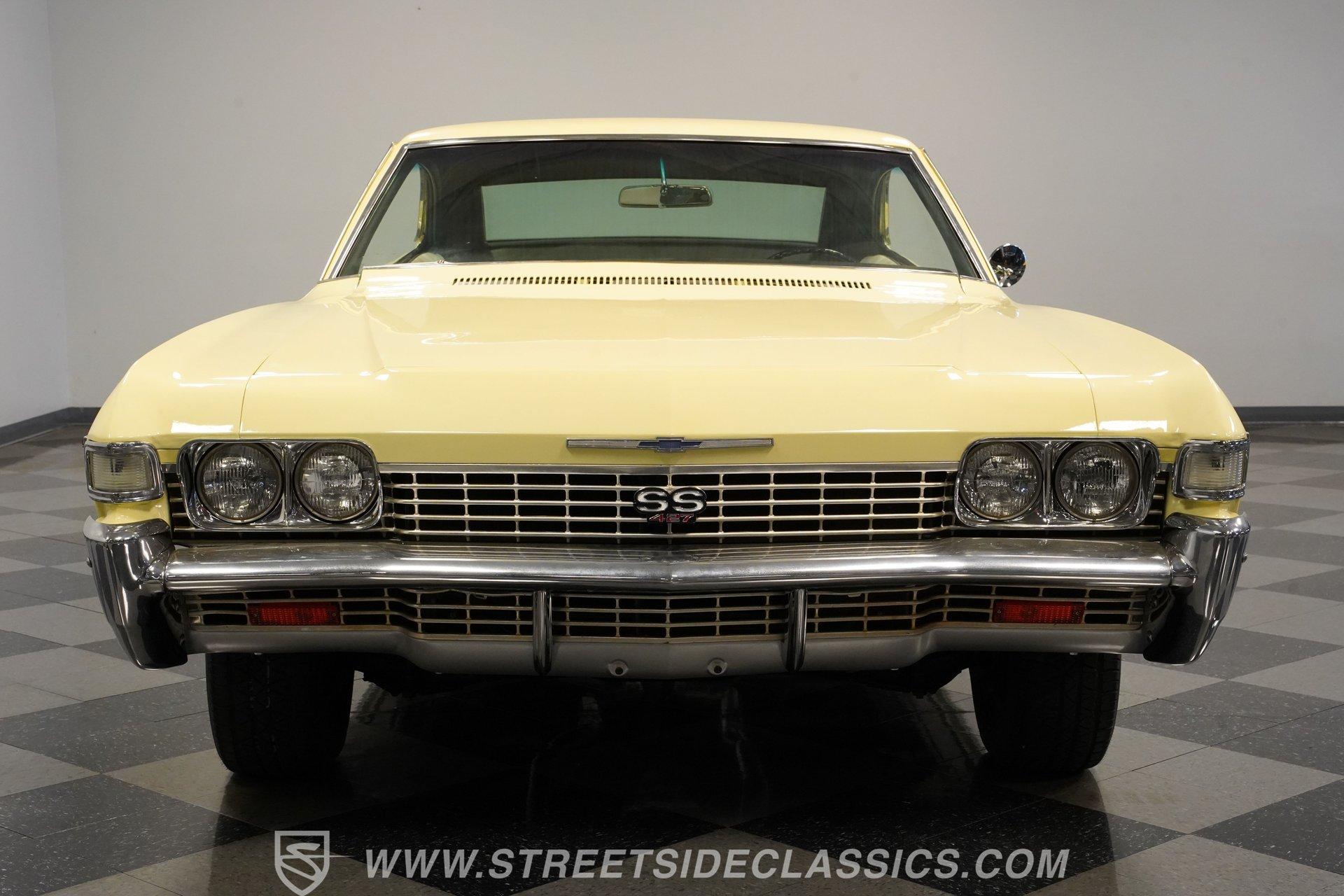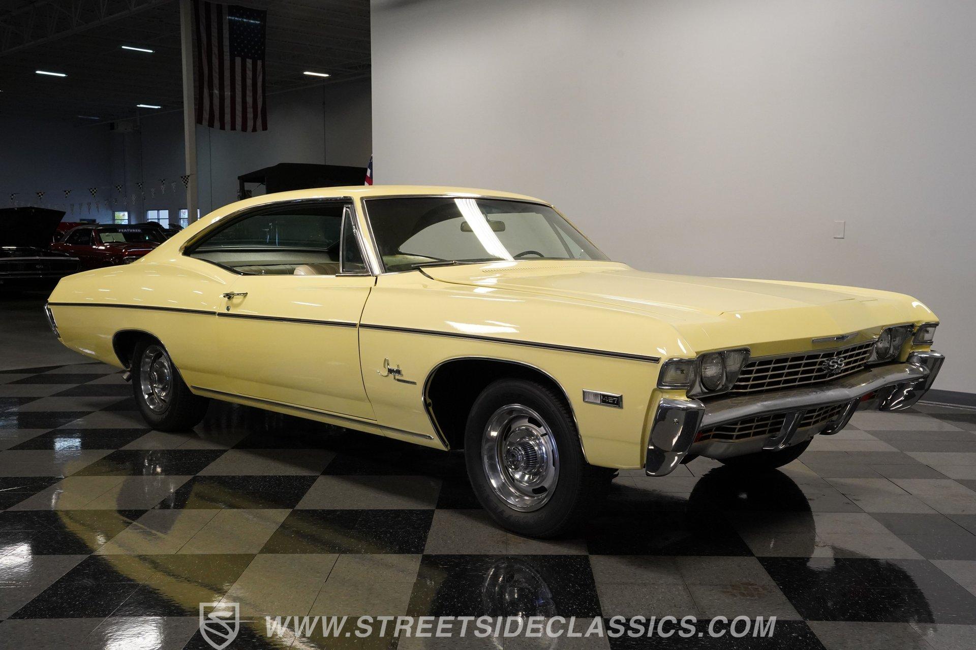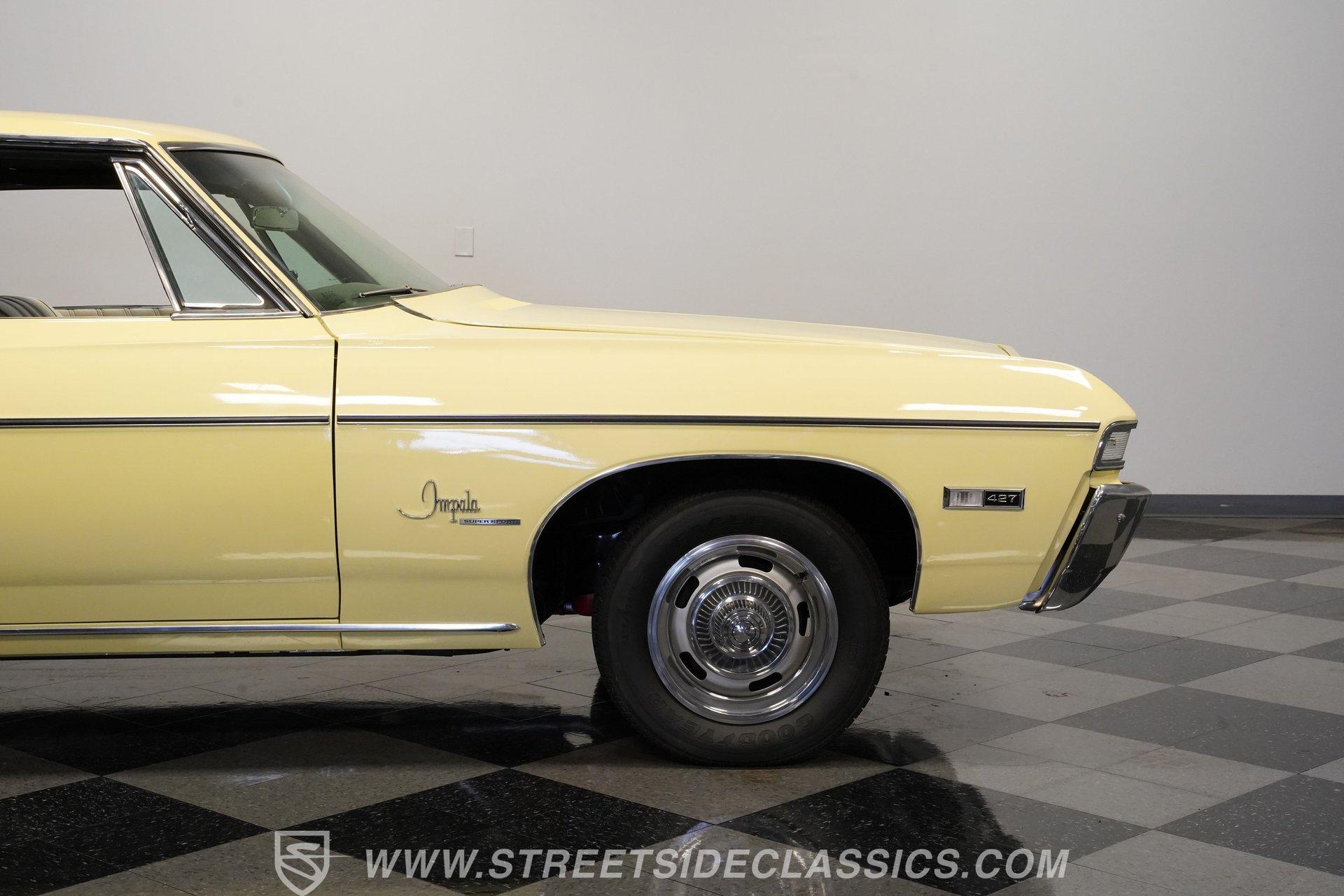 If you like big and fast cars, this 1968 Chevrolet Impala 427 is for you. Finished in its original factory color of Butternut Yellow (Code Y) with a Parchment interior, this classic Impala has been treated to a comprehensive, every-nut-and-bolt, frame-off restoration. The sleek, fastback styling makes this car look like it's going fast even when standing still. A set of 15-inch Chevrolet rally wheels adds to the sportiness of the design, as do the optional factory front corner lights at the front of each fender. The Parchment white interior is spotless and features rare optional factory bucket seats and a console that showcases the Hurst 4-speed shifter. The big story, of course, is under the hood. This Impala came from the factory with a big block engine and currently has a rare year correct ID Suffix code 425 horsepower 427 cubic inch engine out of a 1968 Impala, mated to a Muncie M-21 4-speed manual transmission. The L72 engine, built to factory spec, is 1 of 568 ever produced in that year. The engine bay and the rest of the car have been restored to a high level, with particular attention paid to authenticity and factory correctness. Attention to detail is evidenced everywhere, including using correct hoses, hose clamps, factory Winters aluminum intake manifold, spring-ring battery cables, proper decals, and more. This Impala also has both power steering and power brakes. The undercarriage is also highly detailed to factory specifications, with all the right paint colors and finishes. Highlights: Factory big bock car Fitted with correct L72, 427V8, 425 HP Impala engine RARE: 1 of 568 425/427's in that year Muncie M-21 4-speed 12-bolt rear end Rally wheels Bucket seats Factory console Exceptional frame-off restoration done to a high level This big and fast 1968 Impala 427 is restored to a standard rarely seen on an Impala of this vintage. With a high-horse 427 big bock and a 4-speed, it is ready to impress its next owner and everyone who sees it. Call today!