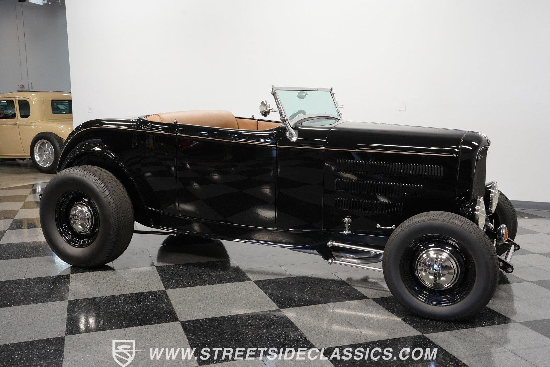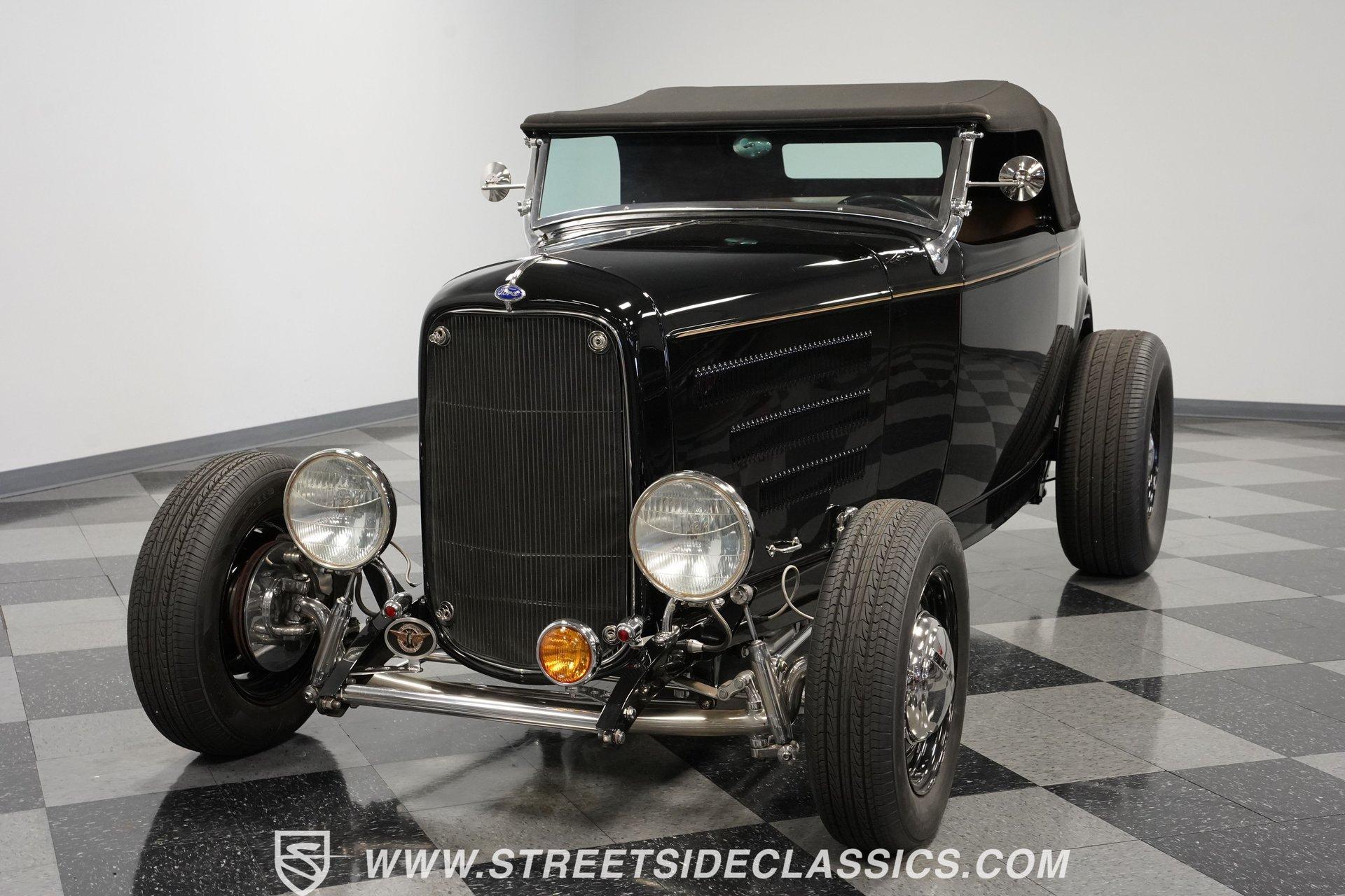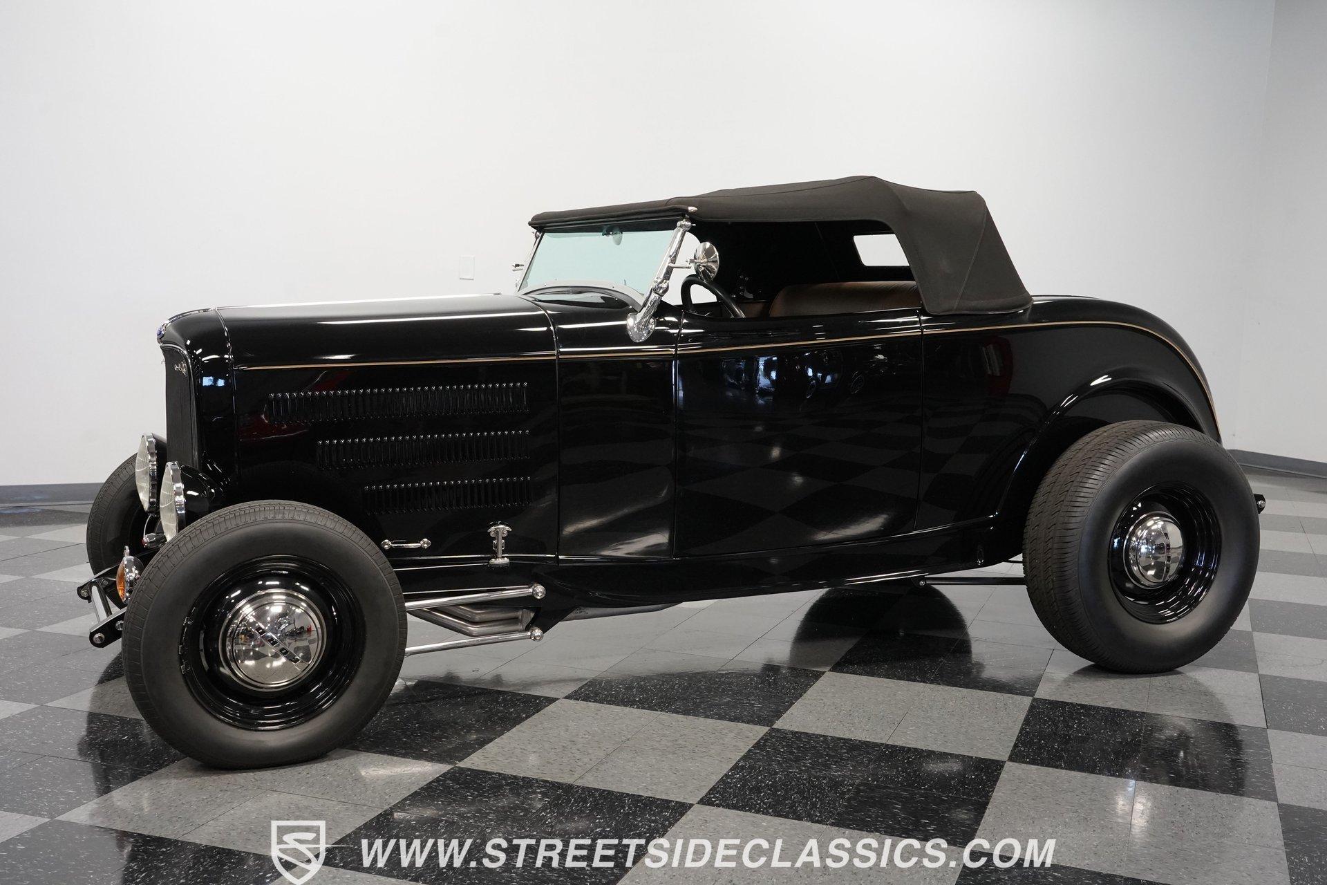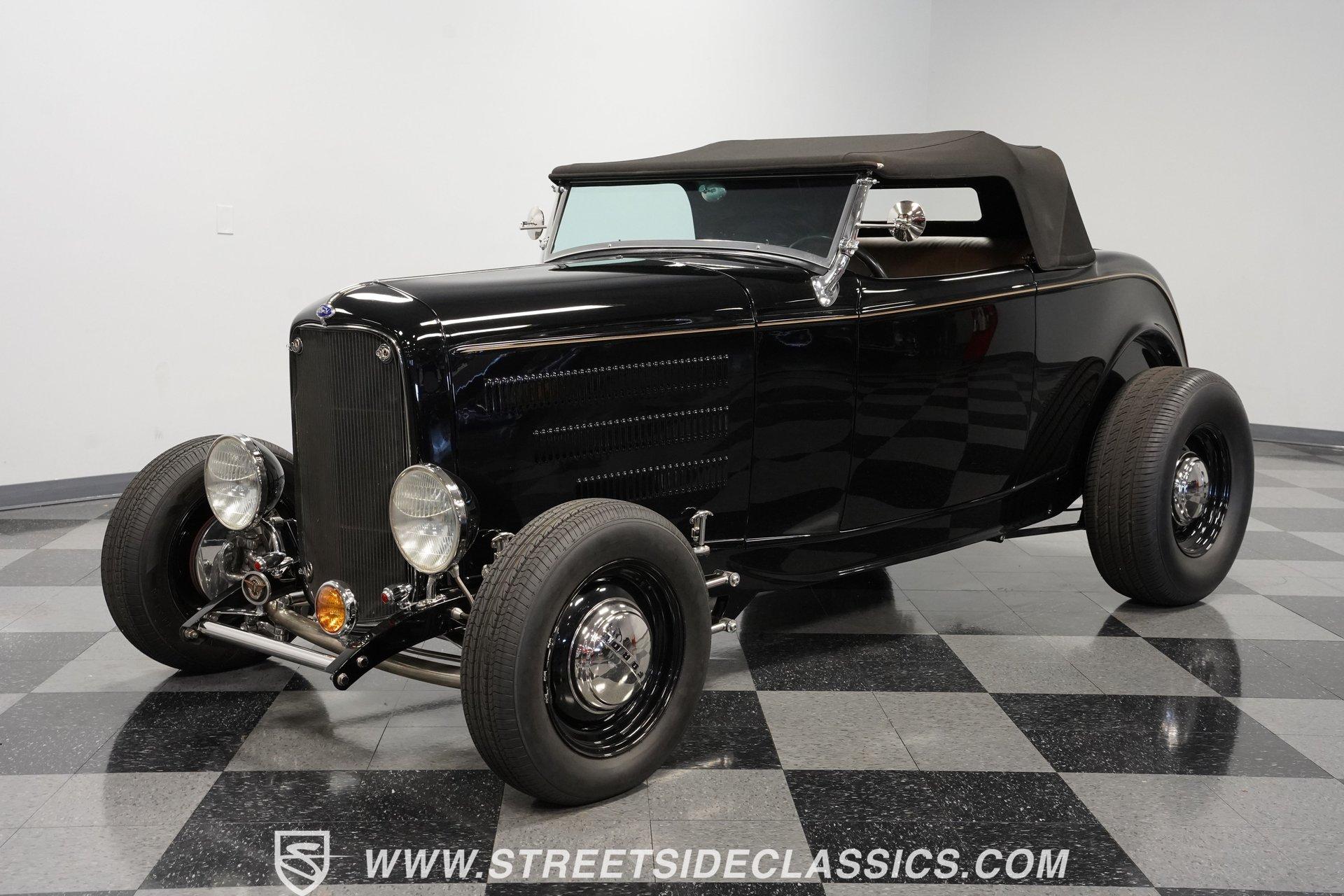 This 1932 Ford Highboy exudes a bold, unapologetic presence with its deep black paint and custom tan leather interior. It sits confidently on 15" front and 16" rear wheels, wrapped in 165/80R15 and 275/70R16 tires with a planted stance. Subtle pinstripes and blue dot taillights pay homage to the classic hot rod style, while the glossy finish reflects the car's modern build quality. The cockpit welcomes you with supple leather upholstery, expertly crafted by Holcomb in Knoxville. The bench seat, complete with matching cup holders, provides a comfortable perch for cruising. Unexpected amenities like a tilt column and functioning heater make this minimalist machine surprisingly livable. The classic instrument cluster, featuring a Classic Instruments knee knocker tach, sets the tone for an engaging drive. Power comes from a 350 V8 crate engine paired with a TH350 3-speed automatic transmission for effortless gear changes. Long tube headers feed a dual exhaust system with Dynomax mufflers, creating a distinct hot rod rumble. The Ford 9" rear axle, transverse leaf spring front suspension, and rear coilovers work together to deliver a well-balanced ride. Disc brakes up front provide confident stopping power. HIGHLIGHTS: 350 V8 Crate Engine TH350 3-Speed Automatic Transmission Ford 9" Rear Axle Front Disc Brakes Dual Exhaust with Dynomax Mufflers Long Tube Headers Electric Fan Glossy Black Paint Job Custom Pinstriping Louvered Hood Blue Dot Taillights 15" Front Wheels with 165/80R15 Tires 16" Rear Wheels with 275/70R16 Tires Black Canvas Convertible Top with Glass Rear Window Custom Tan Leather Upholstery by Holcomb Matching Leather Cup Holders Classic Instrument Gauges Tilt Steering Column Rat's Glass Body Constructed in 2005 on a sturdy TCI frame with a Rat's Glass body, this '32 Ford Highboy is a well-executed modern hot rod. With its 350 V8 power, custom leather interior, and eye-catching details like the louvered hood and rumbling dual exhaust, it's a standout cruiser that doesn't compromise comfort. Call today!