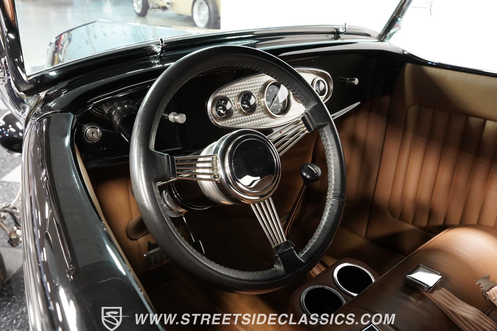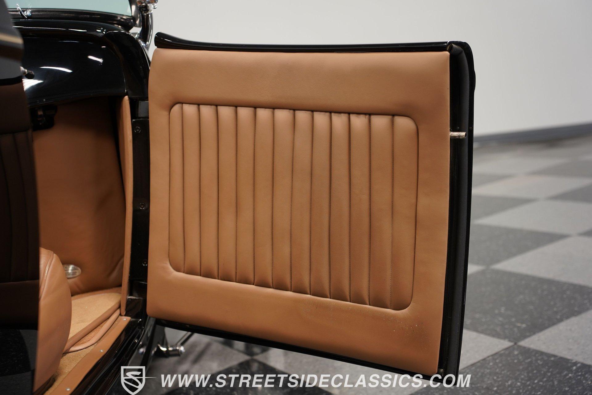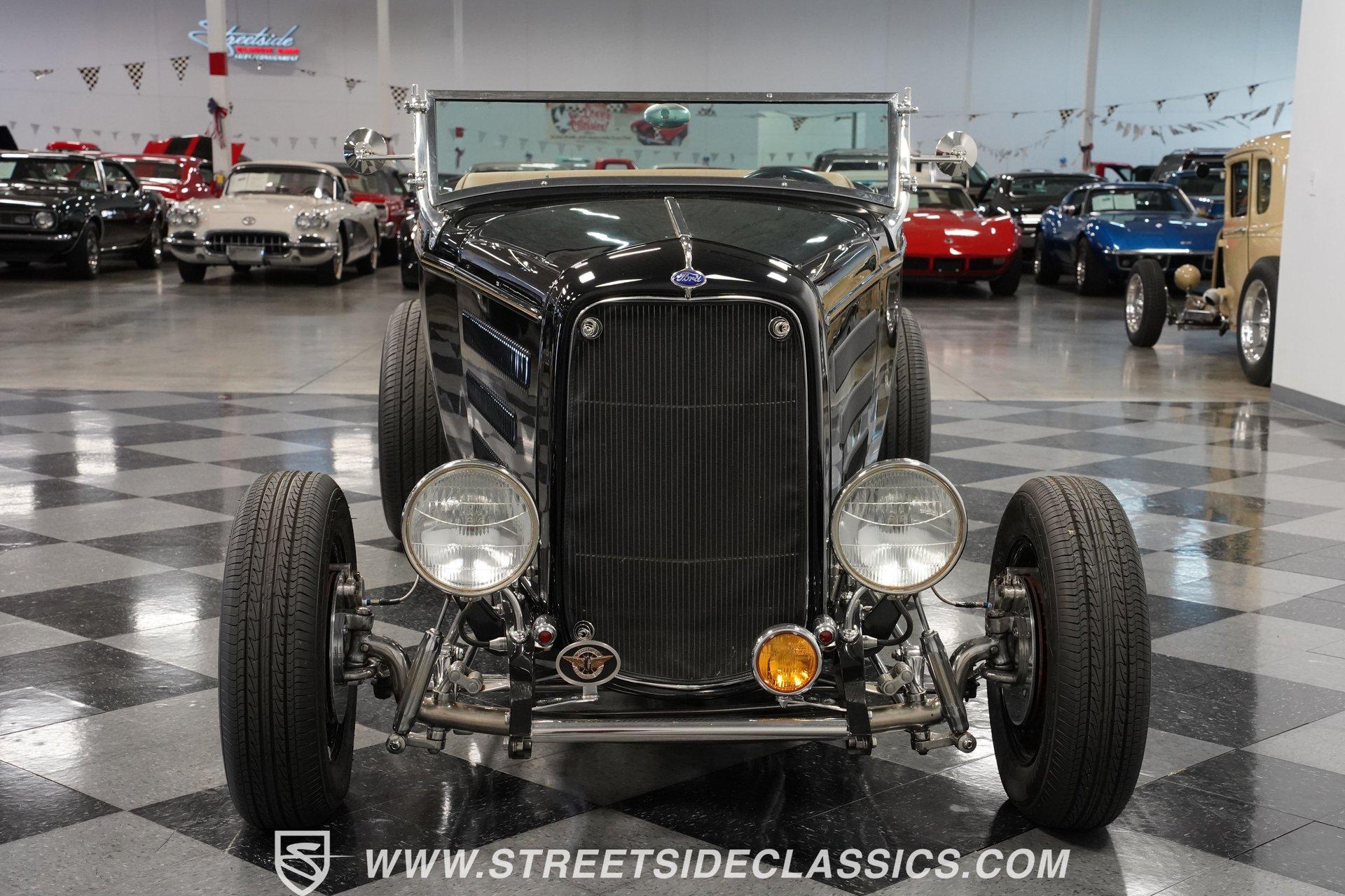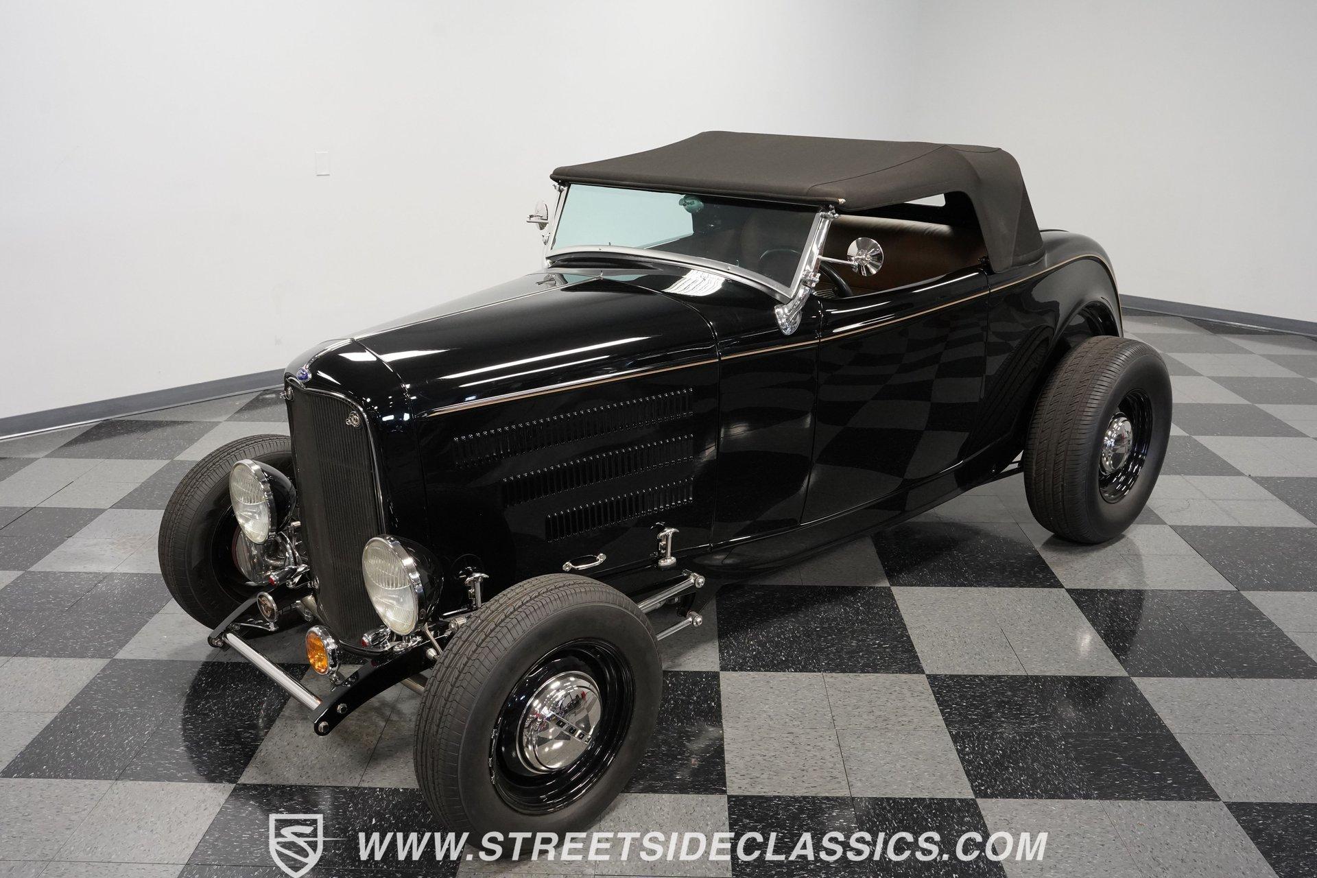 This 1932 Ford Highboy exudes a bold, unapologetic presence with its deep black paint and custom tan leather interior. It sits confidently on 15" front and 16" rear wheels, wrapped in 165/80R15 and 275/70R16 tires with a planted stance. Subtle pinstripes and blue dot taillights pay homage to the classic hot rod style, while the glossy finish reflects the car's modern build quality. The cockpit welcomes you with supple leather upholstery, expertly crafted by Holcomb in Knoxville. The bench seat, complete with matching cup holders, provides a comfortable perch for cruising. Unexpected amenities like a tilt column and functioning heater make this minimalist machine surprisingly livable. The classic instrument cluster, featuring a Classic Instruments knee knocker tach, sets the tone for an engaging drive. Power comes from a 350 V8 crate engine paired with a TH350 3-speed automatic transmission for effortless gear changes. Long tube headers feed a dual exhaust system with Dynomax mufflers, creating a distinct hot rod rumble. The Ford 9" rear axle, transverse leaf spring front suspension, and rear coilovers work together to deliver a well-balanced ride. Disc brakes up front provide confident stopping power. HIGHLIGHTS: 350 V8 Crate Engine TH350 3-Speed Automatic Transmission Ford 9" Rear Axle Front Disc Brakes Dual Exhaust with Dynomax Mufflers Long Tube Headers Electric Fan Glossy Black Paint Job Custom Pinstriping Louvered Hood Blue Dot Taillights 15" Front Wheels with 165/80R15 Tires 16" Rear Wheels with 275/70R16 Tires Black Canvas Convertible Top with Glass Rear Window Custom Tan Leather Upholstery by Holcomb Matching Leather Cup Holders Classic Instrument Gauges Tilt Steering Column Rat's Glass Body Constructed in 2005 on a sturdy TCI frame with a Rat's Glass body, this '32 Ford Highboy is a well-executed modern hot rod. With its 350 V8 power, custom leather interior, and eye-catching details like the louvered hood and rumbling dual exhaust, it's a standout cruiser that doesn't compromise comfort. Call today!