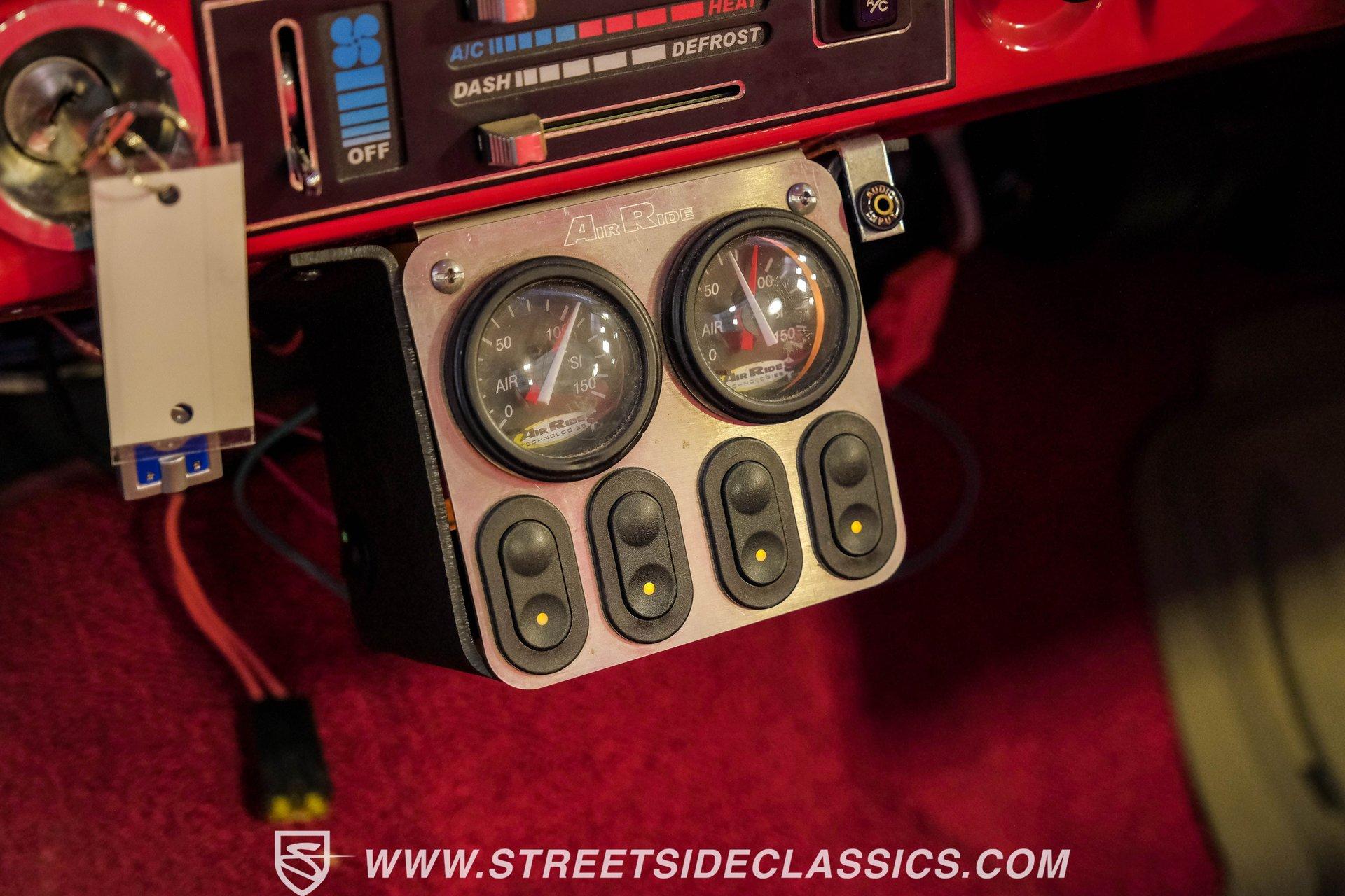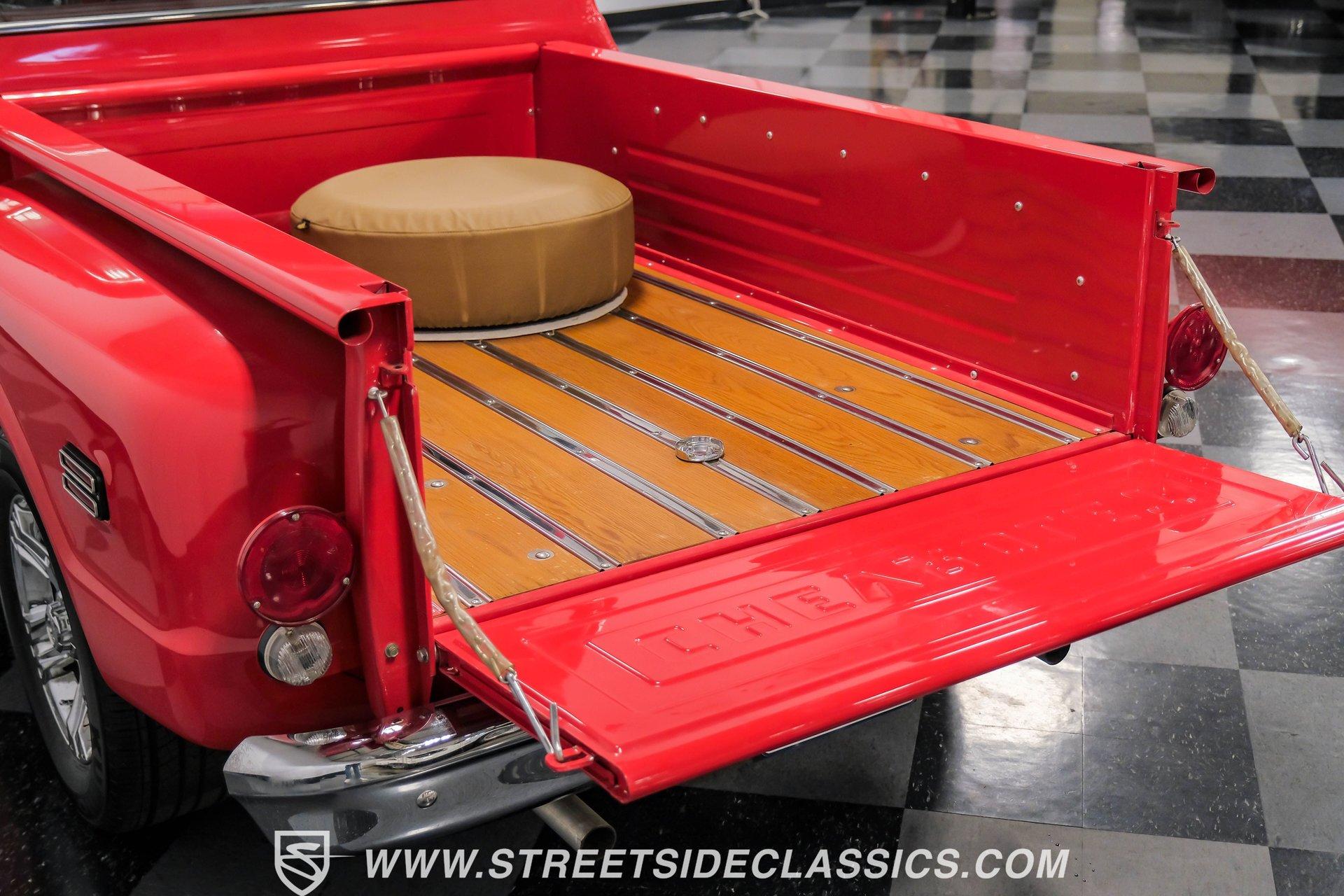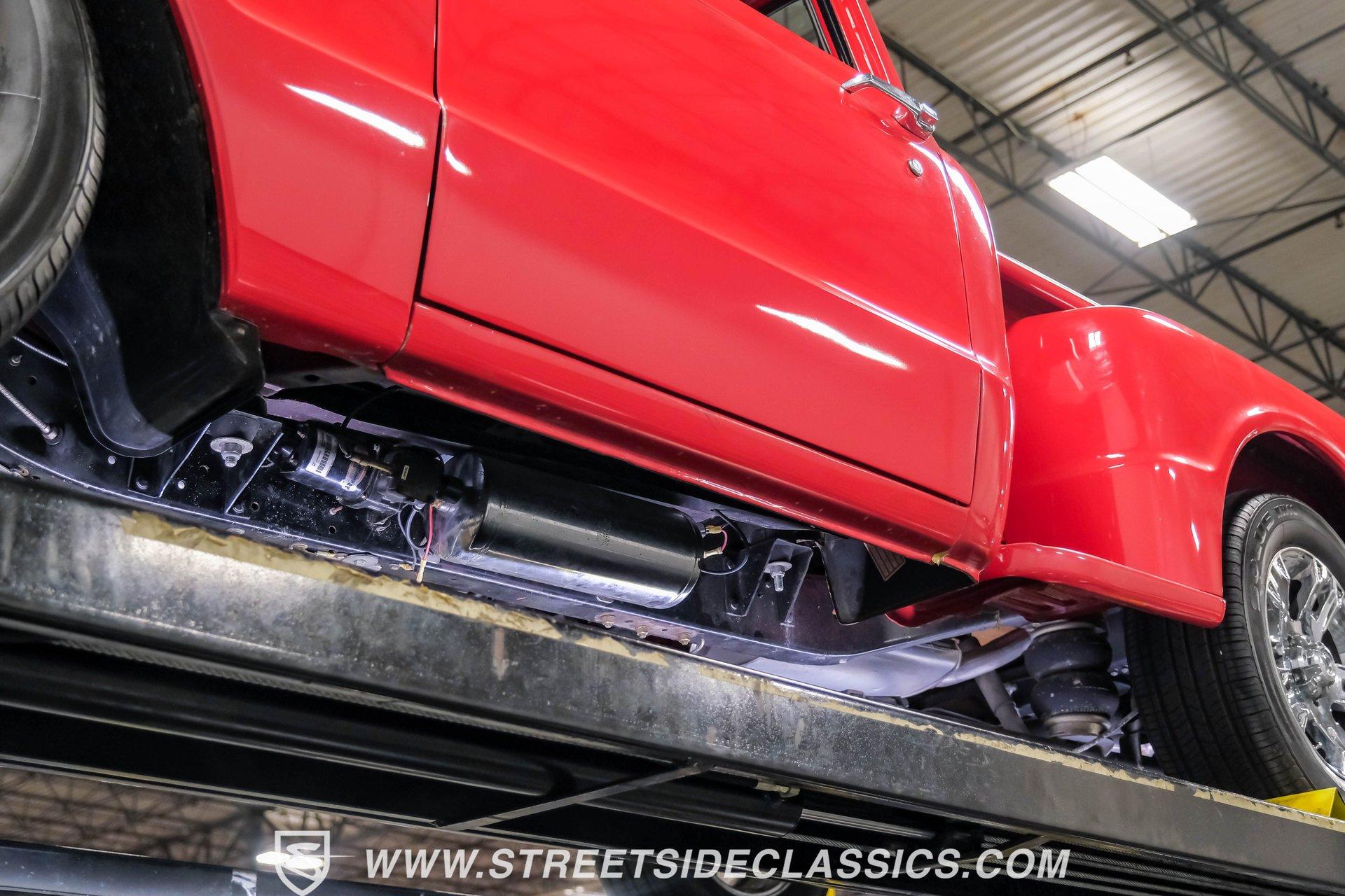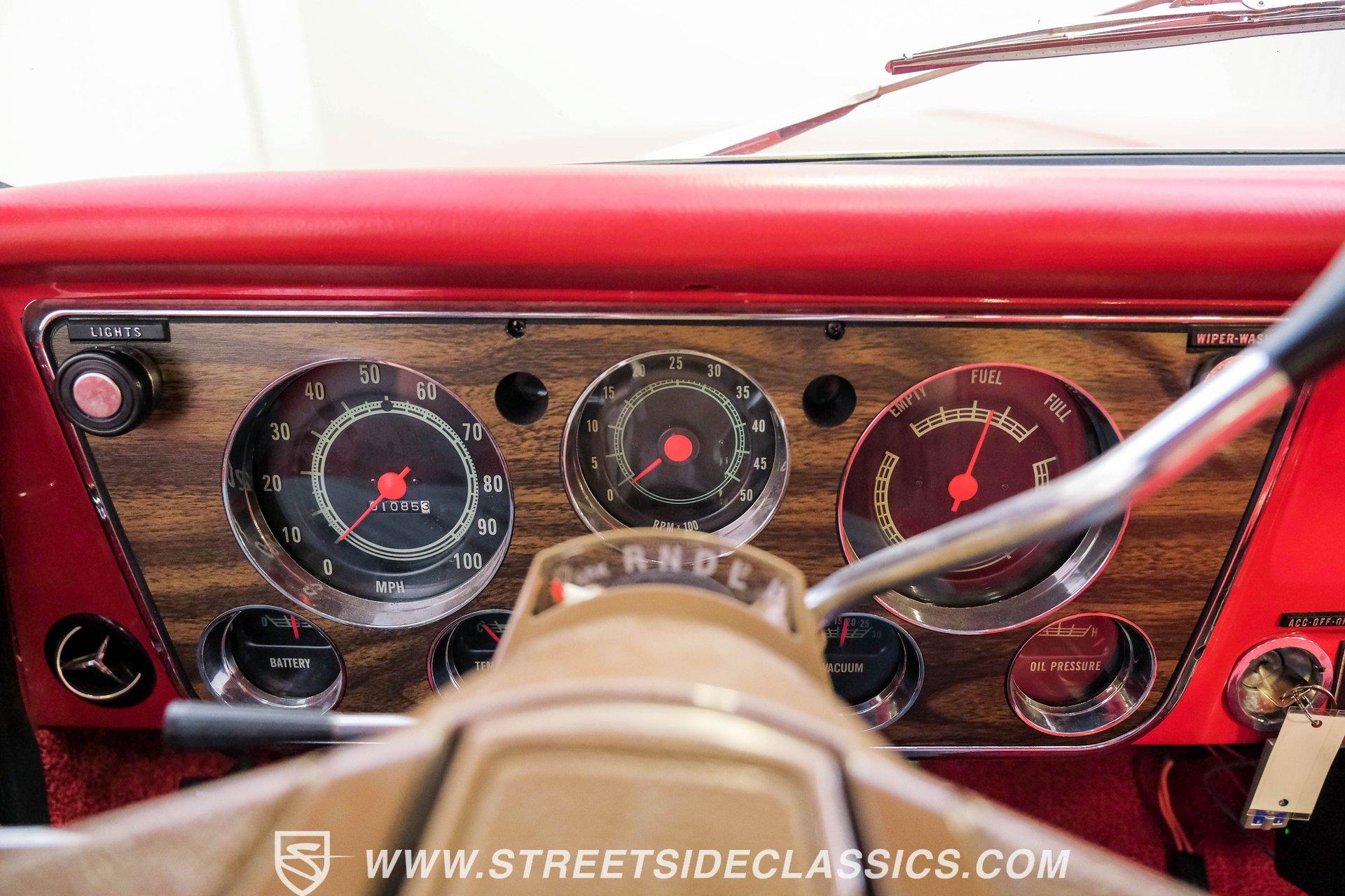 This 1969 Chevrolet C10 Stepside showcases a vibrant red exterior that exudes confidence accentuating the truck's classic lines and muscular profile. It rolls on 17-inch chrome wheels fitted with 255/60R17 tires, blending vintage aesthetics with modern road performance. The stepside bed features a rich wood floor, adding a touch of craftsmanship to the overall design. Inside, the cabin boasts a fresh red vinyl interior that complements the exterior. A spacious bench seat provides comfort for long drives, while the column shifter maintains a clean floor layout. The dash sports an attractive wood-grain finish, housing stock-style gauges and a retro AM/FM cassette player. Modern amenities include air conditioning with custom dash vents and power steering, enhancing the driving experience. A 350 V8 engine powers this C10, paired with a TH350 3-speed automatic transmission for smooth operation. An Edelbrock carburetor and shorty headers optimize performance, while the dual exhaust system produces a satisfying sound. The truck's stance is achieved through CCP tubular A-arm front suspension and a trailing arm rear setup, both featuring air ride for adjustable height. Four-wheel power disc brakes provide reliable stopping power. This C10 offers an appealing combination of classic truck style and upgraded performance. HIGHLIGHTS: 350 V8 engine TH350 3-speed automatic transmission Dual exhaust 12-bolt rear end CCP tubular A-arm front suspension with air ride Tubular trailing arm rear suspension with air bags and panhard bar Power steering Four-wheel power disc brakes Very sharp Red repaint Wood bed floor 17-inch chrome wheels in 255/60R17 tires Fuel tank relocated to rear of truck Red upholstery with Bench seat Air conditioning Retro-style AM/FM cassette player Air ride controls in dash 1,085 miles since build completion This 1969 Chevrolet C10 Stepside combines a potent 350 V8, a comfortable red interior, and numerous performance upgrades. With its air ride suspension and modernized running gear, this C10 delivers classic looks with enhanced drivability. Call today!