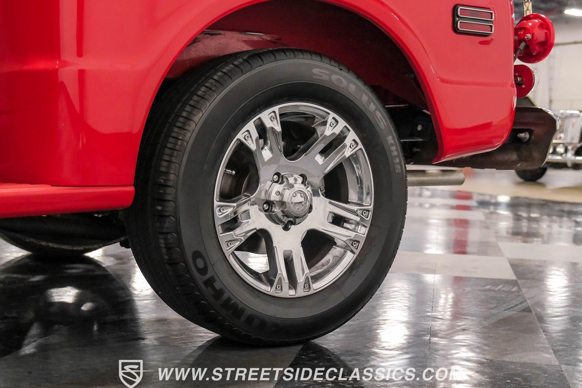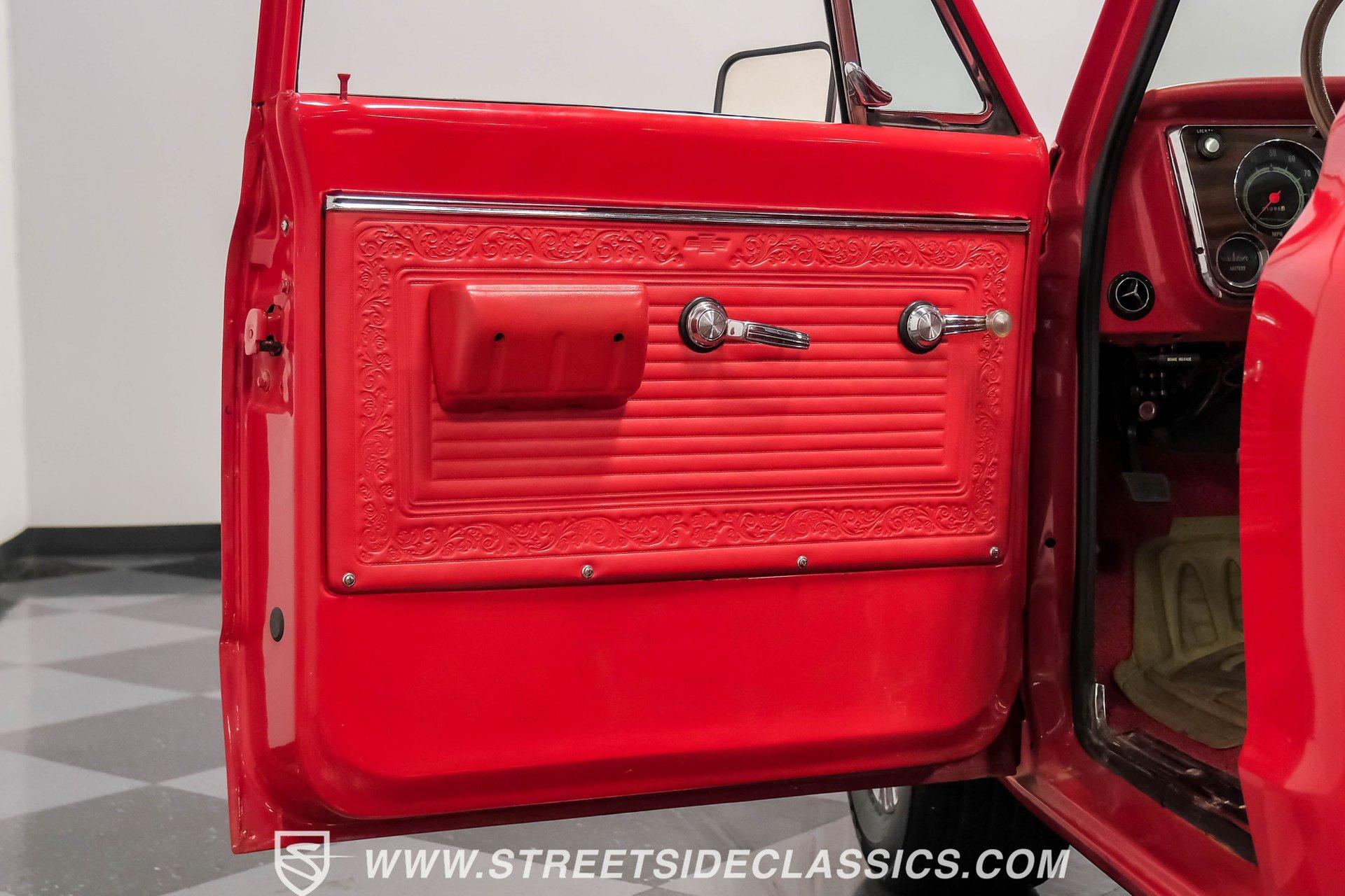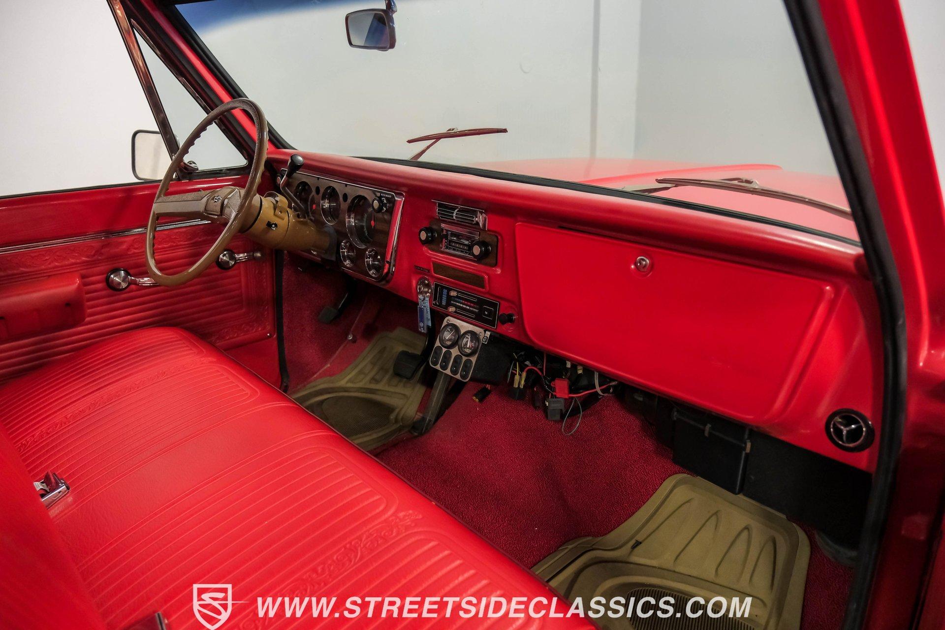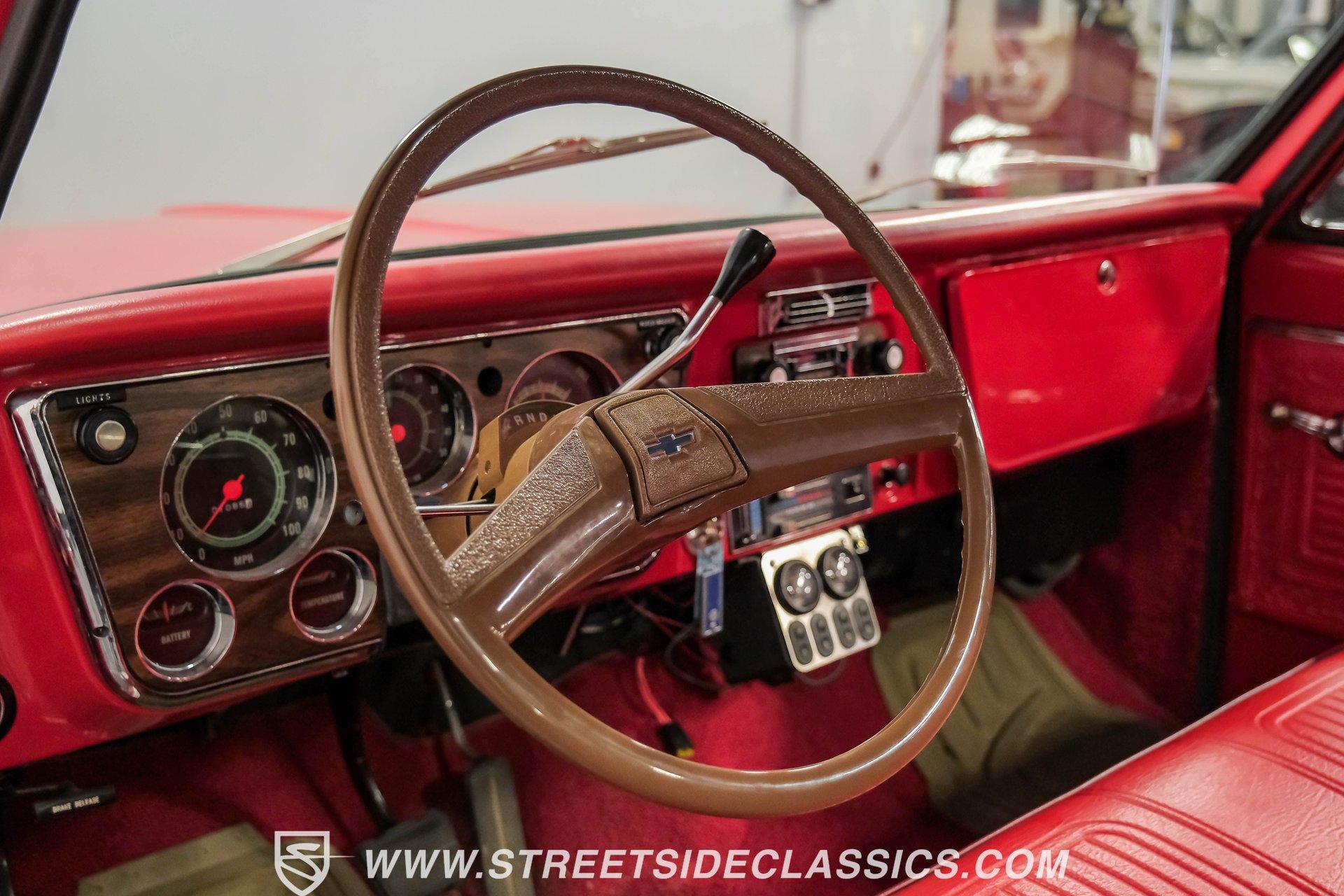 This 1969 Chevrolet C10 Stepside showcases a vibrant red exterior that exudes confidence accentuating the truck's classic lines and muscular profile. It rolls on 17-inch chrome wheels fitted with 255/60R17 tires, blending vintage aesthetics with modern road performance. The stepside bed features a rich wood floor, adding a touch of craftsmanship to the overall design. Inside, the cabin boasts a fresh red vinyl interior that complements the exterior. A spacious bench seat provides comfort for long drives, while the column shifter maintains a clean floor layout. The dash sports an attractive wood-grain finish, housing stock-style gauges and a retro AM/FM cassette player. Modern amenities include air conditioning with custom dash vents and power steering, enhancing the driving experience. A 350 V8 engine powers this C10, paired with a TH350 3-speed automatic transmission for smooth operation. An Edelbrock carburetor and shorty headers optimize performance, while the dual exhaust system produces a satisfying sound. The truck's stance is achieved through CCP tubular A-arm front suspension and a trailing arm rear setup, both featuring air ride for adjustable height. Four-wheel power disc brakes provide reliable stopping power. This C10 offers an appealing combination of classic truck style and upgraded performance. HIGHLIGHTS: 350 V8 engine TH350 3-speed automatic transmission Dual exhaust 12-bolt rear end CCP tubular A-arm front suspension with air ride Tubular trailing arm rear suspension with air bags and panhard bar Power steering Four-wheel power disc brakes Very sharp Red repaint Wood bed floor 17-inch chrome wheels in 255/60R17 tires Fuel tank relocated to rear of truck Red upholstery with Bench seat Air conditioning Retro-style AM/FM cassette player Air ride controls in dash 1,085 miles since build completion This 1969 Chevrolet C10 Stepside combines a potent 350 V8, a comfortable red interior, and numerous performance upgrades. With its air ride suspension and modernized running gear, this C10 delivers classic looks with enhanced drivability. Call today!