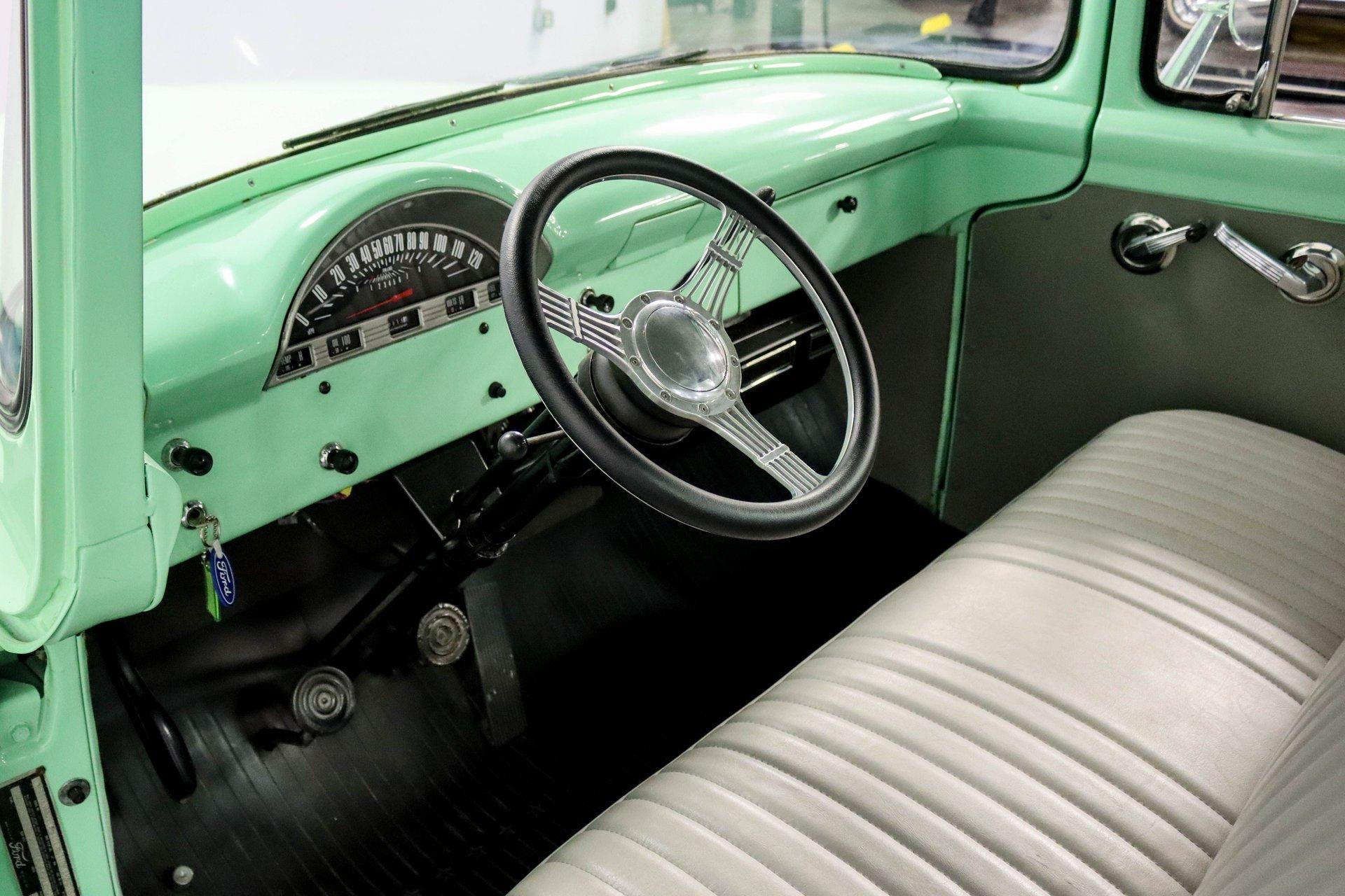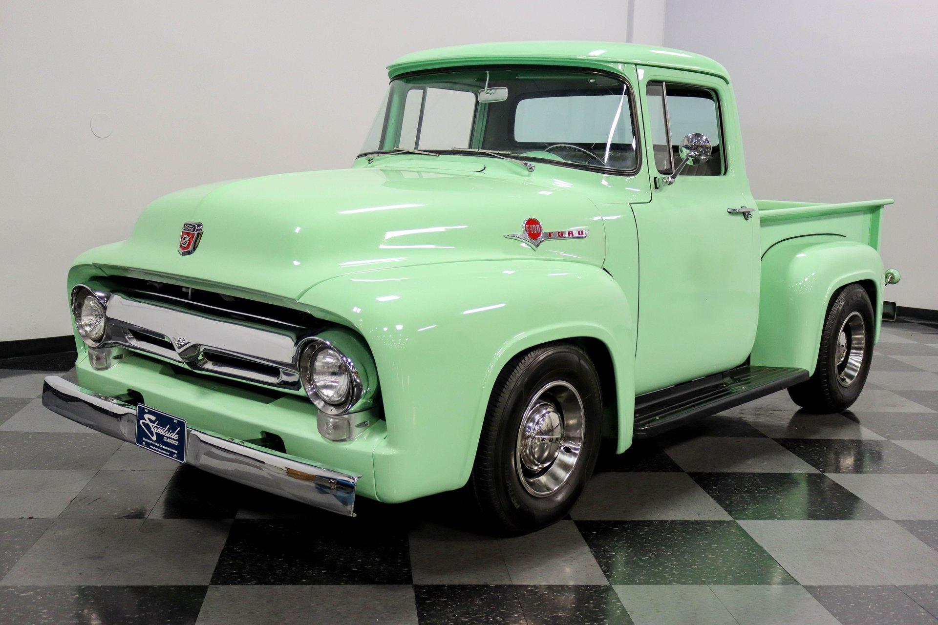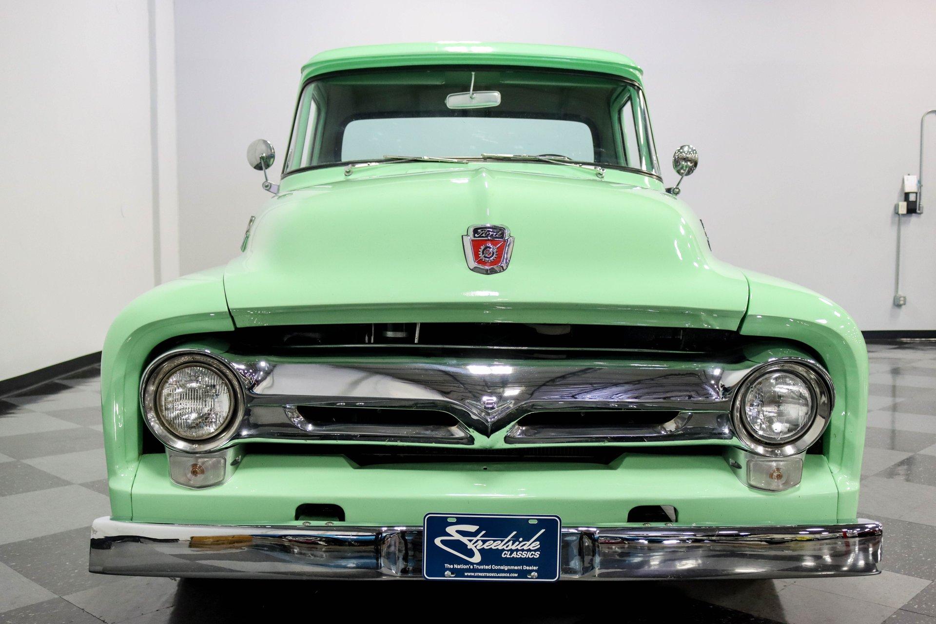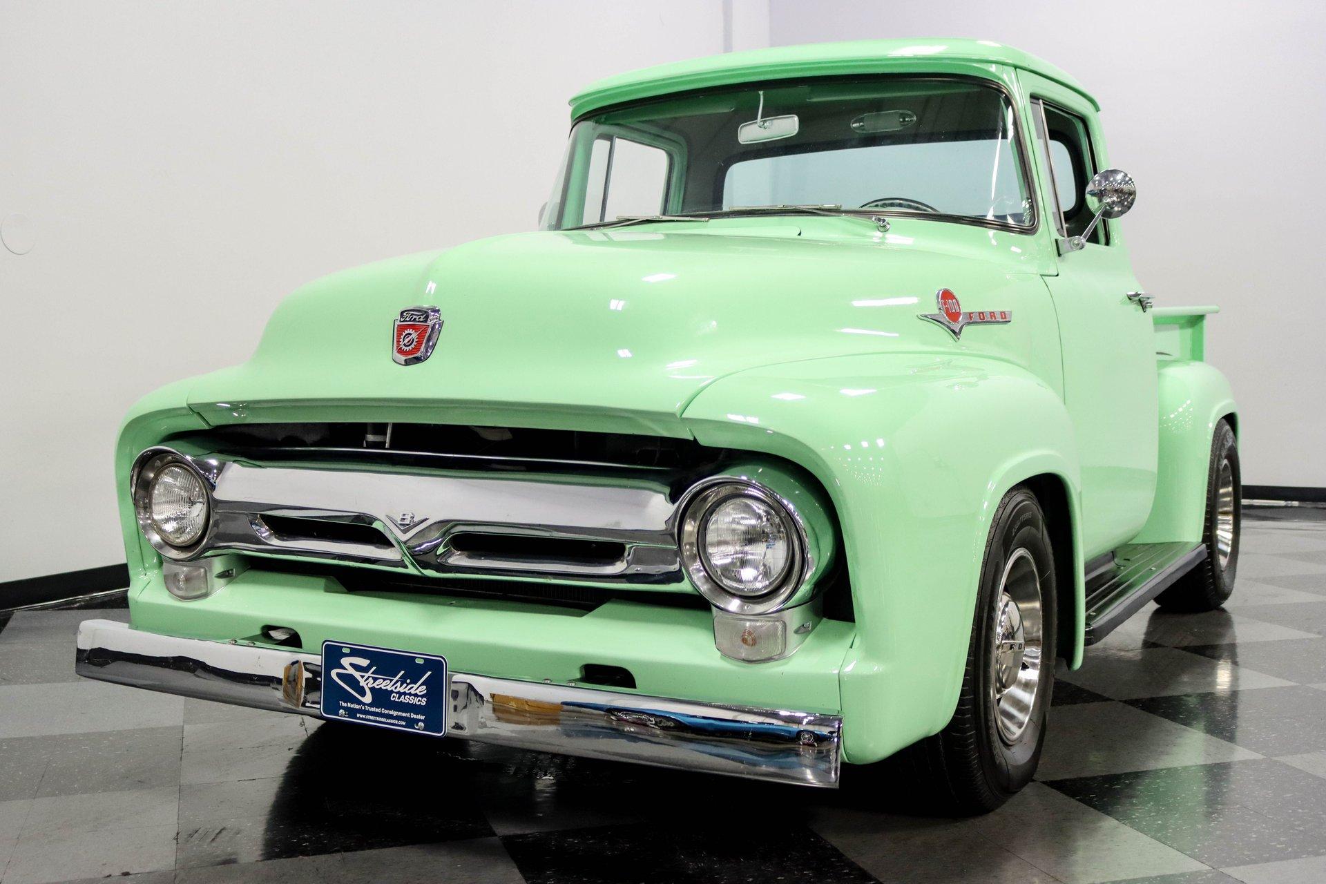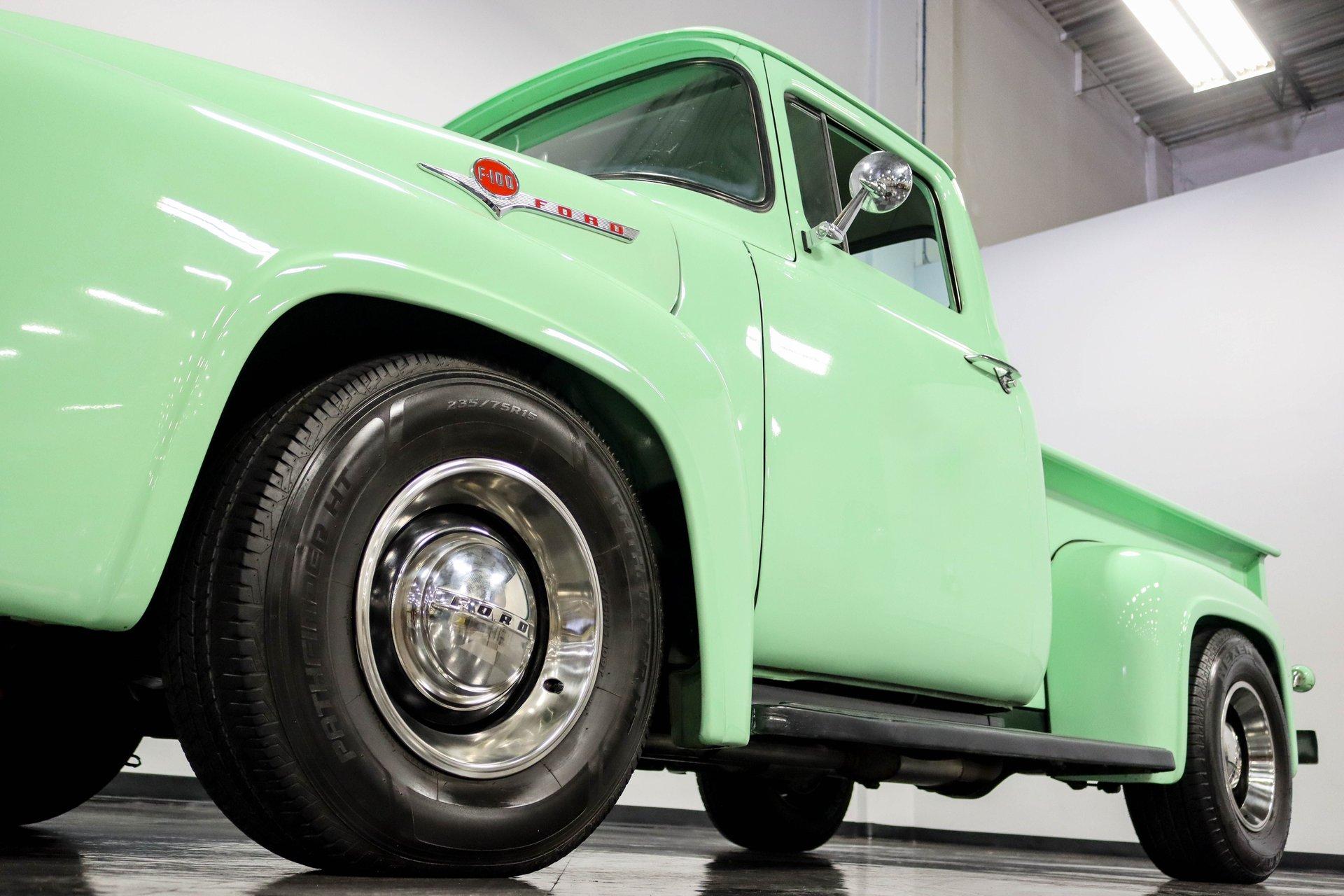 This 1956 Ford F-100 wears a coat of Meadow Mist Green, a factory-correct hue that paints a picture of wide-open Texas prairies. The truck's clean, flowing lines are enhanced by custom touches like an integrated fuel filler and streamlined tailgate. Sitting on 15-inch wheels wrapped in 235/75R15 tires, this F-100 cuts a striking figure, especially with its slightly lowered stance that gives it an extra dose of attitude. Inside, gray vinyl covers the bench seat and door panels, creating a crisp, period-appropriate interior. A banjo-style steering wheel adds a dash of style, while Classic Instruments gauges blend vintage looks with modern reliability. Power steering and under-dash air conditioning make this F-100 a joy to drive, whether you're cruising Main Street or heading out on the highway. The column-mounted shifter for the 3-speed manual transmission keeps things authentically old-school. Under the hood, Ford's 312 V8 takes center stage, breathing through an Edelbrock 4-barrel carburetor. The engine bay showcases a mix of original components and smart upgrades, including a Cadillac-style air grabber. An X-pipe dual exhaust system provides a muscular soundtrack, while power drum brakes at all four corners offer confident stopping power. This powertrain combo delivers plenty of get-up-and-go for cruising or hauling, staying true to the F-100's versatile nature. HIGHLIGHTS: 312 V8 engine 3-speed manual transmission Edelbrock 4-barrel carburetor X-pipe dual exhaust system Power steering Power brakes Lowered suspension Meadow Mist Green paint (factory correct) 15-inch wheels in 235/75R15 tires Custom smooth tailgate Integrated fuel filler in rear fender Vinyl "W" decal on doors Gray interior with bench seat Gray door panels Banjo-style steering wheel Classic Instruments gauges Under-dash air conditioning Body-off restoration This 1956 Ford F-100 combines classic style with subtle hot rod flair. From its potent V8 to its comfortable, upgraded interior, this truck offers an ideal blend of vintage appeal and modern drivability. Perfect for weekend cruises or daily drives, this F-100 is ready to hit the road. Call today!