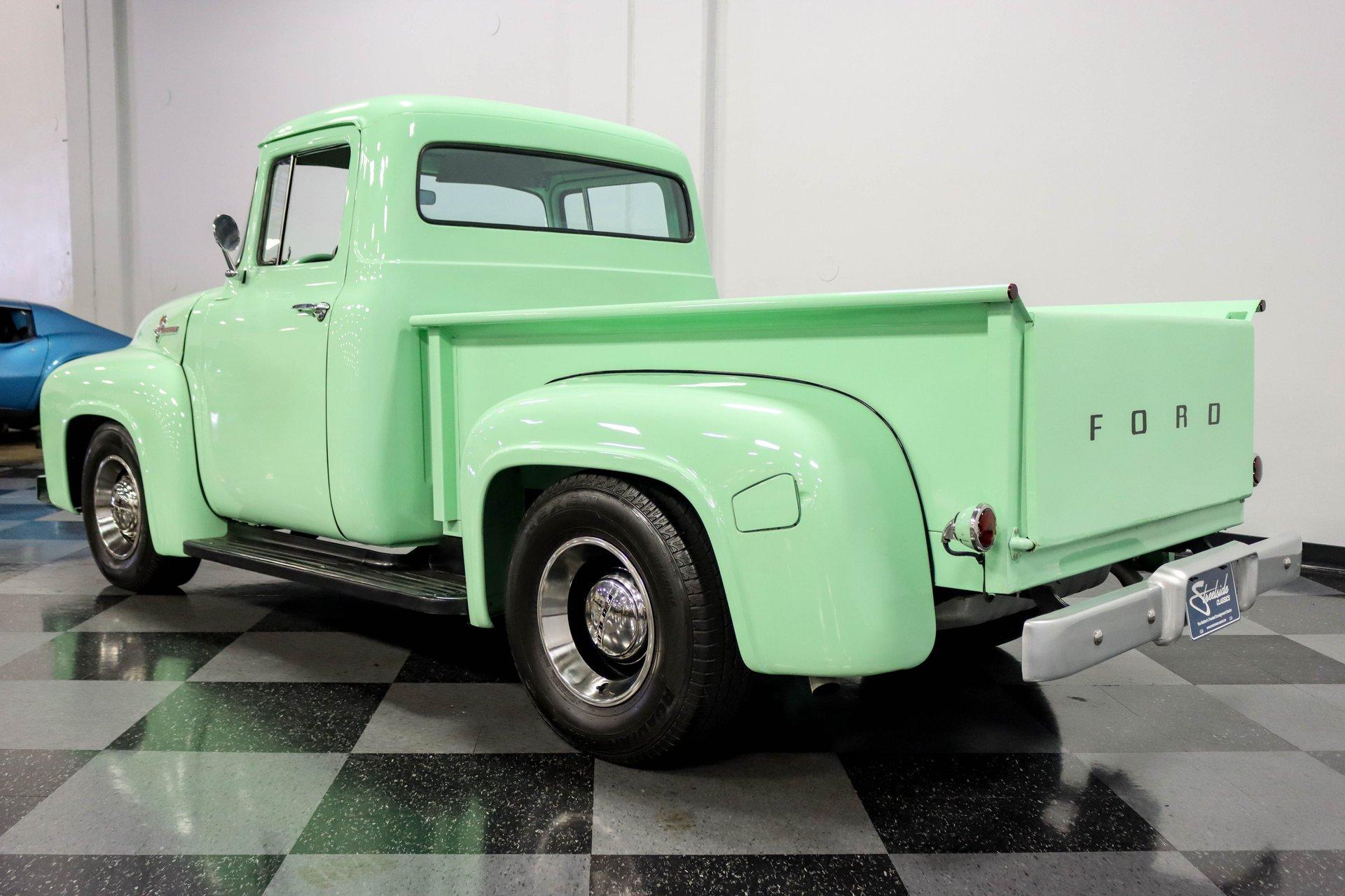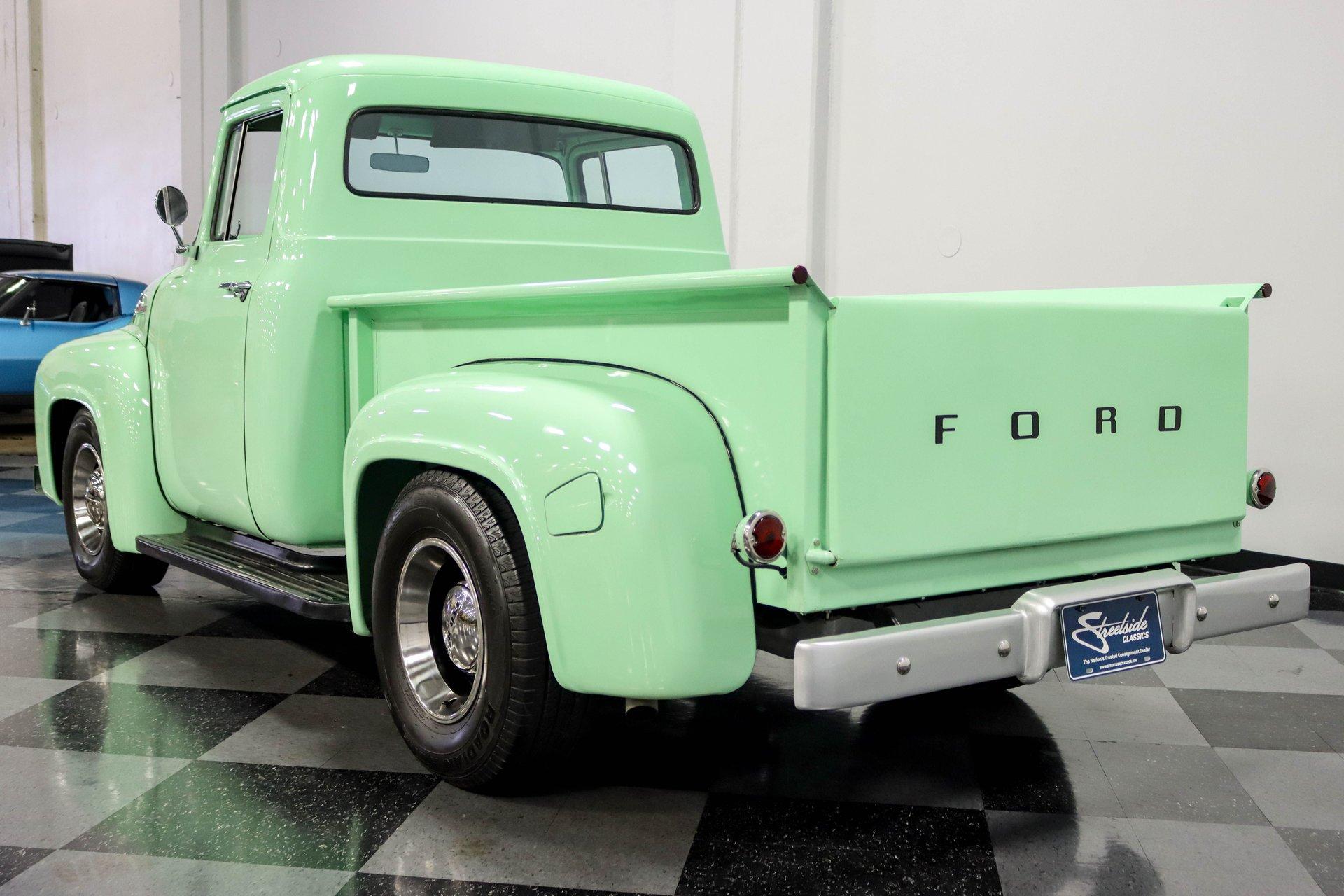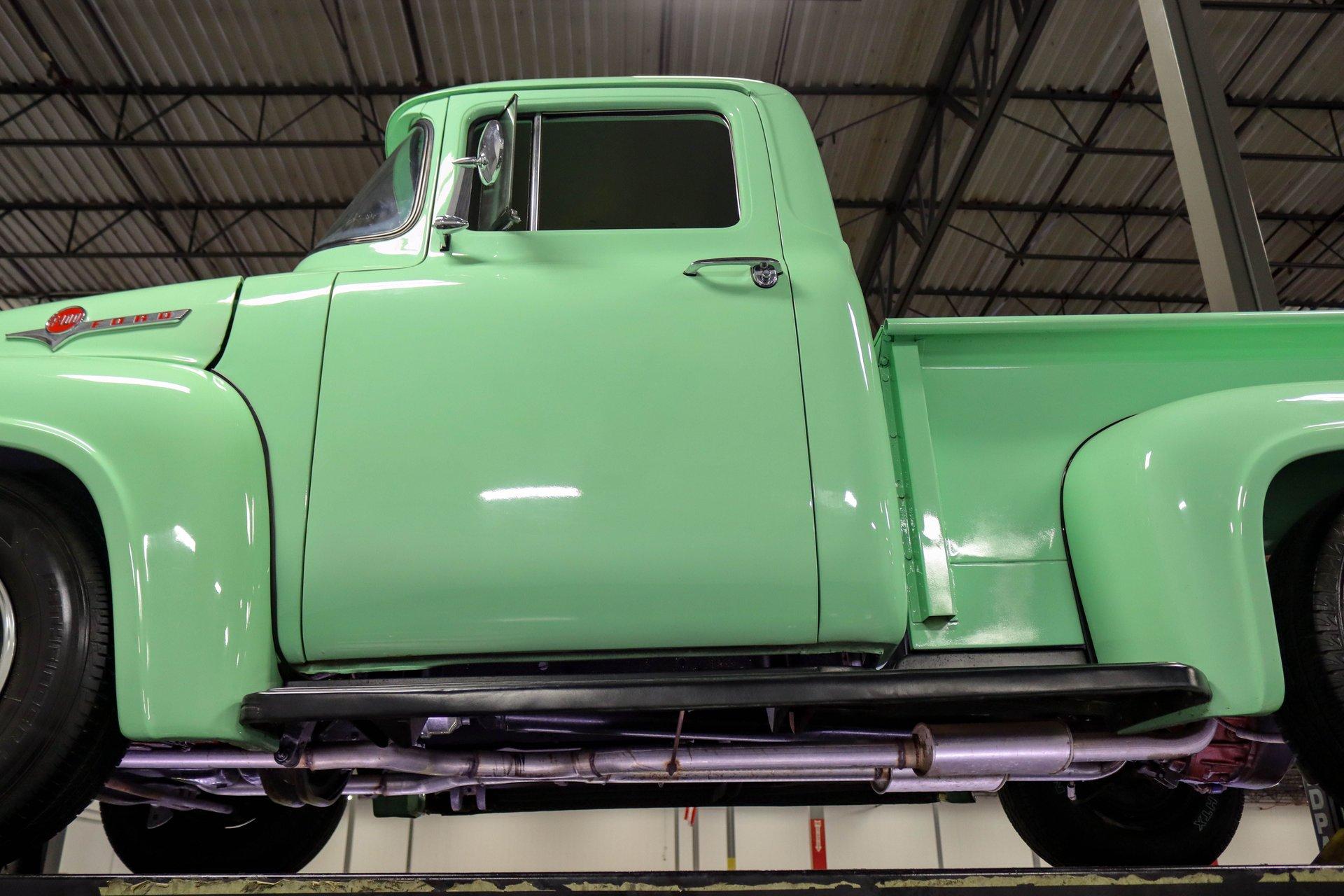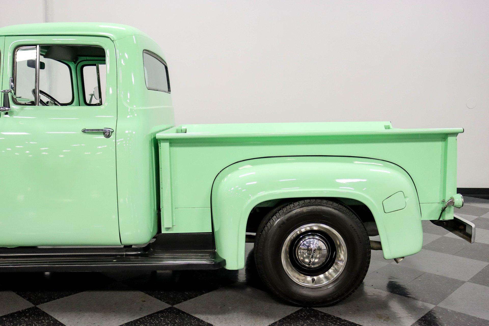 This 1956 Ford F-100 wears a coat of Meadow Mist Green, a factory-correct hue that paints a picture of wide-open Texas prairies. The truck's clean, flowing lines are enhanced by custom touches like an integrated fuel filler and streamlined tailgate. Sitting on 15-inch wheels wrapped in 235/75R15 tires, this F-100 cuts a striking figure, especially with its slightly lowered stance that gives it an extra dose of attitude. Inside, gray vinyl covers the bench seat and door panels, creating a crisp, period-appropriate interior. A banjo-style steering wheel adds a dash of style, while Classic Instruments gauges blend vintage looks with modern reliability. Power steering and under-dash air conditioning make this F-100 a joy to drive, whether you're cruising Main Street or heading out on the highway. The column-mounted shifter for the 3-speed manual transmission keeps things authentically old-school. Under the hood, Ford's 312 V8 takes center stage, breathing through an Edelbrock 4-barrel carburetor. The engine bay showcases a mix of original components and smart upgrades, including a Cadillac-style air grabber. An X-pipe dual exhaust system provides a muscular soundtrack, while power drum brakes at all four corners offer confident stopping power. This powertrain combo delivers plenty of get-up-and-go for cruising or hauling, staying true to the F-100's versatile nature. HIGHLIGHTS: 312 V8 engine 3-speed manual transmission Edelbrock 4-barrel carburetor X-pipe dual exhaust system Power steering Power brakes Lowered suspension Meadow Mist Green paint (factory correct) 15-inch wheels in 235/75R15 tires Custom smooth tailgate Integrated fuel filler in rear fender Vinyl "W" decal on doors Gray interior with bench seat Gray door panels Banjo-style steering wheel Classic Instruments gauges Under-dash air conditioning Body-off restoration This 1956 Ford F-100 combines classic style with subtle hot rod flair. From its potent V8 to its comfortable, upgraded interior, this truck offers an ideal blend of vintage appeal and modern drivability. Perfect for weekend cruises or daily drives, this F-100 is ready to hit the road. Call today!