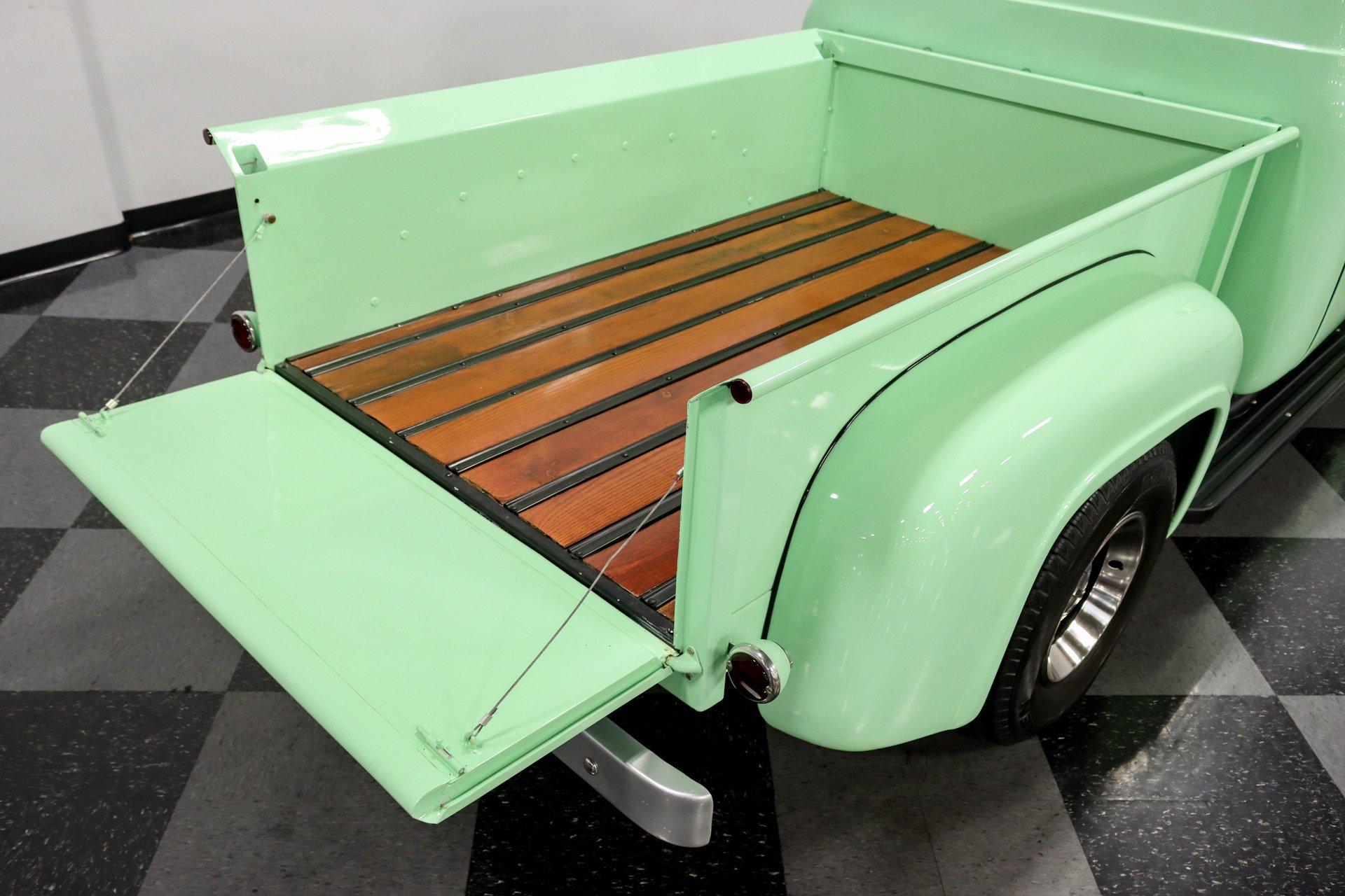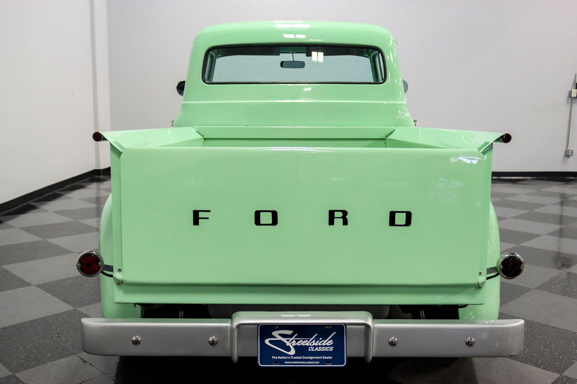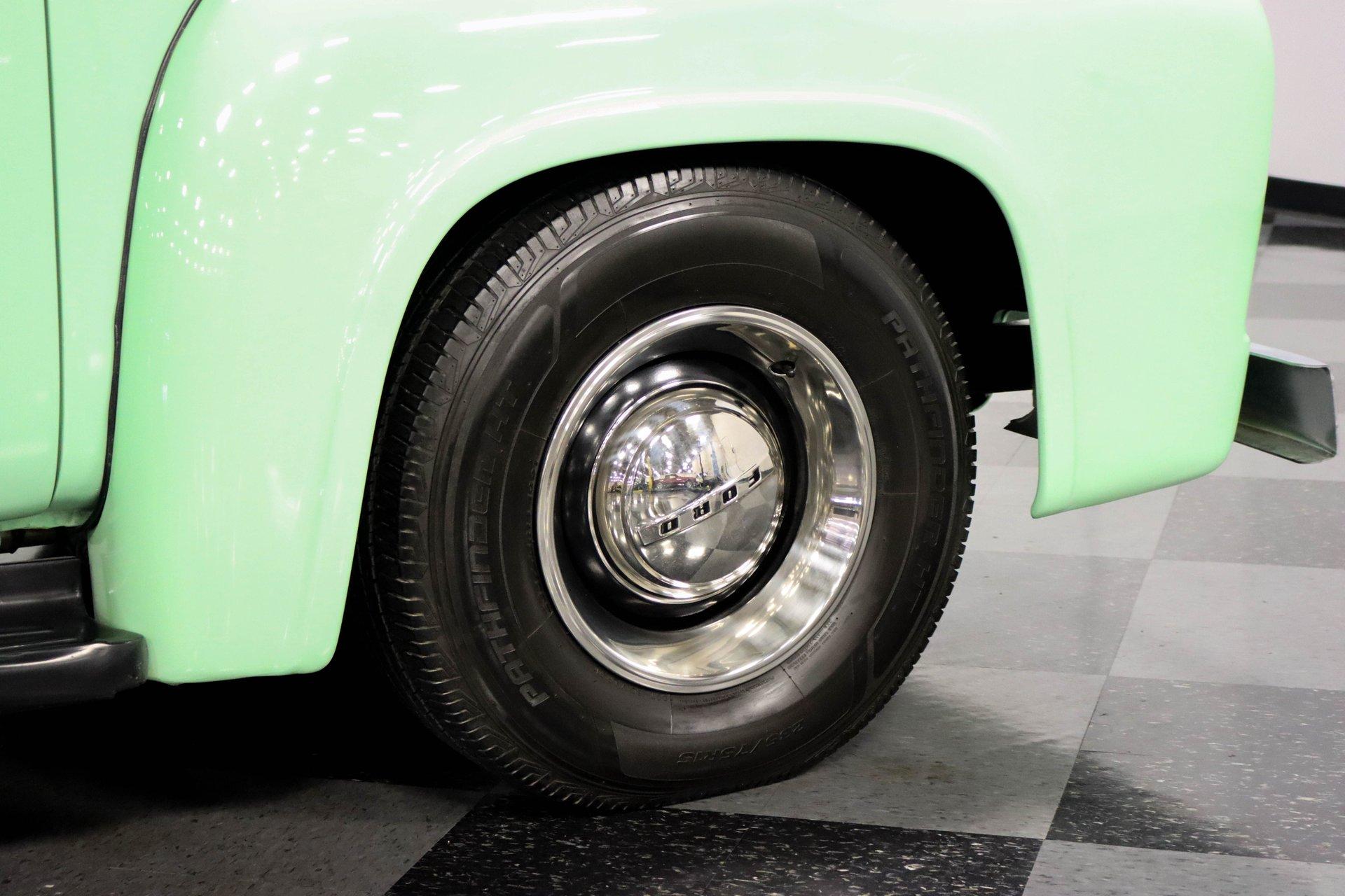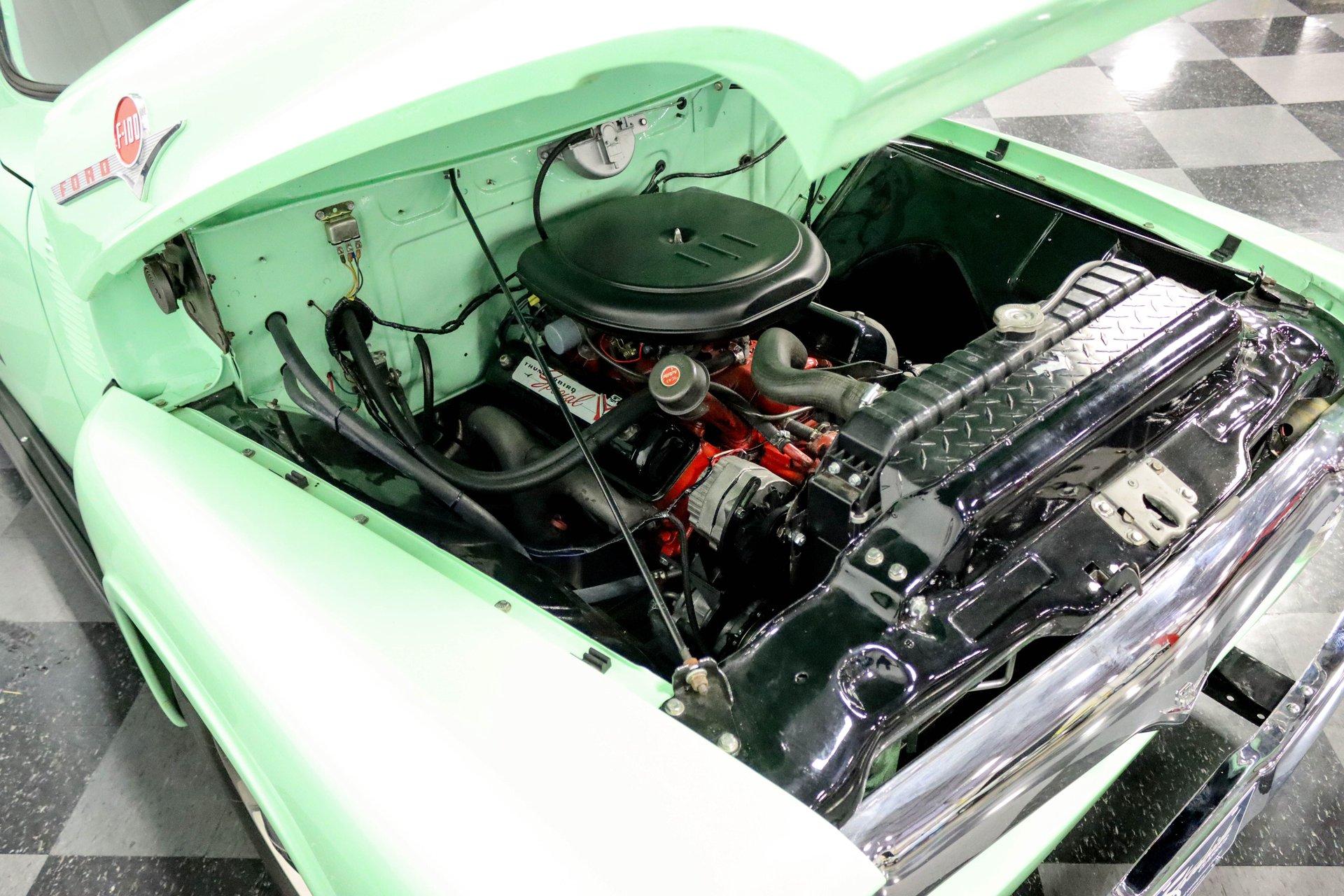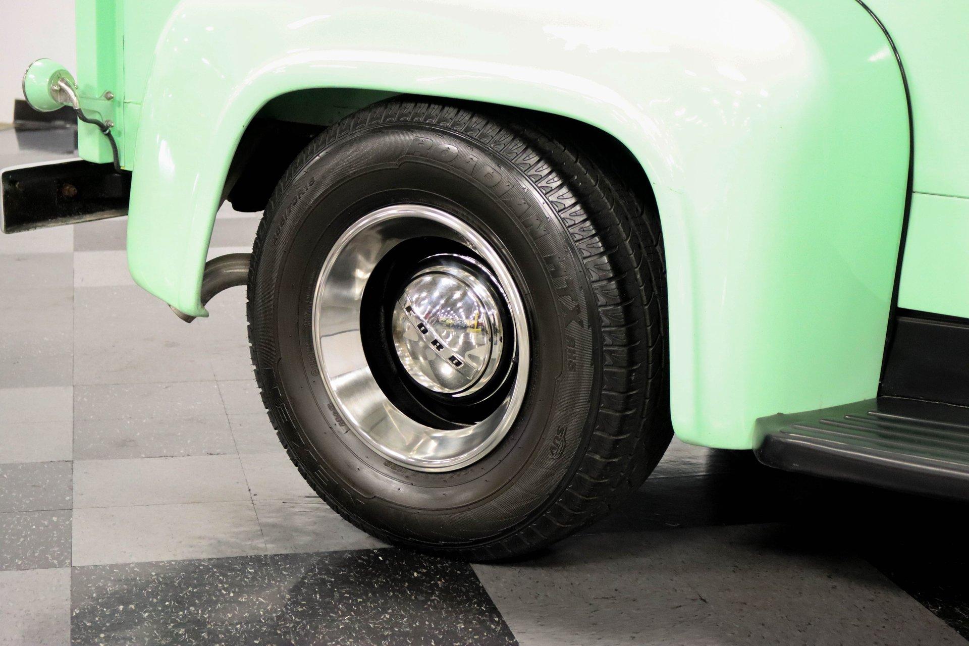 This 1956 Ford F-100 wears a coat of Meadow Mist Green, a factory-correct hue that paints a picture of wide-open Texas prairies. The truck's clean, flowing lines are enhanced by custom touches like an integrated fuel filler and streamlined tailgate. Sitting on 15-inch wheels wrapped in 235/75R15 tires, this F-100 cuts a striking figure, especially with its slightly lowered stance that gives it an extra dose of attitude. Inside, gray vinyl covers the bench seat and door panels, creating a crisp, period-appropriate interior. A banjo-style steering wheel adds a dash of style, while Classic Instruments gauges blend vintage looks with modern reliability. Power steering and under-dash air conditioning make this F-100 a joy to drive, whether you're cruising Main Street or heading out on the highway. The column-mounted shifter for the 3-speed manual transmission keeps things authentically old-school. Under the hood, Ford's 312 V8 takes center stage, breathing through an Edelbrock 4-barrel carburetor. The engine bay showcases a mix of original components and smart upgrades, including a Cadillac-style air grabber. An X-pipe dual exhaust system provides a muscular soundtrack, while power drum brakes at all four corners offer confident stopping power. This powertrain combo delivers plenty of get-up-and-go for cruising or hauling, staying true to the F-100's versatile nature. HIGHLIGHTS: 312 V8 engine 3-speed manual transmission Edelbrock 4-barrel carburetor X-pipe dual exhaust system Power steering Power brakes Lowered suspension Meadow Mist Green paint (factory correct) 15-inch wheels in 235/75R15 tires Custom smooth tailgate Integrated fuel filler in rear fender Vinyl "W" decal on doors Gray interior with bench seat Gray door panels Banjo-style steering wheel Classic Instruments gauges Under-dash air conditioning Body-off restoration This 1956 Ford F-100 combines classic style with subtle hot rod flair. From its potent V8 to its comfortable, upgraded interior, this truck offers an ideal blend of vintage appeal and modern drivability. Perfect for weekend cruises or daily drives, this F-100 is ready to hit the road. Call today!