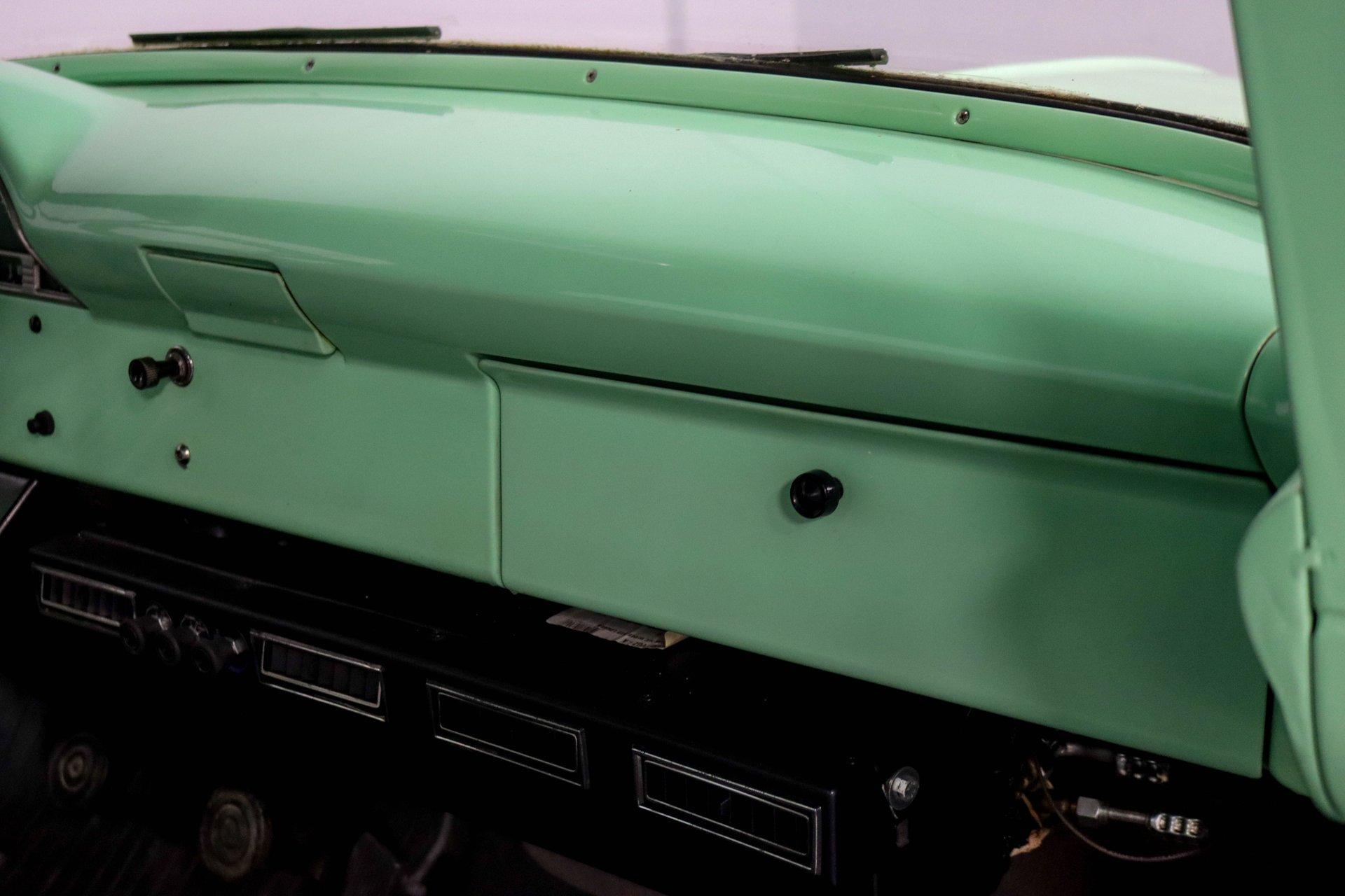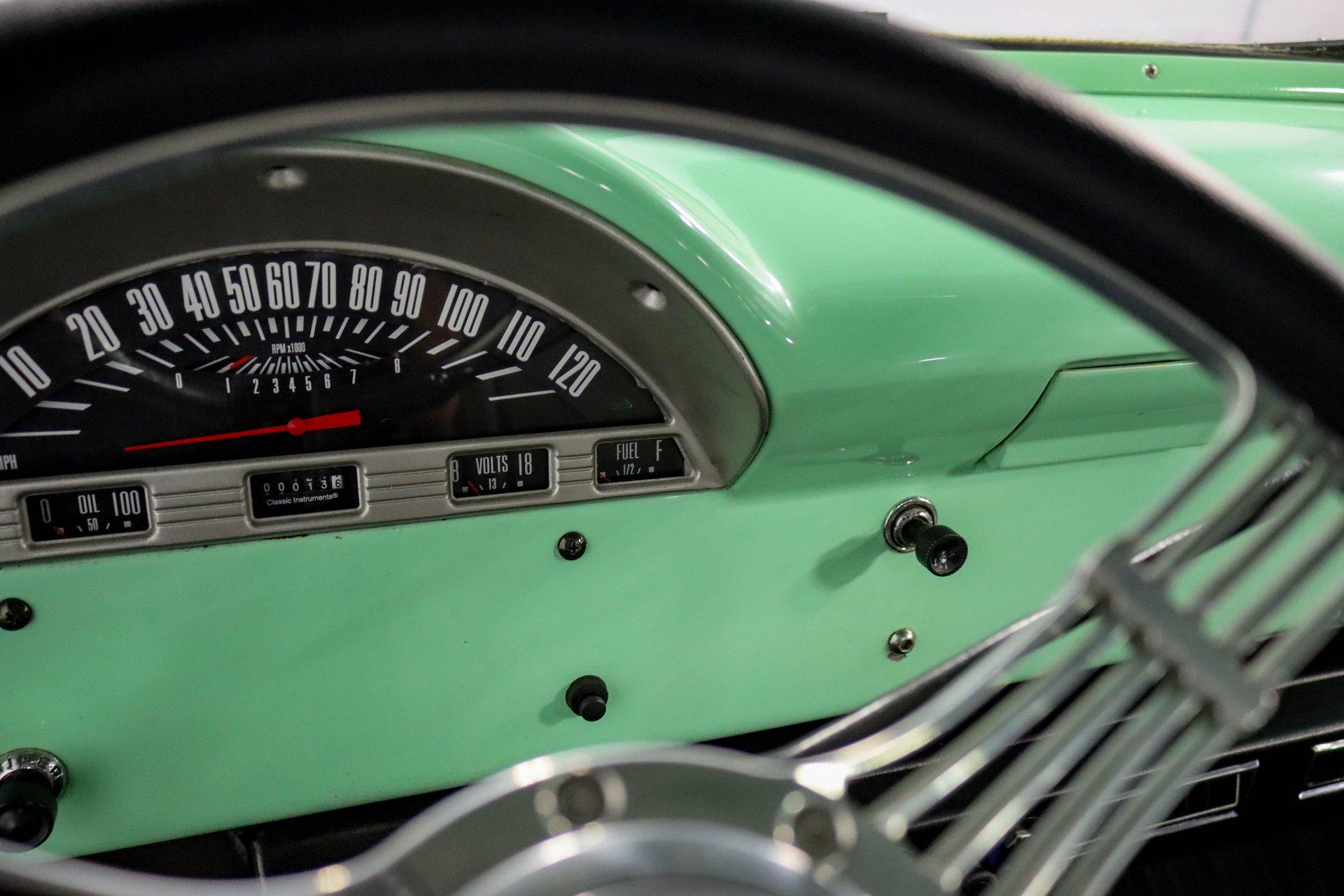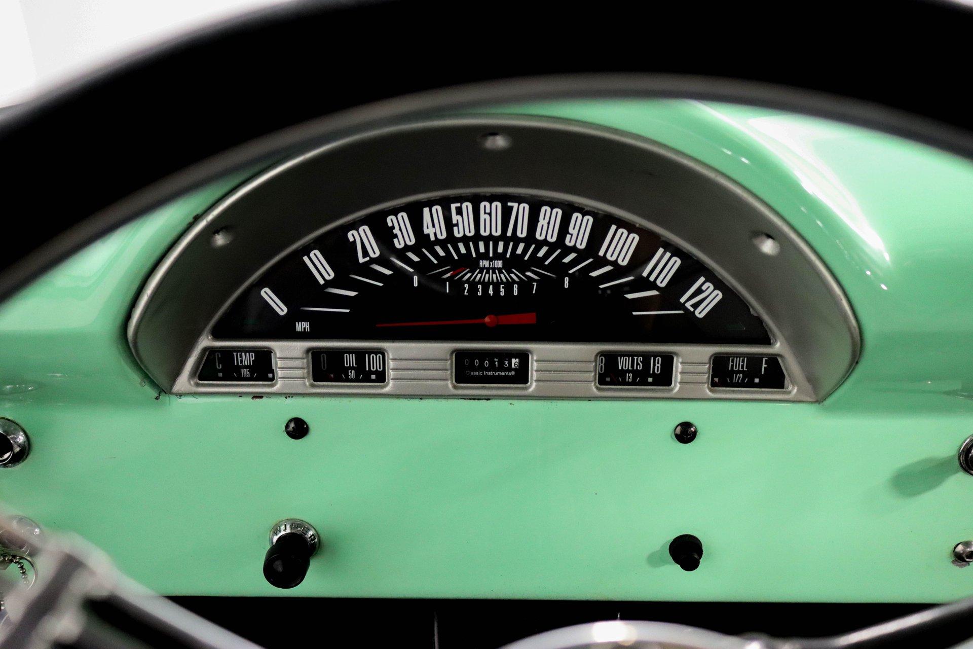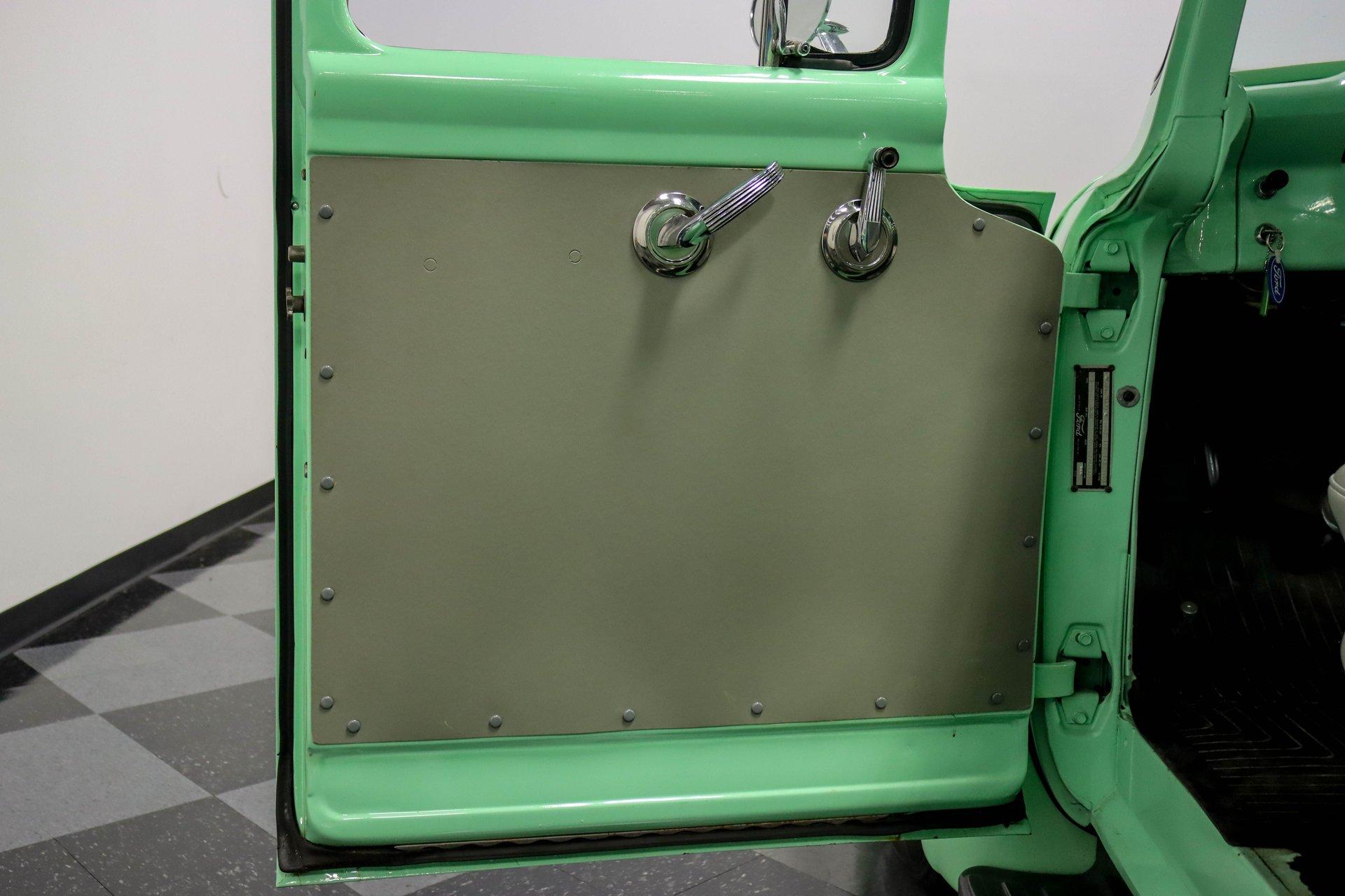 This 1956 Ford F-100 wears a coat of Meadow Mist Green, a factory-correct hue that paints a picture of wide-open Texas prairies. The truck's clean, flowing lines are enhanced by custom touches like an integrated fuel filler and streamlined tailgate. Sitting on 15-inch wheels wrapped in 235/75R15 tires, this F-100 cuts a striking figure, especially with its slightly lowered stance that gives it an extra dose of attitude. Inside, gray vinyl covers the bench seat and door panels, creating a crisp, period-appropriate interior. A banjo-style steering wheel adds a dash of style, while Classic Instruments gauges blend vintage looks with modern reliability. Power steering and under-dash air conditioning make this F-100 a joy to drive, whether you're cruising Main Street or heading out on the highway. The column-mounted shifter for the 3-speed manual transmission keeps things authentically old-school. Under the hood, Ford's 312 V8 takes center stage, breathing through an Edelbrock 4-barrel carburetor. The engine bay showcases a mix of original components and smart upgrades, including a Cadillac-style air grabber. An X-pipe dual exhaust system provides a muscular soundtrack, while power drum brakes at all four corners offer confident stopping power. This powertrain combo delivers plenty of get-up-and-go for cruising or hauling, staying true to the F-100's versatile nature. HIGHLIGHTS: 312 V8 engine 3-speed manual transmission Edelbrock 4-barrel carburetor X-pipe dual exhaust system Power steering Power brakes Lowered suspension Meadow Mist Green paint (factory correct) 15-inch wheels in 235/75R15 tires Custom smooth tailgate Integrated fuel filler in rear fender Vinyl "W" decal on doors Gray interior with bench seat Gray door panels Banjo-style steering wheel Classic Instruments gauges Under-dash air conditioning Body-off restoration This 1956 Ford F-100 combines classic style with subtle hot rod flair. From its potent V8 to its comfortable, upgraded interior, this truck offers an ideal blend of vintage appeal and modern drivability. Perfect for weekend cruises or daily drives, this F-100 is ready to hit the road. Call today!