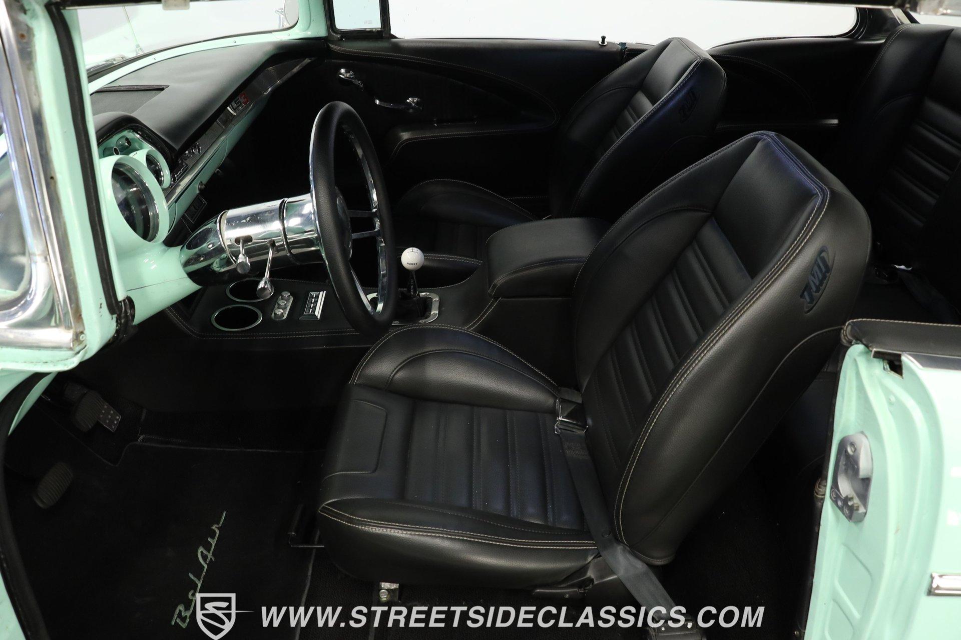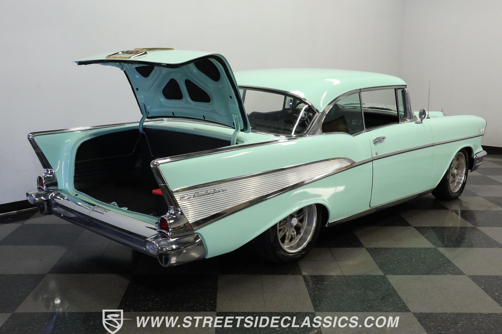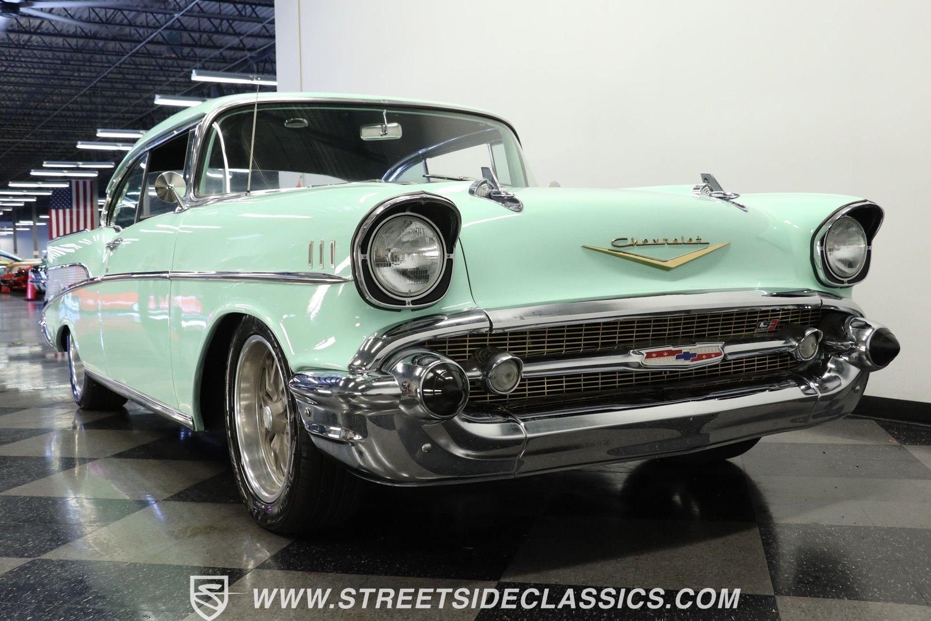 4723-TPA 1957 CHEVROLET BEL AIR LS3 RESTOMOD This 1957 Chevrolet Bel Air LS3 Restomod blends classic '50s styling with modern muscle. Its light green exterior gleams under showroom lights, showcasing the iconic '57 Chevy design. Chrome trim accentuates the sleek body lines, while 17-inch US Mag wheels wrapped in 225/55ZR17 tires provide a subtle yet aggressive stance. The hardtop silhouette maintains the car's timeless appeal, enhanced by well-preserved front and rear chrome, drip rails, and bumpers. Black vinyl TMI bucket seats and a matching rear bench dominate the interior, complemented by a custom center console housing a Hurst shifter. The dash, color-matched to the exterior, houses Dakota Digital gauges for a modern touch. A RetroSound radio and vintage AC controls blend old-school aesthetics with contemporary functionality. Power windows allow for easy operation of all side glass, adding convenience to the classic hardtop experience. Running with a 6.2-liter LS3 V8 engine, sourced from a 2018 Camaro. This powerhouse is mated to a Tremec T56 6-speed manual transmission, offering an exhilarating driving experience. The engine bay showcases ZZP coil packs and an upgraded aluminum radiator with electric fan assembly for improved cooling. A Wilwood brake master cylinder ensures confident stopping power through four-wheel disc brakes. The chassis benefits from A-arm front suspension with coilovers and leaf springs in the rear, striking a balance between classic feel and modern handling. HIGHLIGHTS: 6.2L LS3 V8 engine (2018 Camaro sourced) Tremec T56 6-speed manual transmission Power 4-wheel disc brakes Power steering Upgraded aluminum radiator with electric fan ZZP coil packs Wilwood brake master cylinder A-arm front suspension with coilovers Light green paint 17" US Mag wheels in 225/55ZR17 tires Chrome trim and bumpers 2-door hardtop body style Black vinyl bucket seats and rear bench Dakota Digital gauges Custom center console with Hurst shifter RetroSound radio Vintage AC controls Tilt steering column Power windows Optima Red Top battery (trunk-mounted) This 1957 Chevrolet Bel Air LS3 Restomod combines iconic '50s style with modern performance. With its potent LS3 V8, six-speed manual, and tasteful upgrades throughout, it delivers a driving experience that's both nostalgic and thrilling. Call today!
