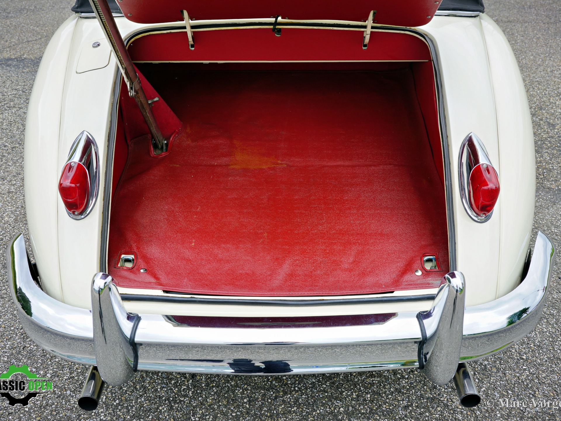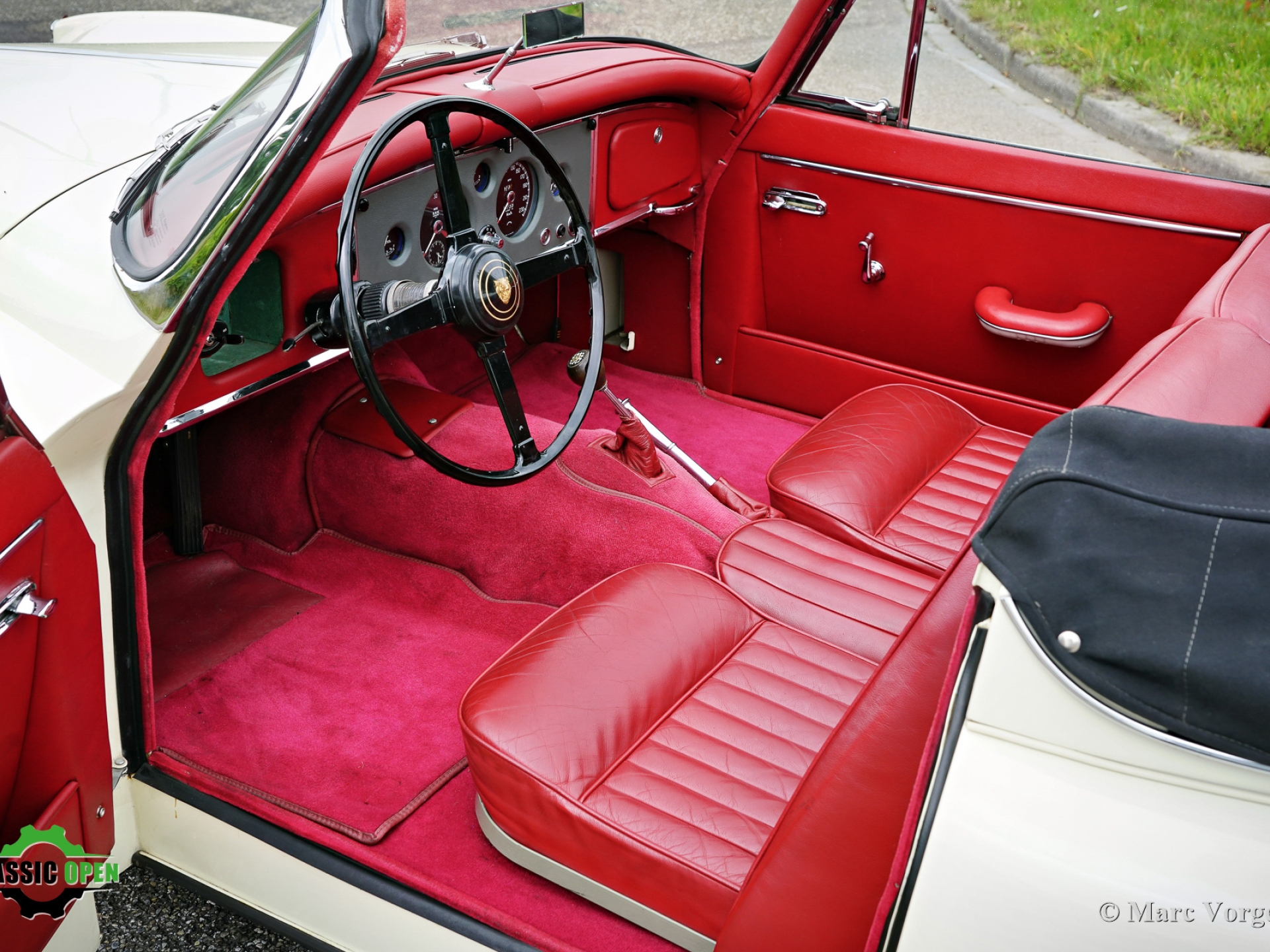 Colour cream white (Old English white) combined with a red leather interior trimmed with red carpet. Black mohair hood and a black mohair hood cover.