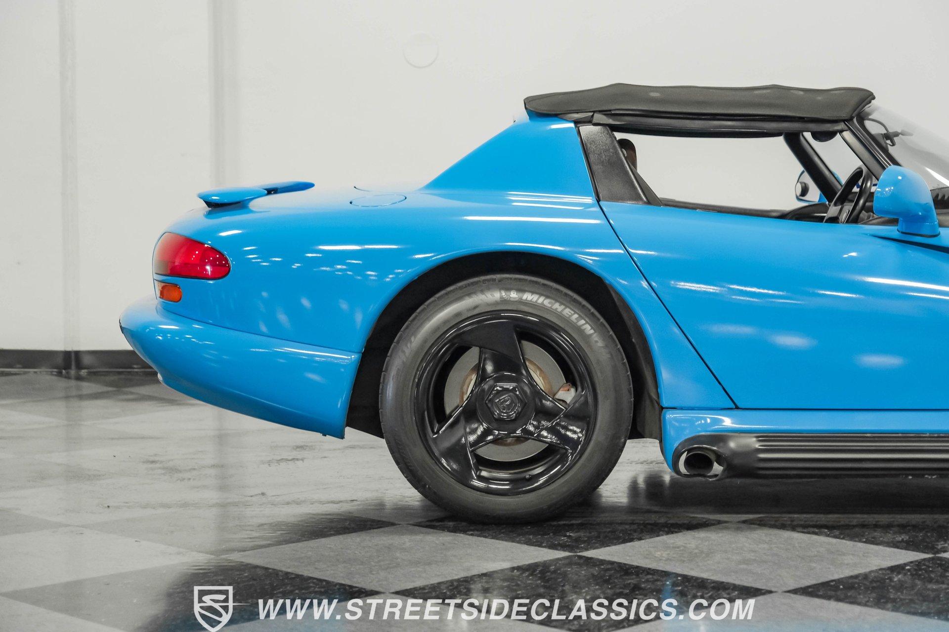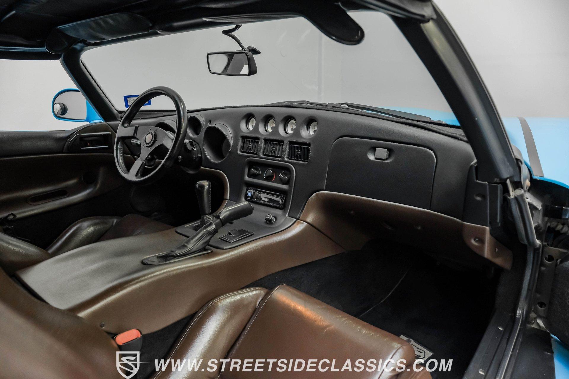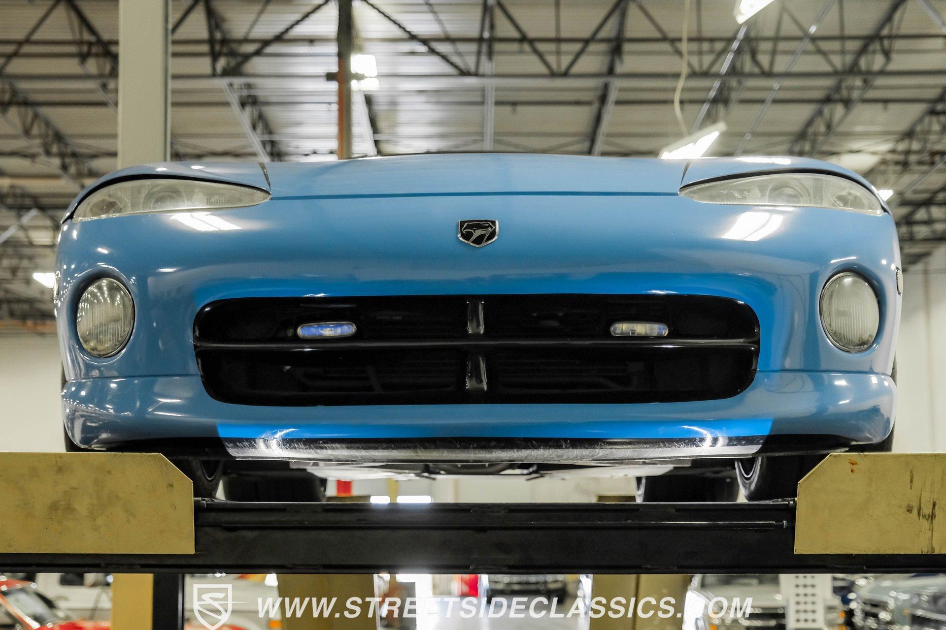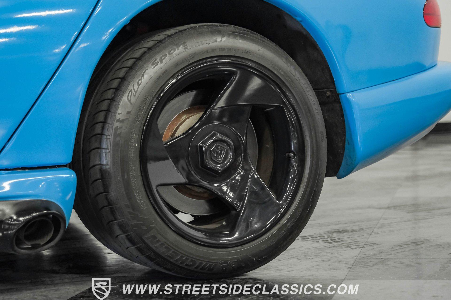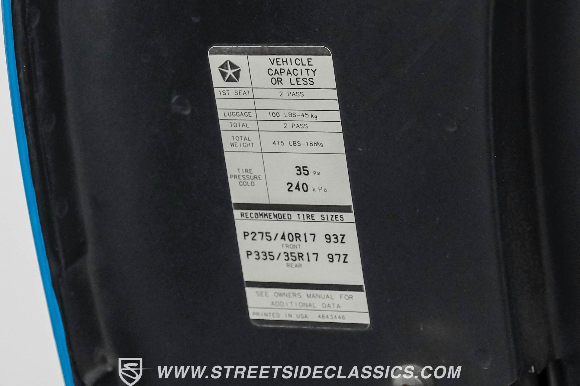 This 1995 Dodge Viper RT-10 roars to life with only 51,004 original miles on the odometer. The exterior flaunts a striking blue vinyl wrap, giving this American muscle icon a modern edge. Black 17-inch wheels create a stark contrast against the vibrant body, amplifying its aggressive stance. The side-pipe shield, emblems, and wheels all sport a sleek black finish, adding to the car's formidable presence. A removable targa top with a black cloth roof and detachable side and rear glass offers the freedom to choose between open-air thrills or closed-cabin comfort. Michelin tires (275/40ZR17 front, 335/35ZR17 rear) provide the grip needed to tame this powerhouse. Inside showcases a custom brown leather interior that exudes luxury and sophistication. Expertly crafted bucket seats cradle driver and passenger, while the leather-wrapped steering wheel and floor-mounted shifter put complete control at your fingertips. The tilt column allows for the perfect driving position, essential for harnessing the Viper's raw power. An Alpine AM/FM/CD player, paired with strategically placed Alpine speakers between the seats, ensures your drive has a soundtrack to match the Viper's performance. The center console and air conditioning add comfort to this high-performance machine. Open the clamshell hood to reveal the massive 8.0-liter V10 engine. This powerhouse is mated to a 6-speed manual transmission, delivering an engaging and visceral driving experience. The independent suspension system, both front and rear, coupled with power disc brakes at all four corners, ensures that this Viper handles curves as adeptly as it dominates straightaways. Power steering adds precision to every maneuver. The side-exit exhaust system not only looks incredible but produces a thunderous growl that announces your arrival with authority. HIGHLIGHTS: 8.0 Liter V10 Engine 6 Speed Manual Transmission Electronic Fuel Injection Independent Front & Rear Suspension Power Disc Brakes Power Steering Side-Exit Exhaust System Blue Vinyl Wrap 17" Black Wheels 275/40ZR17 Front, 335/35ZR17 Rear Michelin Tires Black Side-Pipe Shield Black Emblems Removable Targa Top Removable Side and Rear Glass Custom Brown Leather Interior with Bucket Seats Leather-Wrapped Steering Wheel Tilt Steering Column Floor-Mounted Shifter Air Conditioning Alpine AM/FM/CD Player Alpine Speakers Owner's Manual 51,004 Original Miles This 1995 Dodge Viper RT-10 exemplifies American muscle car excellence. Its custom blue wrap, luxurious brown leather interior, and the raw power of the V10 engine create an unparalleled driving experience. Call today!