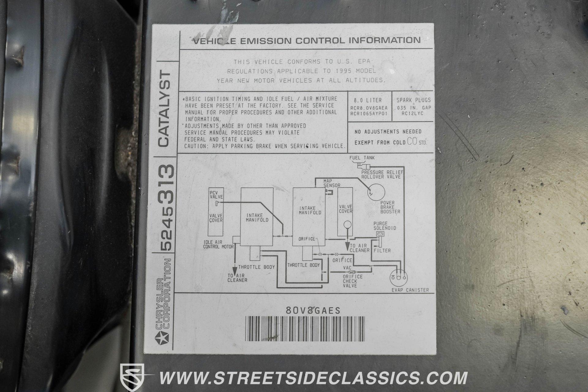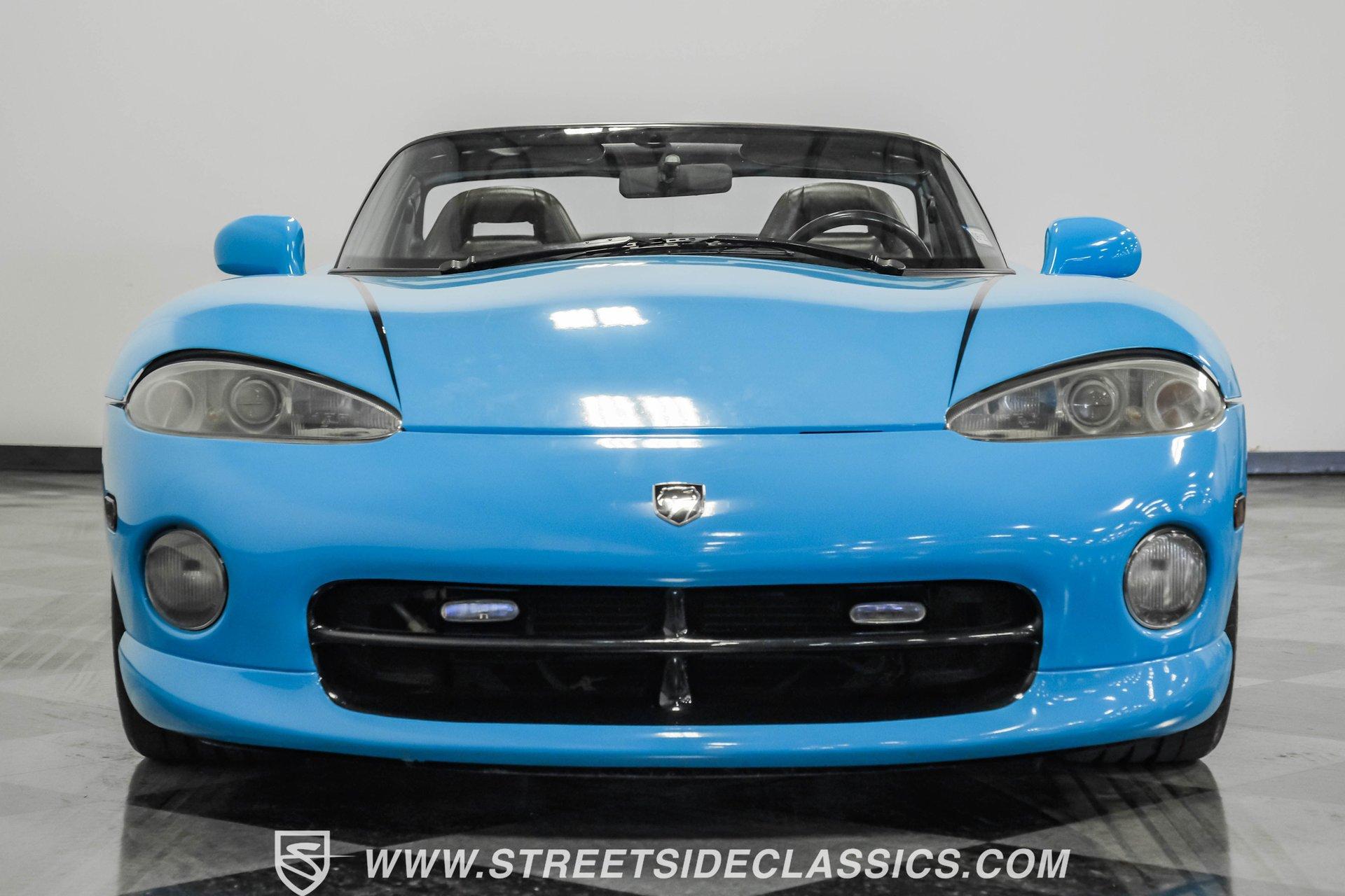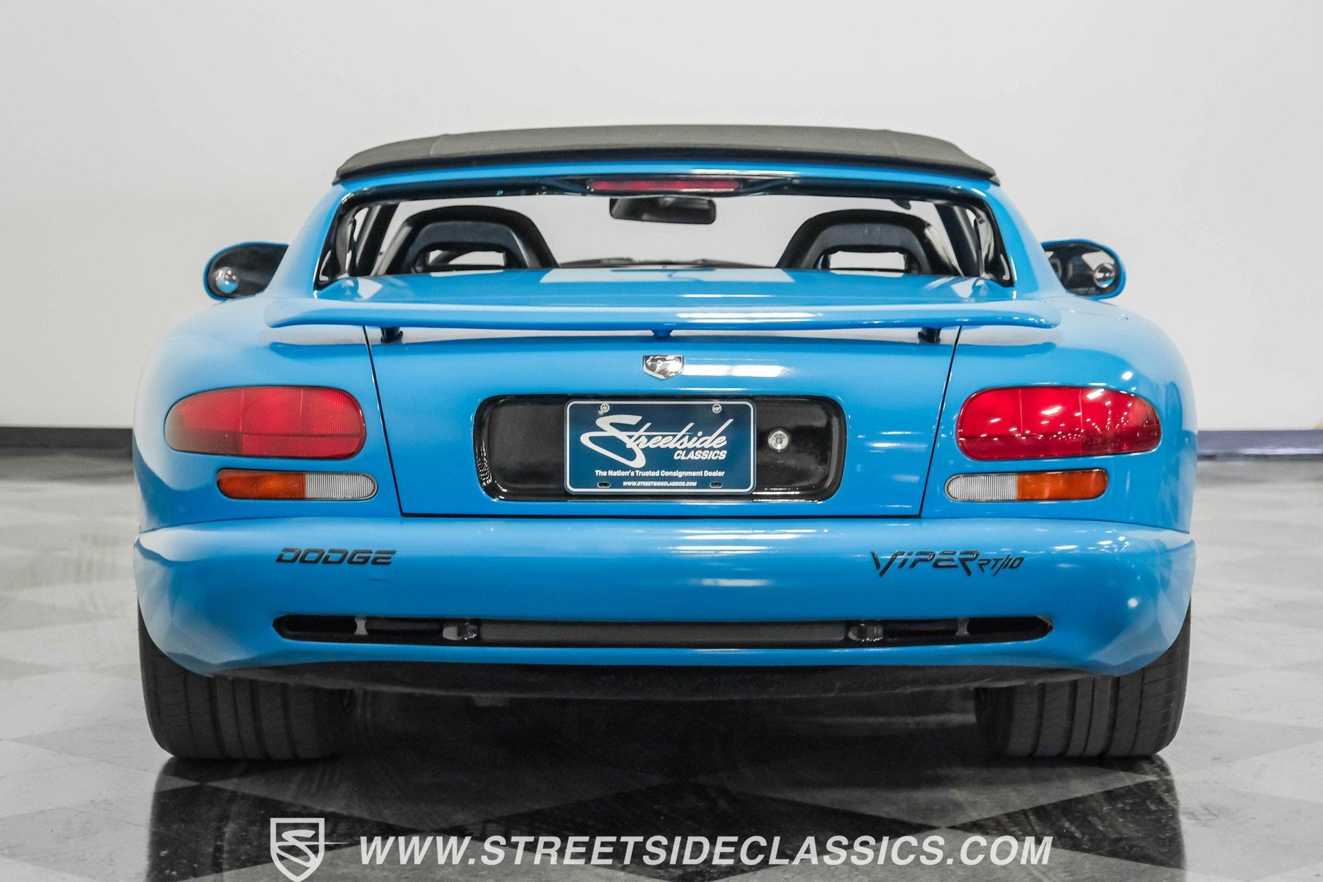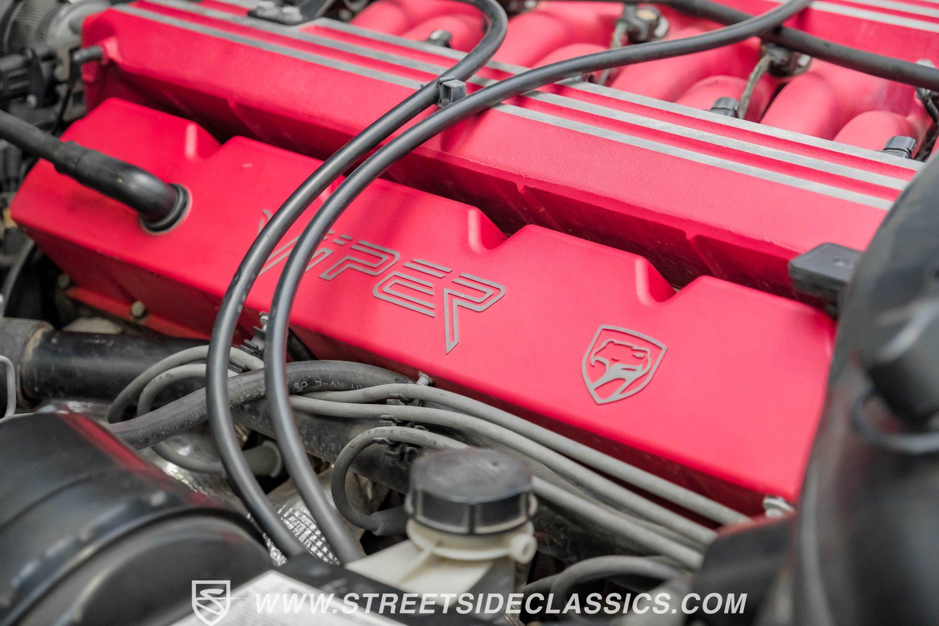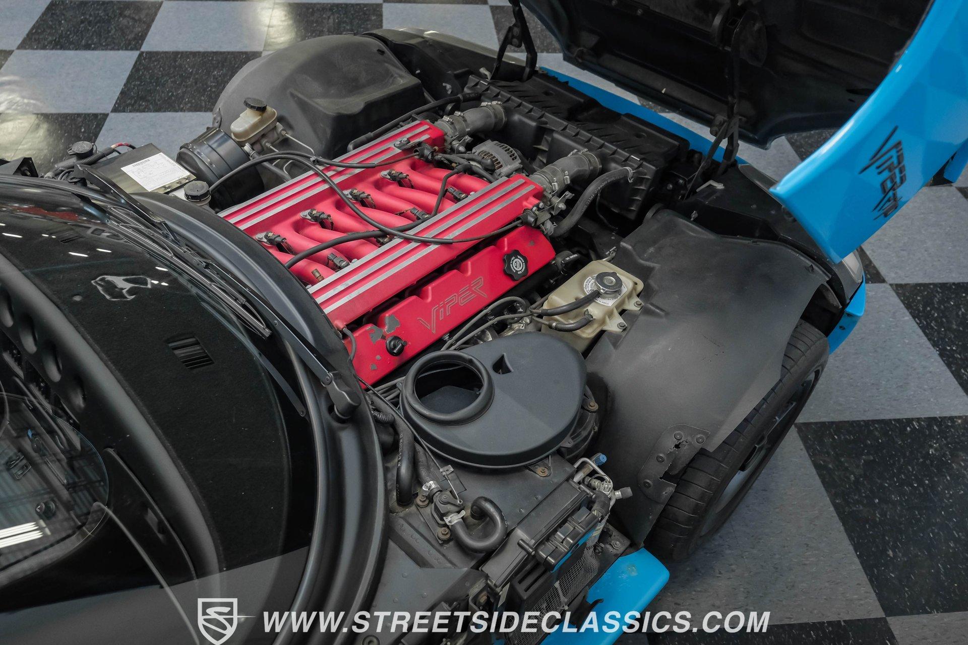 This 1995 Dodge Viper RT-10 roars to life with only 51,004 original miles on the odometer. The exterior flaunts a striking blue vinyl wrap, giving this American muscle icon a modern edge. Black 17-inch wheels create a stark contrast against the vibrant body, amplifying its aggressive stance. The side-pipe shield, emblems, and wheels all sport a sleek black finish, adding to the car's formidable presence. A removable targa top with a black cloth roof and detachable side and rear glass offers the freedom to choose between open-air thrills or closed-cabin comfort. Michelin tires (275/40ZR17 front, 335/35ZR17 rear) provide the grip needed to tame this powerhouse. Inside showcases a custom brown leather interior that exudes luxury and sophistication. Expertly crafted bucket seats cradle driver and passenger, while the leather-wrapped steering wheel and floor-mounted shifter put complete control at your fingertips. The tilt column allows for the perfect driving position, essential for harnessing the Viper's raw power. An Alpine AM/FM/CD player, paired with strategically placed Alpine speakers between the seats, ensures your drive has a soundtrack to match the Viper's performance. The center console and air conditioning add comfort to this high-performance machine. Open the clamshell hood to reveal the massive 8.0-liter V10 engine. This powerhouse is mated to a 6-speed manual transmission, delivering an engaging and visceral driving experience. The independent suspension system, both front and rear, coupled with power disc brakes at all four corners, ensures that this Viper handles curves as adeptly as it dominates straightaways. Power steering adds precision to every maneuver. The side-exit exhaust system not only looks incredible but produces a thunderous growl that announces your arrival with authority. HIGHLIGHTS: 8.0 Liter V10 Engine 6 Speed Manual Transmission Electronic Fuel Injection Independent Front & Rear Suspension Power Disc Brakes Power Steering Side-Exit Exhaust System Blue Vinyl Wrap 17" Black Wheels 275/40ZR17 Front, 335/35ZR17 Rear Michelin Tires Black Side-Pipe Shield Black Emblems Removable Targa Top Removable Side and Rear Glass Custom Brown Leather Interior with Bucket Seats Leather-Wrapped Steering Wheel Tilt Steering Column Floor-Mounted Shifter Air Conditioning Alpine AM/FM/CD Player Alpine Speakers Owner's Manual 51,004 Original Miles This 1995 Dodge Viper RT-10 exemplifies American muscle car excellence. Its custom blue wrap, luxurious brown leather interior, and the raw power of the V10 engine create an unparalleled driving experience. Call today!