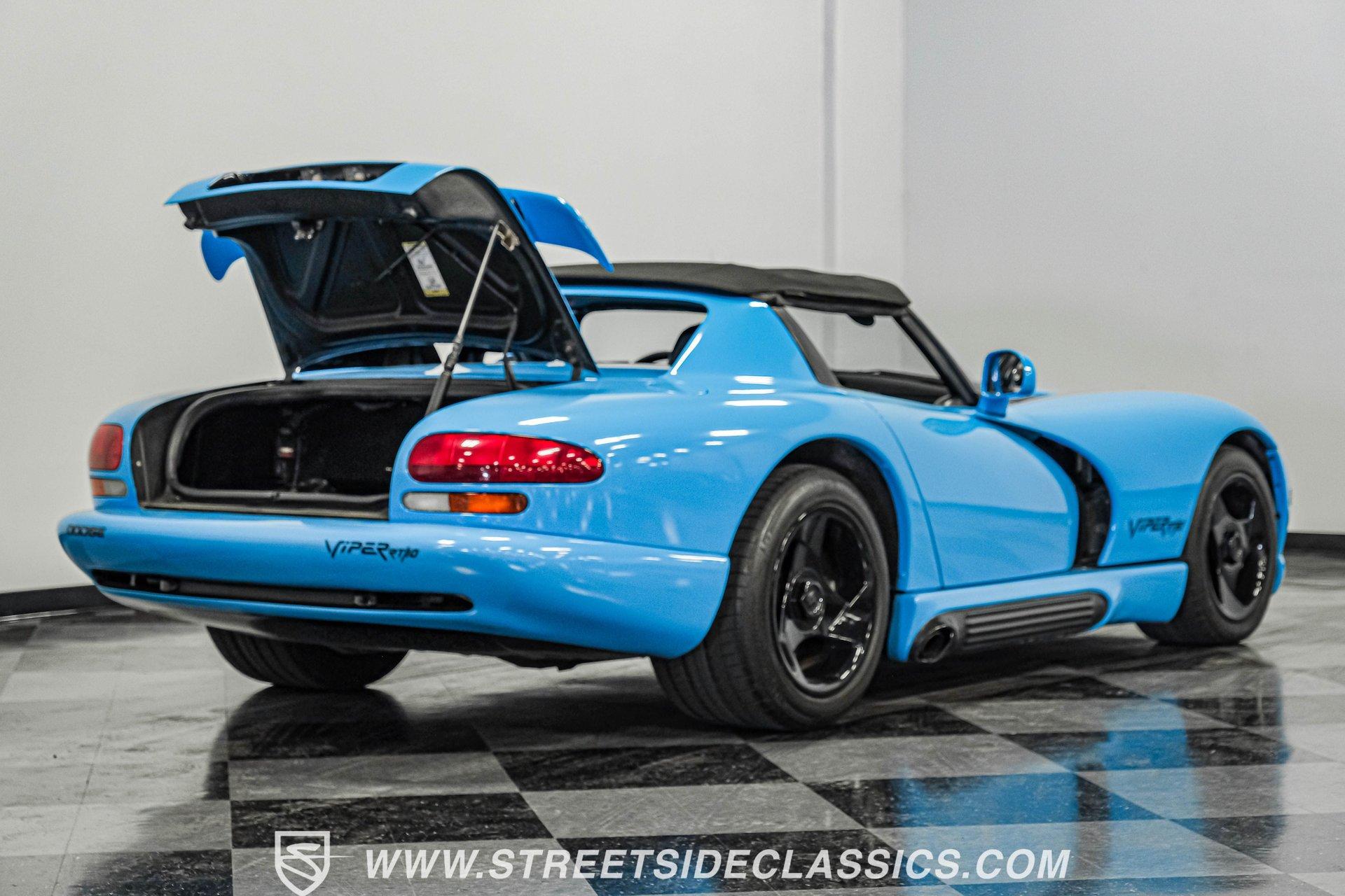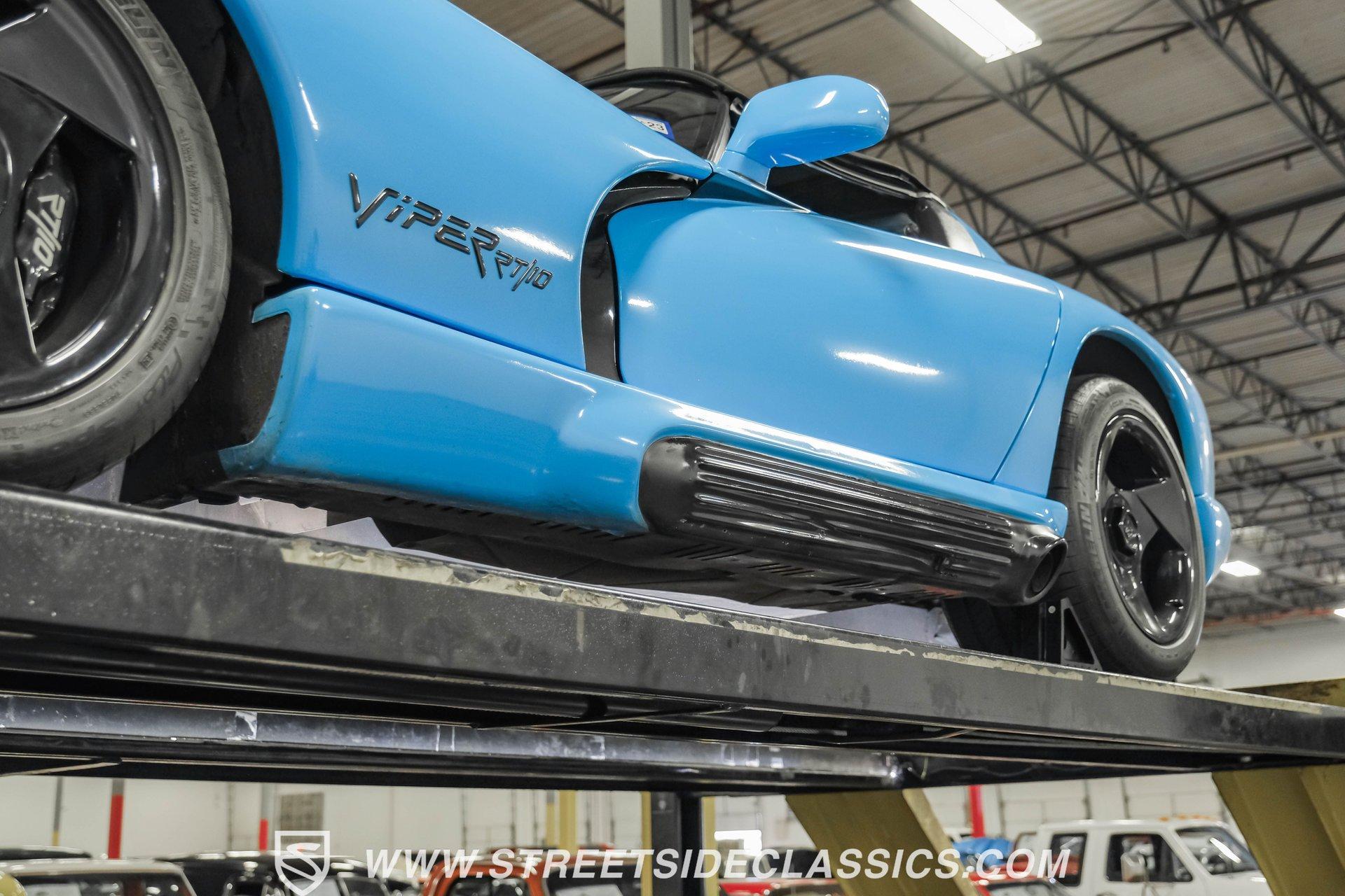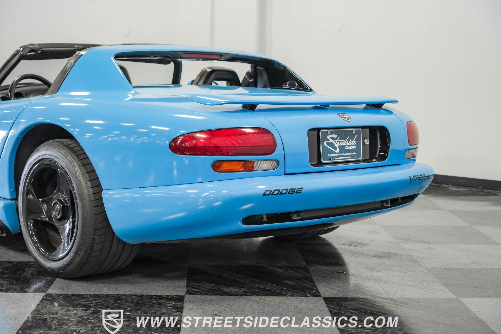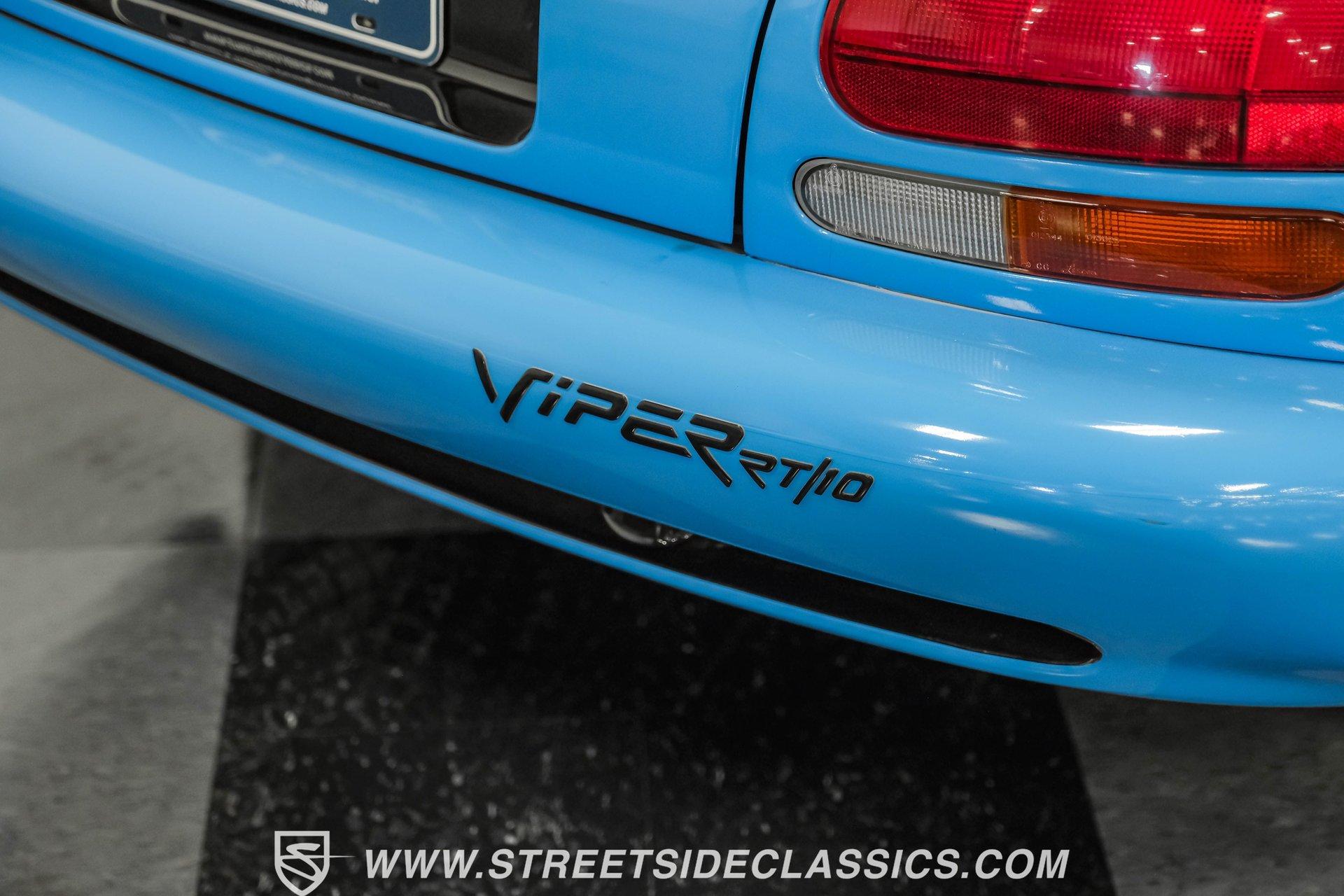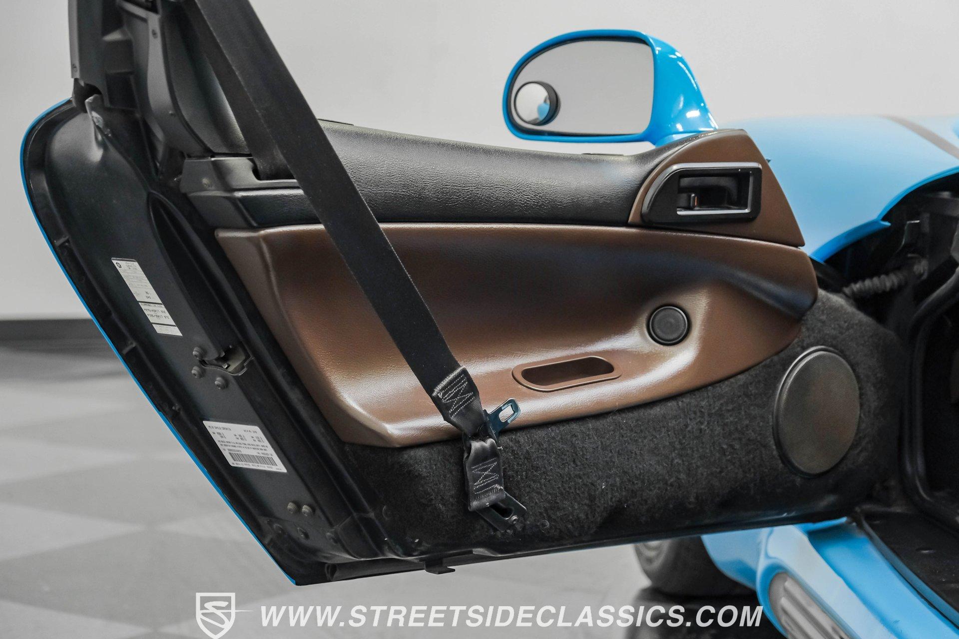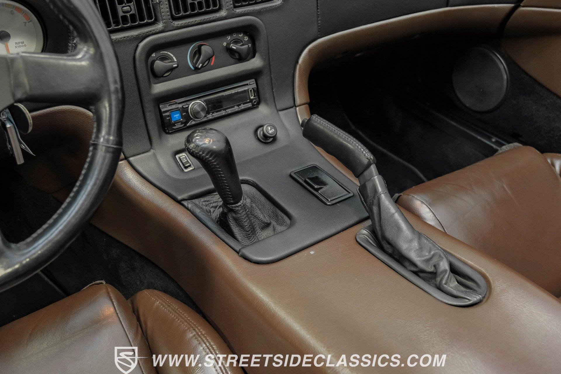 This 1995 Dodge Viper RT-10 roars to life with only 51,004 original miles on the odometer. The exterior flaunts a striking blue vinyl wrap, giving this American muscle icon a modern edge. Black 17-inch wheels create a stark contrast against the vibrant body, amplifying its aggressive stance. The side-pipe shield, emblems, and wheels all sport a sleek black finish, adding to the car's formidable presence. A removable targa top with a black cloth roof and detachable side and rear glass offers the freedom to choose between open-air thrills or closed-cabin comfort. Michelin tires (275/40ZR17 front, 335/35ZR17 rear) provide the grip needed to tame this powerhouse. Inside showcases a custom brown leather interior that exudes luxury and sophistication. Expertly crafted bucket seats cradle driver and passenger, while the leather-wrapped steering wheel and floor-mounted shifter put complete control at your fingertips. The tilt column allows for the perfect driving position, essential for harnessing the Viper's raw power. An Alpine AM/FM/CD player, paired with strategically placed Alpine speakers between the seats, ensures your drive has a soundtrack to match the Viper's performance. The center console and air conditioning add comfort to this high-performance machine. Open the clamshell hood to reveal the massive 8.0-liter V10 engine. This powerhouse is mated to a 6-speed manual transmission, delivering an engaging and visceral driving experience. The independent suspension system, both front and rear, coupled with power disc brakes at all four corners, ensures that this Viper handles curves as adeptly as it dominates straightaways. Power steering adds precision to every maneuver. The side-exit exhaust system not only looks incredible but produces a thunderous growl that announces your arrival with authority. HIGHLIGHTS: 8.0 Liter V10 Engine 6 Speed Manual Transmission Electronic Fuel Injection Independent Front & Rear Suspension Power Disc Brakes Power Steering Side-Exit Exhaust System Blue Vinyl Wrap 17" Black Wheels 275/40ZR17 Front, 335/35ZR17 Rear Michelin Tires Black Side-Pipe Shield Black Emblems Removable Targa Top Removable Side and Rear Glass Custom Brown Leather Interior with Bucket Seats Leather-Wrapped Steering Wheel Tilt Steering Column Floor-Mounted Shifter Air Conditioning Alpine AM/FM/CD Player Alpine Speakers Owner's Manual 51,004 Original Miles This 1995 Dodge Viper RT-10 exemplifies American muscle car excellence. Its custom blue wrap, luxurious brown leather interior, and the raw power of the V10 engine create an unparalleled driving experience. Call today!