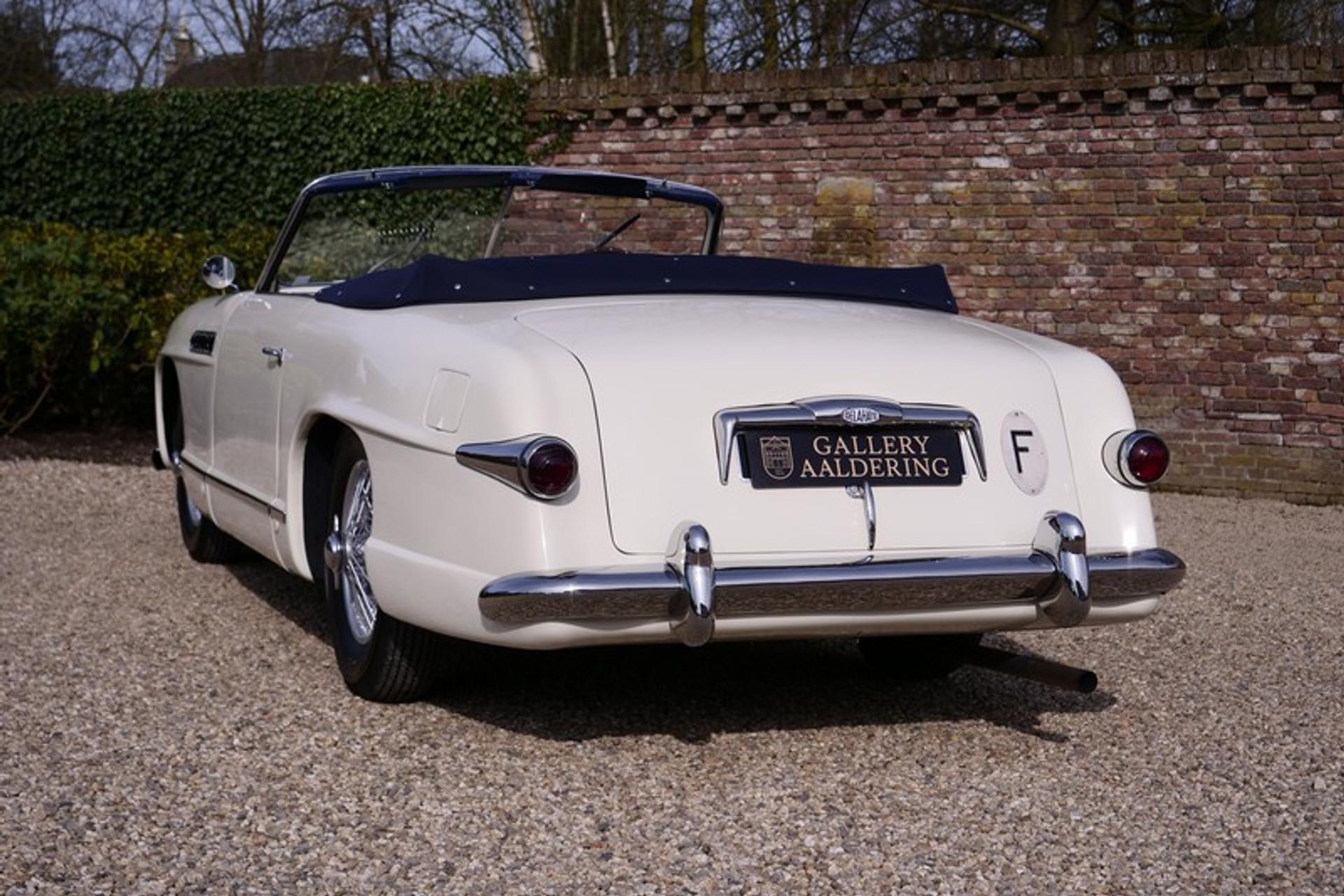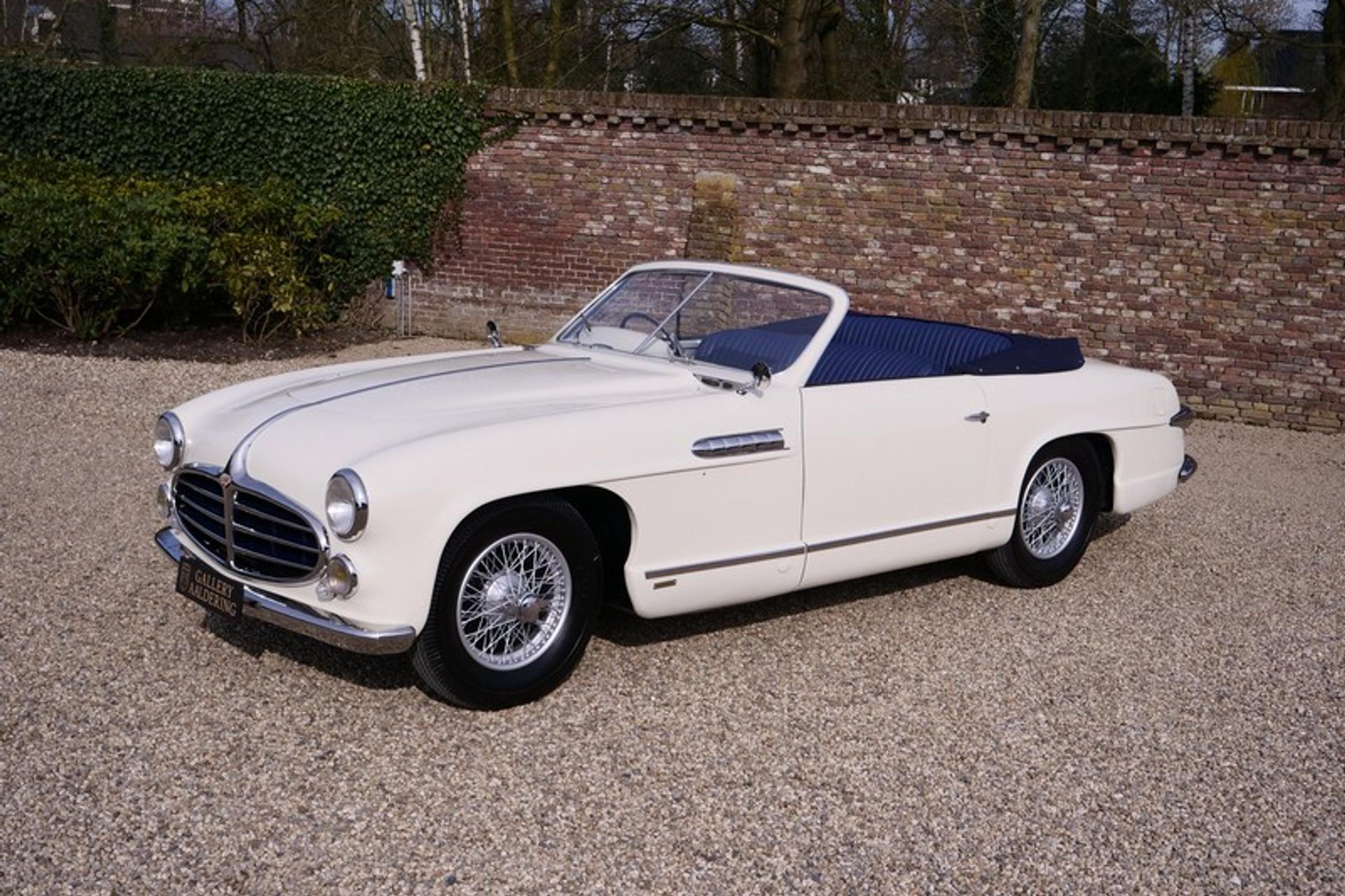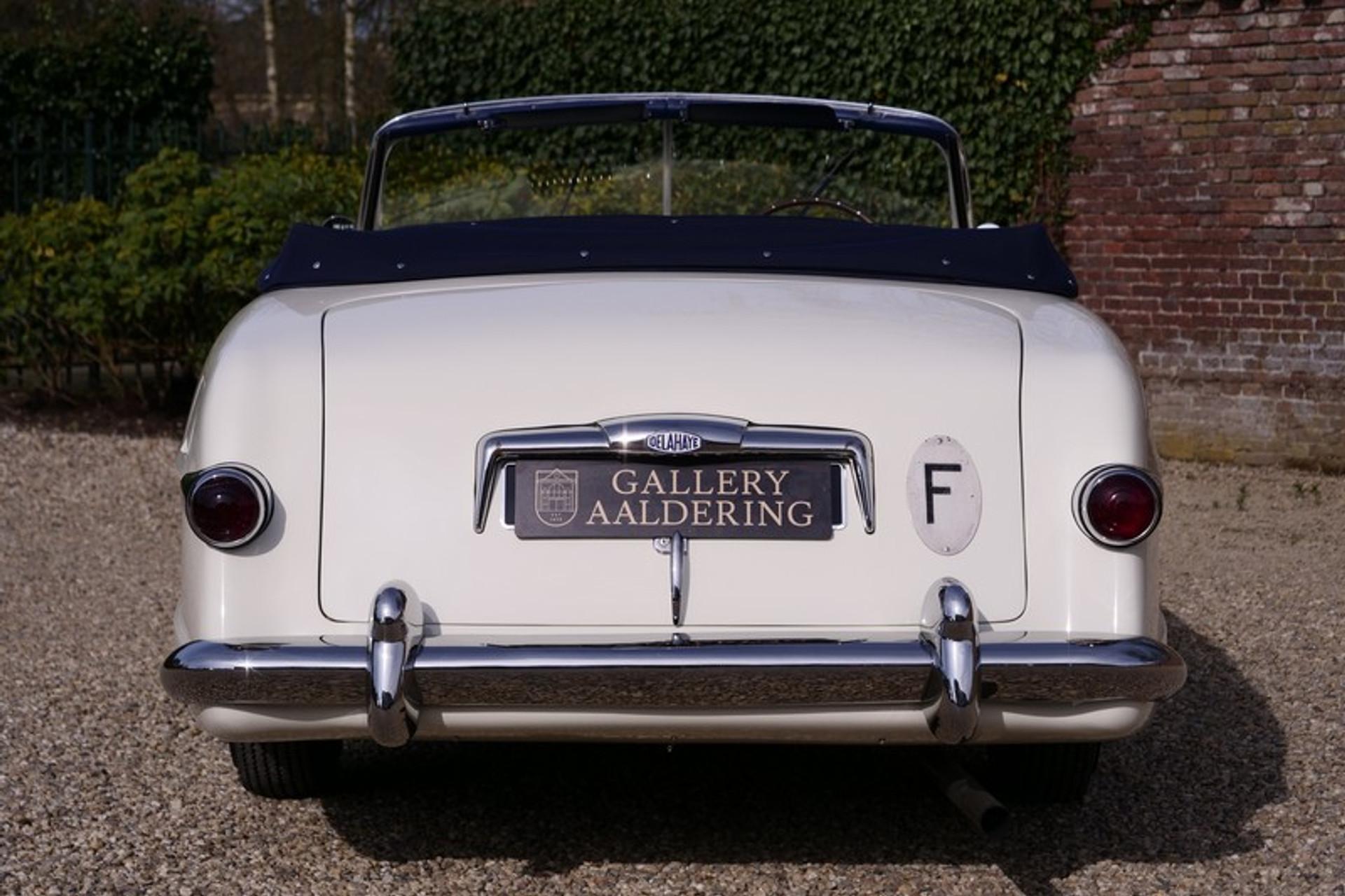 This is the ultimate in French grandeur! The car we have is a very special Delahaye! It is an Delahaye 235 convertible by Antem! The Delahaye 235 succeed the 135 series, built between 1935 and early 1954. The 235 series has the famous and renowned 3500 cc 6-cylinder, triple carburettor engine producing 152 Hp and a top speed of 180 km/hr. At the time it was thought that these figures were out of this world and was seen as the “The ultimate in Grand Touring” model by Delahaye. Only 85 examples of the 235 were ever made and came in a variety of body shapes such as the Coupe, Roadster, Coach and Convertible. A number of the days top bodywork builders and designers were commissioned; illustrious names such as Letourneur & Merchant, Figoni & Falaschi, Saoutchik, Motto ,Chapron en Antem were engaged! Antem eventually built 14 of the 85 cars of which just 1 out them all was a convertible! Our car is that convertible with chassis number 818022. It is a world beating design, a car in which the lines and styling can only be properly appreciated when you see the car in the flesh! There is such an abundance of lovely design elements that the accolade of art is really no exaggeration! It was no coincidence that chassis number 818022 served as the Grand Palais 1952 Paris Motor Show feature car! It was first registered( 6772 BN 75) on the 6th November 1952 to a Parisian who kept the car until early 1957. In March 1957 it was sold to its second owner, again a Parisian, Mr. Victor Franssen originally of Belgium descent and know from various international movies. It was sold again in 1963, to be exact on the 21st June, with retention of the original number plates and registration. The new owner was another Parisian inhabitant a Mr Lucienne Sergent, lawyer. Many years later the car became part of the famous Mr. Philippe Charbonneaux collection in Reims where it was exhibited in its museum. In 1985 the title passed to his son and became part of his daughter's collection. Up to this time the car enjoyed good maintenance and remained in original condition with exception of the paintwork. A lovely and rather special detail is the steering wheel which was especially commissioned for the Paris Motor Show! A few years ago between 2012-2014 the last owner arranged for a well-known French specialist to totally restore and mechanically overhaul the car. This was a thorough job with no expense or effort spared and completed with a keen eye to details and authenticity. The bodywork was subjected to a Bare-Metal restoration, everything was attended to including the wiring loom, instruments, a re-spray in the original finish, a completely new interior trim in the original colour and summer hood. The full mechanical overhaul included the engine, brakes and “Cotal” gearbox. Driving this abundantly powered car is a real feast. The whole restoration process has been documented with many photos and invoices. This is car that warrants its own book. A truly amazing styled Delahaye, the official Paris Motor Show car, unique, a one-off, its history known from day 1 with supporting evidence. No doubt this is a true collectors item! Gallery Aaldering is Europe's leading Classic Cars specialist since 1975! Always 300-350 Classic and Sportscars in stock, please visit www.gallery-aaldering.com for the current stock list (all offered cars are available in our showroom) and further information. We are located near the German border, 95 km from Düsseldorf and 90 km from Amsterdam. So easy traveling by plane, train, taxi and car. Transport and worldwide shipping can be arranged. No duties/import costs within Europe. We buy, sell and provide consignment sales (selling on behalf of the owner). We can arrange/provide registration/papers for our German (H-Kennzeichen, TÜV, Fahrzeugbrief, Wertgutachten usw.) and Benelux customers. Gallery Aaldering, Arnhemsestraat 47, 6971 AP Brummen, The Netherlands. Tel: 0031-575-564055. Quality, experience and transparency is what sets us apart. We look forward to welcoming you in our showroom
