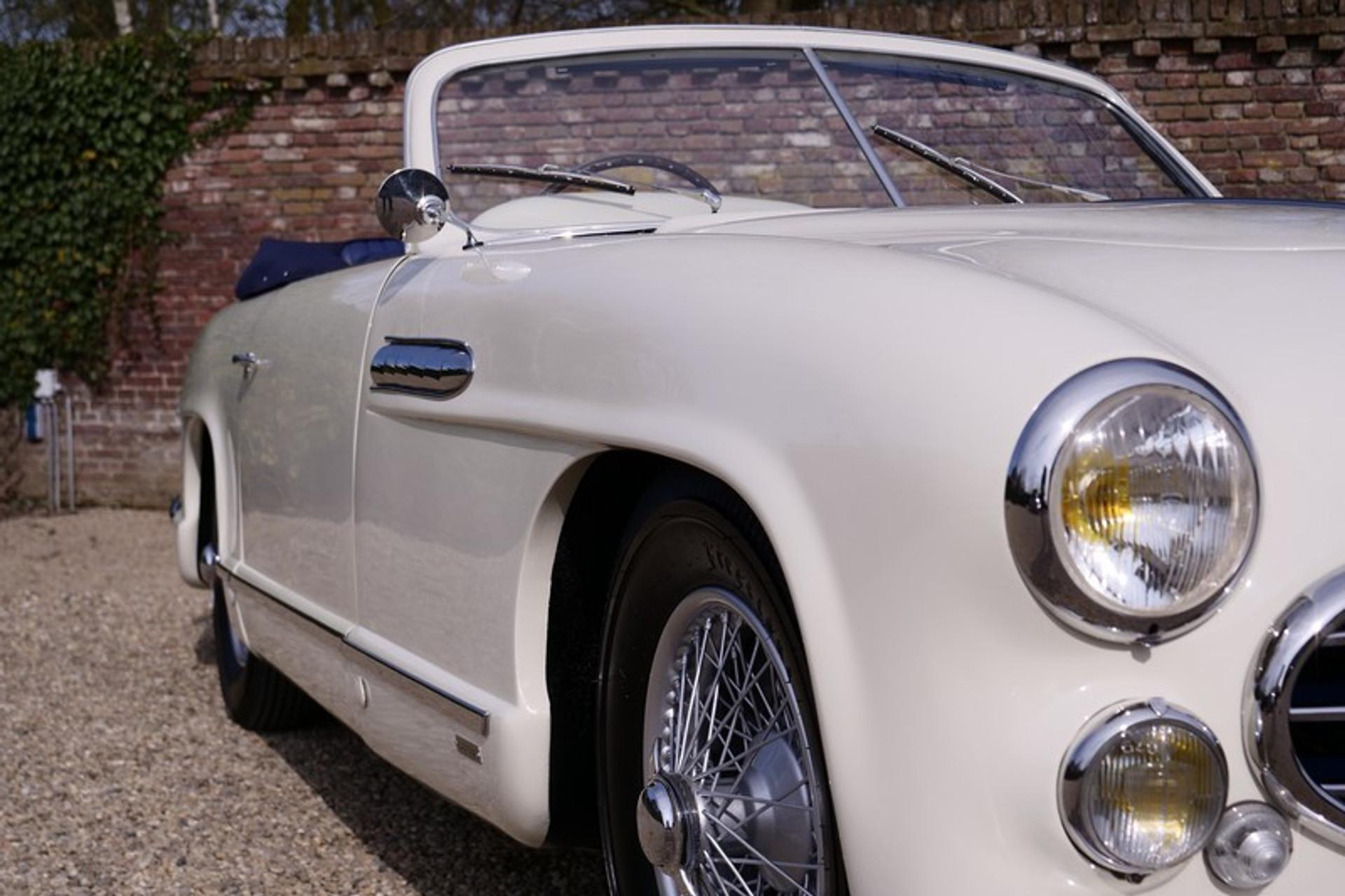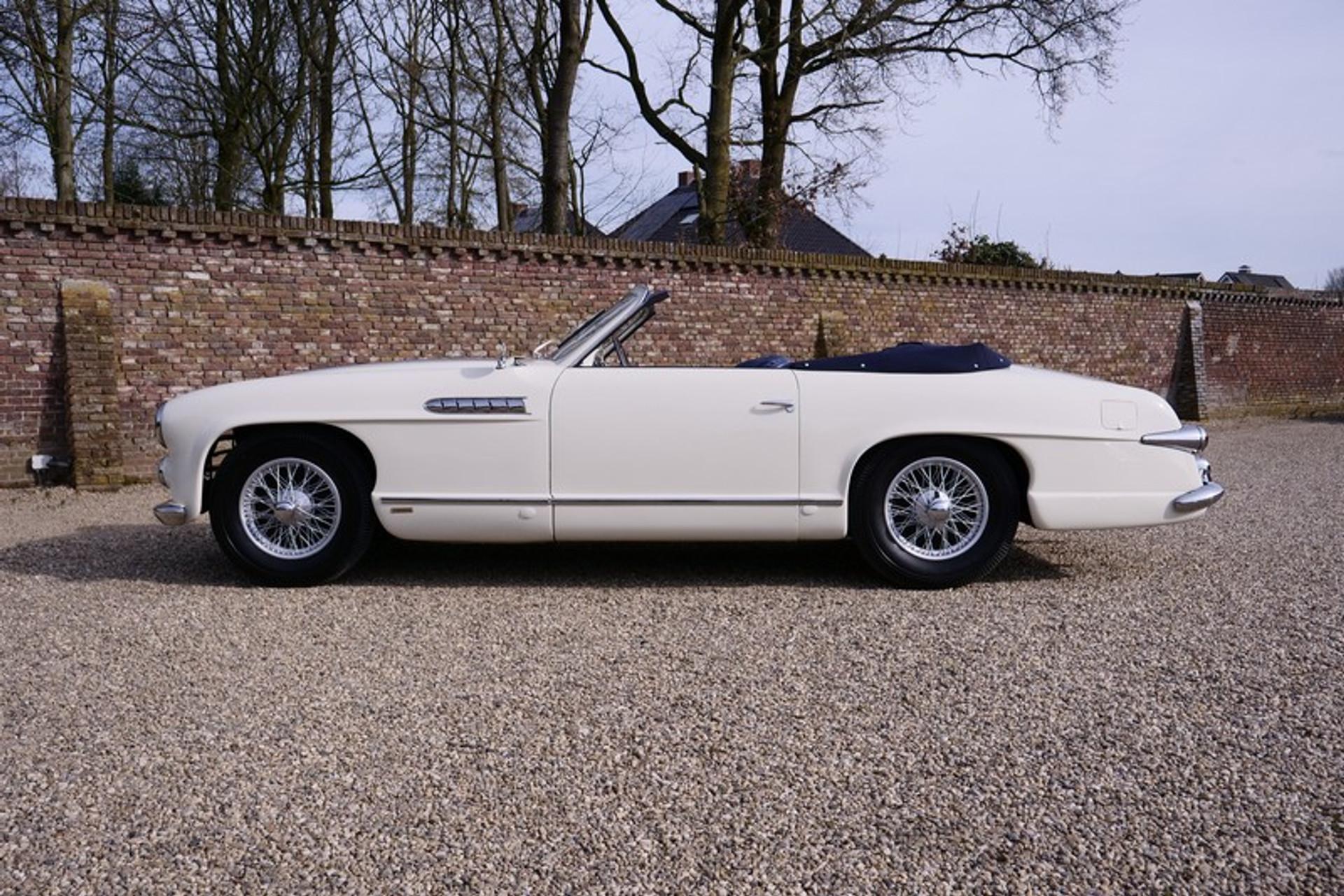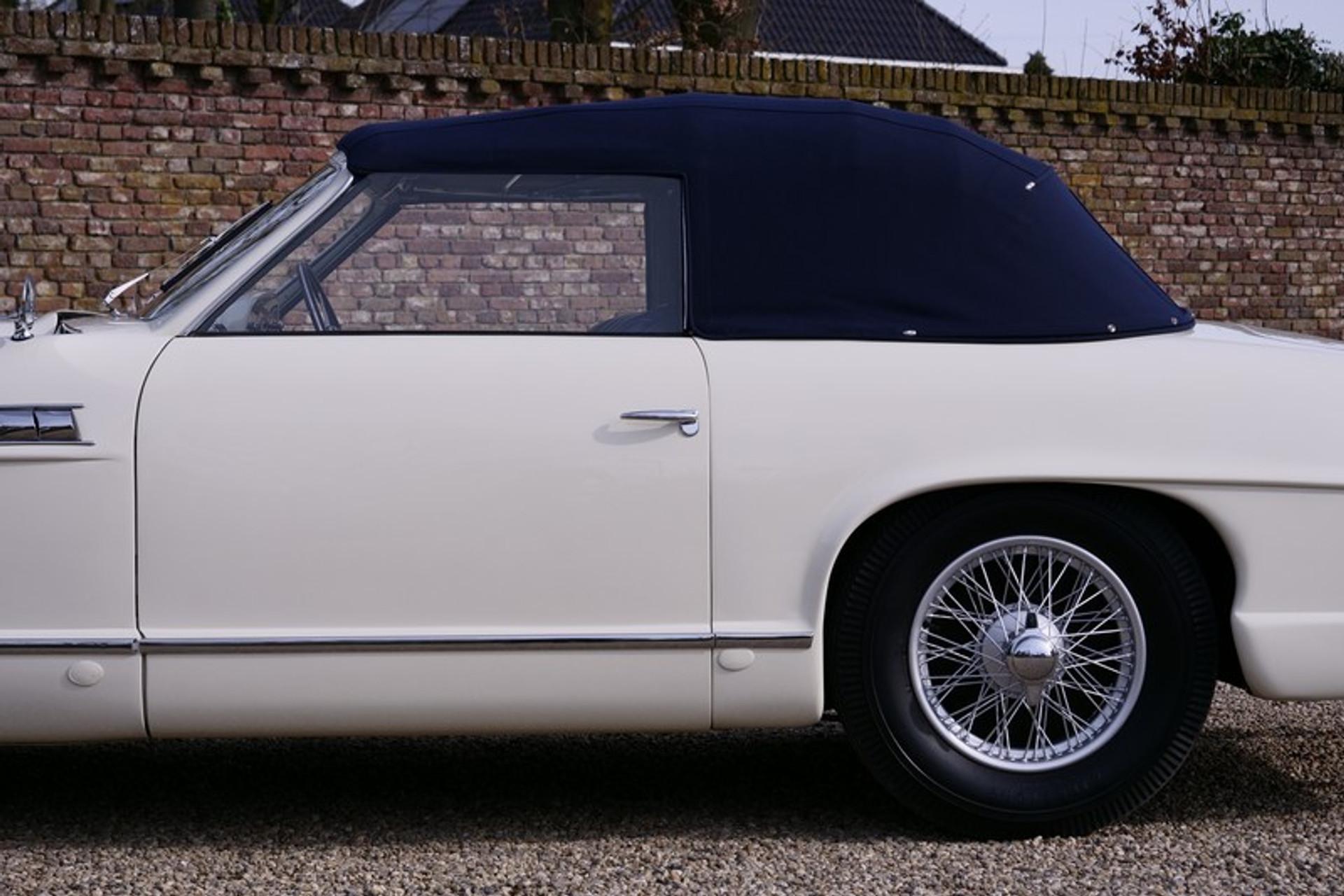 This is the ultimate in French grandeur! The car we have is a very special Delahaye! It is an Delahaye 235 convertible by Antem! The Delahaye 235 succeed the 135 series, built between 1935 and early 1954. The 235 series has the famous and renowned 3500 cc 6-cylinder, triple carburettor engine producing 152 Hp and a top speed of 180 km/hr. At the time it was thought that these figures were out of this world and was seen as the “The ultimate in Grand Touring” model by Delahaye. Only 85 examples of the 235 were ever made and came in a variety of body shapes such as the Coupe, Roadster, Coach and Convertible. A number of the days top bodywork builders and designers were commissioned; illustrious names such as Letourneur & Merchant, Figoni & Falaschi, Saoutchik, Motto ,Chapron en Antem were engaged! Antem eventually built 14 of the 85 cars of which just 1 out them all was a convertible! Our car is that convertible with chassis number 818022. It is a world beating design, a car in which the lines and styling can only be properly appreciated when you see the car in the flesh! There is such an abundance of lovely design elements that the accolade of art is really no exaggeration! It was no coincidence that chassis number 818022 served as the Grand Palais 1952 Paris Motor Show feature car! It was first registered( 6772 BN 75) on the 6th November 1952 to a Parisian who kept the car until early 1957. In March 1957 it was sold to its second owner, again a Parisian, Mr. Victor Franssen originally of Belgium descent and know from various international movies. It was sold again in 1963, to be exact on the 21st June, with retention of the original number plates and registration. The new owner was another Parisian inhabitant a Mr Lucienne Sergent, lawyer. Many years later the car became part of the famous Mr. Philippe Charbonneaux collection in Reims where it was exhibited in its museum. In 1985 the title passed to his son and became part of his daughter's collection. Up to this time the car enjoyed good maintenance and remained in original condition with exception of the paintwork. A lovely and rather special detail is the steering wheel which was especially commissioned for the Paris Motor Show! A few years ago between 2012-2014 the last owner arranged for a well-known French specialist to totally restore and mechanically overhaul the car. This was a thorough job with no expense or effort spared and completed with a keen eye to details and authenticity. The bodywork was subjected to a Bare-Metal restoration, everything was attended to including the wiring loom, instruments, a re-spray in the original finish, a completely new interior trim in the original colour and summer hood. The full mechanical overhaul included the engine, brakes and “Cotal” gearbox. Driving this abundantly powered car is a real feast. The whole restoration process has been documented with many photos and invoices. This is car that warrants its own book. A truly amazing styled Delahaye, the official Paris Motor Show car, unique, a one-off, its history known from day 1 with supporting evidence. No doubt this is a true collectors item! Gallery Aaldering is Europe's leading Classic Cars specialist since 1975! Always 300-350 Classic and Sportscars in stock, please visit www.gallery-aaldering.com for the current stock list (all offered cars are available in our showroom) and further information. We are located near the German border, 95 km from Düsseldorf and 90 km from Amsterdam. So easy traveling by plane, train, taxi and car. Transport and worldwide shipping can be arranged. No duties/import costs within Europe. We buy, sell and provide consignment sales (selling on behalf of the owner). We can arrange/provide registration/papers for our German (H-Kennzeichen, TÜV, Fahrzeugbrief, Wertgutachten usw.) and Benelux customers. Gallery Aaldering, Arnhemsestraat 47, 6971 AP Brummen, The Netherlands. Tel: 0031-575-564055. Quality, experience and transparency is what sets us apart. We look forward to welcoming you in our showroom