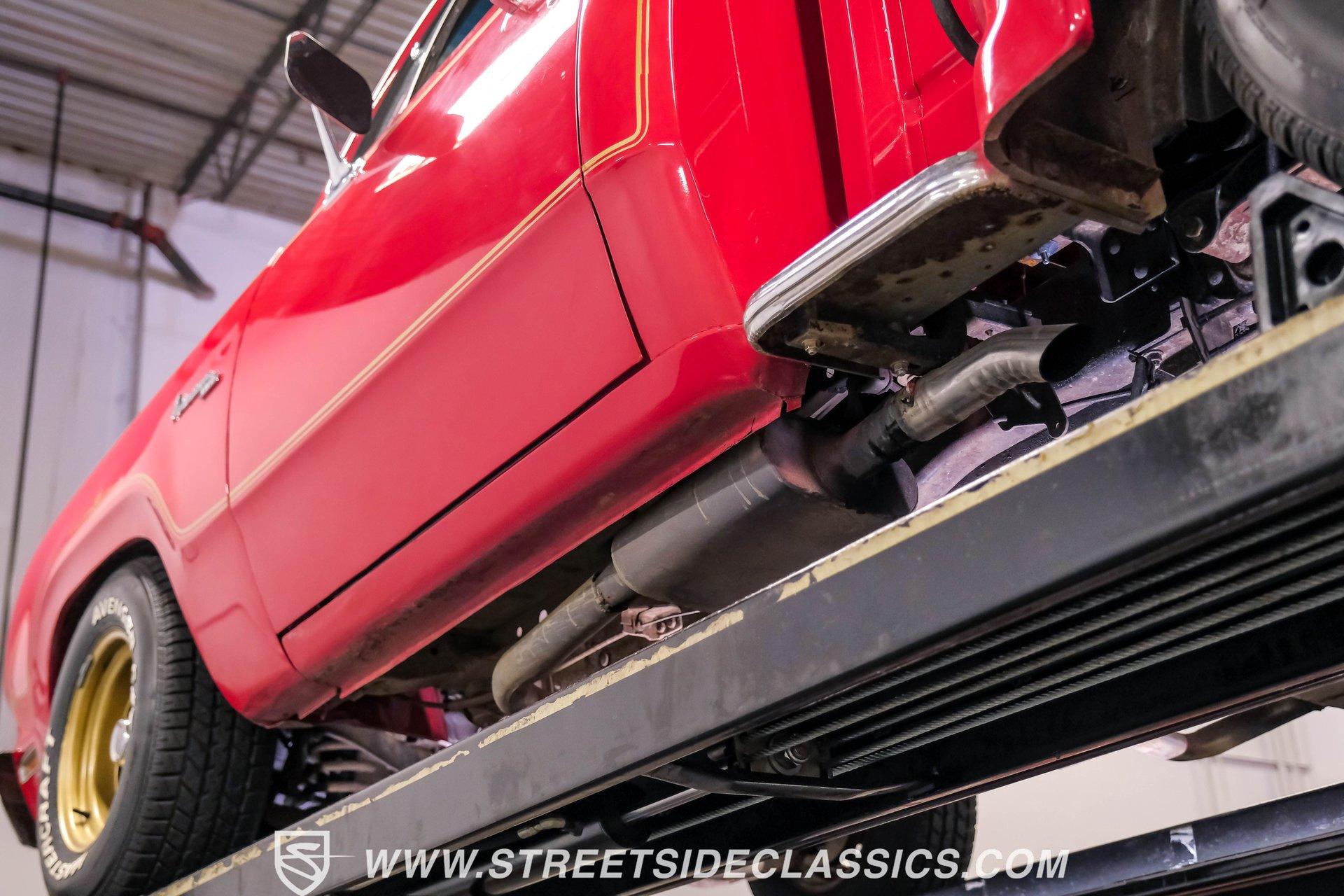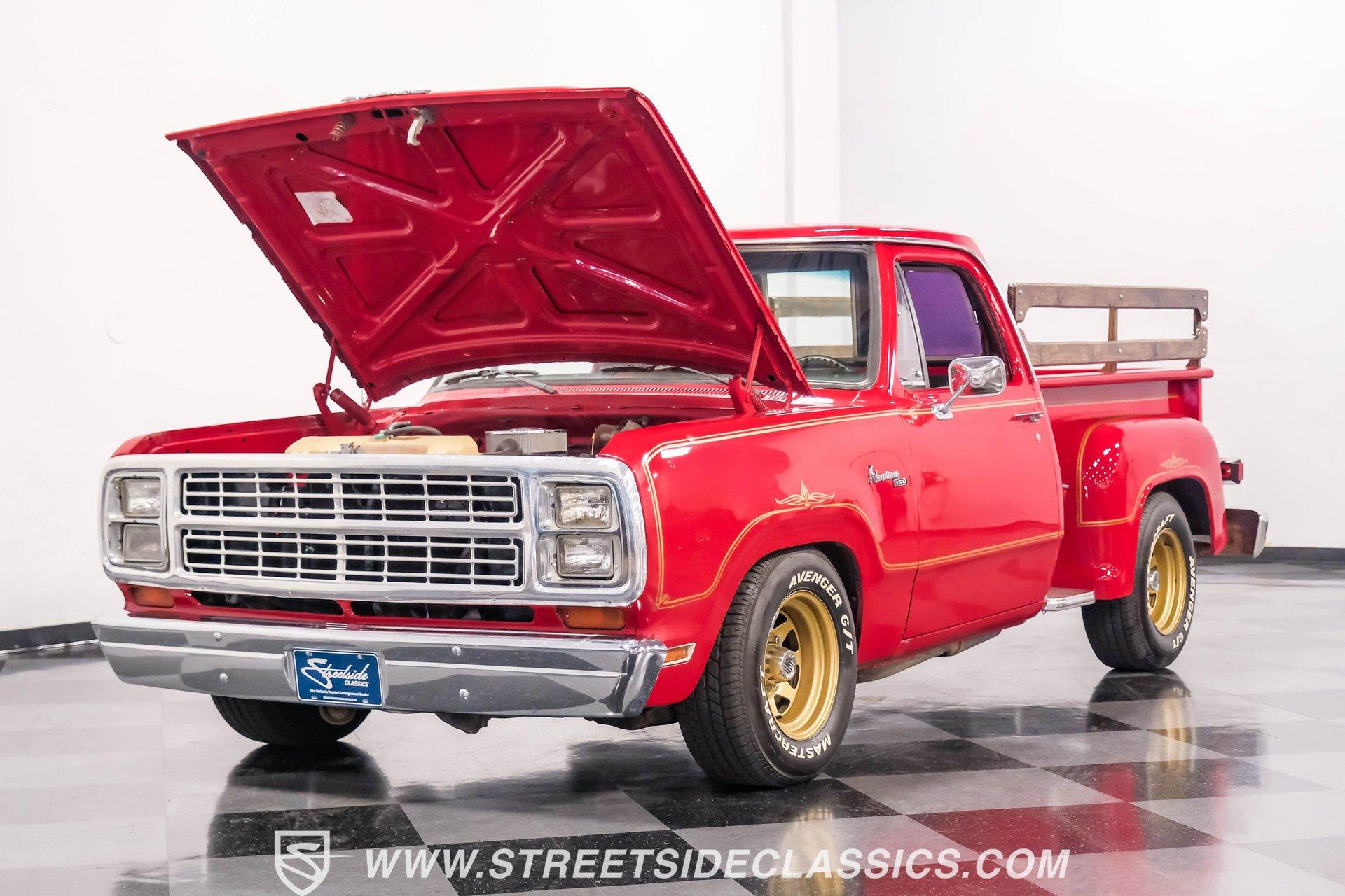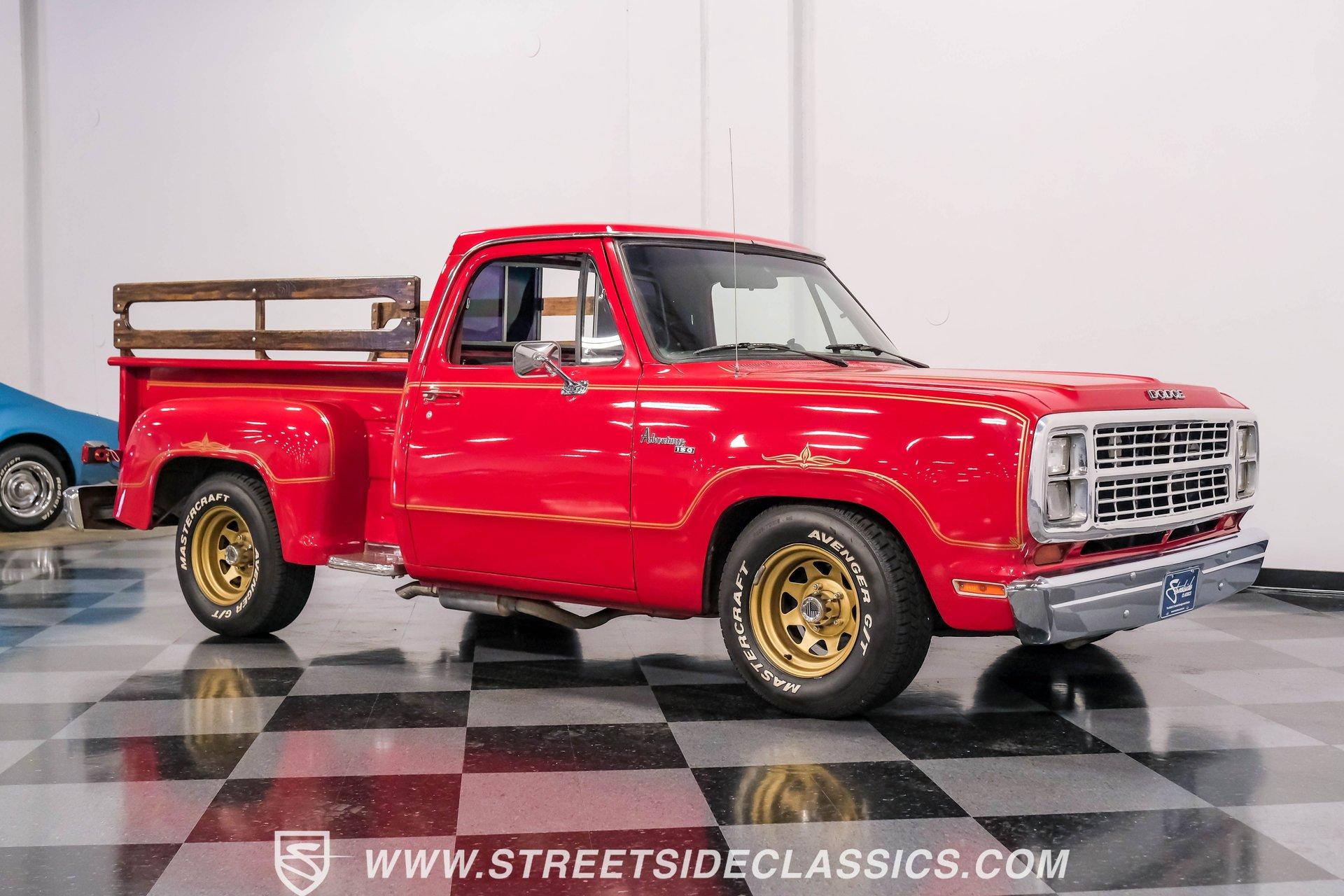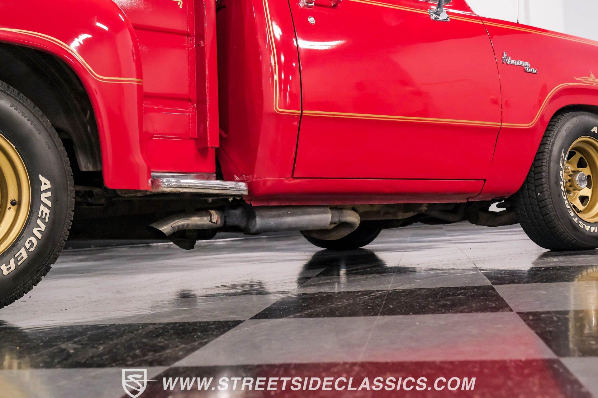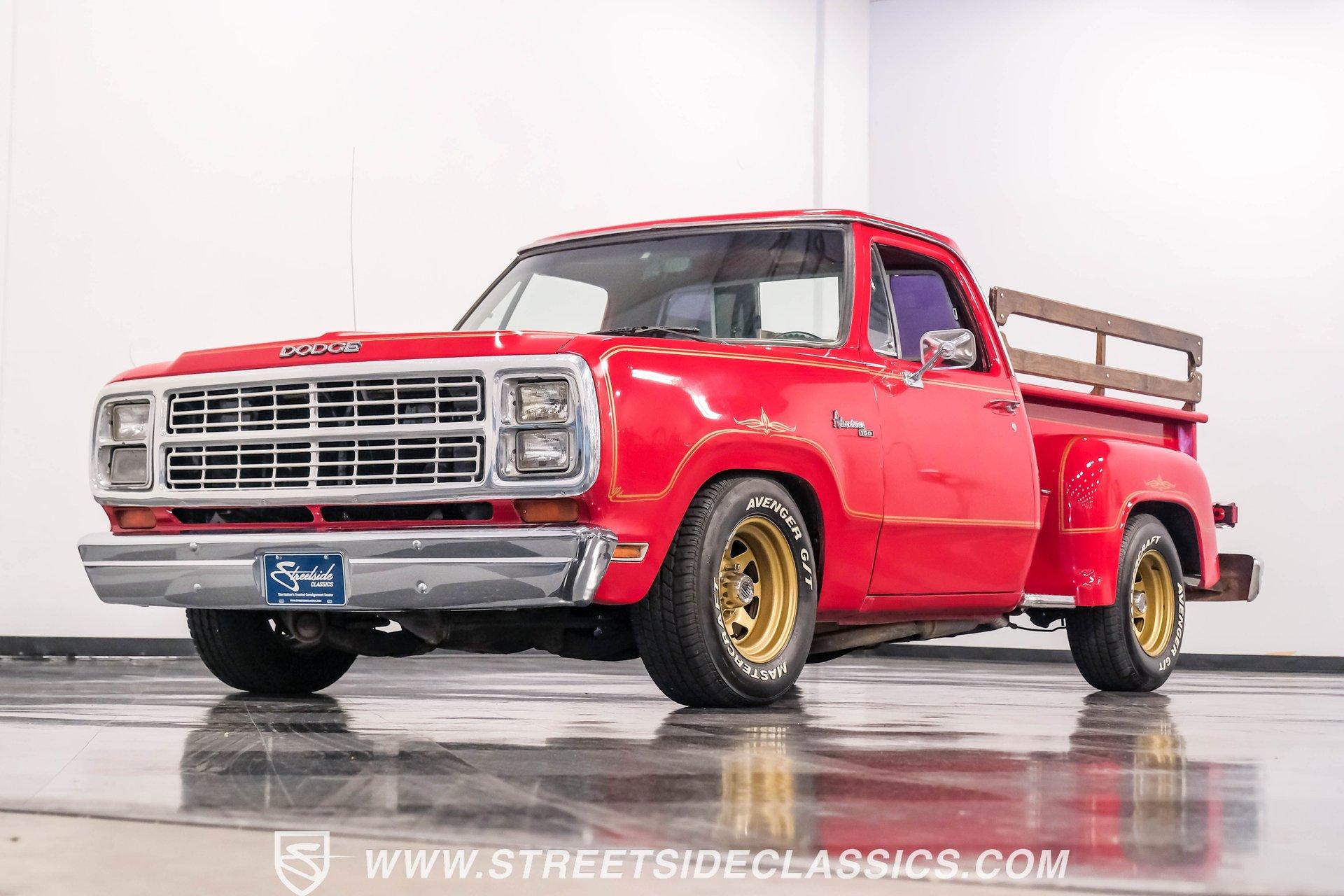 This 1979 Dodge D150 Warlock Tribute showcases a bold red paint job. Gold decals adorn the body, paying tribute to the iconic Warlock design. The truck rolls on 15" gold-painted rims wrapped in Avenger G/T 235/70R15 tires. A real wood bed adds authentic utility, while a sliding rear window and new front bumper complete the exterior upgrades. This D150's transformation from stock to custom creates a unique blend of classic truck styling and modern flair. Inside, the D150 features a black cloth bench seat accented by maroon seatbelts. An aftermarket steering wheel provides a firm grip for the driver. The dash sports yellow pinstriping, adding a custom touch to the interior. Black carpet and door panels maintain a clean, cohesive look throughout the cabin. For audio enthusiasts, a dual AM/FM radio with USB and AUX ports offers modern connectivity in a vintage setting. The engine bay houses a 360 V8 engine with an RV cam, a significant upgrade from the original 318. An Edelbrock 4-barrel carburetor feeds the engine while the A727 Torqueflite 3-speed automatic transmission handles gear changes. Power steering eases maneuverability, while power brakes with front discs provide stopping power. A Flowmaster dual exhaust system completes the powertrain upgrades and the suspension features coil springs with shocks up front and a solid axle with leaf springs and shocks in the rear. HIGHLIGHTS: 360 V8 Engine (originally 318) Edelbrock 4-Barrel Carburetor RV Cam A727 Torqueflite 3-Speed Automatic Transmission Power Steering Power Front Disc Brakes Flowmaster Dual Exhaust Red Paint w/ Gold Warlock Tribute Decals 15" Wheels in Avenger G/T 235/70R15 Tires Real Wood Bed Sliding Rear Window New Front Bumper Black Interior with Bench Seat Aftermarket Steering Wheel Dual AM/FM Radio with USB and AUX Ports This 1979 Dodge D150 Warlock Tribute combines classic truck styling with modern upgrades. With its powerful 360 V8, custom exterior, and comfortable interior, it's ready for the road or show. Call today!