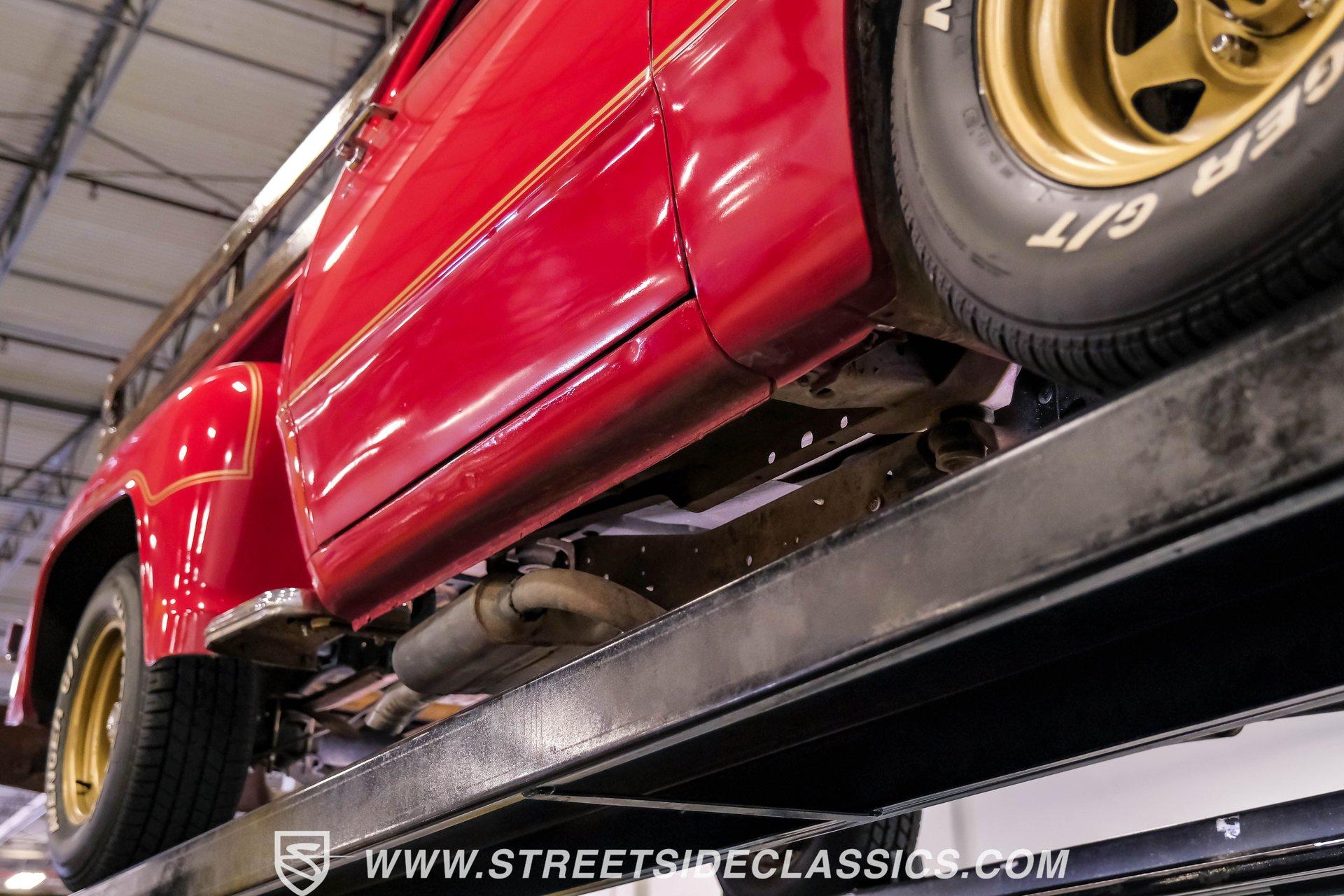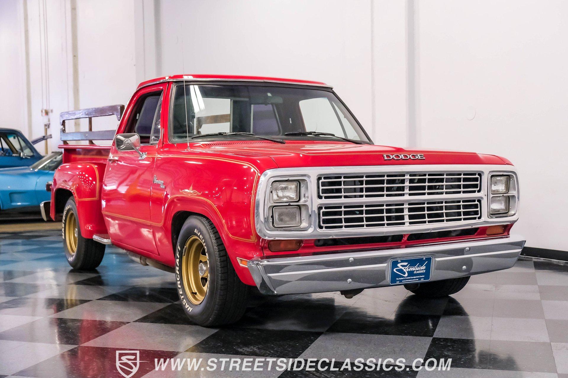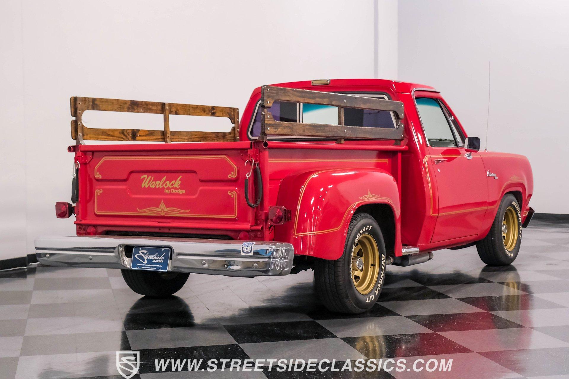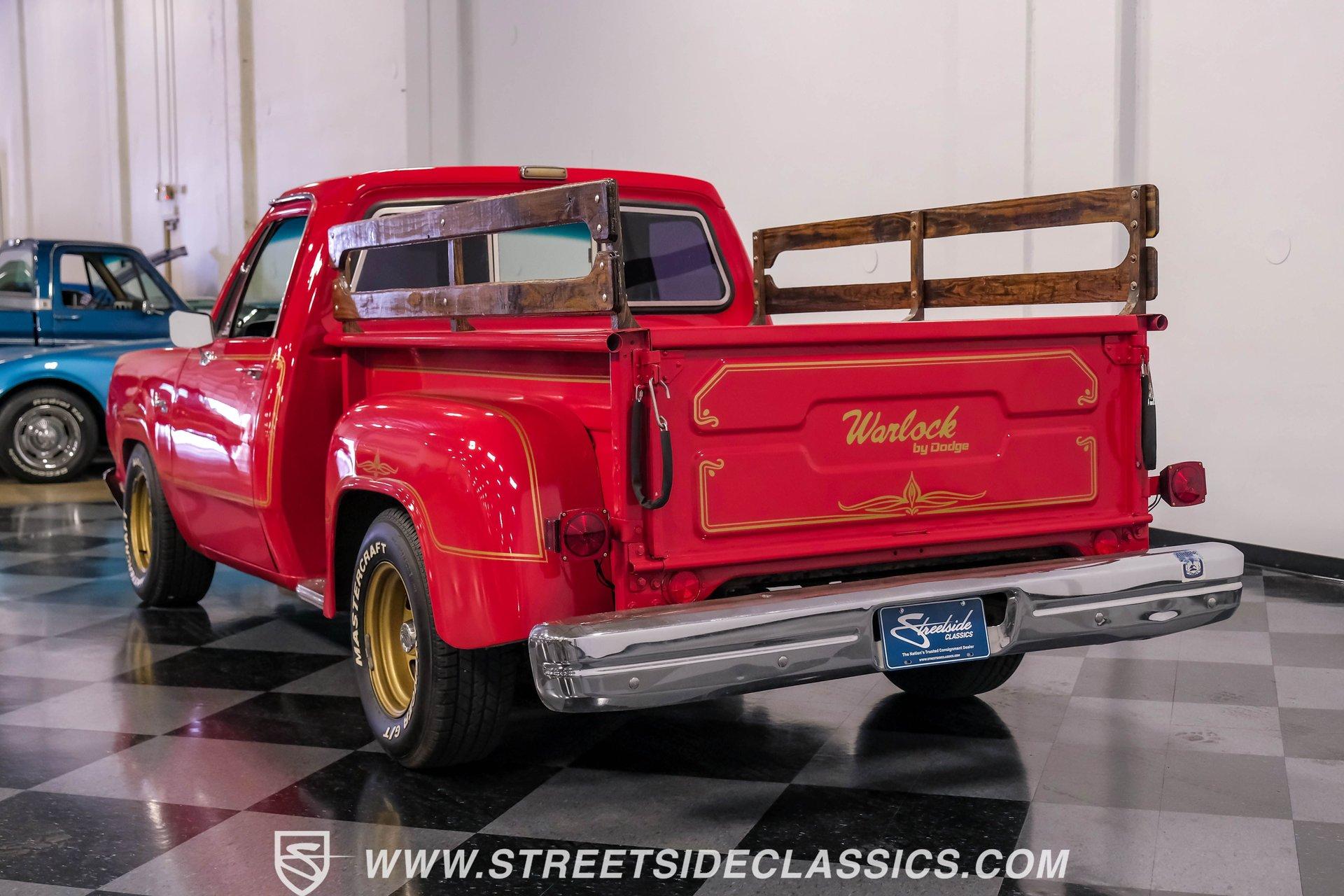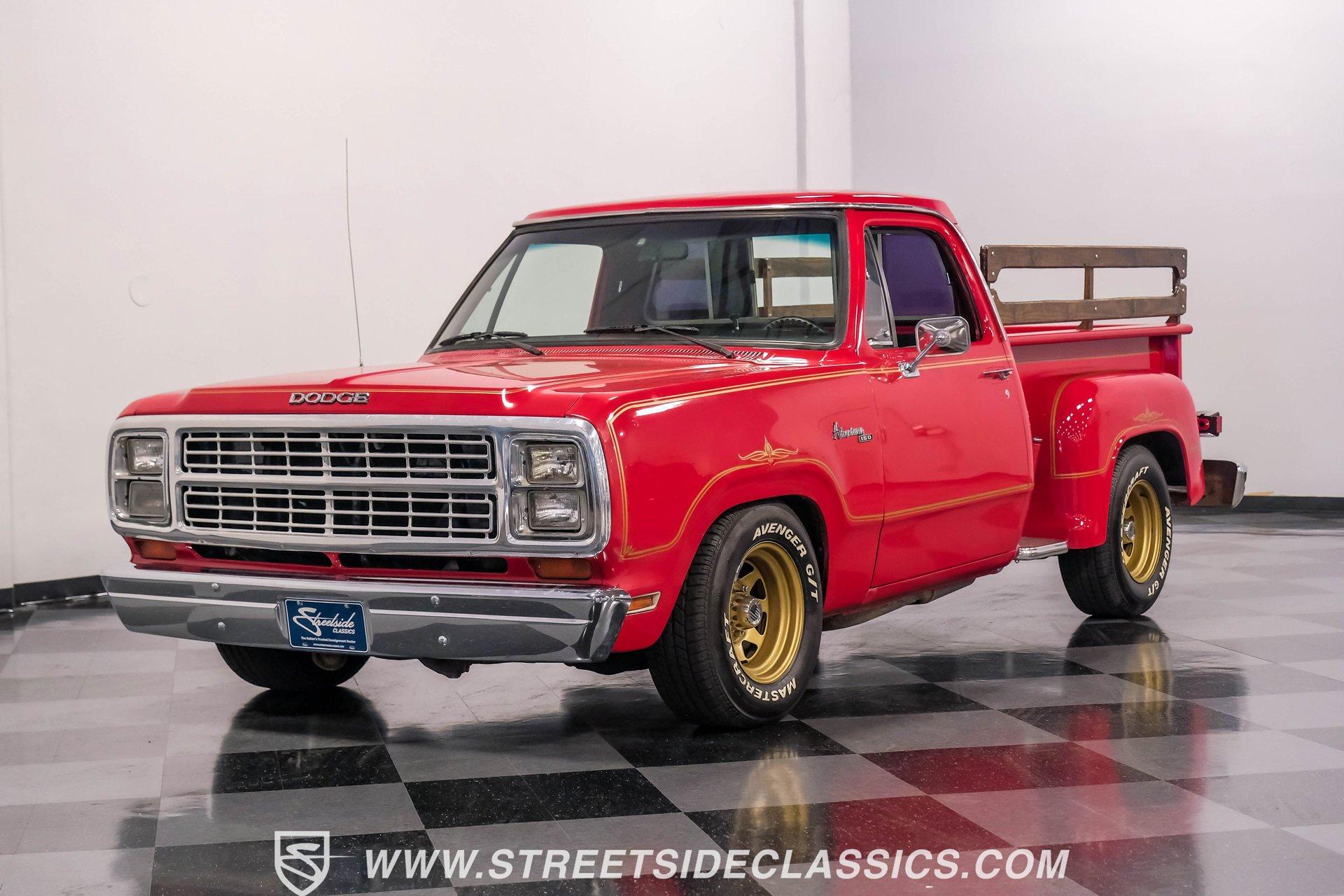 This 1979 Dodge D150 Warlock Tribute showcases a bold red paint job. Gold decals adorn the body, paying tribute to the iconic Warlock design. The truck rolls on 15" gold-painted rims wrapped in Avenger G/T 235/70R15 tires. A real wood bed adds authentic utility, while a sliding rear window and new front bumper complete the exterior upgrades. This D150's transformation from stock to custom creates a unique blend of classic truck styling and modern flair. Inside, the D150 features a black cloth bench seat accented by maroon seatbelts. An aftermarket steering wheel provides a firm grip for the driver. The dash sports yellow pinstriping, adding a custom touch to the interior. Black carpet and door panels maintain a clean, cohesive look throughout the cabin. For audio enthusiasts, a dual AM/FM radio with USB and AUX ports offers modern connectivity in a vintage setting. The engine bay houses a 360 V8 engine with an RV cam, a significant upgrade from the original 318. An Edelbrock 4-barrel carburetor feeds the engine while the A727 Torqueflite 3-speed automatic transmission handles gear changes. Power steering eases maneuverability, while power brakes with front discs provide stopping power. A Flowmaster dual exhaust system completes the powertrain upgrades and the suspension features coil springs with shocks up front and a solid axle with leaf springs and shocks in the rear. HIGHLIGHTS: 360 V8 Engine (originally 318) Edelbrock 4-Barrel Carburetor RV Cam A727 Torqueflite 3-Speed Automatic Transmission Power Steering Power Front Disc Brakes Flowmaster Dual Exhaust Red Paint w/ Gold Warlock Tribute Decals 15" Wheels in Avenger G/T 235/70R15 Tires Real Wood Bed Sliding Rear Window New Front Bumper Black Interior with Bench Seat Aftermarket Steering Wheel Dual AM/FM Radio with USB and AUX Ports This 1979 Dodge D150 Warlock Tribute combines classic truck styling with modern upgrades. With its powerful 360 V8, custom exterior, and comfortable interior, it's ready for the road or show. Call today!