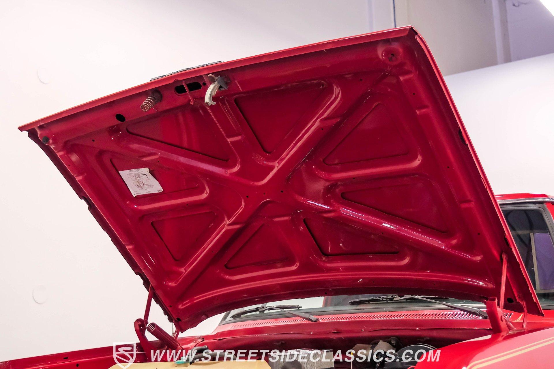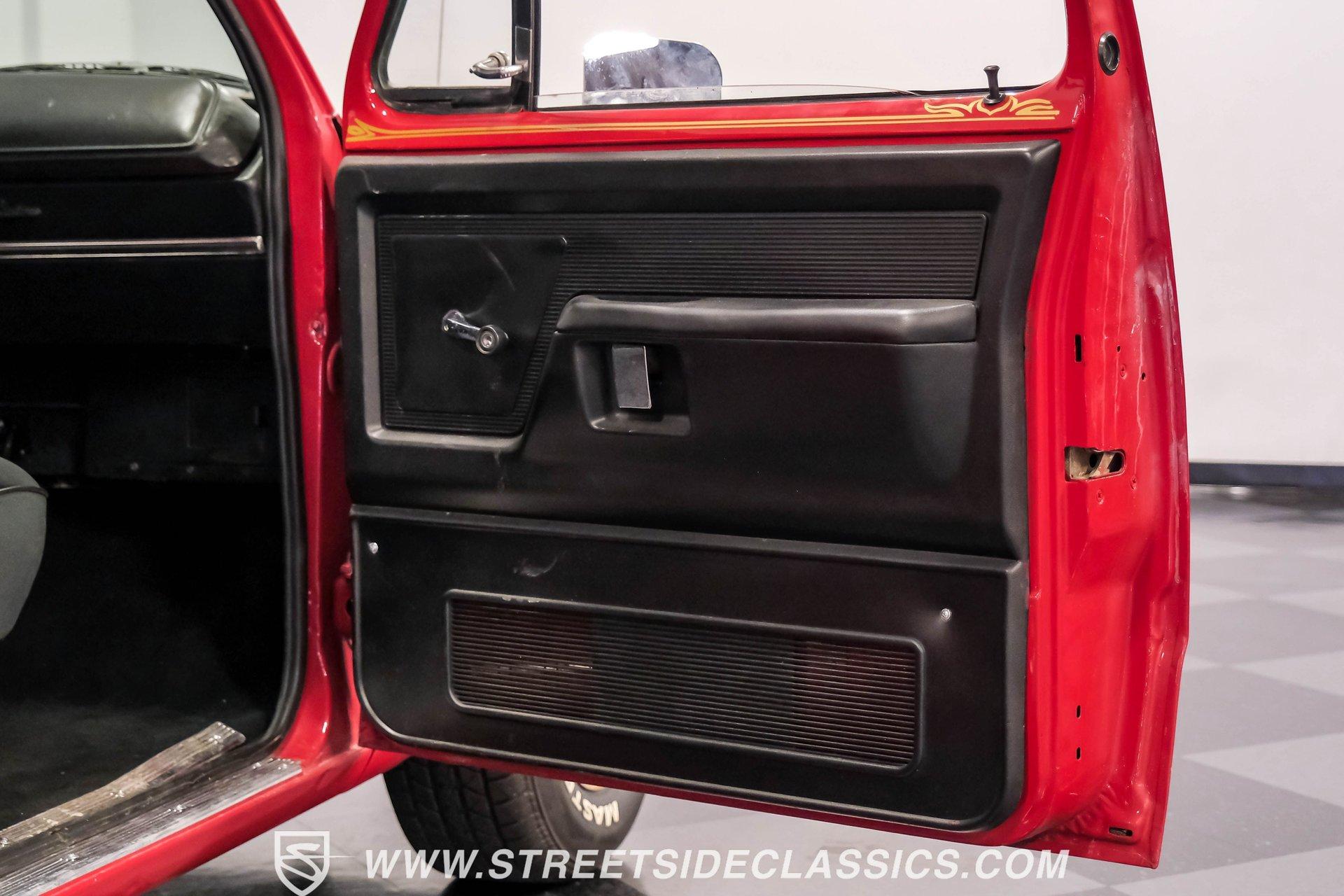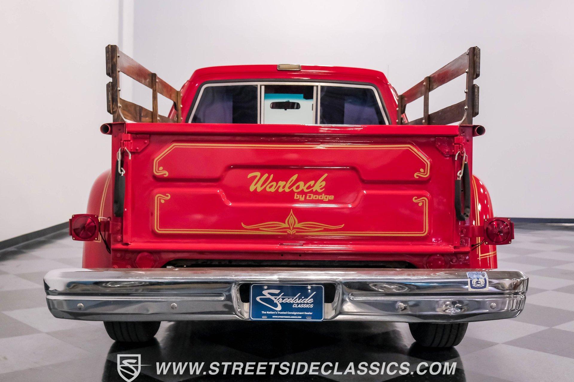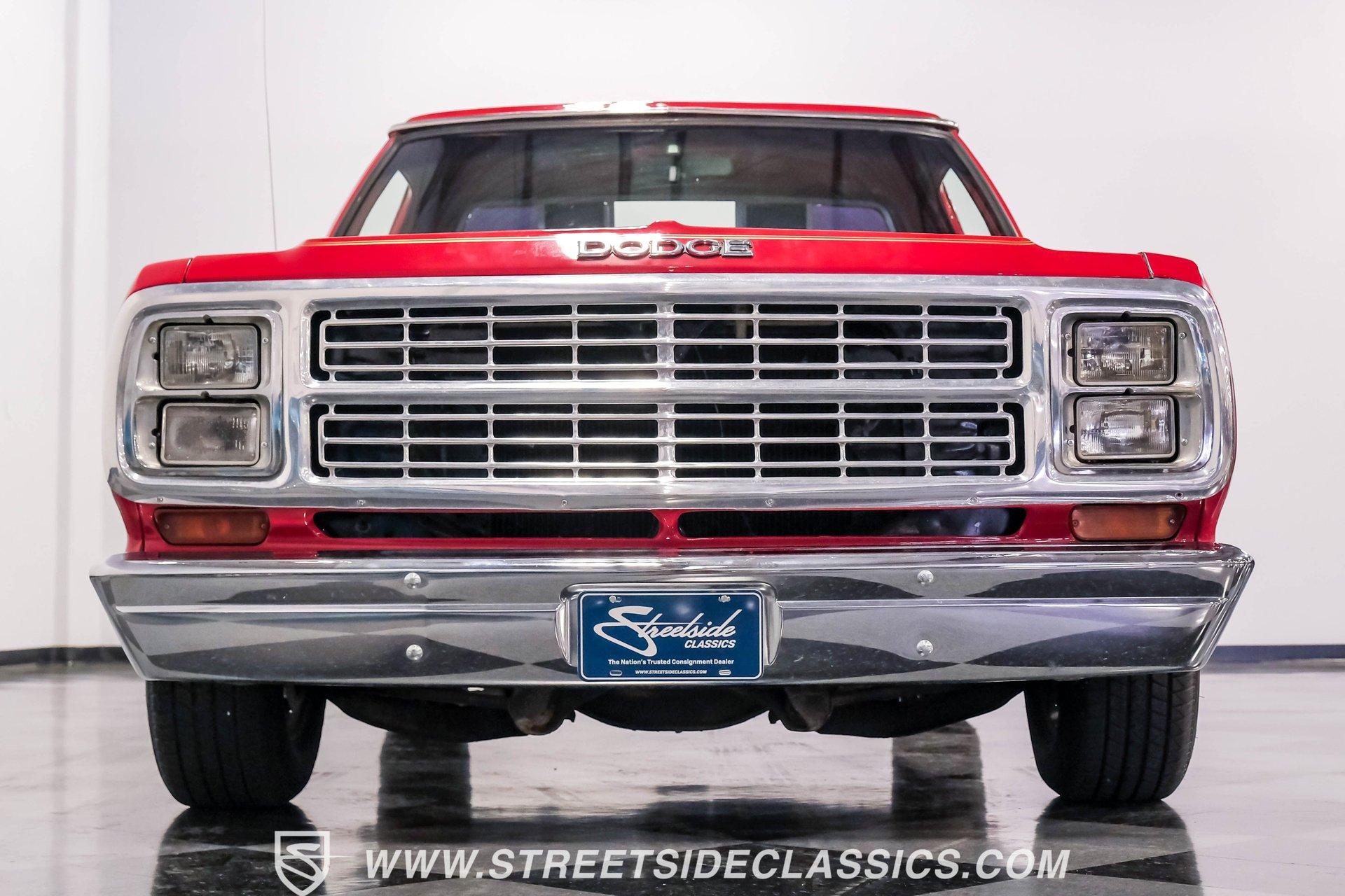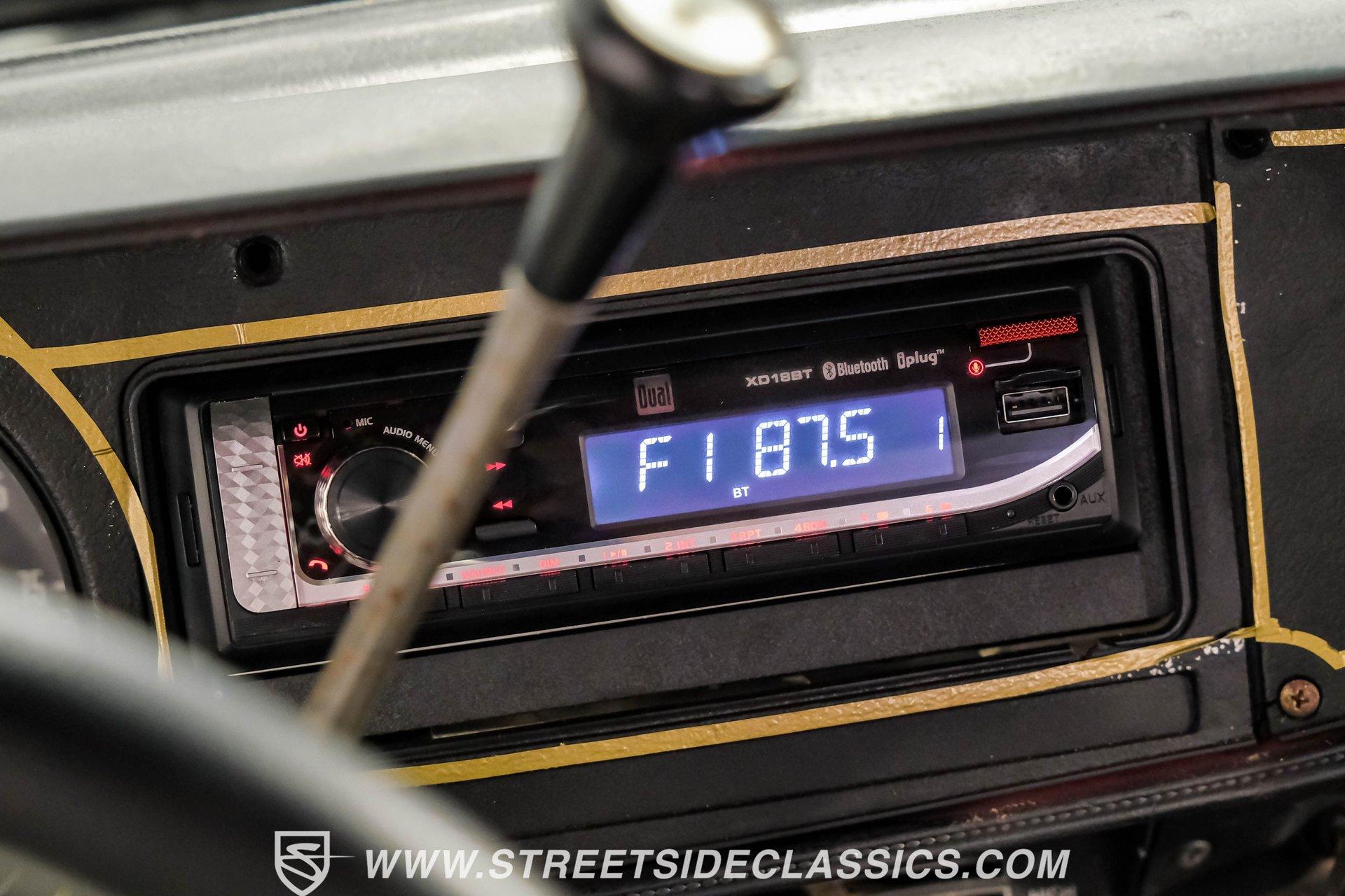 This 1979 Dodge D150 Warlock Tribute showcases a bold red paint job. Gold decals adorn the body, paying tribute to the iconic Warlock design. The truck rolls on 15" gold-painted rims wrapped in Avenger G/T 235/70R15 tires. A real wood bed adds authentic utility, while a sliding rear window and new front bumper complete the exterior upgrades. This D150's transformation from stock to custom creates a unique blend of classic truck styling and modern flair. Inside, the D150 features a black cloth bench seat accented by maroon seatbelts. An aftermarket steering wheel provides a firm grip for the driver. The dash sports yellow pinstriping, adding a custom touch to the interior. Black carpet and door panels maintain a clean, cohesive look throughout the cabin. For audio enthusiasts, a dual AM/FM radio with USB and AUX ports offers modern connectivity in a vintage setting. The engine bay houses a 360 V8 engine with an RV cam, a significant upgrade from the original 318. An Edelbrock 4-barrel carburetor feeds the engine while the A727 Torqueflite 3-speed automatic transmission handles gear changes. Power steering eases maneuverability, while power brakes with front discs provide stopping power. A Flowmaster dual exhaust system completes the powertrain upgrades and the suspension features coil springs with shocks up front and a solid axle with leaf springs and shocks in the rear. HIGHLIGHTS: 360 V8 Engine (originally 318) Edelbrock 4-Barrel Carburetor RV Cam A727 Torqueflite 3-Speed Automatic Transmission Power Steering Power Front Disc Brakes Flowmaster Dual Exhaust Red Paint w/ Gold Warlock Tribute Decals 15" Wheels in Avenger G/T 235/70R15 Tires Real Wood Bed Sliding Rear Window New Front Bumper Black Interior with Bench Seat Aftermarket Steering Wheel Dual AM/FM Radio with USB and AUX Ports This 1979 Dodge D150 Warlock Tribute combines classic truck styling with modern upgrades. With its powerful 360 V8, custom exterior, and comfortable interior, it's ready for the road or show. Call today!