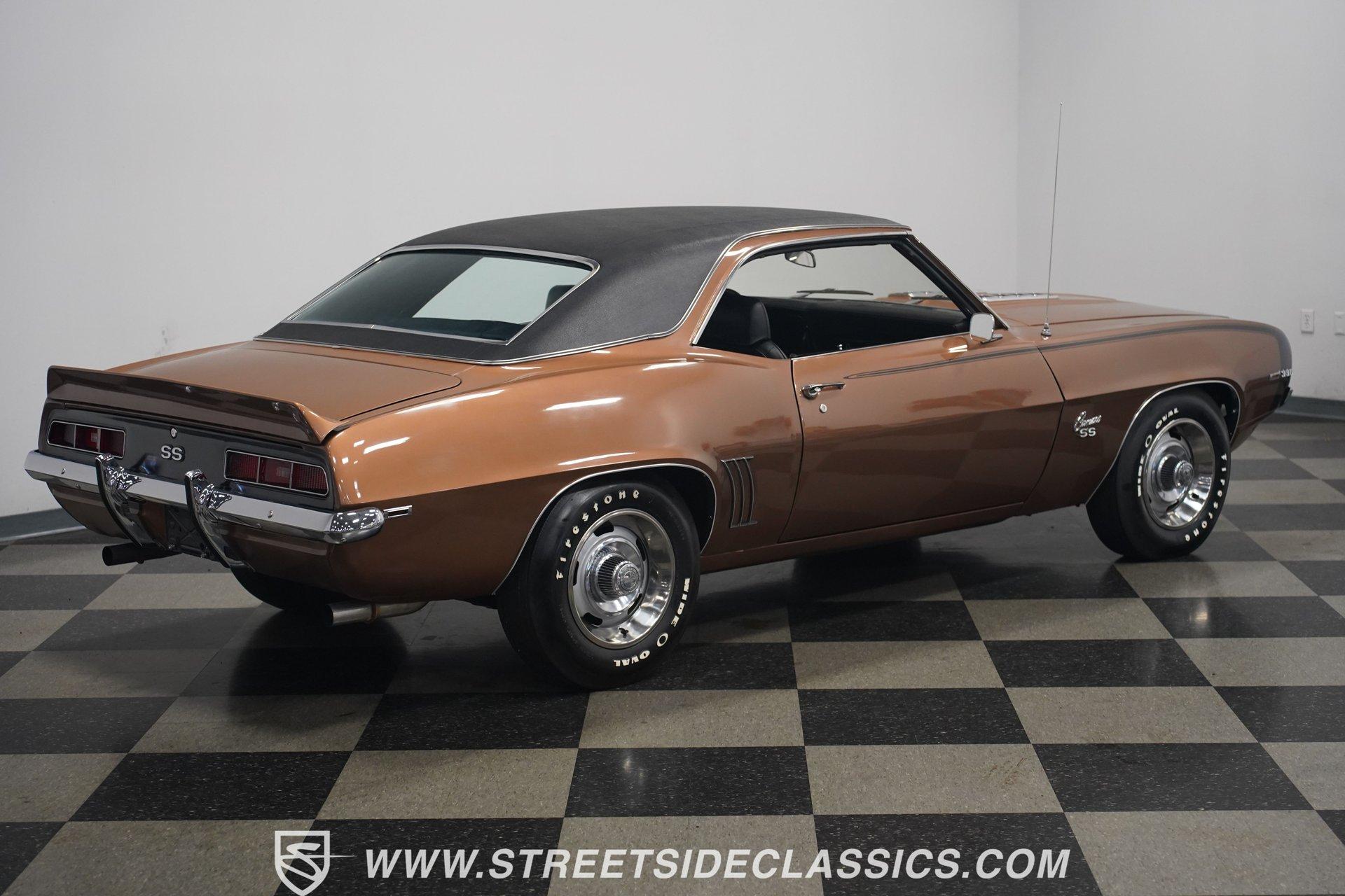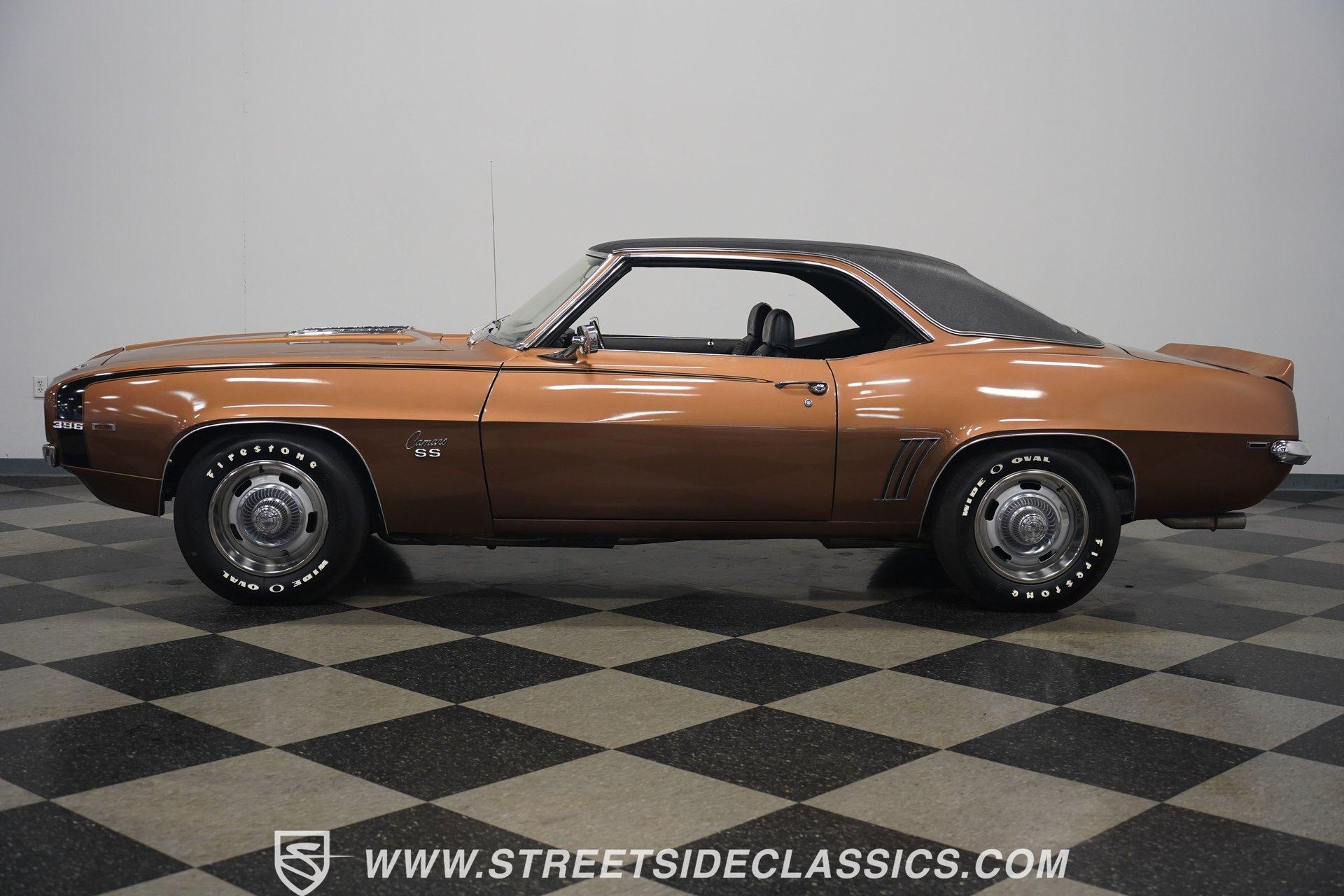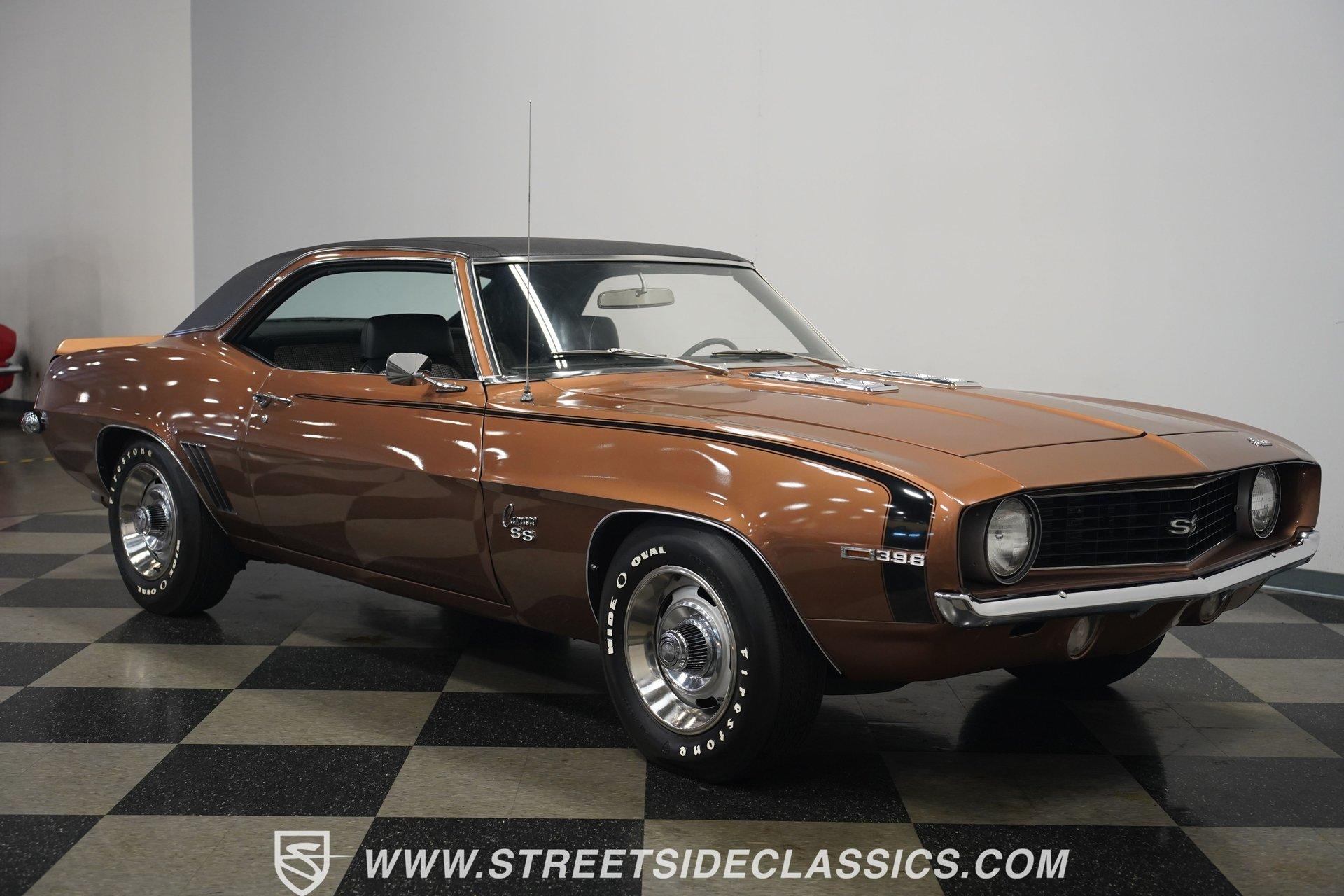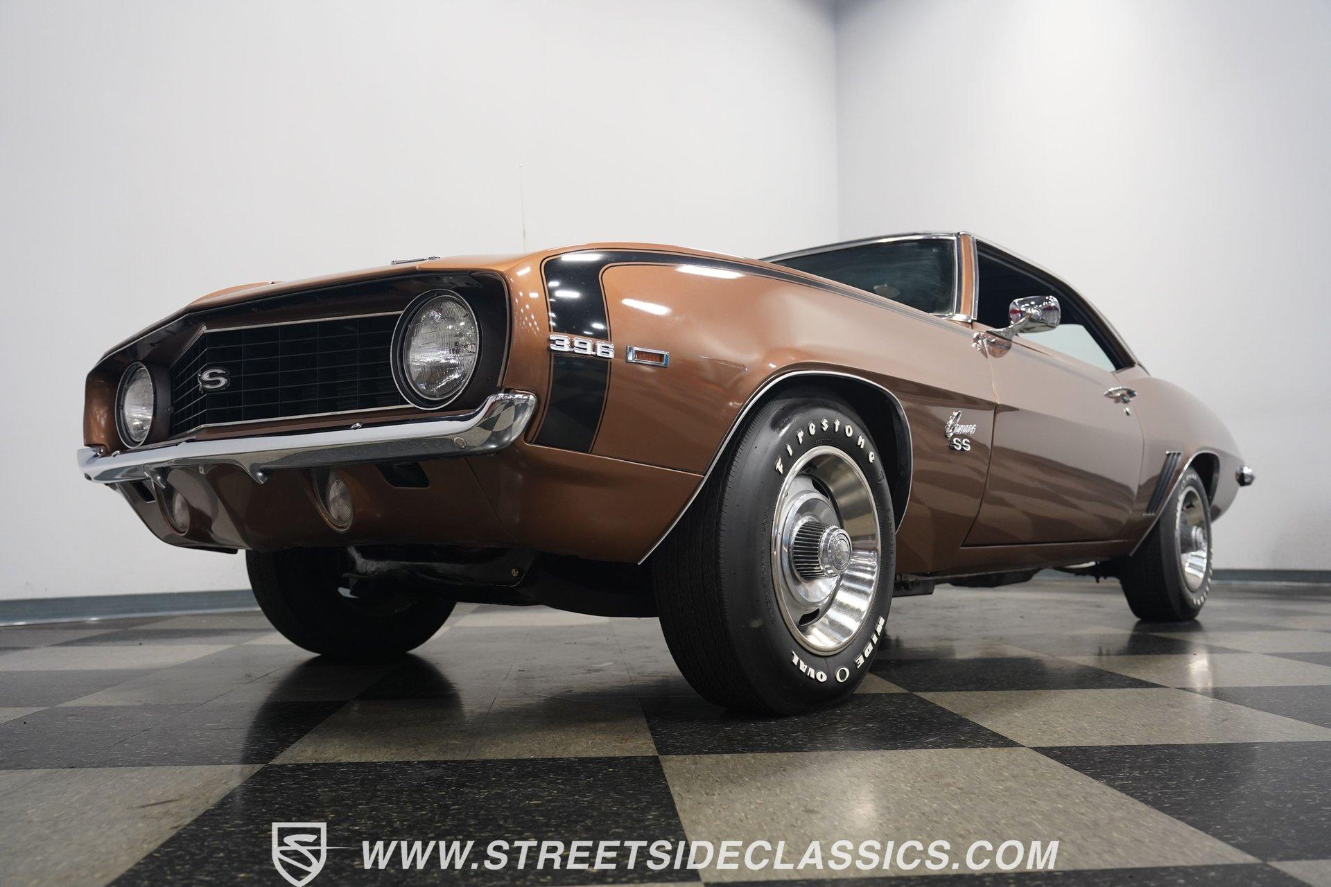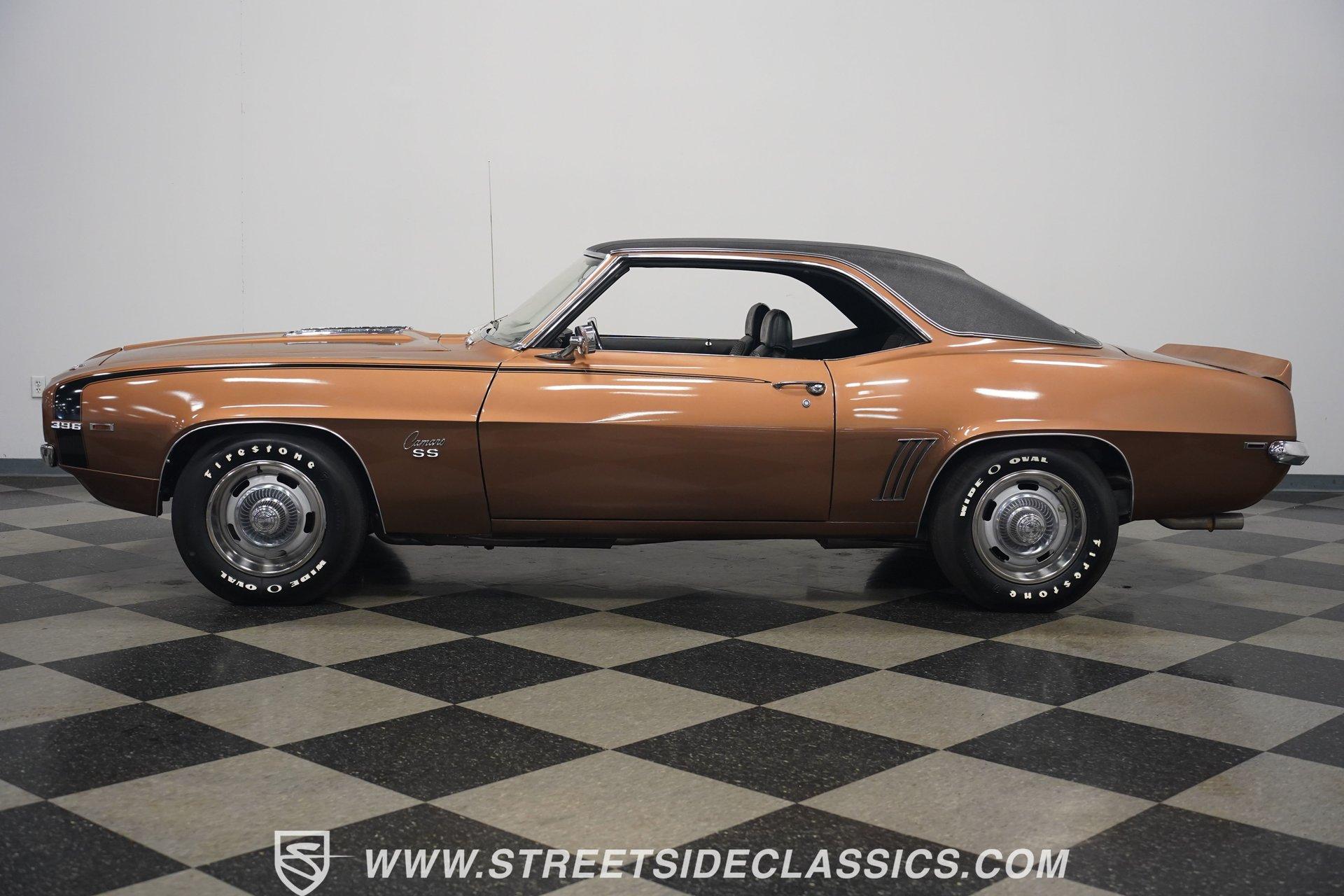 This 1969 Chevrolet Camaro SS 396 wears a bronze coat that reflects sunlight with intensity. Black stripes run the length of the body, emphasizing its muscular lines. The black vinyl top adds a touch of class, while SS badging and 396 emblems on the fenders announce its performance pedigree. Factory 15-inch hubcaps and F70-15 Coker wide oval bias ply tires complete the period-correct look. Chrome trim outlines the body, highlighting the iconic shape of this classic Chevy muscle car. Inside, black and white houndstooth upholstery creates a bold 1960s atmosphere. The bucket seats look fresh, showcasing the quality restoration. A flawless dash houses the factory gauges, complemented by the original steering wheel. The center console features the 4-speed manual shifter, inviting you to row through the gears. An AM radio sits ready to play your favorite tunes. The condition of the pedals and carpeting further illustrates the interior's excellent preservation. A freshly built big block 396 V8 lives in the engine bay. It's connected to a four-speed Muncie transmission, creating a powertrain that delivers serious muscle. Chrome valve covers and air cleaner add visual appeal. An Edelbrock performer RPM intake topped with a carburetor maximizes performance. Long tube headers feed into a dual exhaust system with FlowMaster mufflers, producing an aggressive sound. Power steering provides easy maneuverability, while power front disc brakes offer strong stopping ability. The 12-bolt rear end with 3.31 gears balances acceleration and cruising potential. HIGHLIGHTS: 396 V8 Engine 4-Speed Muncie Manual Transmission Edelbrock Performer RPM Intake Chrome Valve Covers and Air Cleaner Long Tube Headers Dual Exhaust with FlowMaster Mufflers Power Steering Power Front Disc Brakes 12-Bolt Rear End with 3.31 Gears Bronze Paint Black Vinyl Top Black Stripes SS Badging 396 Fender Emblems 15" Wheels with Factory Hubcaps F70-15 Coker Wide Oval Bias Ply Tires Black and White Houndstooth Upholstery Bucket Seats Center Console 4-Speed Manual Shifter AM Radio This 1969 Chevrolet Camaro SS 396 combines classic muscle car style with big block power. Its bronze paint, houndstooth interior, and potent 396/4-speed drivetrain make it a standout at shows and on the street. Call today!