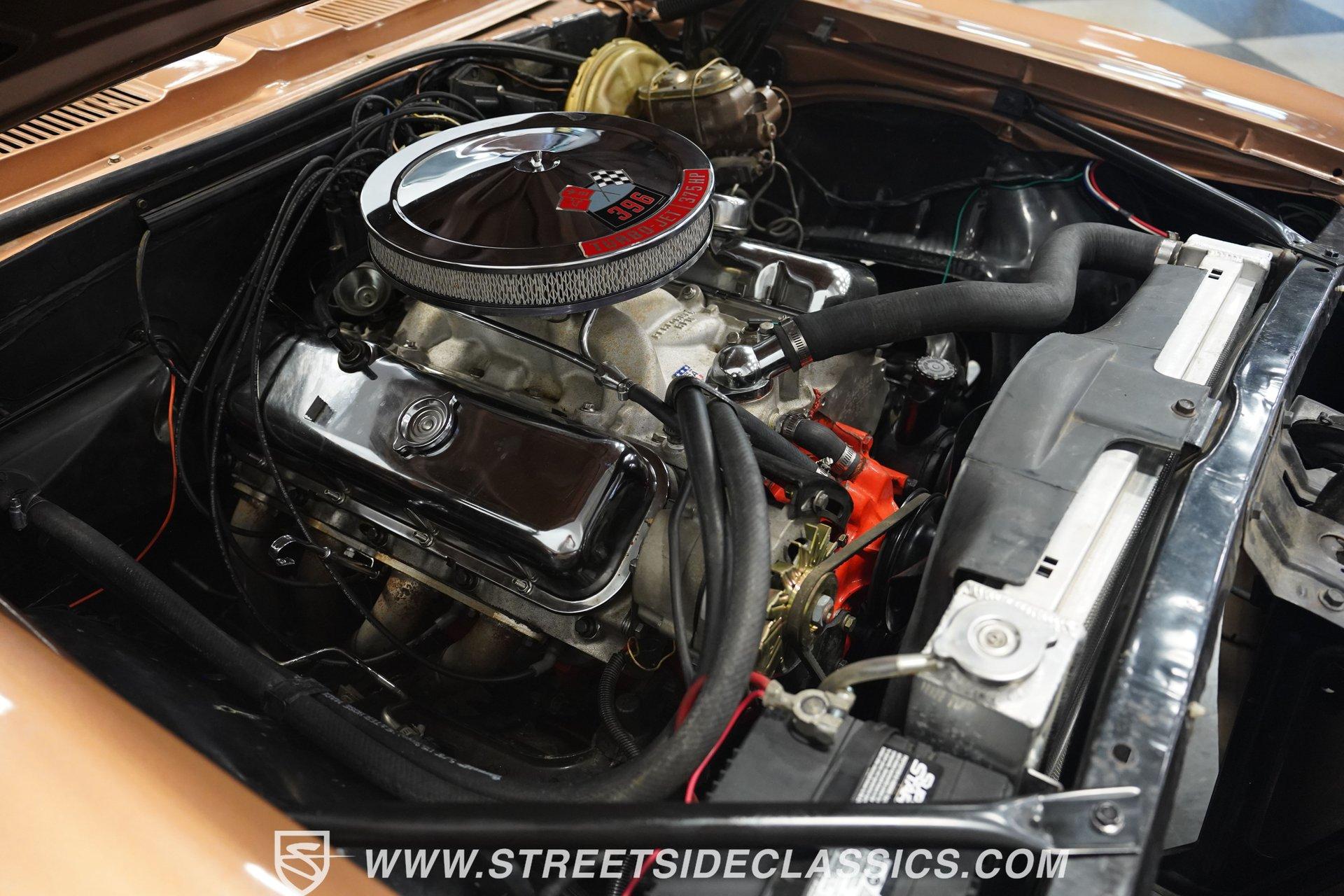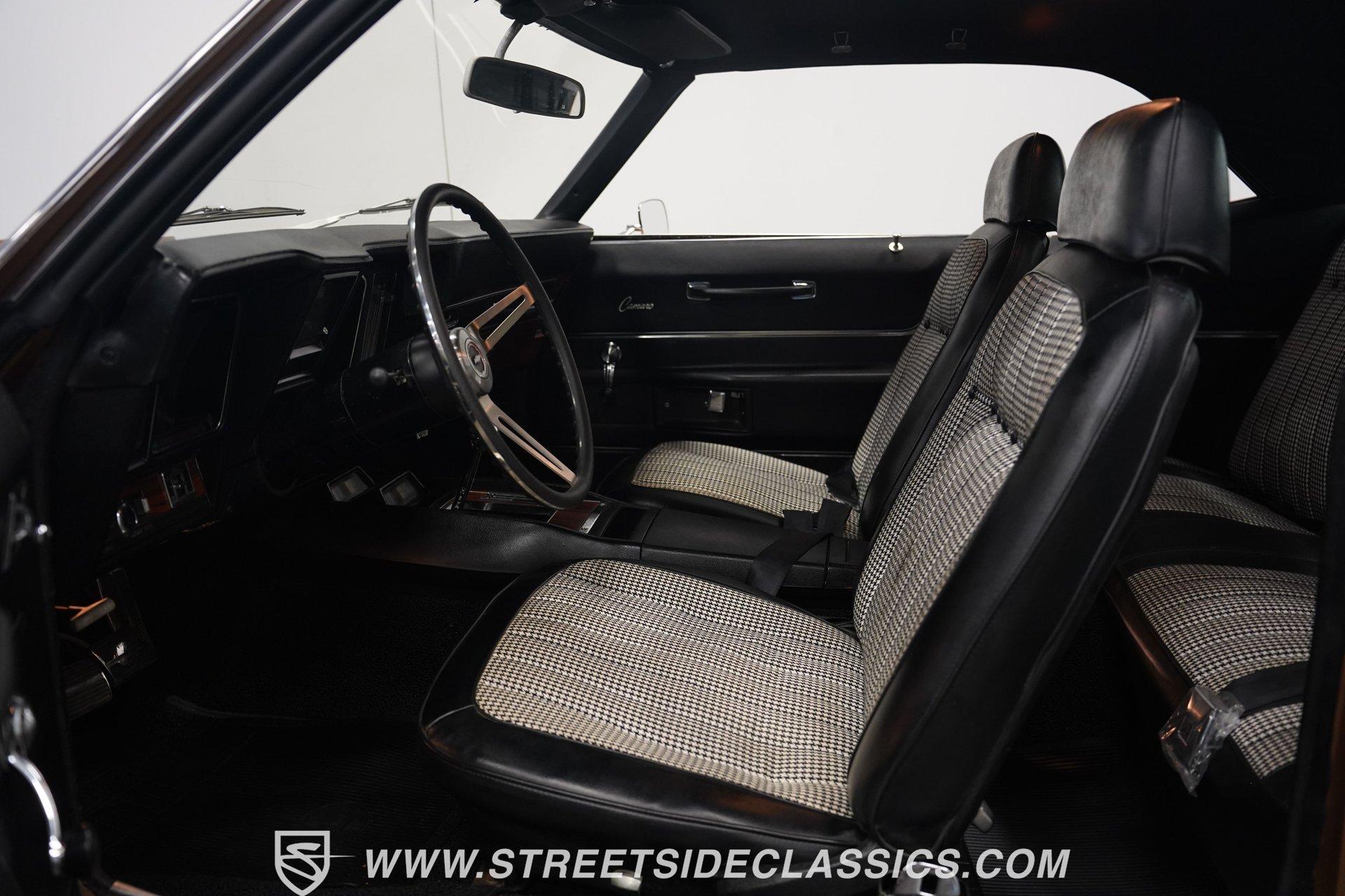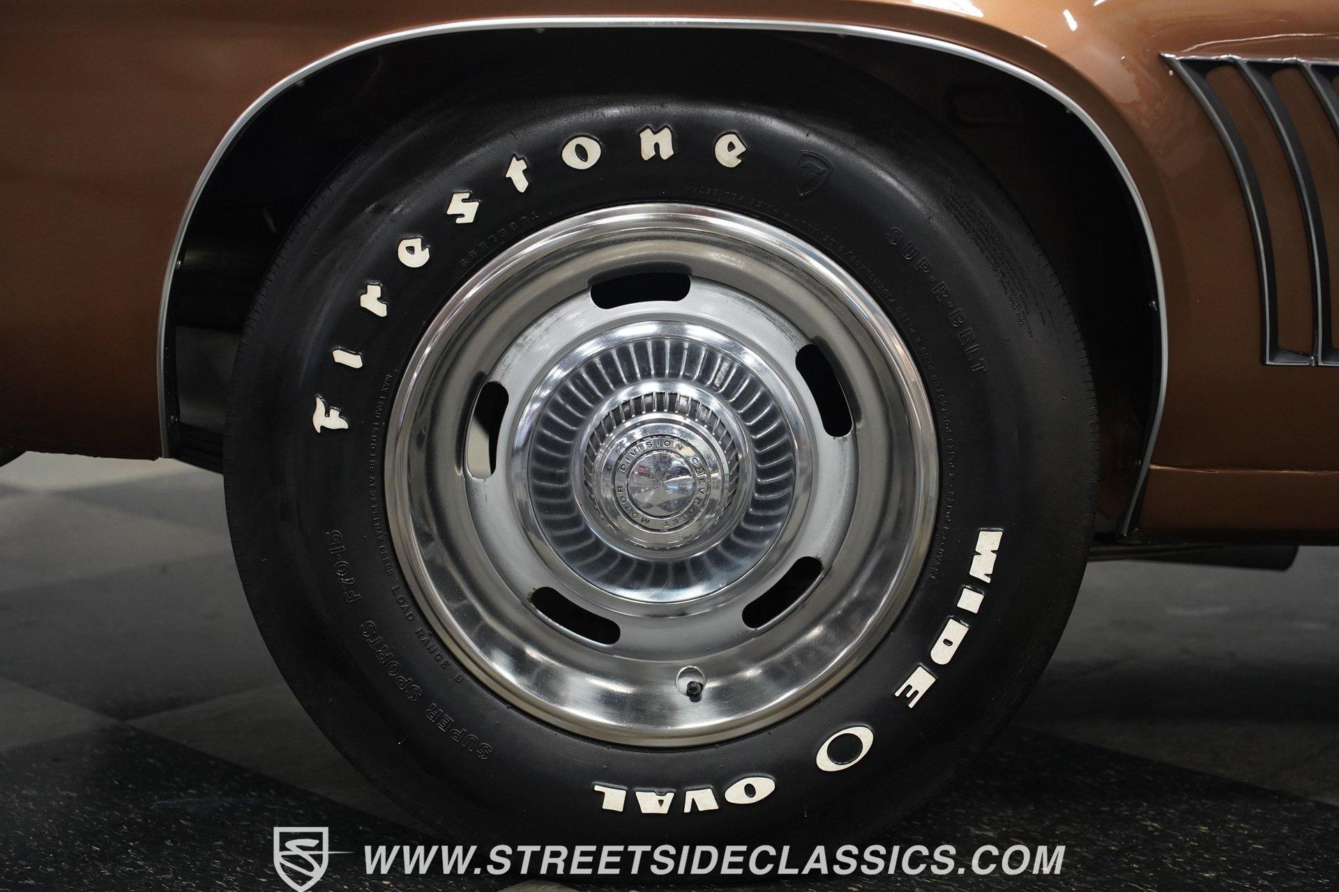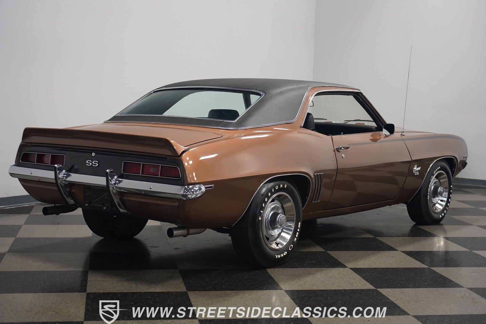 This 1969 Chevrolet Camaro SS 396 wears a bronze coat that reflects sunlight with intensity. Black stripes run the length of the body, emphasizing its muscular lines. The black vinyl top adds a touch of class, while SS badging and 396 emblems on the fenders announce its performance pedigree. Factory 15-inch hubcaps and F70-15 Coker wide oval bias ply tires complete the period-correct look. Chrome trim outlines the body, highlighting the iconic shape of this classic Chevy muscle car. Inside, black and white houndstooth upholstery creates a bold 1960s atmosphere. The bucket seats look fresh, showcasing the quality restoration. A flawless dash houses the factory gauges, complemented by the original steering wheel. The center console features the 4-speed manual shifter, inviting you to row through the gears. An AM radio sits ready to play your favorite tunes. The condition of the pedals and carpeting further illustrates the interior's excellent preservation. A freshly built big block 396 V8 lives in the engine bay. It's connected to a four-speed Muncie transmission, creating a powertrain that delivers serious muscle. Chrome valve covers and air cleaner add visual appeal. An Edelbrock performer RPM intake topped with a carburetor maximizes performance. Long tube headers feed into a dual exhaust system with FlowMaster mufflers, producing an aggressive sound. Power steering provides easy maneuverability, while power front disc brakes offer strong stopping ability. The 12-bolt rear end with 3.31 gears balances acceleration and cruising potential. HIGHLIGHTS: 396 V8 Engine 4-Speed Muncie Manual Transmission Edelbrock Performer RPM Intake Chrome Valve Covers and Air Cleaner Long Tube Headers Dual Exhaust with FlowMaster Mufflers Power Steering Power Front Disc Brakes 12-Bolt Rear End with 3.31 Gears Bronze Paint Black Vinyl Top Black Stripes SS Badging 396 Fender Emblems 15" Wheels with Factory Hubcaps F70-15 Coker Wide Oval Bias Ply Tires Black and White Houndstooth Upholstery Bucket Seats Center Console 4-Speed Manual Shifter AM Radio This 1969 Chevrolet Camaro SS 396 combines classic muscle car style with big block power. Its bronze paint, houndstooth interior, and potent 396/4-speed drivetrain make it a standout at shows and on the street. Call today!