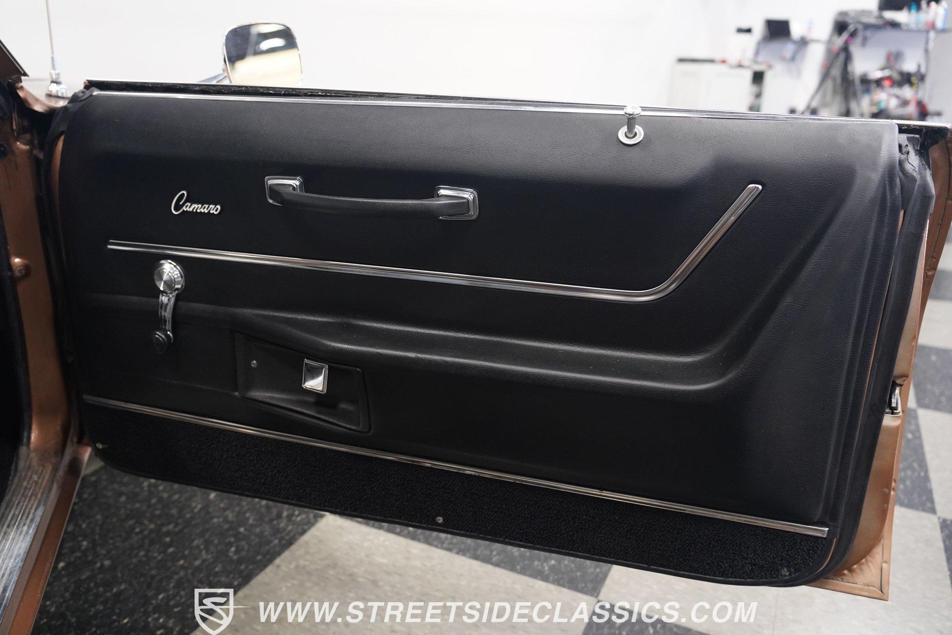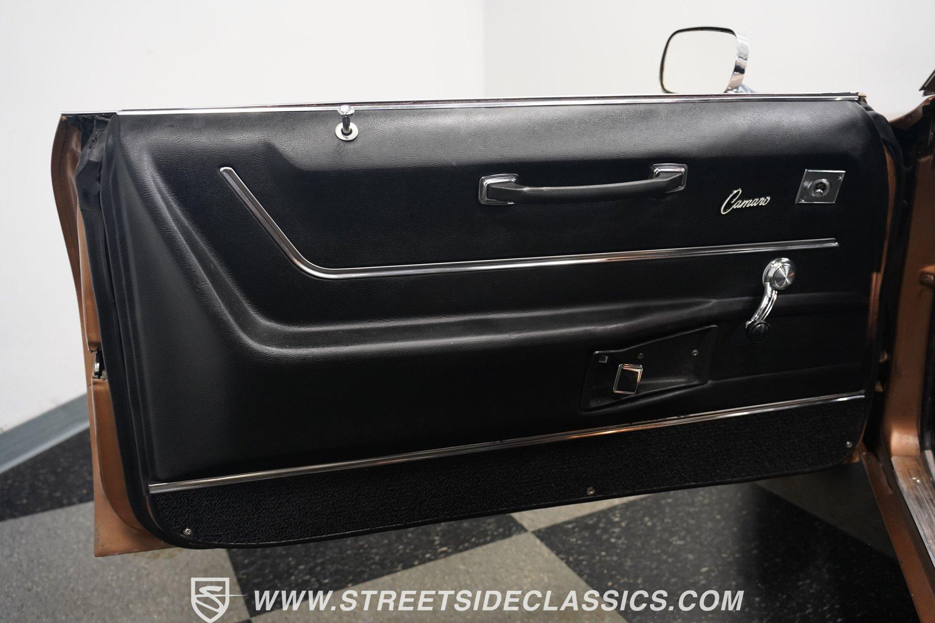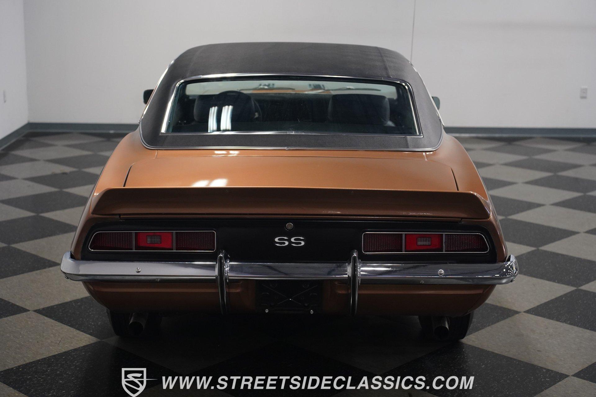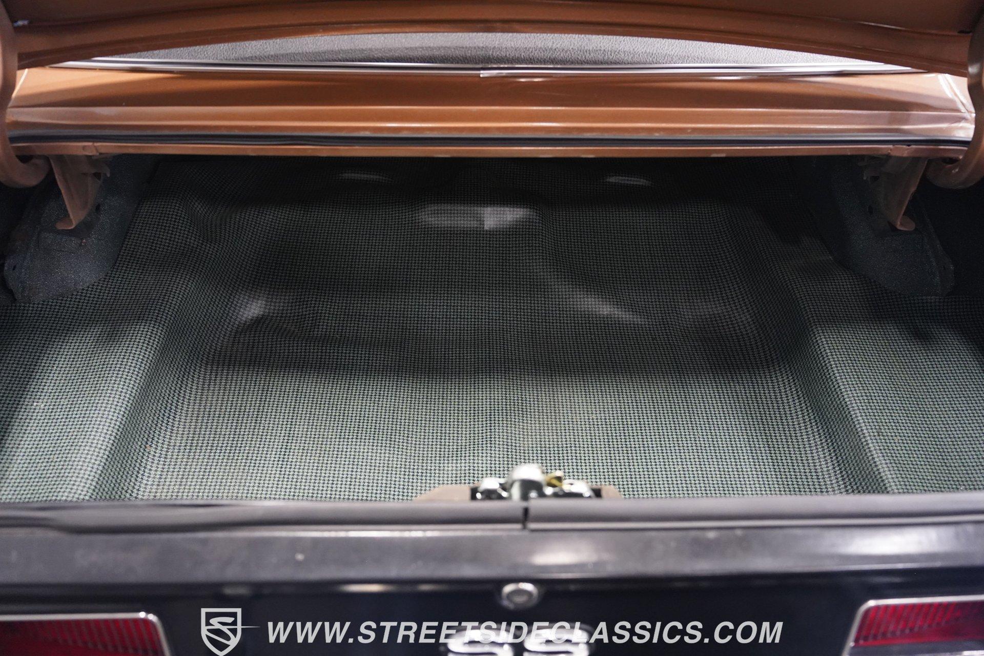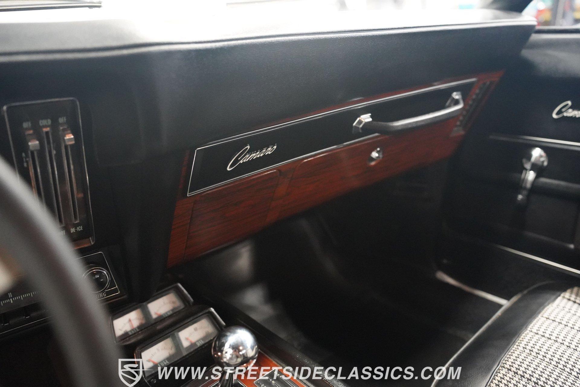 This 1969 Chevrolet Camaro SS 396 wears a bronze coat that reflects sunlight with intensity. Black stripes run the length of the body, emphasizing its muscular lines. The black vinyl top adds a touch of class, while SS badging and 396 emblems on the fenders announce its performance pedigree. Factory 15-inch hubcaps and F70-15 Coker wide oval bias ply tires complete the period-correct look. Chrome trim outlines the body, highlighting the iconic shape of this classic Chevy muscle car. Inside, black and white houndstooth upholstery creates a bold 1960s atmosphere. The bucket seats look fresh, showcasing the quality restoration. A flawless dash houses the factory gauges, complemented by the original steering wheel. The center console features the 4-speed manual shifter, inviting you to row through the gears. An AM radio sits ready to play your favorite tunes. The condition of the pedals and carpeting further illustrates the interior's excellent preservation. A freshly built big block 396 V8 lives in the engine bay. It's connected to a four-speed Muncie transmission, creating a powertrain that delivers serious muscle. Chrome valve covers and air cleaner add visual appeal. An Edelbrock performer RPM intake topped with a carburetor maximizes performance. Long tube headers feed into a dual exhaust system with FlowMaster mufflers, producing an aggressive sound. Power steering provides easy maneuverability, while power front disc brakes offer strong stopping ability. The 12-bolt rear end with 3.31 gears balances acceleration and cruising potential. HIGHLIGHTS: 396 V8 Engine 4-Speed Muncie Manual Transmission Edelbrock Performer RPM Intake Chrome Valve Covers and Air Cleaner Long Tube Headers Dual Exhaust with FlowMaster Mufflers Power Steering Power Front Disc Brakes 12-Bolt Rear End with 3.31 Gears Bronze Paint Black Vinyl Top Black Stripes SS Badging 396 Fender Emblems 15" Wheels with Factory Hubcaps F70-15 Coker Wide Oval Bias Ply Tires Black and White Houndstooth Upholstery Bucket Seats Center Console 4-Speed Manual Shifter AM Radio This 1969 Chevrolet Camaro SS 396 combines classic muscle car style with big block power. Its bronze paint, houndstooth interior, and potent 396/4-speed drivetrain make it a standout at shows and on the street. Call today!