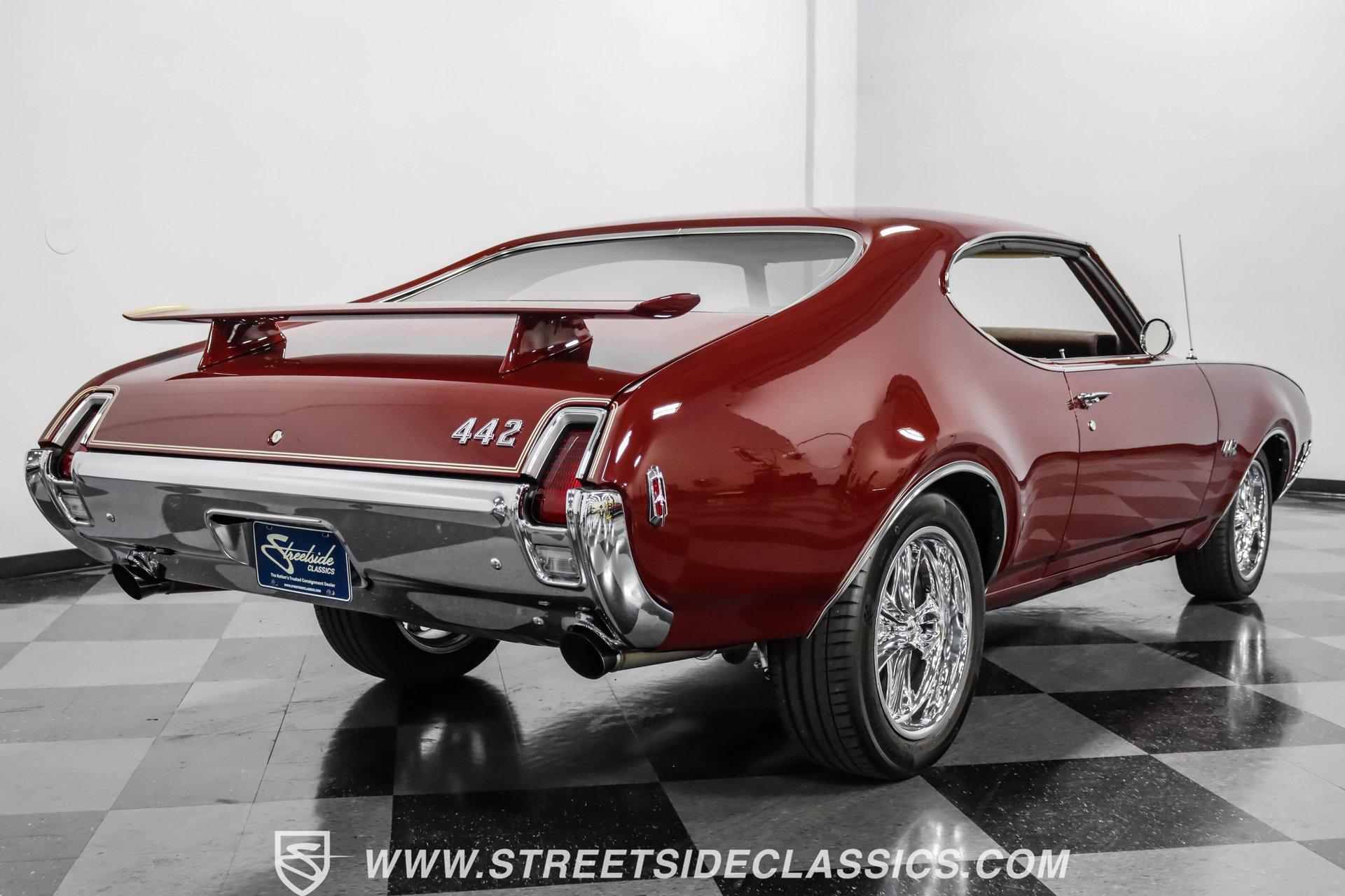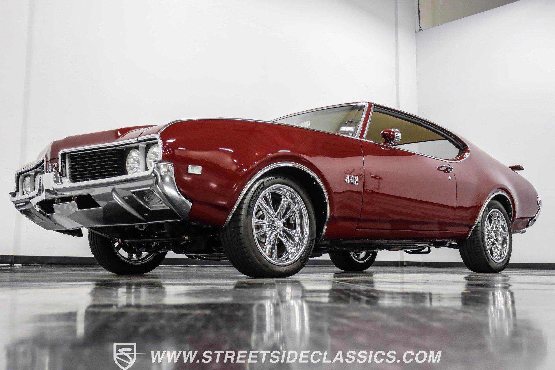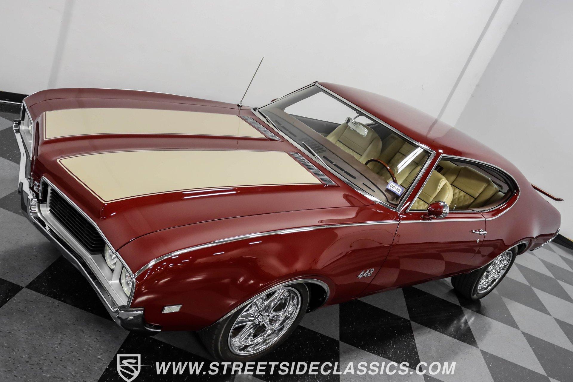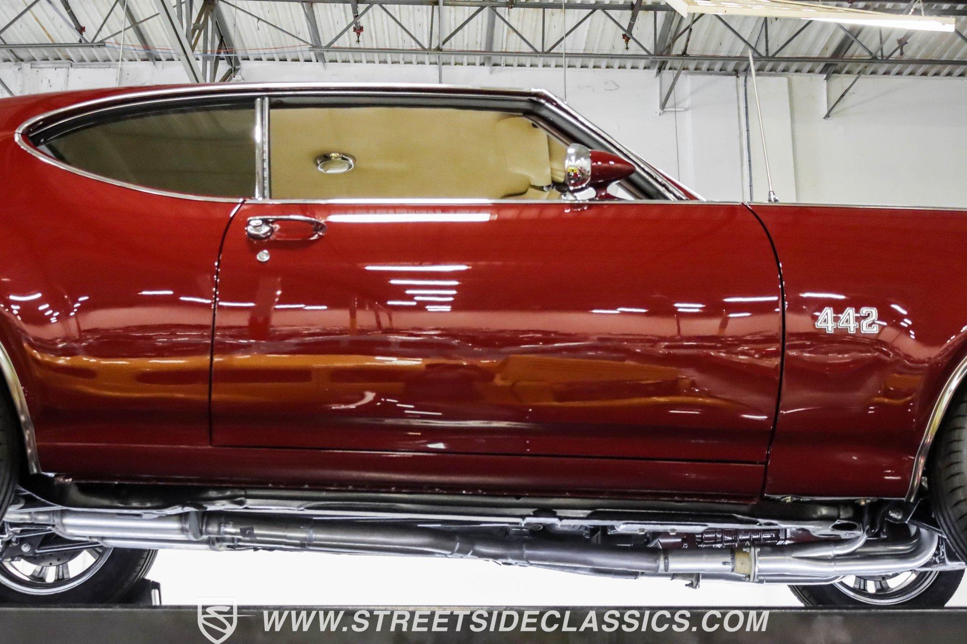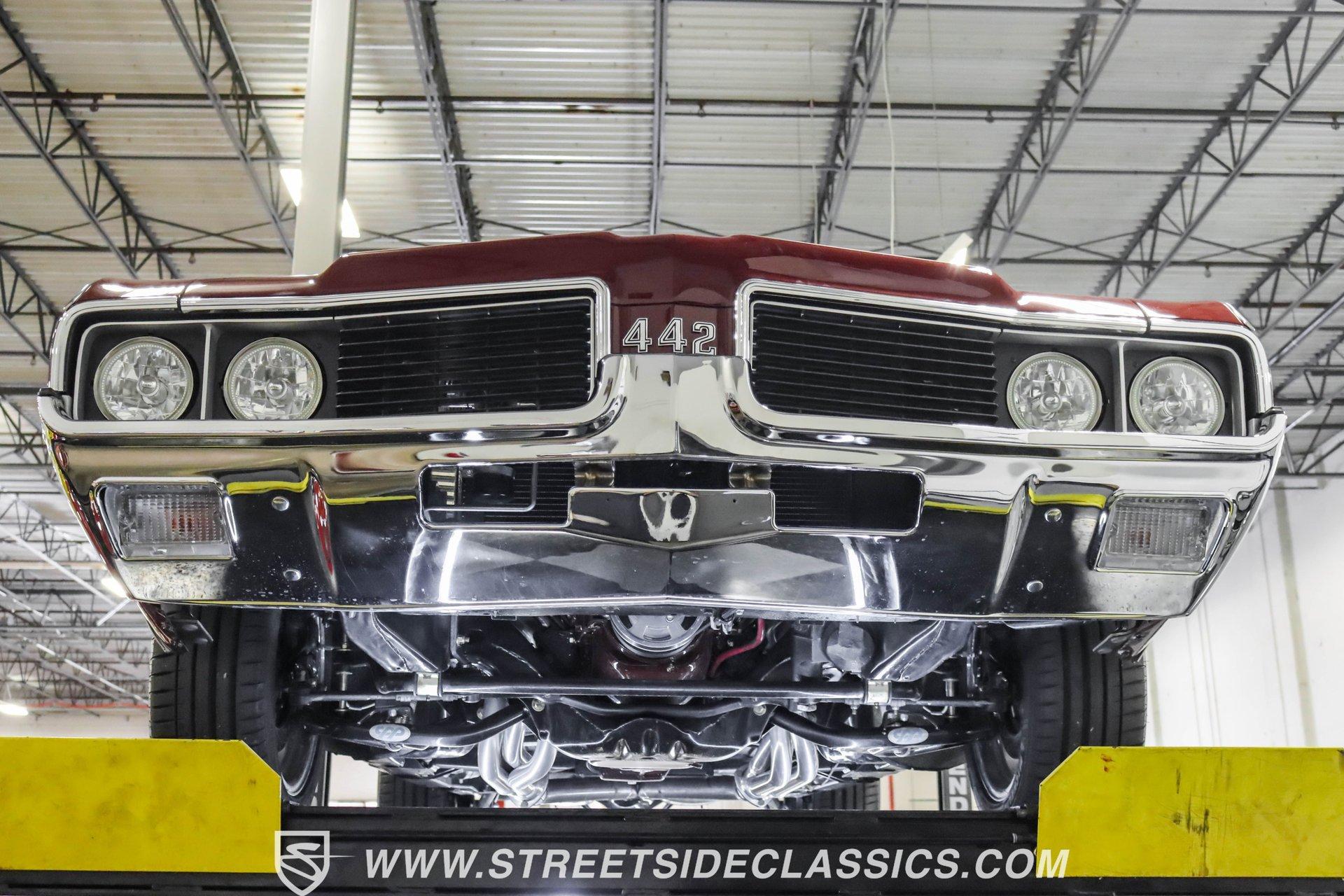This exceptional 1969 Oldsmobile 442 has received a full frame-off restoration performed by the talented team at House of Hot Rods in Texas and has been driven a mere 826 miles since completion. Finished handsomely in deep Burgundy Metallic with Gold stripes over an arrow-straight body, this classic Oldsmobile is stunning. Rolling on chrome Foose wheels wrapped with Michelin tires staggered 215/50ZR17 front and 245/50ZR18 rear for the perfect stance, this car commands attention from its glistening chrome bumpers to its trunk-mounted rear wing. The interior is equally impressive, featuring comfortable, power adjustable, custom leather upholstered bucket seats front and rear with a custom-crafted full-length center console with beverage holders. The door panels are custom designed with wood inserts and the contrasting light brown dash pad is custom stitched. The dash is fitted with full instrumentation by Dakota Digital, Vintage air conditioning controls and a retro radio with Bluetooth. Additionally, there are power windows, a tilt steering column and a three-spoke wood-rimmed steering wheel. The trunk is completely trimmed to a high standard to match the beautiful interior. HIGHLIGHTS: Spectacular full frame-off restoration by House of Hot Rods in Texas 826 miles since build 455 Oldsmobile engine Tremec 5-speed Edelbrock aluminum heads and intake Holley Sniper EFI Be Cool aluminum radiator Foose wheels Vintage air conditioning Custom leather interior including detailed trunk Under the hood is a potent 455 cubic inch Oldsmobile engine paired with a Tremec 5-speed manual transmission. The engine features Edelbrock aluminum heads, Edelbrock aluminum high-rise intake manifold, Holley Sniper electronic fuel injection, CVF billet brackets, serpentine belt system, Be Cool aluminum radiator and electric fan, plus long-tube headers and a dual exhaust system with an X-pipe that rumbles back past Magnaflow mufflers that exit through chrome trumpet exhaust tips that are tucked up neatly in the factory 442 rear bumper exhaust cutouts. The engine bay is spectacular, with high-gloss body-color fender liners, air cleaner, firewall, engine block, oil pan and transmission. Other details include billet hood hinges and body-colored valve covers custom painted with "Olds 455". The underside of this 442 is as detailed as the rest of the car with high-gloss finishes and numerous upgrades that include a complete Wilwood 4-wheel disc brake system, including booster and master cylinder as well as drilled and slotted rotors. This classic handles great thanks to a CPP Pro Touring suspension kit that includes tubular control arms and sway bars front and rear. No expense was spared to make this 1969 Oldsmobile 442 restomod one of the best anywhere. Call today!
