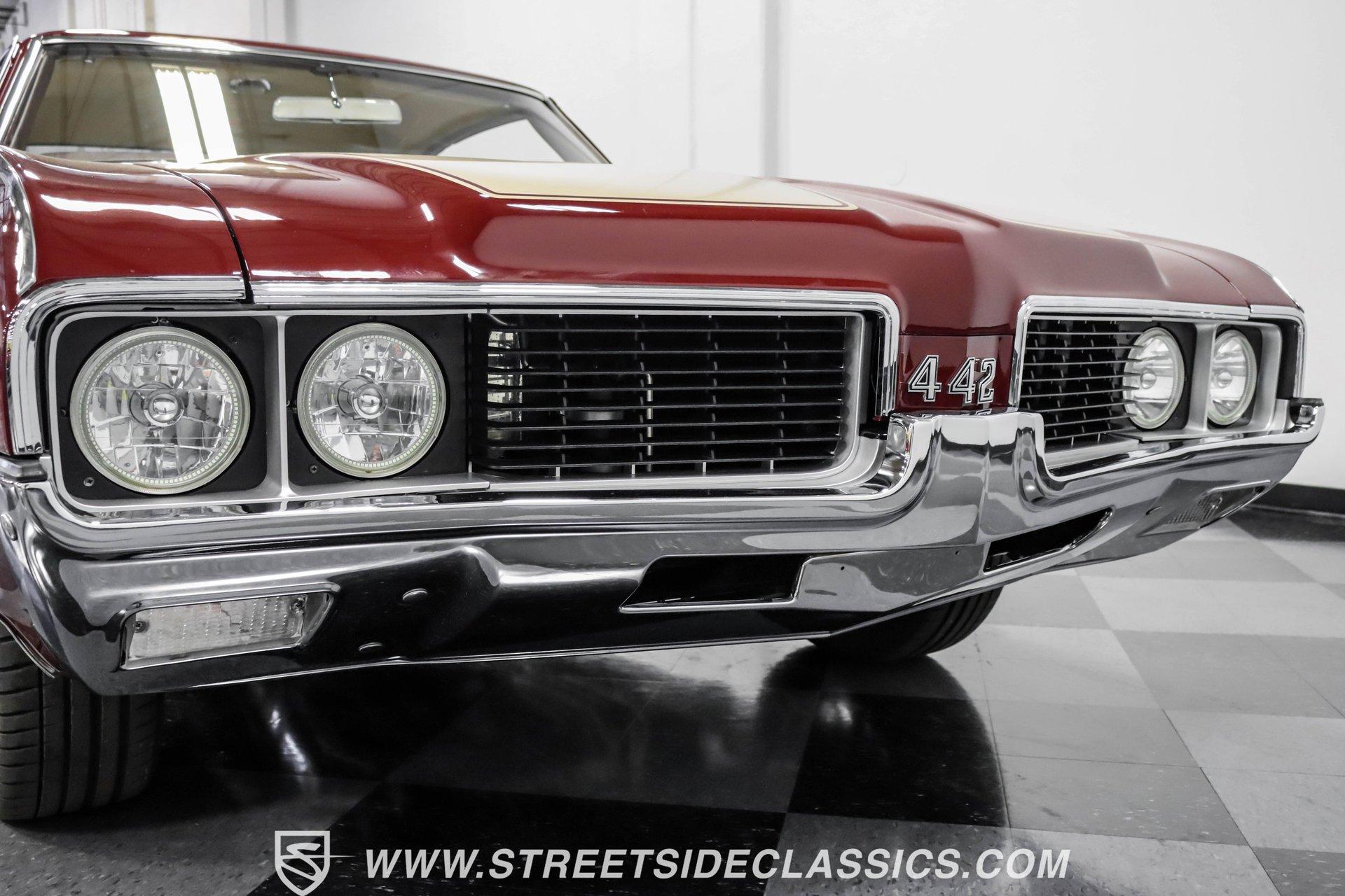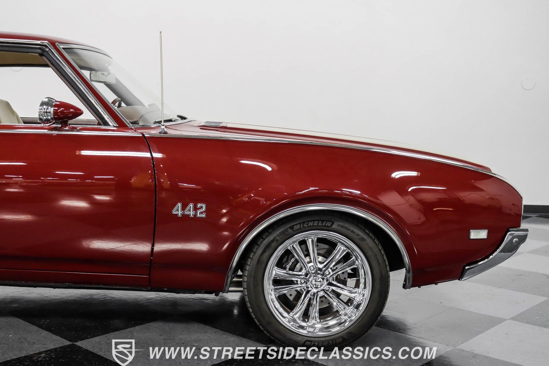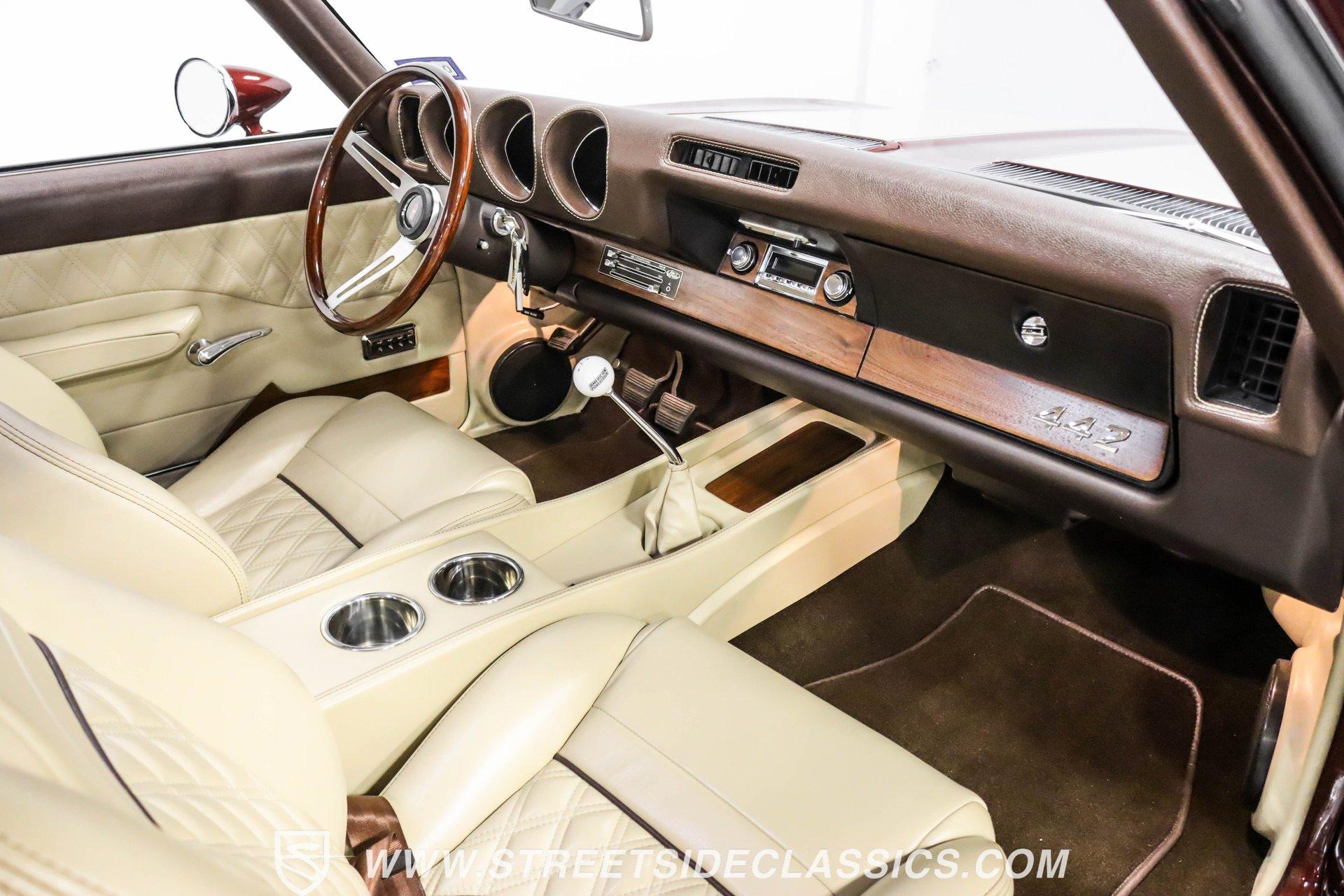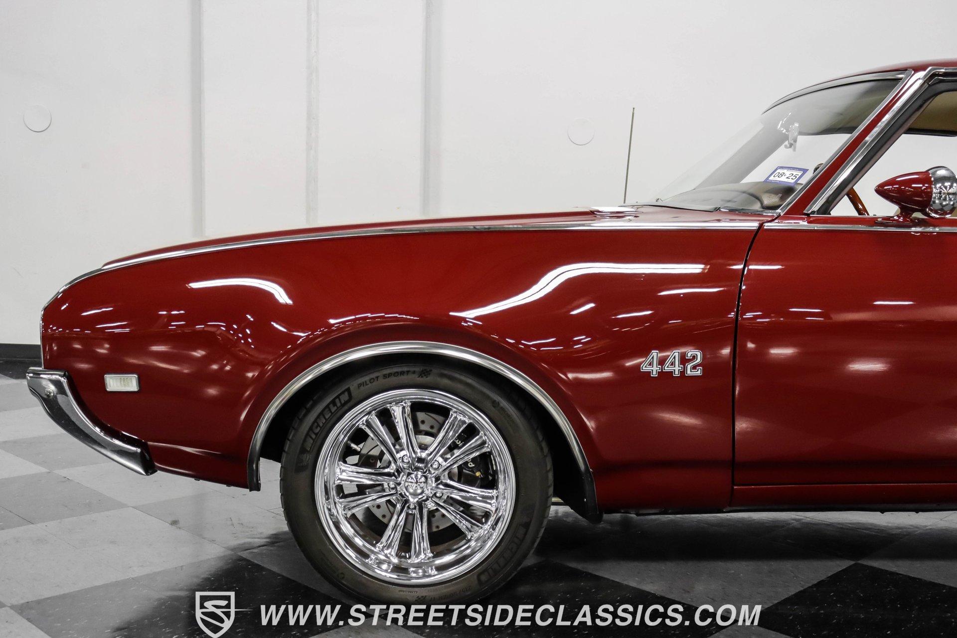 This exceptional 1969 Oldsmobile 442 has received a full frame-off restoration performed by the talented team at House of Hot Rods in Texas and has been driven a mere 826 miles since completion. Finished handsomely in deep Burgundy Metallic with Gold stripes over an arrow-straight body, this classic Oldsmobile is stunning. Rolling on chrome Foose wheels wrapped with Michelin tires staggered 215/50ZR17 front and 245/50ZR18 rear for the perfect stance, this car commands attention from its glistening chrome bumpers to its trunk-mounted rear wing. The interior is equally impressive, featuring comfortable, power adjustable, custom leather upholstered bucket seats front and rear with a custom-crafted full-length center console with beverage holders. The door panels are custom designed with wood inserts and the contrasting light brown dash pad is custom stitched. The dash is fitted with full instrumentation by Dakota Digital, Vintage air conditioning controls and a retro radio with Bluetooth. Additionally, there are power windows, a tilt steering column and a three-spoke wood-rimmed steering wheel. The trunk is completely trimmed to a high standard to match the beautiful interior. HIGHLIGHTS: Spectacular full frame-off restoration by House of Hot Rods in Texas 826 miles since build 455 Oldsmobile engine Tremec 5-speed Edelbrock aluminum heads and intake Holley Sniper EFI Be Cool aluminum radiator Foose wheels Vintage air conditioning Custom leather interior including detailed trunk Under the hood is a potent 455 cubic inch Oldsmobile engine paired with a Tremec 5-speed manual transmission. The engine features Edelbrock aluminum heads, Edelbrock aluminum high-rise intake manifold, Holley Sniper electronic fuel injection, CVF billet brackets, serpentine belt system, Be Cool aluminum radiator and electric fan, plus long-tube headers and a dual exhaust system with an X-pipe that rumbles back past Magnaflow mufflers that exit through chrome trumpet exhaust tips that are tucked up neatly in the factory 442 rear bumper exhaust cutouts. The engine bay is spectacular, with high-gloss body-color fender liners, air cleaner, firewall, engine block, oil pan and transmission. Other details include billet hood hinges and body-colored valve covers custom painted with "Olds 455". The underside of this 442 is as detailed as the rest of the car with high-gloss finishes and numerous upgrades that include a complete Wilwood 4-wheel disc brake system, including booster and master cylinder as well as drilled and slotted rotors. This classic handles great thanks to a CPP Pro Touring suspension kit that includes tubular control arms and sway bars front and rear. No expense was spared to make this 1969 Oldsmobile 442 restomod one of the best anywhere. Call today!
