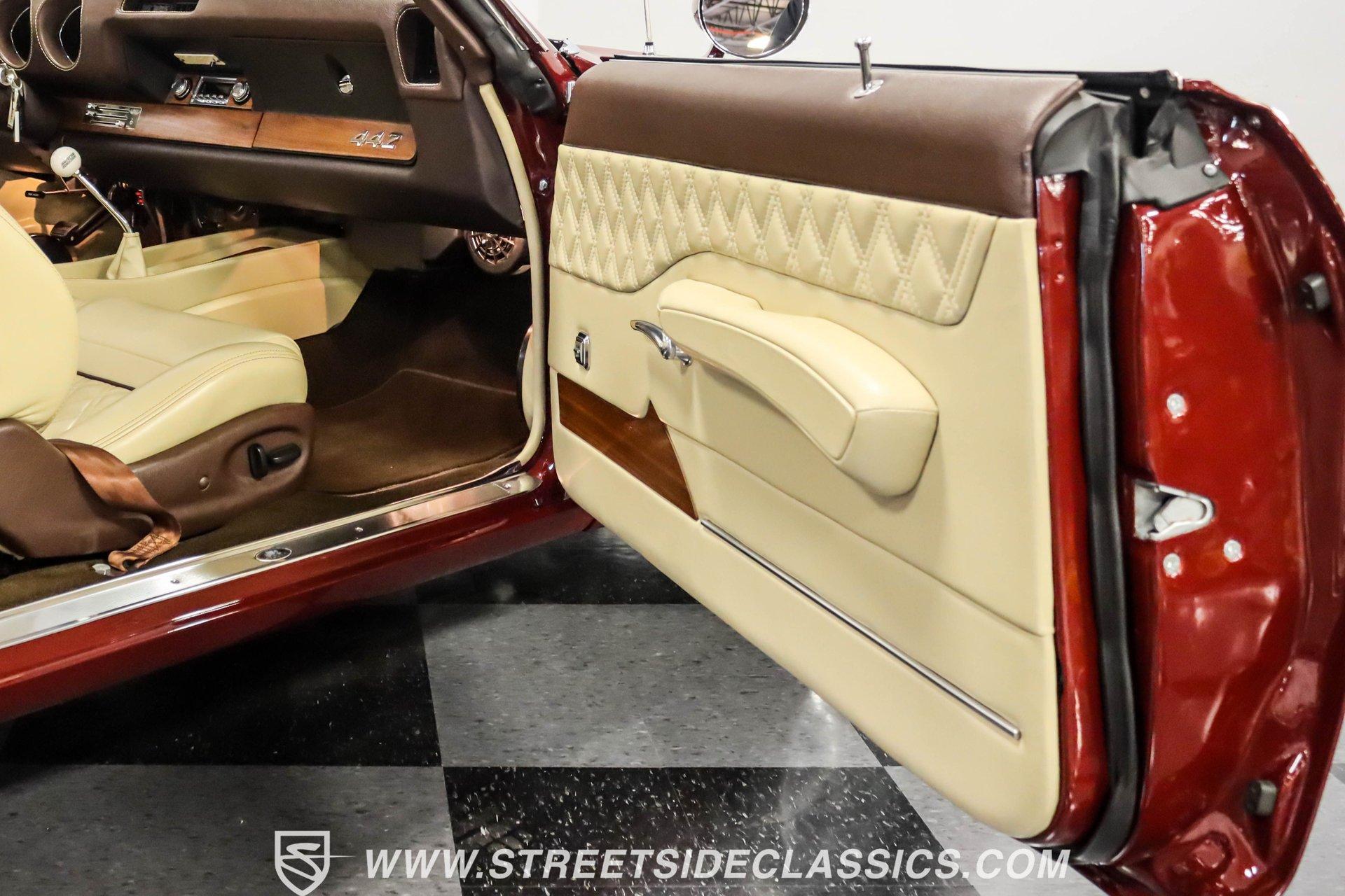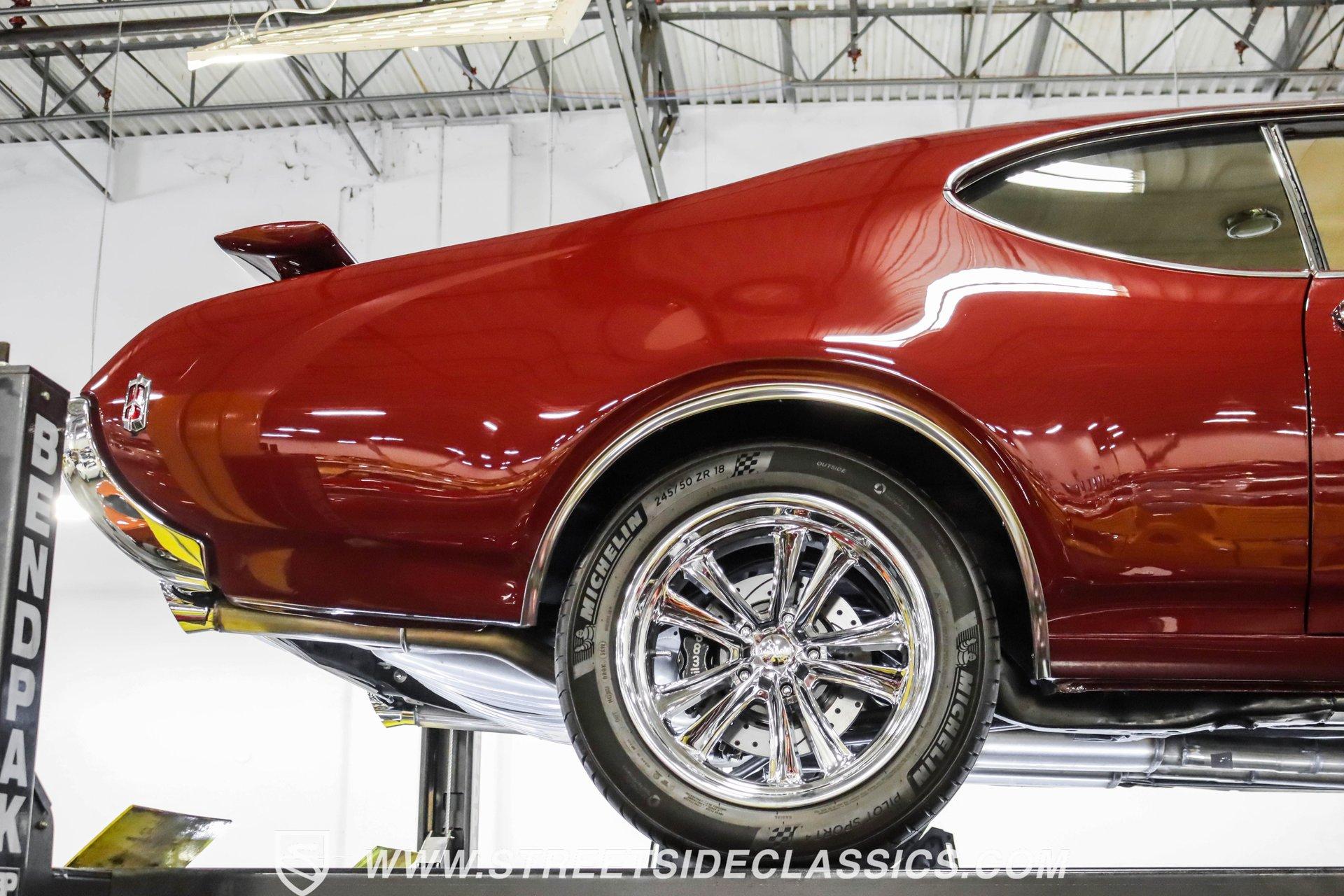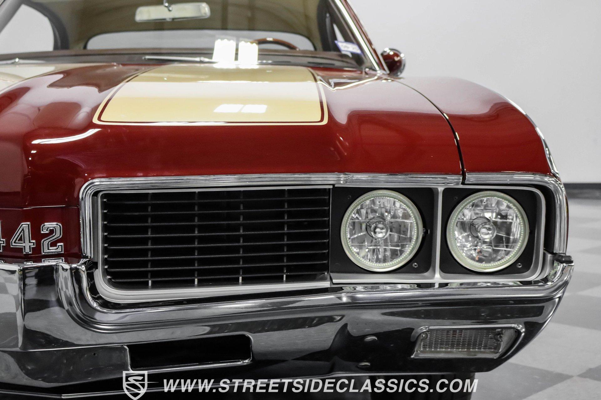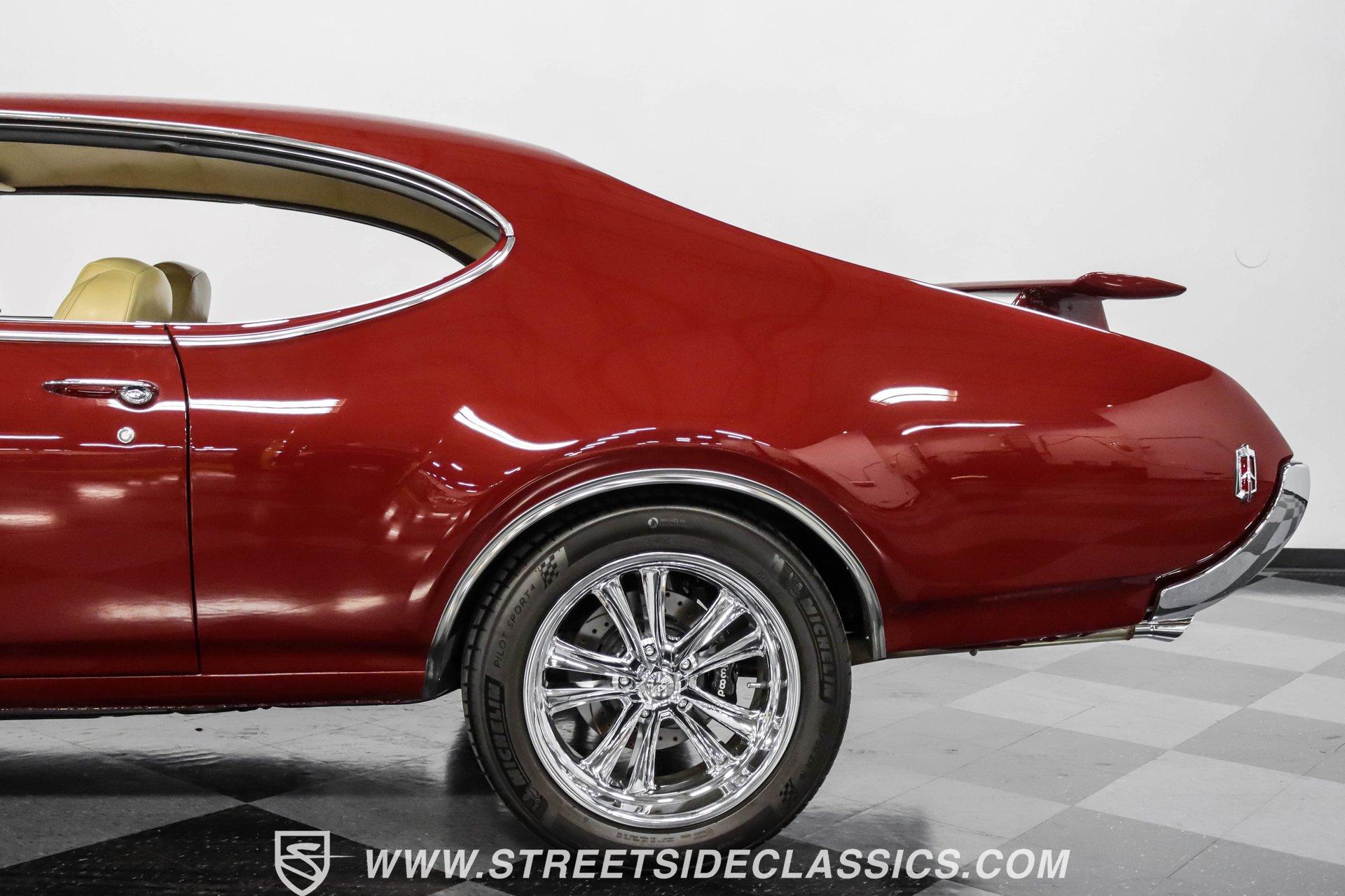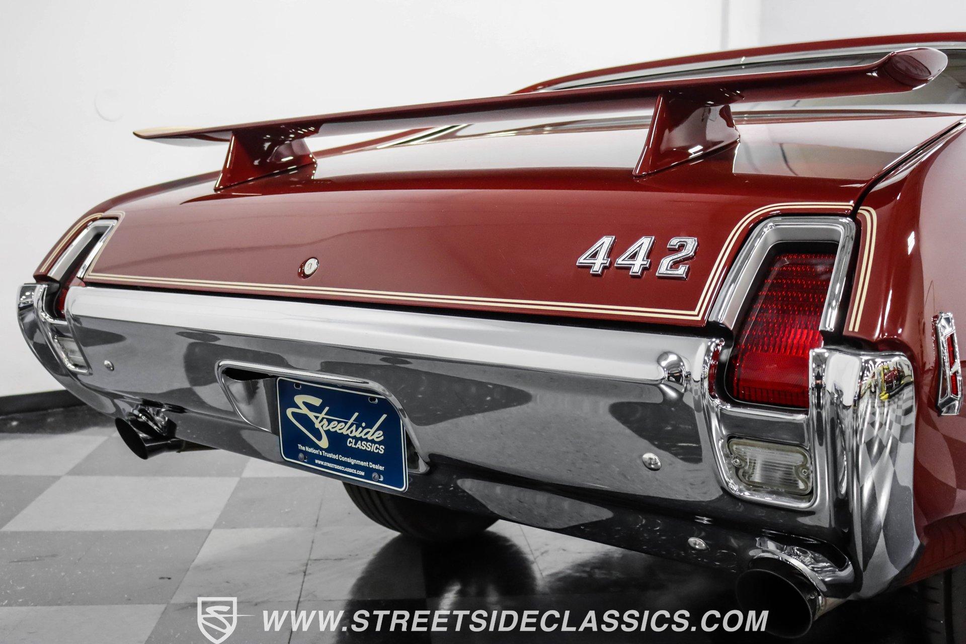 This exceptional 1969 Oldsmobile 442 has received a full frame-off restoration performed by the talented team at House of Hot Rods in Texas and has been driven a mere 826 miles since completion. Finished handsomely in deep Burgundy Metallic with Gold stripes over an arrow-straight body, this classic Oldsmobile is stunning. Rolling on chrome Foose wheels wrapped with Michelin tires staggered 215/50ZR17 front and 245/50ZR18 rear for the perfect stance, this car commands attention from its glistening chrome bumpers to its trunk-mounted rear wing. The interior is equally impressive, featuring comfortable, power adjustable, custom leather upholstered bucket seats front and rear with a custom-crafted full-length center console with beverage holders. The door panels are custom designed with wood inserts and the contrasting light brown dash pad is custom stitched. The dash is fitted with full instrumentation by Dakota Digital, Vintage air conditioning controls and a retro radio with Bluetooth. Additionally, there are power windows, a tilt steering column and a three-spoke wood-rimmed steering wheel. The trunk is completely trimmed to a high standard to match the beautiful interior. HIGHLIGHTS: Spectacular full frame-off restoration by House of Hot Rods in Texas 826 miles since build 455 Oldsmobile engine Tremec 5-speed Edelbrock aluminum heads and intake Holley Sniper EFI Be Cool aluminum radiator Foose wheels Vintage air conditioning Custom leather interior including detailed trunk Under the hood is a potent 455 cubic inch Oldsmobile engine paired with a Tremec 5-speed manual transmission. The engine features Edelbrock aluminum heads, Edelbrock aluminum high-rise intake manifold, Holley Sniper electronic fuel injection, CVF billet brackets, serpentine belt system, Be Cool aluminum radiator and electric fan, plus long-tube headers and a dual exhaust system with an X-pipe that rumbles back past Magnaflow mufflers that exit through chrome trumpet exhaust tips that are tucked up neatly in the factory 442 rear bumper exhaust cutouts. The engine bay is spectacular, with high-gloss body-color fender liners, air cleaner, firewall, engine block, oil pan and transmission. Other details include billet hood hinges and body-colored valve covers custom painted with "Olds 455". The underside of this 442 is as detailed as the rest of the car with high-gloss finishes and numerous upgrades that include a complete Wilwood 4-wheel disc brake system, including booster and master cylinder as well as drilled and slotted rotors. This classic handles great thanks to a CPP Pro Touring suspension kit that includes tubular control arms and sway bars front and rear. No expense was spared to make this 1969 Oldsmobile 442 restomod one of the best anywhere. Call today!
