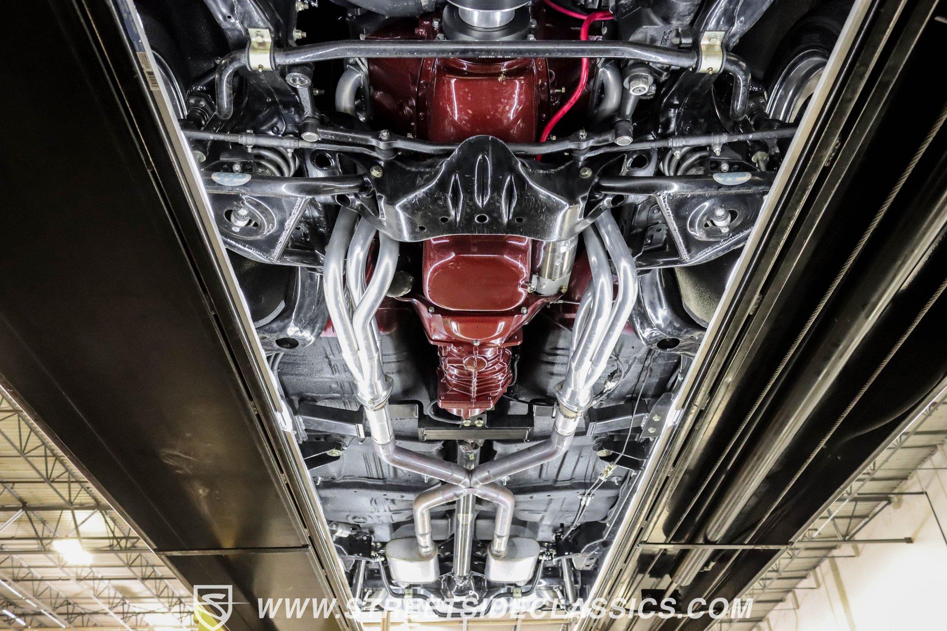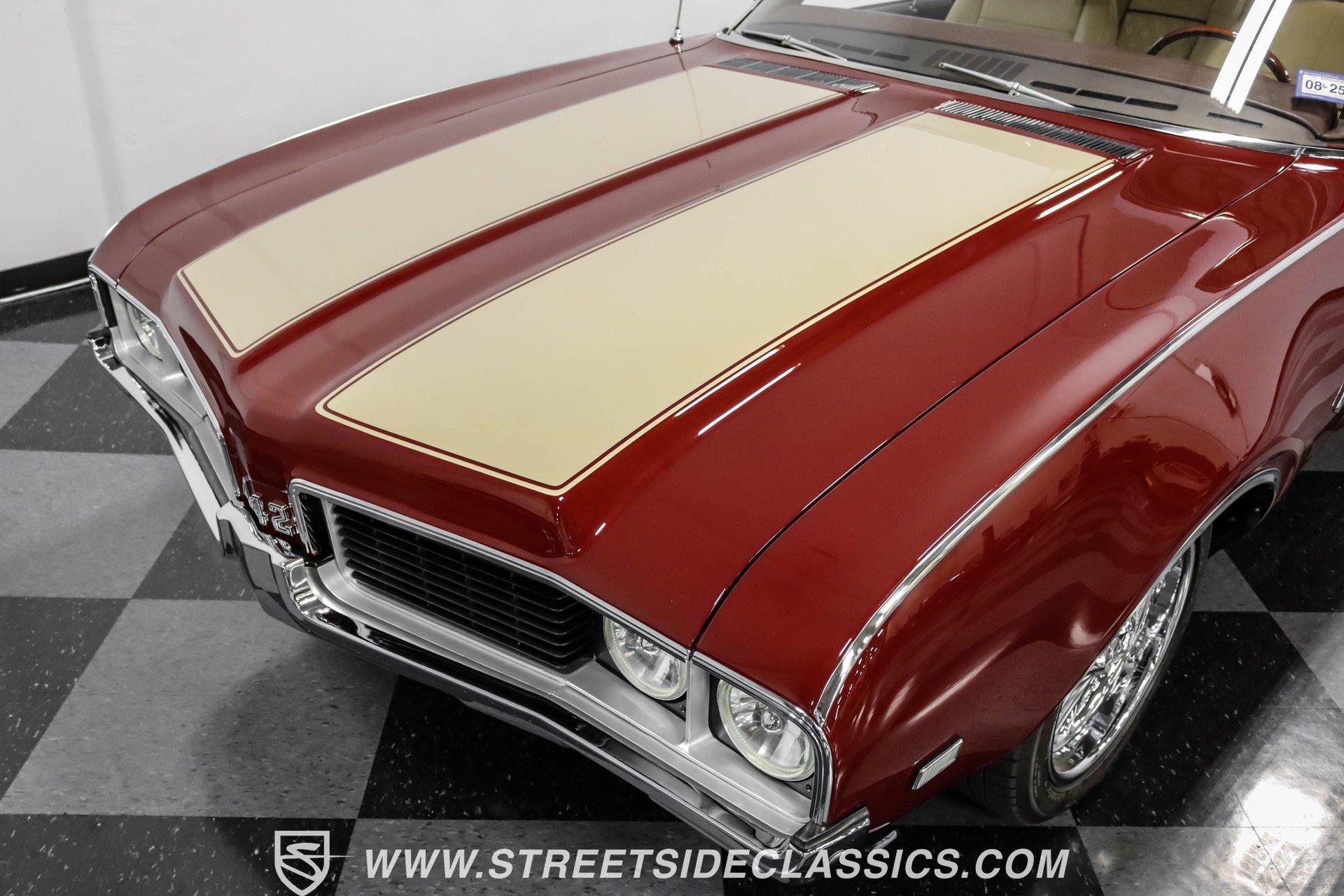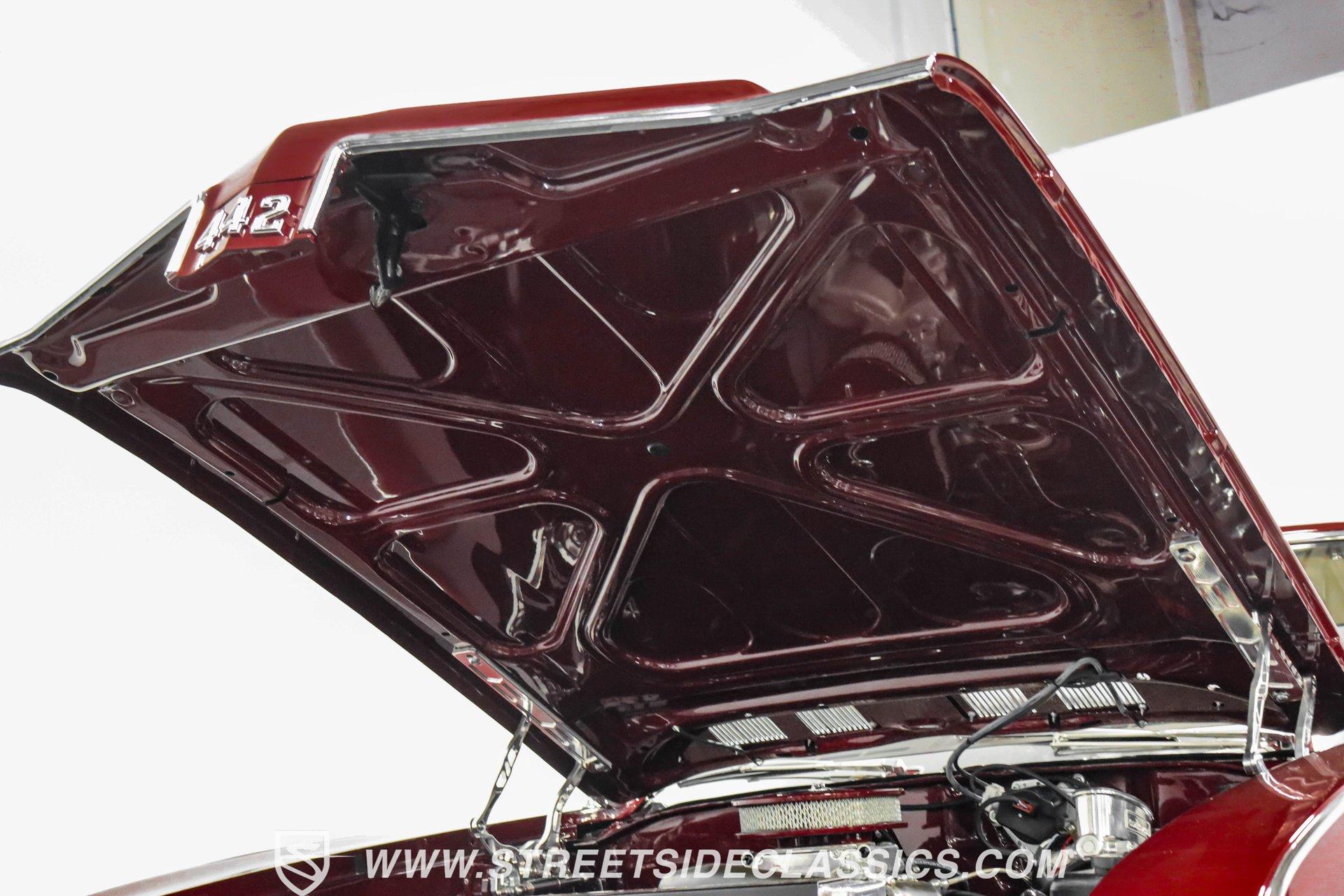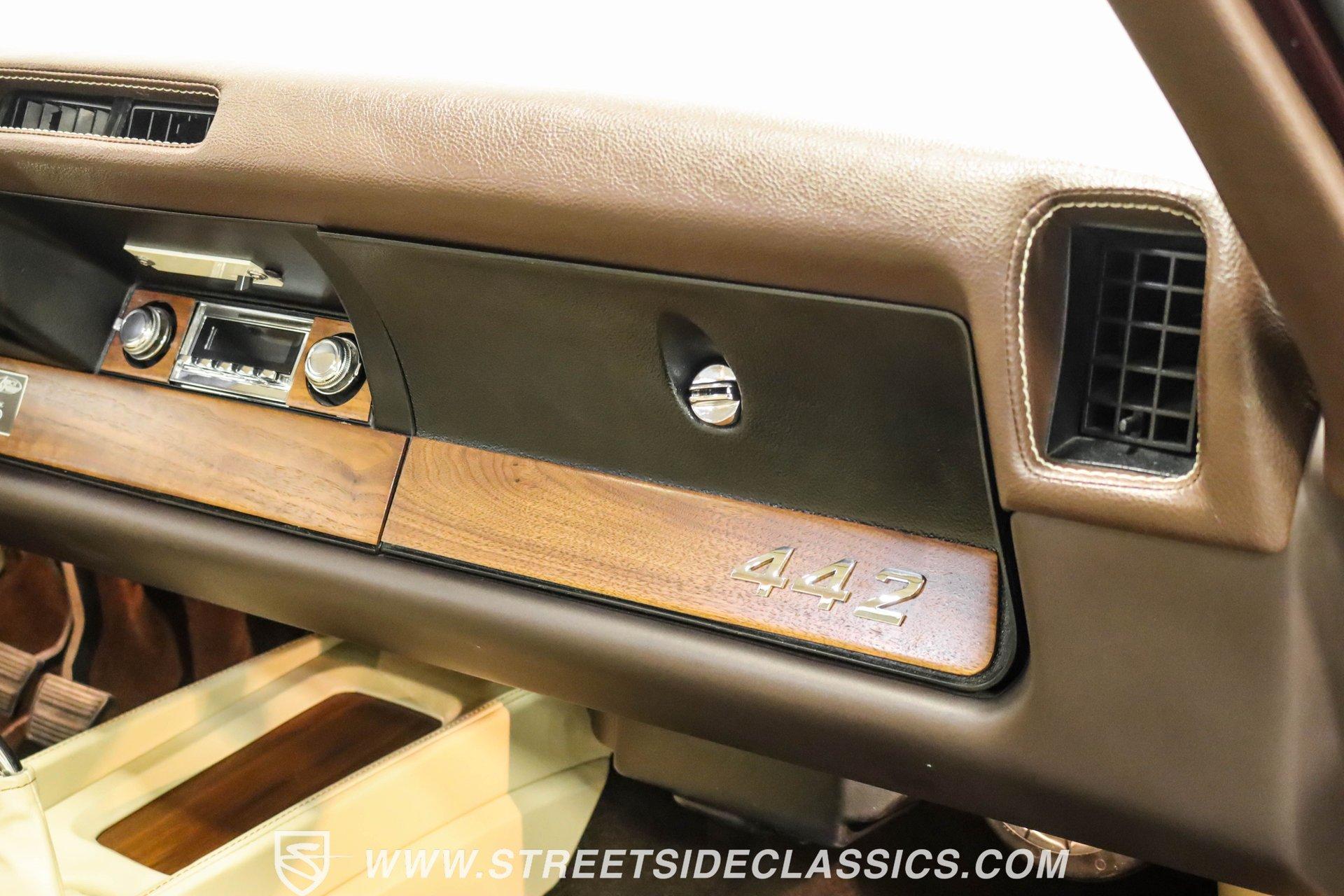 This exceptional 1969 Oldsmobile 442 has received a full frame-off restoration performed by the talented team at House of Hot Rods in Texas and has been driven a mere 826 miles since completion. Finished handsomely in deep Burgundy Metallic with Gold stripes over an arrow-straight body, this classic Oldsmobile is stunning. Rolling on chrome Foose wheels wrapped with Michelin tires staggered 215/50ZR17 front and 245/50ZR18 rear for the perfect stance, this car commands attention from its glistening chrome bumpers to its trunk-mounted rear wing. The interior is equally impressive, featuring comfortable, power adjustable, custom leather upholstered bucket seats front and rear with a custom-crafted full-length center console with beverage holders. The door panels are custom designed with wood inserts and the contrasting light brown dash pad is custom stitched. The dash is fitted with full instrumentation by Dakota Digital, Vintage air conditioning controls and a retro radio with Bluetooth. Additionally, there are power windows, a tilt steering column and a three-spoke wood-rimmed steering wheel. The trunk is completely trimmed to a high standard to match the beautiful interior. HIGHLIGHTS: Spectacular full frame-off restoration by House of Hot Rods in Texas 826 miles since build 455 Oldsmobile engine Tremec 5-speed Edelbrock aluminum heads and intake Holley Sniper EFI Be Cool aluminum radiator Foose wheels Vintage air conditioning Custom leather interior including detailed trunk Under the hood is a potent 455 cubic inch Oldsmobile engine paired with a Tremec 5-speed manual transmission. The engine features Edelbrock aluminum heads, Edelbrock aluminum high-rise intake manifold, Holley Sniper electronic fuel injection, CVF billet brackets, serpentine belt system, Be Cool aluminum radiator and electric fan, plus long-tube headers and a dual exhaust system with an X-pipe that rumbles back past Magnaflow mufflers that exit through chrome trumpet exhaust tips that are tucked up neatly in the factory 442 rear bumper exhaust cutouts. The engine bay is spectacular, with high-gloss body-color fender liners, air cleaner, firewall, engine block, oil pan and transmission. Other details include billet hood hinges and body-colored valve covers custom painted with "Olds 455". The underside of this 442 is as detailed as the rest of the car with high-gloss finishes and numerous upgrades that include a complete Wilwood 4-wheel disc brake system, including booster and master cylinder as well as drilled and slotted rotors. This classic handles great thanks to a CPP Pro Touring suspension kit that includes tubular control arms and sway bars front and rear. No expense was spared to make this 1969 Oldsmobile 442 restomod one of the best anywhere. Call today!