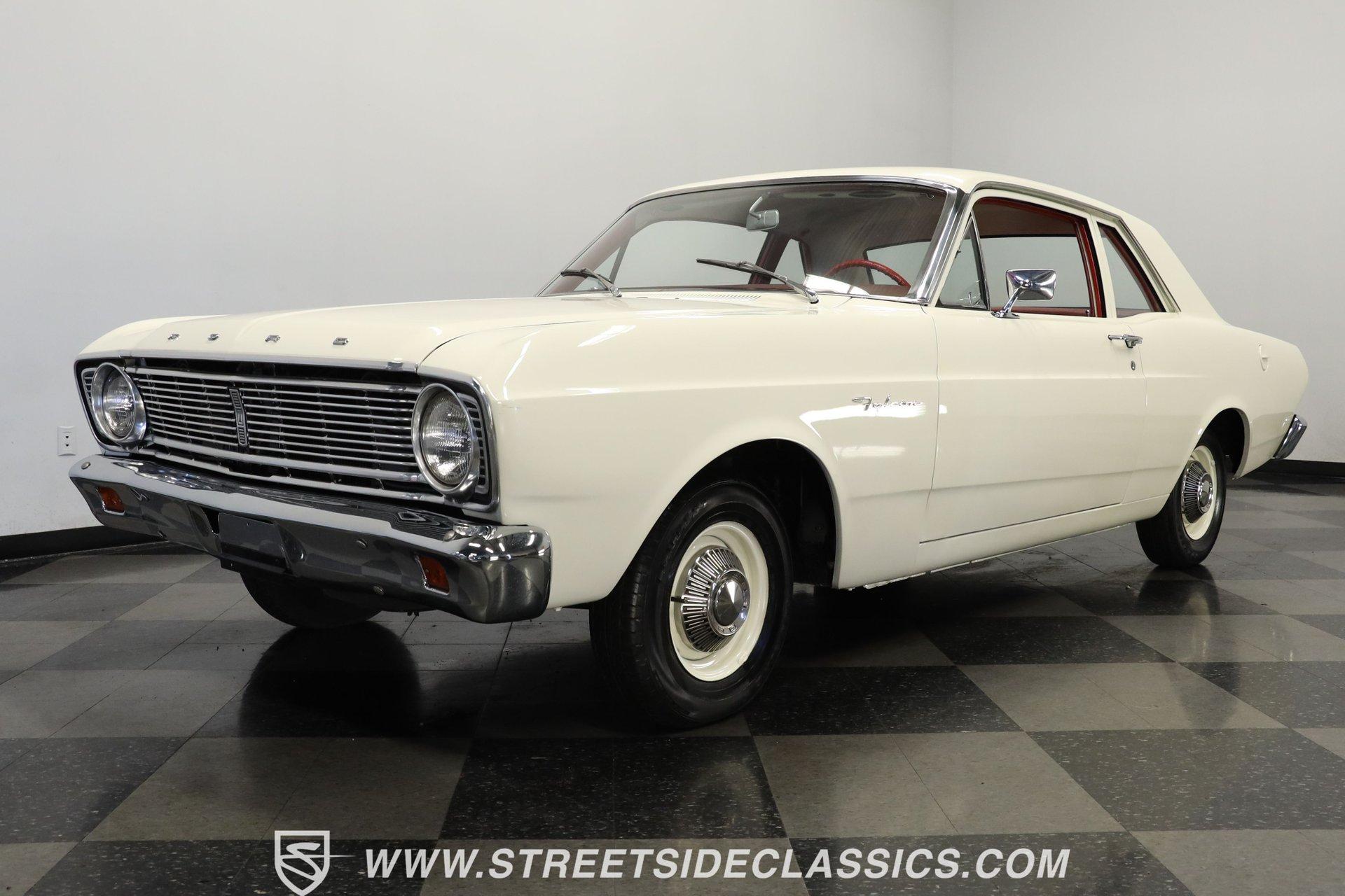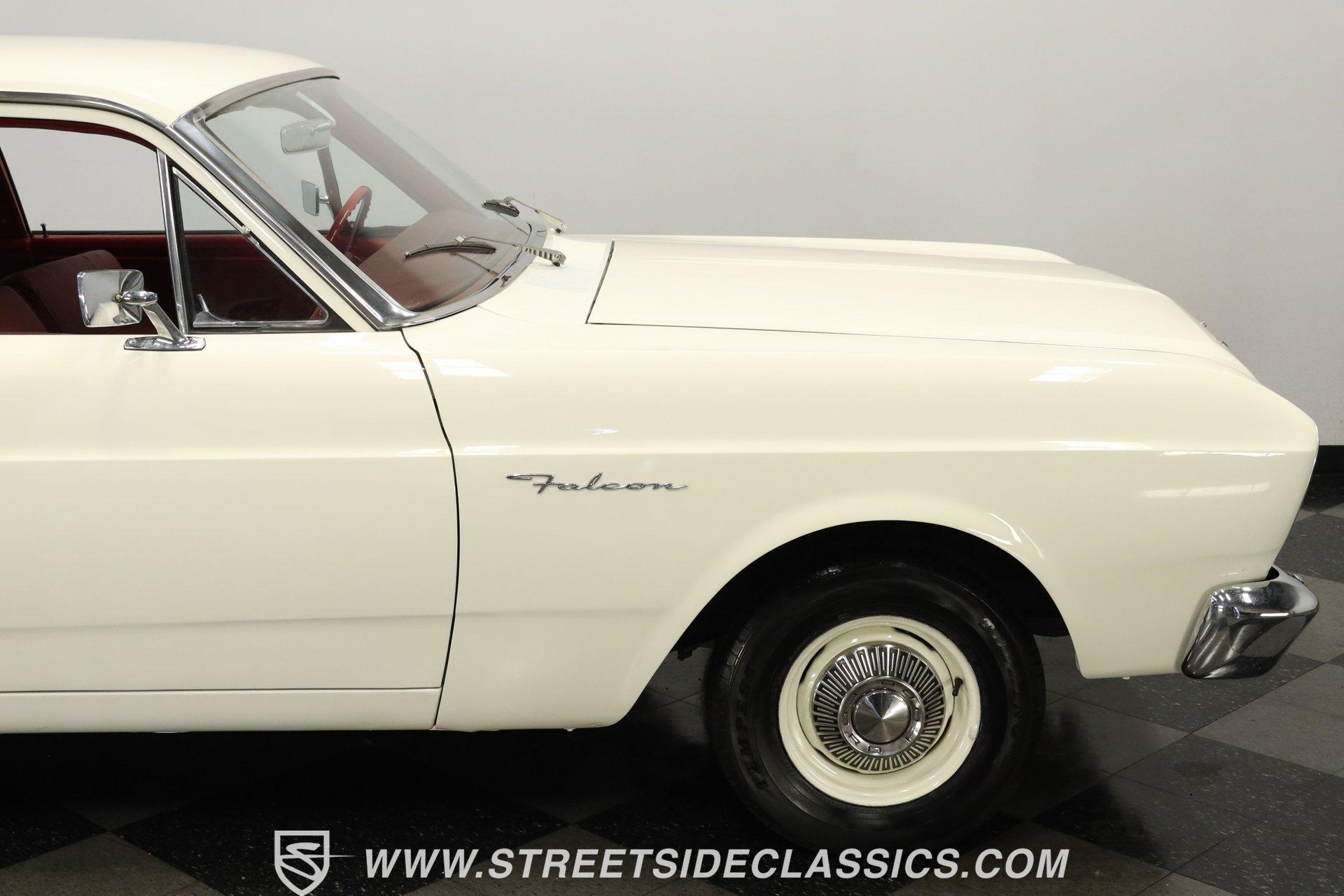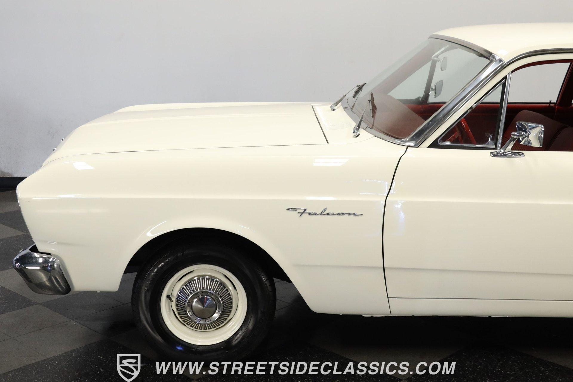 4862-TPA 1966 FORD FALCON CLUB COUPE Originally purchased at Bartow Ford in November 1965, this 1966 Ford Falcon Club Coupe presents its original Wimbledon White finish, a color that matches its delivery paperwork from nearly six decades ago. The clean lines of this coupe display Ford's refined styling with its longer hood and distinctive profile. Chrome bumpers and trim add brilliant contrast while 13-inch painted steel wheels with factory Ford hubcaps roll on 175/80R13 tires. The red interior creates a bold atmosphere inside this Falcon. Vinyl and cloth split-bench seats maintain their form while providing excellent comfort. The dash showcases clear gauges set against glossy paintwork. A column-mounted shifter preserves floor space, and factory seatbelts are present front and rear. A protective rubber floor mat adds durability to the cabin's floor. The 170 cubic inch inline-six displays proper factory finishes throughout the engine bay. This powerplant connects to a 3-speed manual transmission for direct control over acceleration and cruising speeds. The suspension utilizes coil springs with shocks up front and leaf springs in the rear. A single exhaust system provides appropriate sound levels, while drum brakes at all four corners deliver reliable stopping power. HIGHLIGHTS: 170 Inline-6 Engine 3-Speed Manual Transmission Single-Barrel Carburetor Single Exhaust System Drum Brakes Coil Spring Front Suspension Leaf Spring Rear Suspension Wimbledon White Paint Chrome Bumpers and Trim 13" Steel Wheels with Ford Hubcaps in 175/80R13 Tires Factory Glass Red Interior with Split-Bench Seats Column-Mounted Shifter Clear Factory Gauges Front and Rear Seatbelts Rubber Floor Mat Original Bill of Sale from Bartow Ford Original Owner's Manual Two-Owner History, one family owned! This 1966 Ford Falcon Club Coupe offers authentic 1960s Ford engineering with its inline-six engine, manual transmission, and classic styling. A documented two-owner history adds value to this well-preserved example. Call today! We can assist you with getting an Extended Vehicle Service Plan from Freedom Warranty, which provides comprehensive coverage that can save thousands of dollars on unexpected repairs. Inquire for more details and pricing!