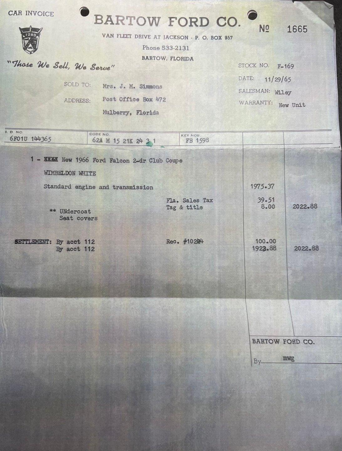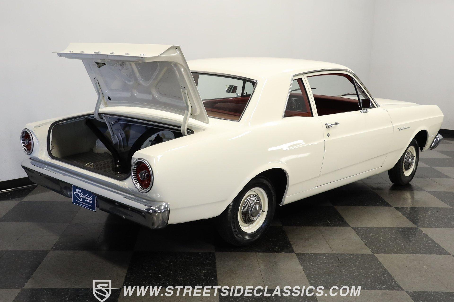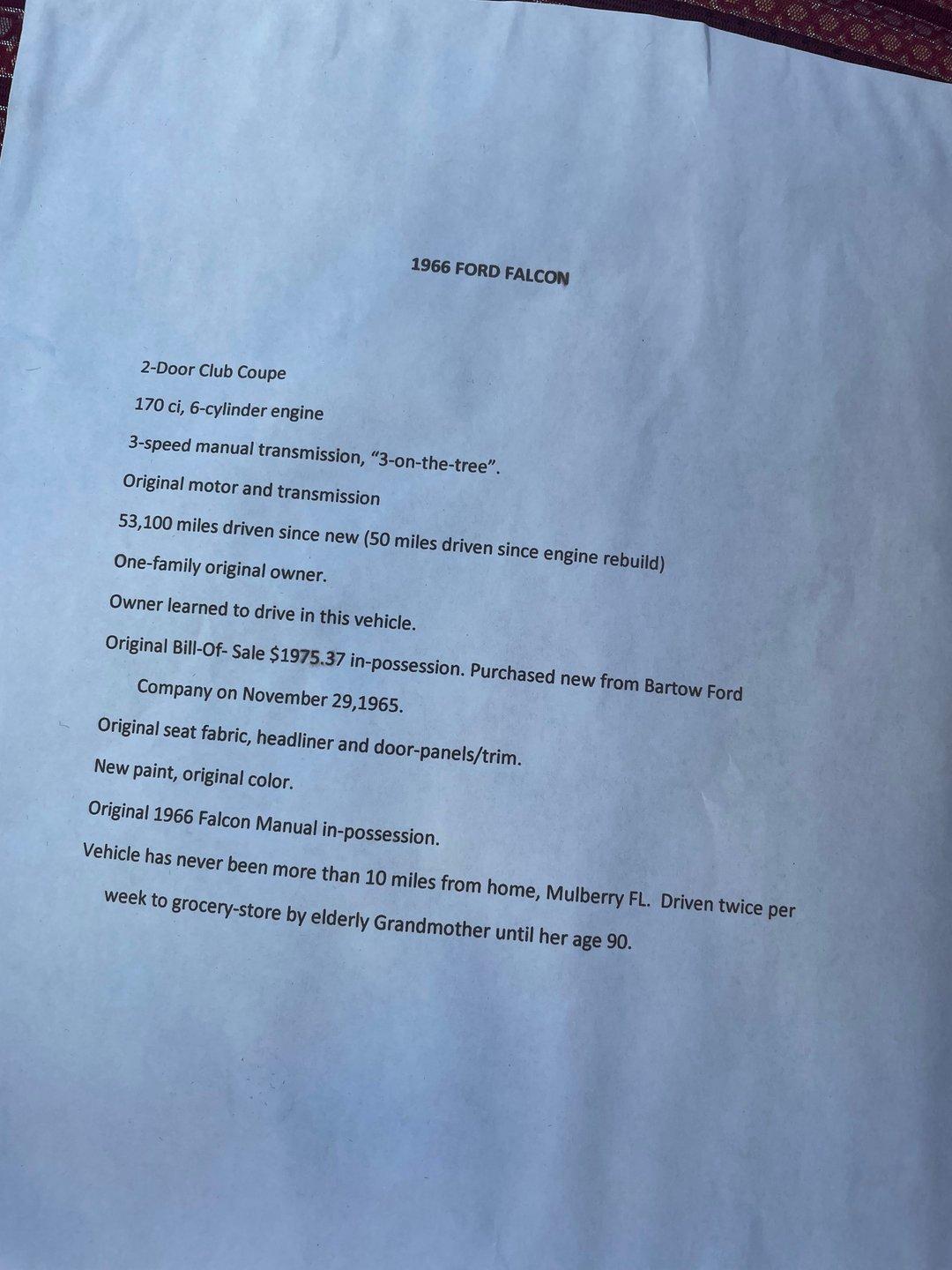 4862-TPA 1966 FORD FALCON CLUB COUPE Originally purchased at Bartow Ford in November 1965, this 1966 Ford Falcon Club Coupe presents its original Wimbledon White finish, a color that matches its delivery paperwork from nearly six decades ago. The clean lines of this coupe display Ford's refined styling with its longer hood and distinctive profile. Chrome bumpers and trim add brilliant contrast while 13-inch painted steel wheels with factory Ford hubcaps roll on 175/80R13 tires. The red interior creates a bold atmosphere inside this Falcon. Vinyl and cloth split-bench seats maintain their form while providing excellent comfort. The dash showcases clear gauges set against glossy paintwork. A column-mounted shifter preserves floor space, and factory seatbelts are present front and rear. A protective rubber floor mat adds durability to the cabin's floor. The 170 cubic inch inline-six displays proper factory finishes throughout the engine bay. This powerplant connects to a 3-speed manual transmission for direct control over acceleration and cruising speeds. The suspension utilizes coil springs with shocks up front and leaf springs in the rear. A single exhaust system provides appropriate sound levels, while drum brakes at all four corners deliver reliable stopping power. HIGHLIGHTS: 170 Inline-6 Engine 3-Speed Manual Transmission Single-Barrel Carburetor Single Exhaust System Drum Brakes Coil Spring Front Suspension Leaf Spring Rear Suspension Wimbledon White Paint Chrome Bumpers and Trim 13" Steel Wheels with Ford Hubcaps in 175/80R13 Tires Factory Glass Red Interior with Split-Bench Seats Column-Mounted Shifter Clear Factory Gauges Front and Rear Seatbelts Rubber Floor Mat Original Bill of Sale from Bartow Ford Original Owner's Manual Two-Owner History, one family owned! This 1966 Ford Falcon Club Coupe offers authentic 1960s Ford engineering with its inline-six engine, manual transmission, and classic styling. A documented two-owner history adds value to this well-preserved example. Call today! We can assist you with getting an Extended Vehicle Service Plan from Freedom Warranty, which provides comprehensive coverage that can save thousands of dollars on unexpected repairs. Inquire for more details and pricing!