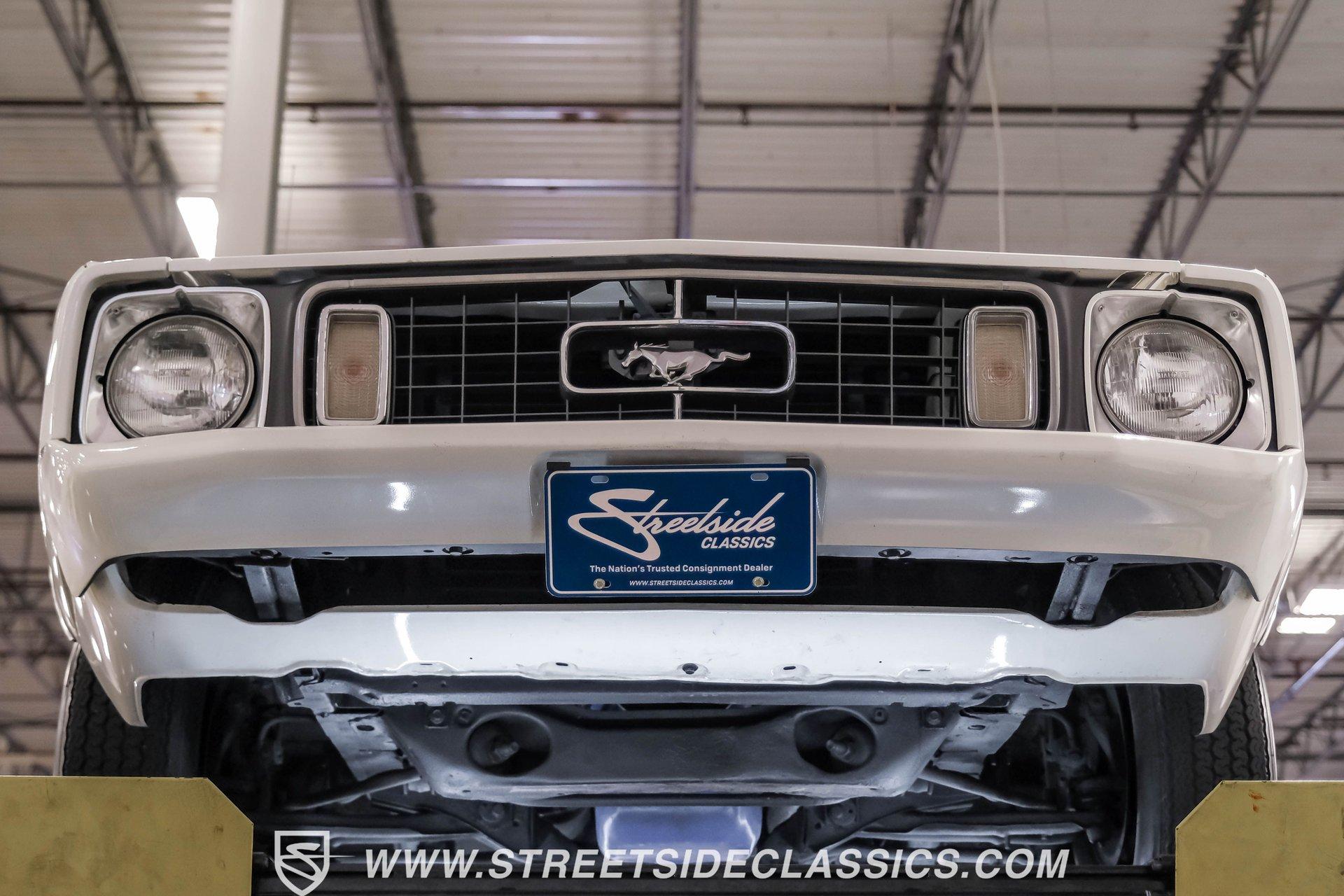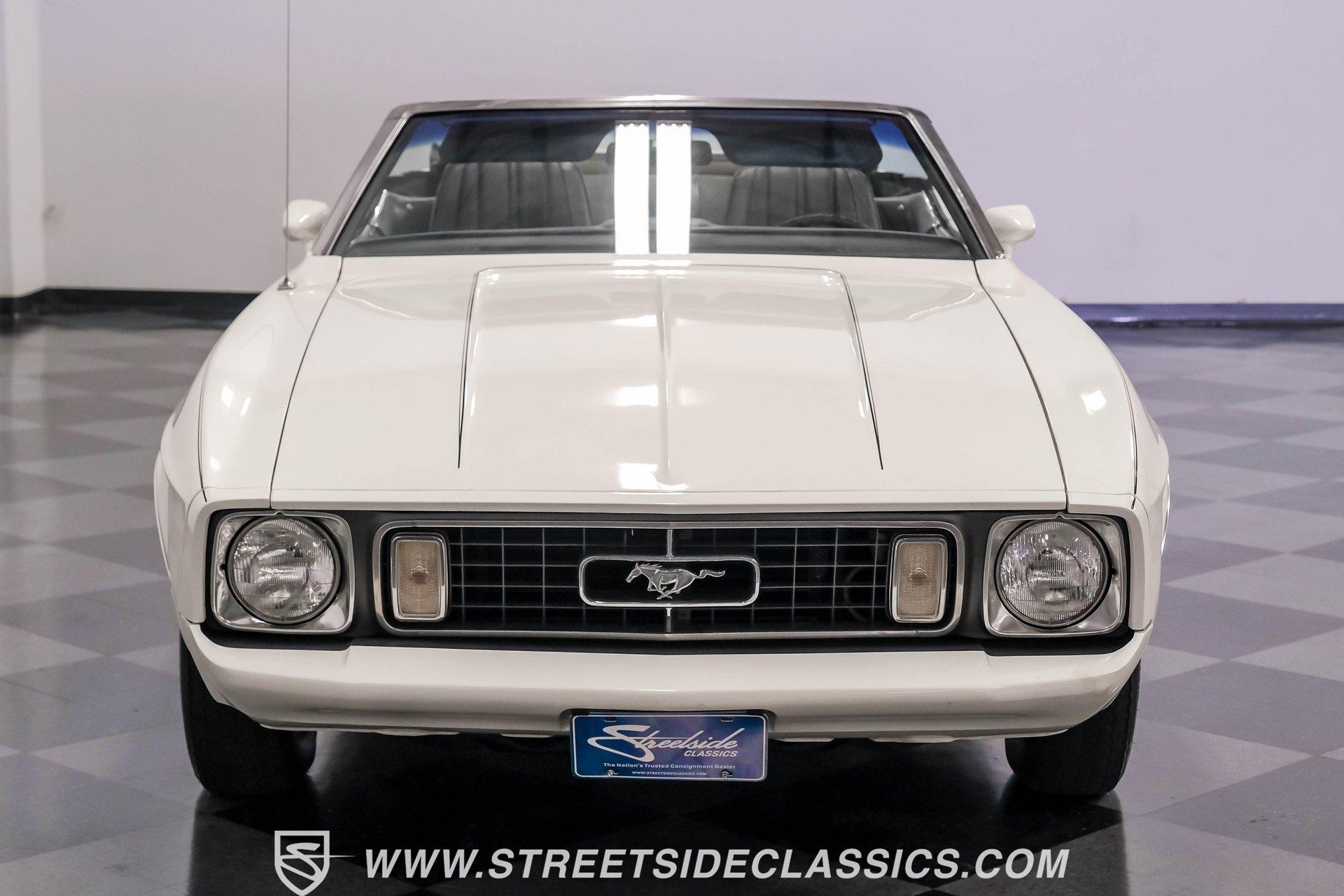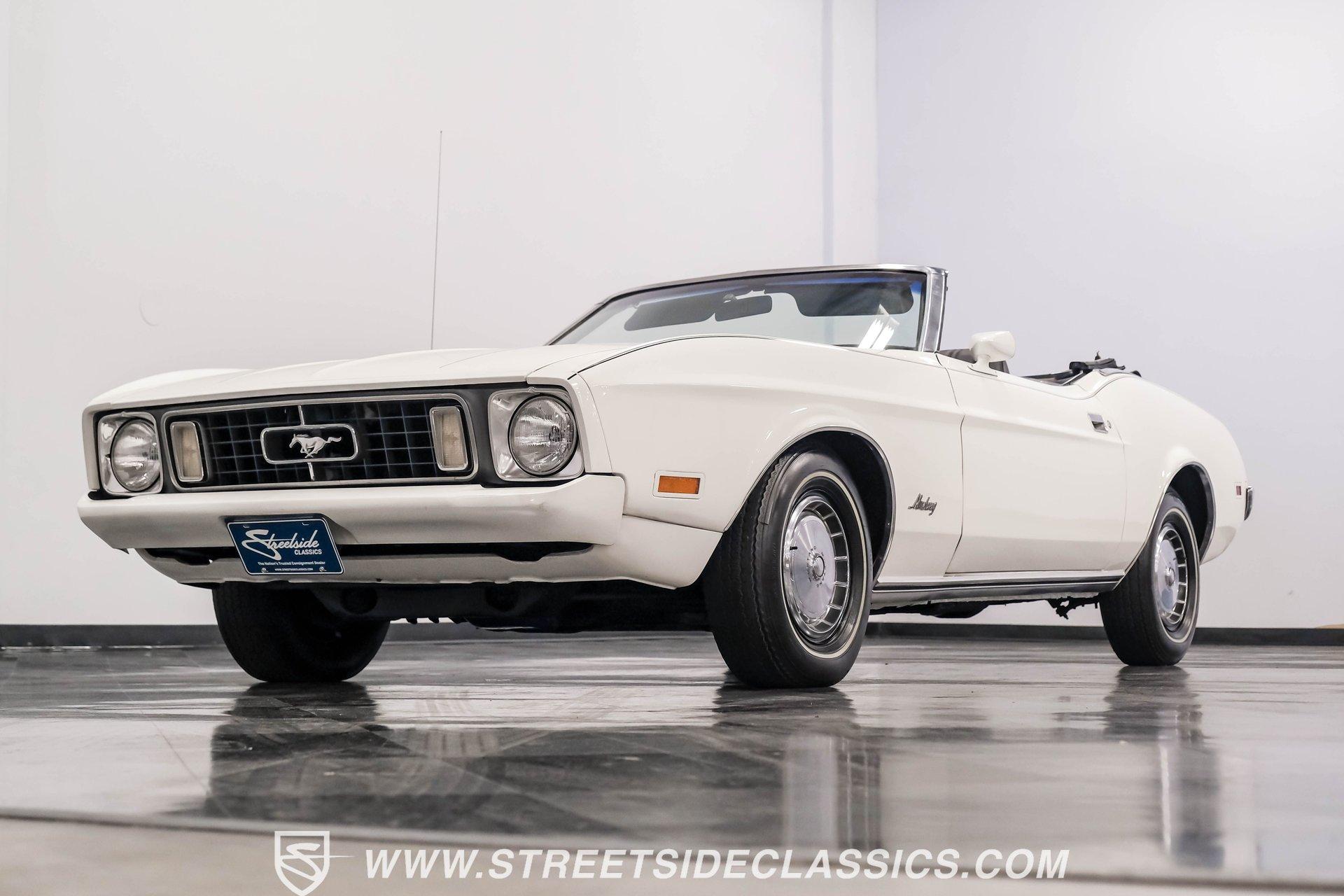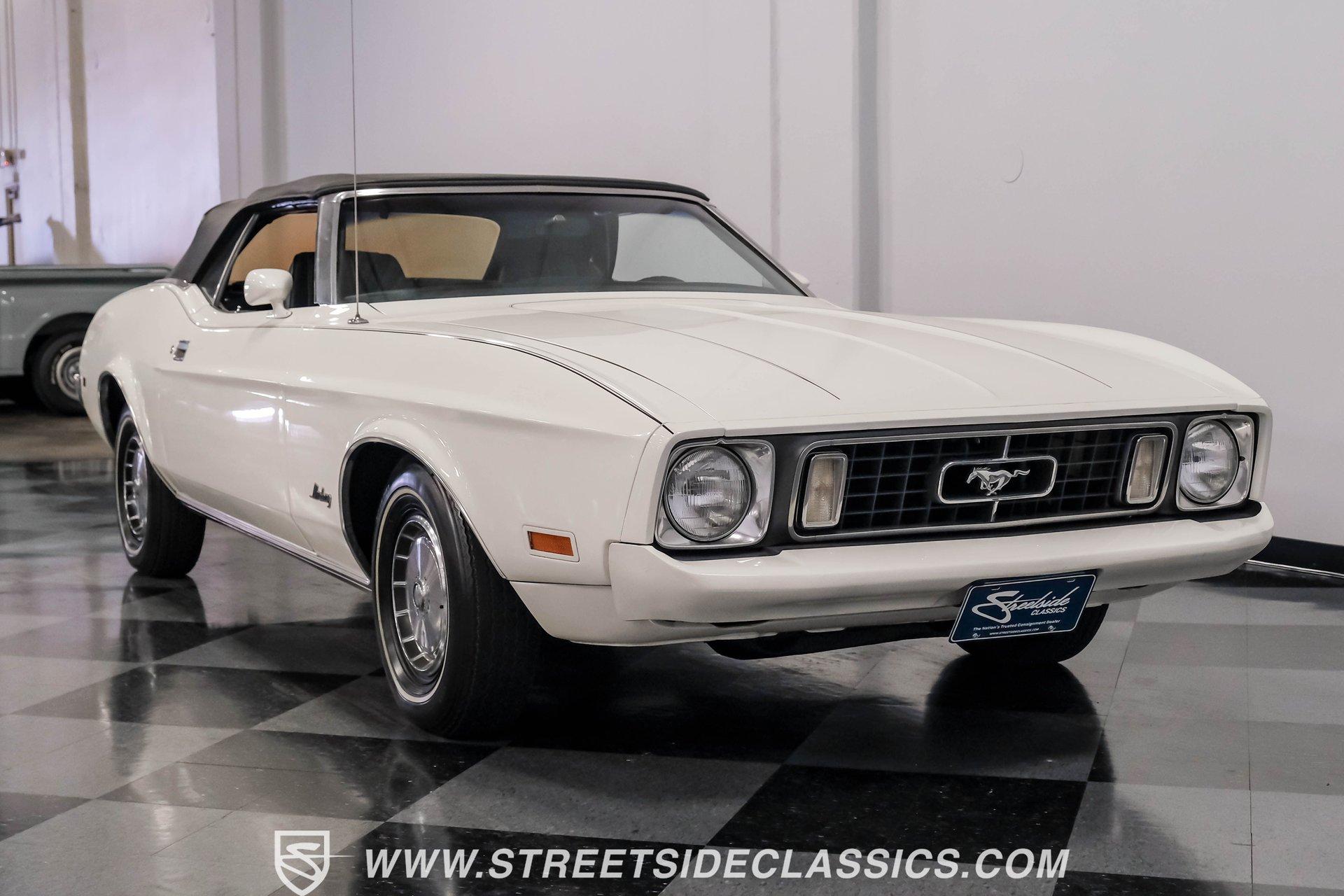 This 1973 Ford Mustang Convertible marks the final year of the first-generation pony car. The white exterior paired with black pinstriping creates a bold visual impact, amplified by its factory-correct black vinyl convertible top with clear plastic rear window. The classic styling cues include the distinctive front grille and refined tail section. Rolling on 14-inch factory wheels wrapped in Michelin 195-14 tires, this convertible exhibits Ford's premium approach to the final year of production. The black vinyl interior delivers classic muscle car style with bucket seats divided by a center console. The floor-mounted shifter adds a sporty touch while air conditioning and power steering provide driving comfort. The factory AM/FM radio supplies the soundtrack, while the power convertible top mechanism offers open-air convenience. Custom floor mats protect the newer black carpeting, completing the well-appointed cabin. The muscular 351 Cleveland V8 cranks out plenty of Detroit muscle through the FMX 3-speed automatic transmission. Enhanced control comes from the power front disc brake setup, while the aftermarket muffler adds a deep exhaust note. The engineering team at Ford dialed in the handling with a performance-minded suspension - coil springs and sway bar up front working in concert with the beefy 9-inch rear axle and leaf springs out back. HIGHLIGHTS: 351 Cleveland V8 Engine FMX 3-Speed Automatic Transmission Power Front Disc Brakes 9-inch Rear Axle White Paint with Black Pinstriping Black Convertible Top 14-inch Factory Wheels in Michelin 195-14 Tires Power Convertible Top Black Vinyl Interior Bucket Seats w/ Center Console Floor-Mounted Shifter Power Steering Air Conditioning Factory AM/FM Radio Maintenance Records Service Documentation This 1973 Ford Mustang Convertible showcases the refined evolution of the first-generation platform, featuring a 351 Cleveland V8, power accessories, and classic white-over-black color combination. Call today!