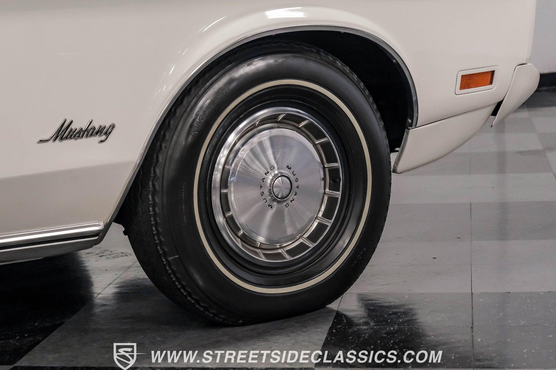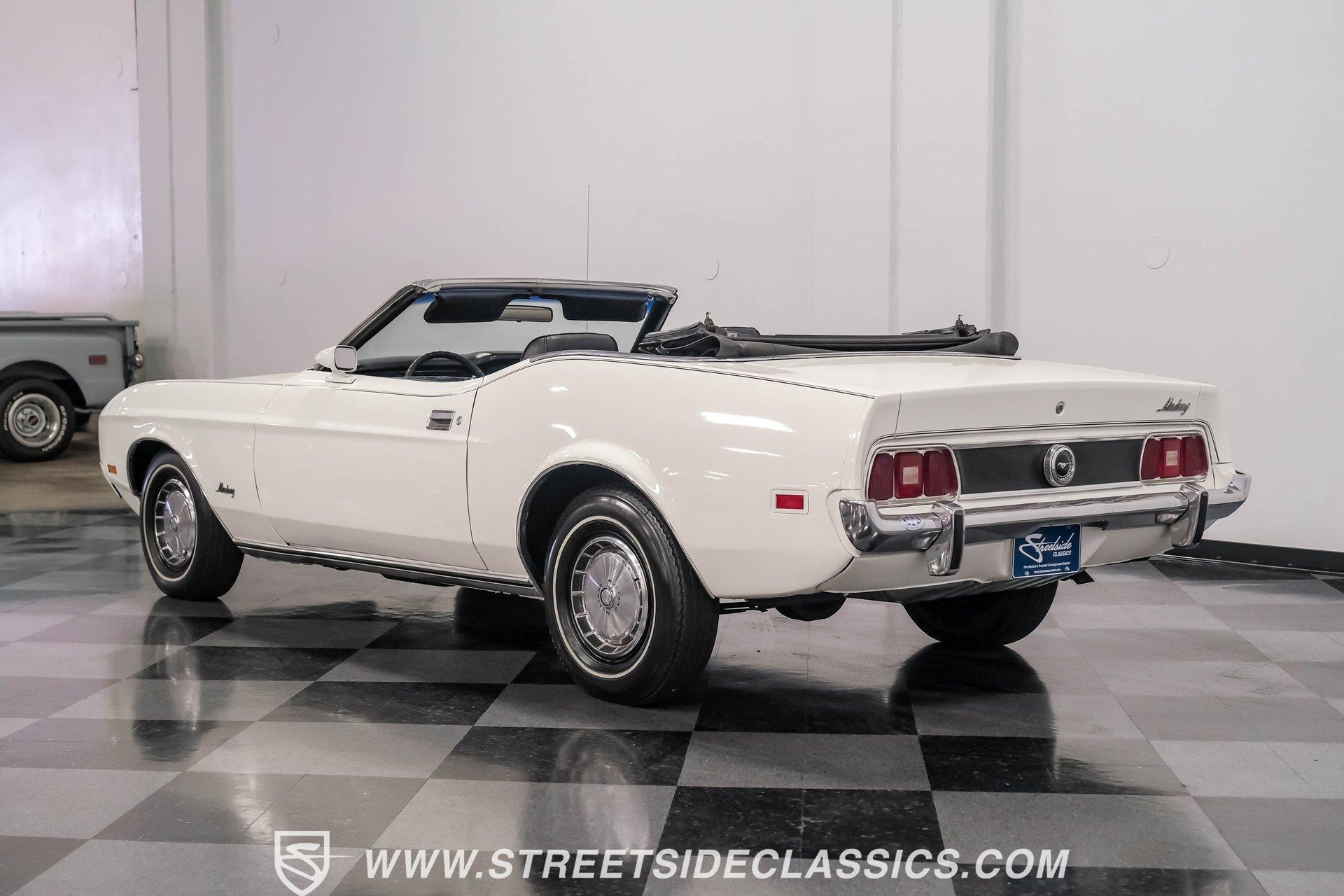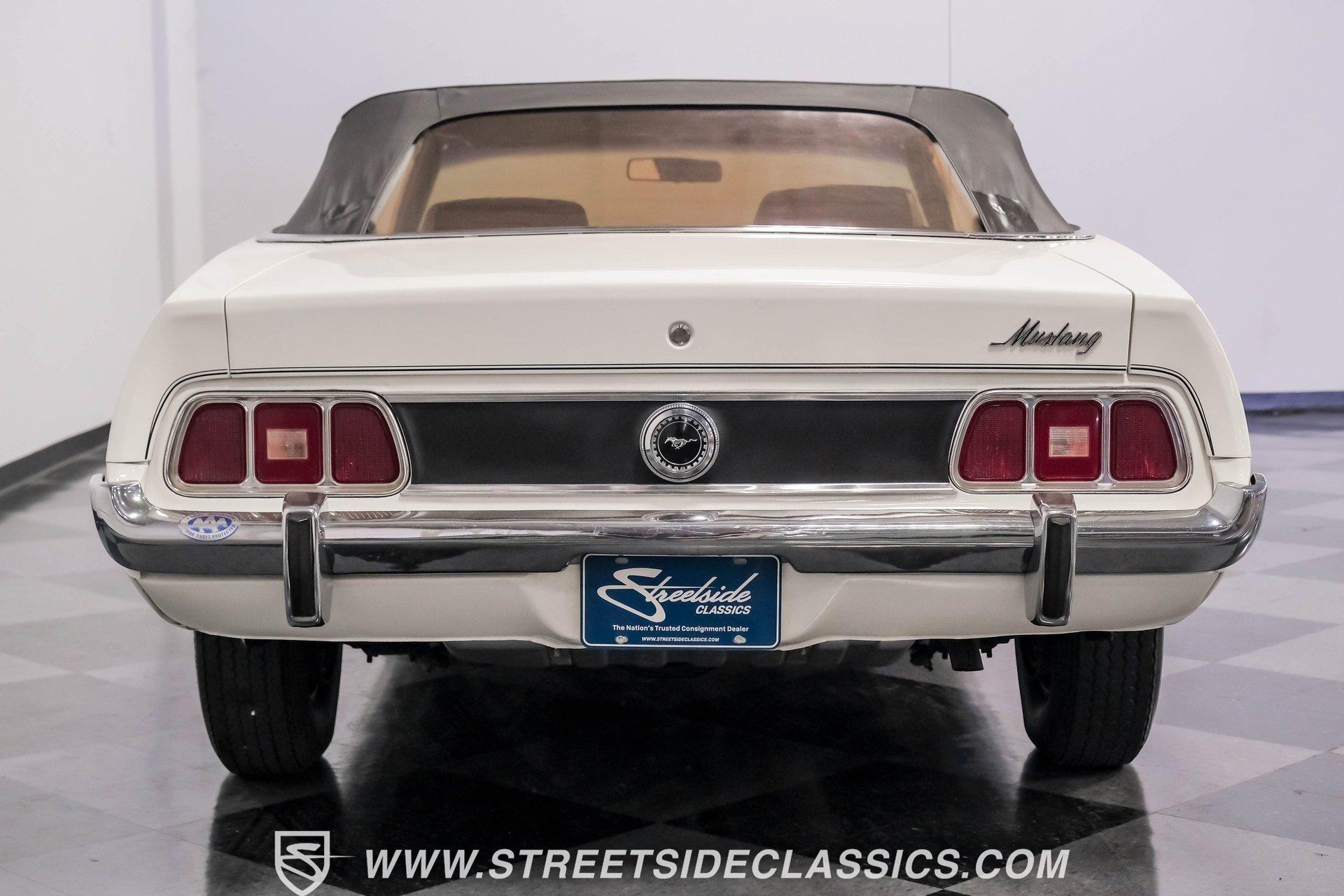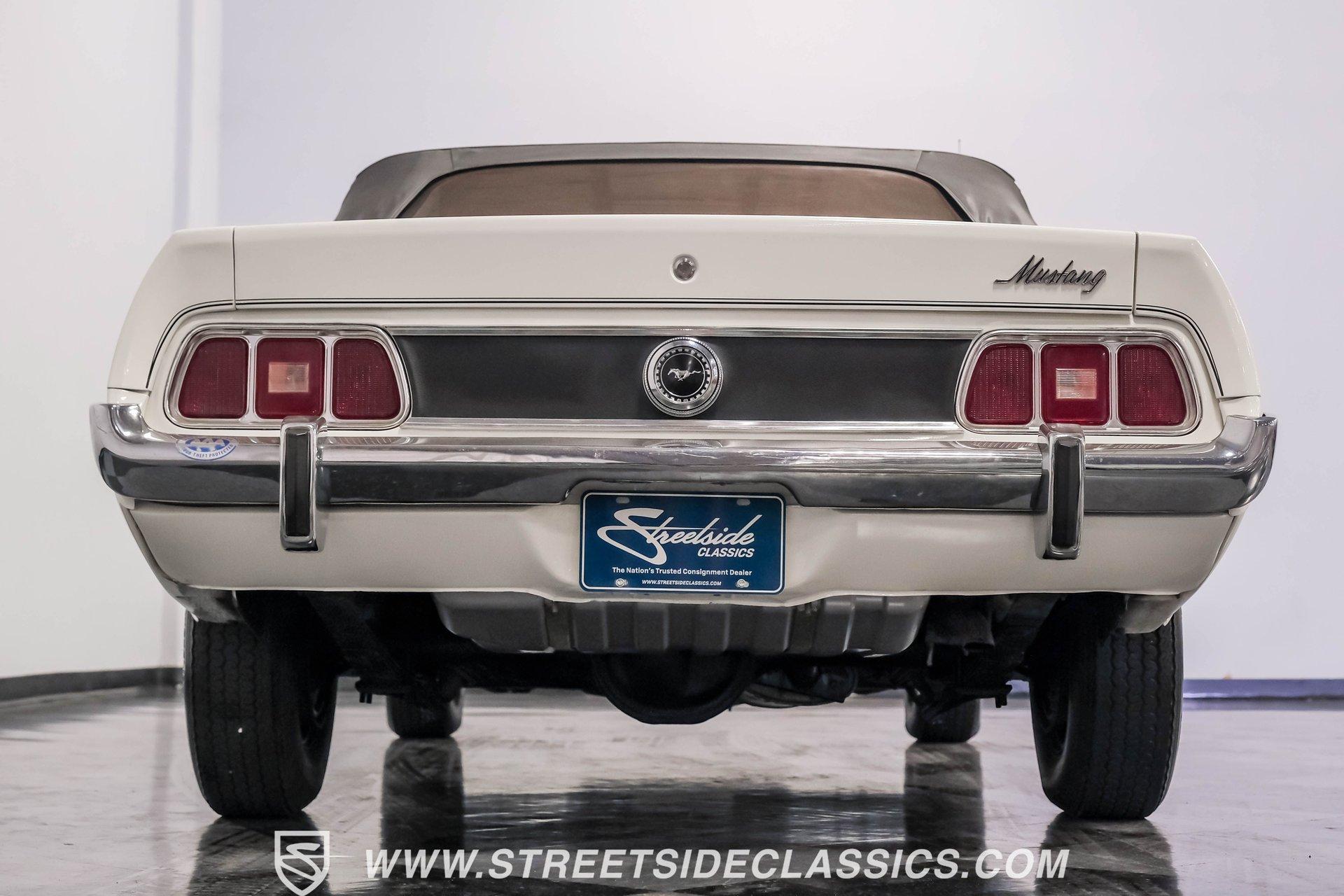 This 1973 Ford Mustang Convertible marks the final year of the first-generation pony car. The white exterior paired with black pinstriping creates a bold visual impact, amplified by its factory-correct black vinyl convertible top with clear plastic rear window. The classic styling cues include the distinctive front grille and refined tail section. Rolling on 14-inch factory wheels wrapped in Michelin 195-14 tires, this convertible exhibits Ford's premium approach to the final year of production. The black vinyl interior delivers classic muscle car style with bucket seats divided by a center console. The floor-mounted shifter adds a sporty touch while air conditioning and power steering provide driving comfort. The factory AM/FM radio supplies the soundtrack, while the power convertible top mechanism offers open-air convenience. Custom floor mats protect the newer black carpeting, completing the well-appointed cabin. The muscular 351 Cleveland V8 cranks out plenty of Detroit muscle through the FMX 3-speed automatic transmission. Enhanced control comes from the power front disc brake setup, while the aftermarket muffler adds a deep exhaust note. The engineering team at Ford dialed in the handling with a performance-minded suspension - coil springs and sway bar up front working in concert with the beefy 9-inch rear axle and leaf springs out back. HIGHLIGHTS: 351 Cleveland V8 Engine FMX 3-Speed Automatic Transmission Power Front Disc Brakes 9-inch Rear Axle White Paint with Black Pinstriping Black Convertible Top 14-inch Factory Wheels in Michelin 195-14 Tires Power Convertible Top Black Vinyl Interior Bucket Seats w/ Center Console Floor-Mounted Shifter Power Steering Air Conditioning Factory AM/FM Radio Maintenance Records Service Documentation This 1973 Ford Mustang Convertible showcases the refined evolution of the first-generation platform, featuring a 351 Cleveland V8, power accessories, and classic white-over-black color combination. Call today!