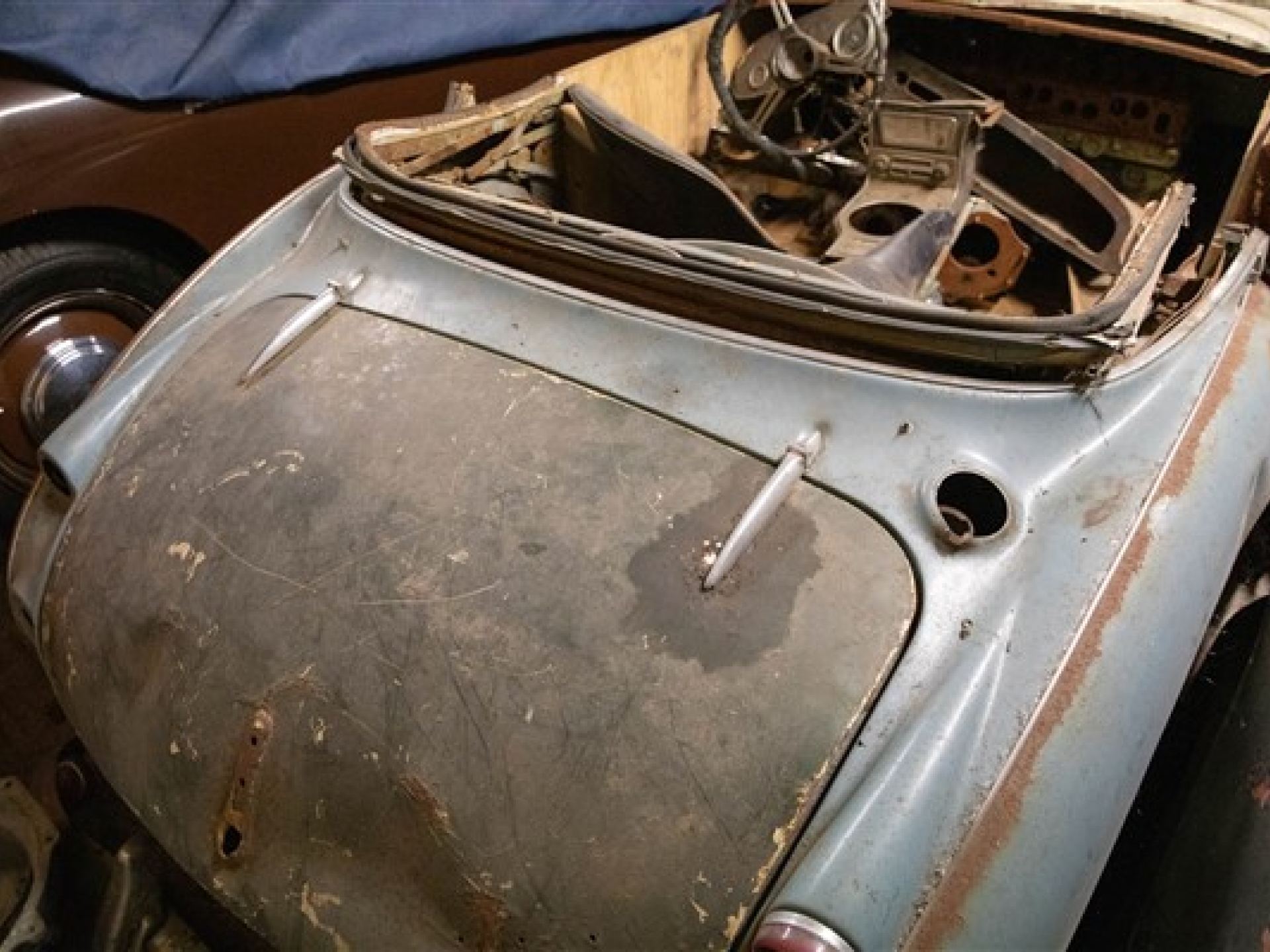 The car is provided with engine, gearbox, rear axle, front and rear shrouds but will need significant rust repair to the structure and panels. The front shroud will need major repair but some panels have been supplied with the car. The dash and instrumentation is provided as is the hood frame and many other good parts.
