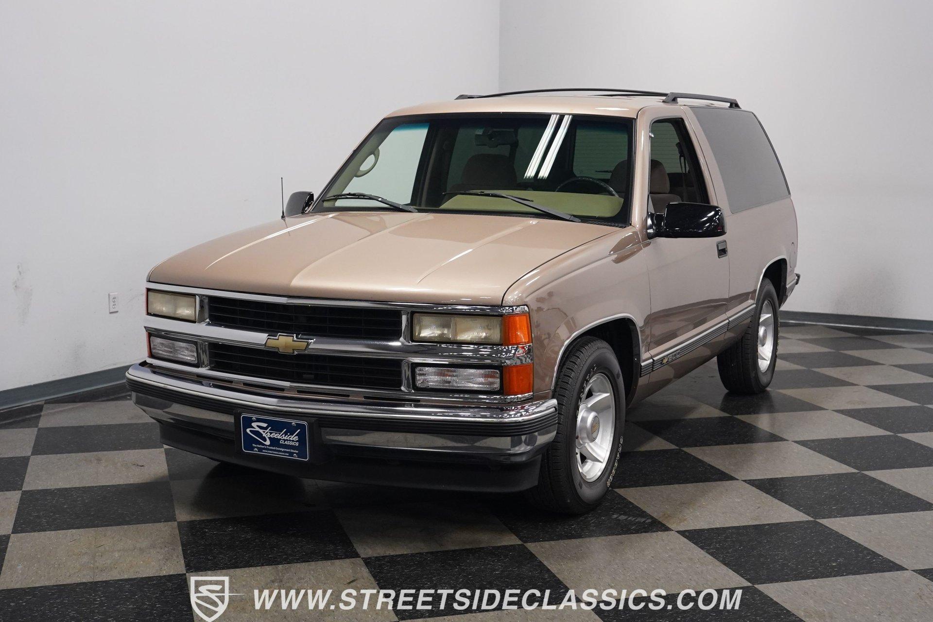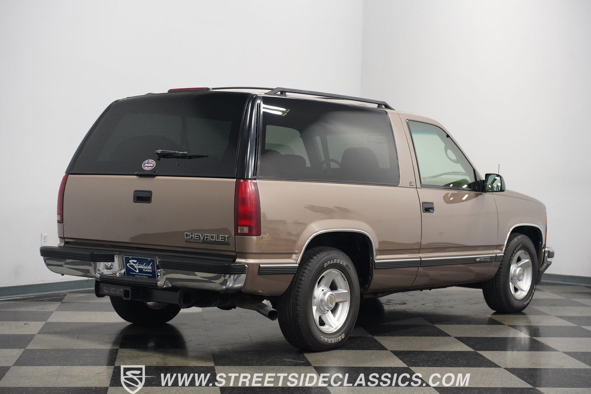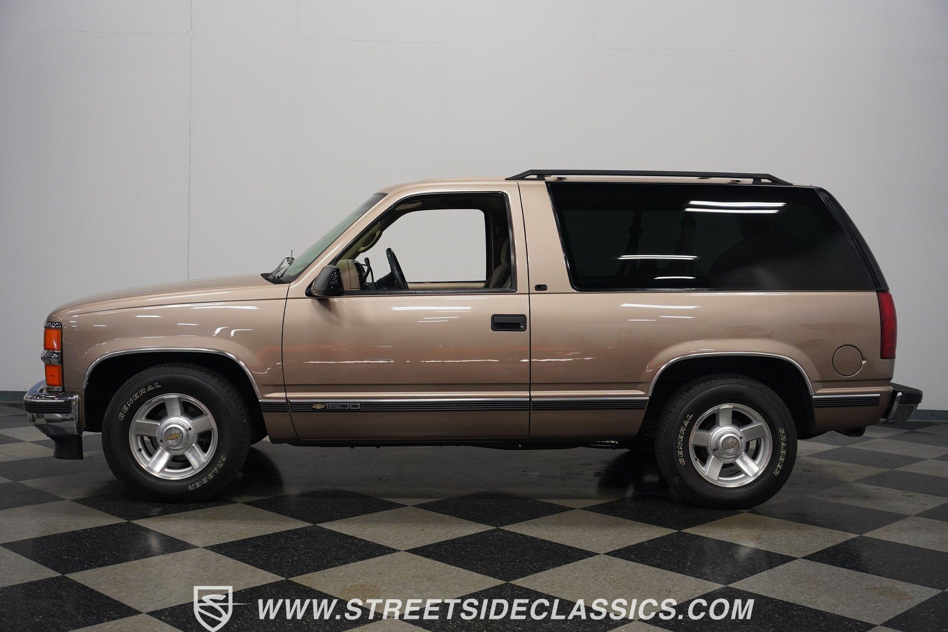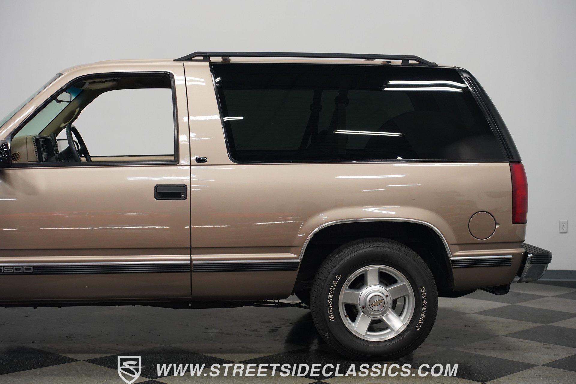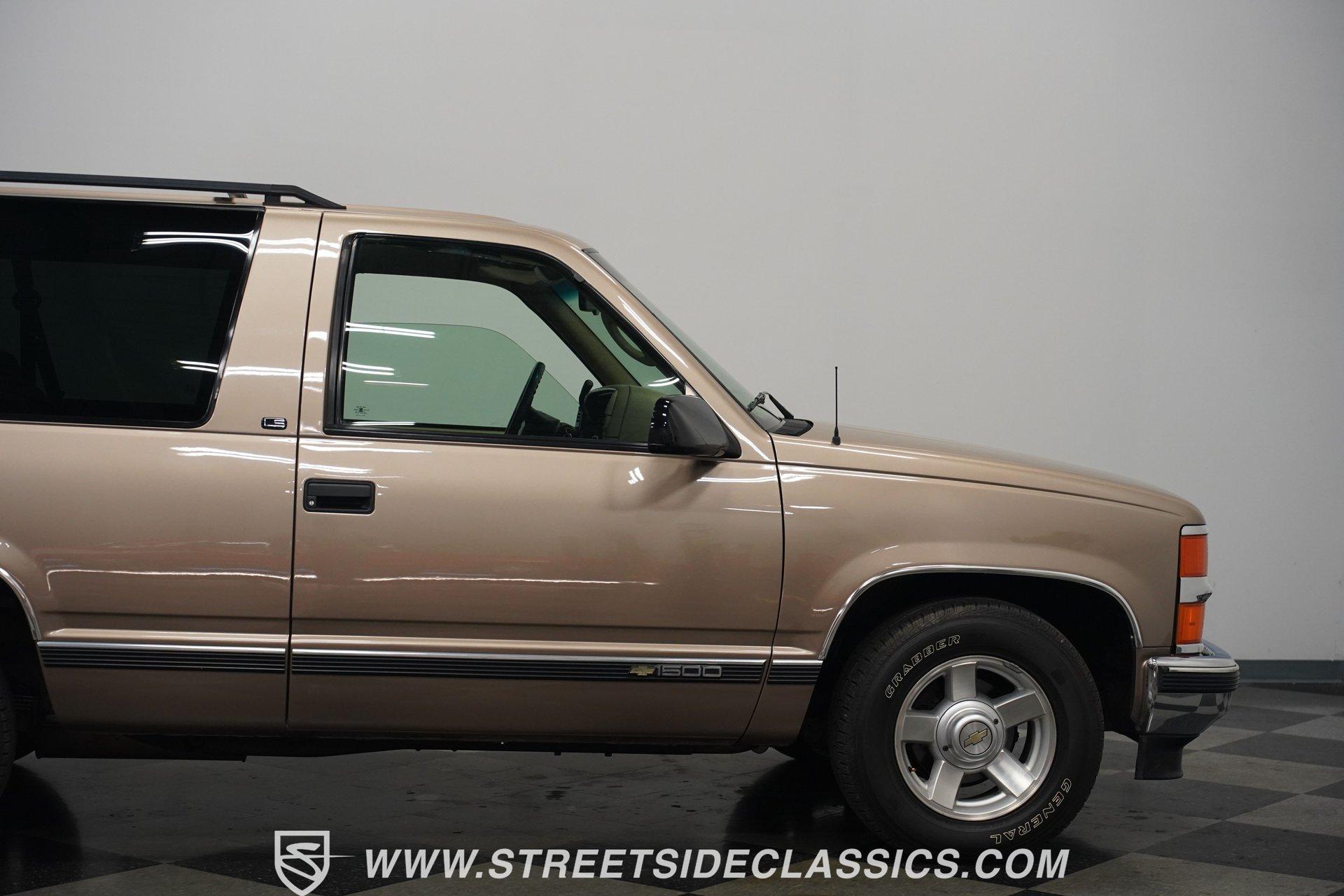 The two-door configuration of this 1996 Chevrolet Tahoe makes it an exclusive find, designed for those who value both style and capability. The Light Autumnwood Metallic finish amplifies its bold presence, achieved through a complete professional respray. The elevated stance, supported by 16-inch alloy wheels and 235/70R16 tires, gives this SUV its trail-ready posture. The clean lines of the two-door body style create an athletic profile that's perfect for both city streets and backroad adventures. The neutral cloth interior welcomes occupants with supportive bucket seats that offer excellent visibility of the terrain ahead. The thoughtfully laid out cockpit places every control within easy reach, from the column shifter to the tilt steering wheel. Power windows and locks add convenience, while the AM/FM cassette player provides the soundtrack for your next expedition. The center console offers additional storage for essential gear. The 5.7-liter V8 engine delivers power through the responsive 4L60E 4-speed automatic transmission. The combination of power steering and front disc brakes translates to precise control on any surface. The factory-style dual-to-single exhaust system provides the right note for this capable machine. Coil springs with shocks up front and leaf springs in the rear maintain stability, while the 3.42 rear axle ratio balances performance and efficiency. HIGHLIGHTS: 5.7 Liter V8 Engine 4L60E 4-Speed Automatic Transmission Electronic Fuel Injection Power Steering Front Disc Brakes 3.42 Rear Axle Ratio Coil Spring Front Suspension Leaf Spring Rear Suspension Dual to Single Exhaust Light Autumnwood Metallic Paint 16-inch Alloy Wheels in 235/70R16 Tires Full Professional Respray Neutral Interior with Bucket Seats Column Shift Power Windows Power Locks Tilt Steering Wheel Center Console AM/FM Cassette Player Owner's Manual This 1996 Chevrolet Tahoe two-door combines V8 power, impressive capability, and comfort into one versatile package. Perfect for both daily driving and weekend exploration, this SUV delivers exactly what you need. Call today!