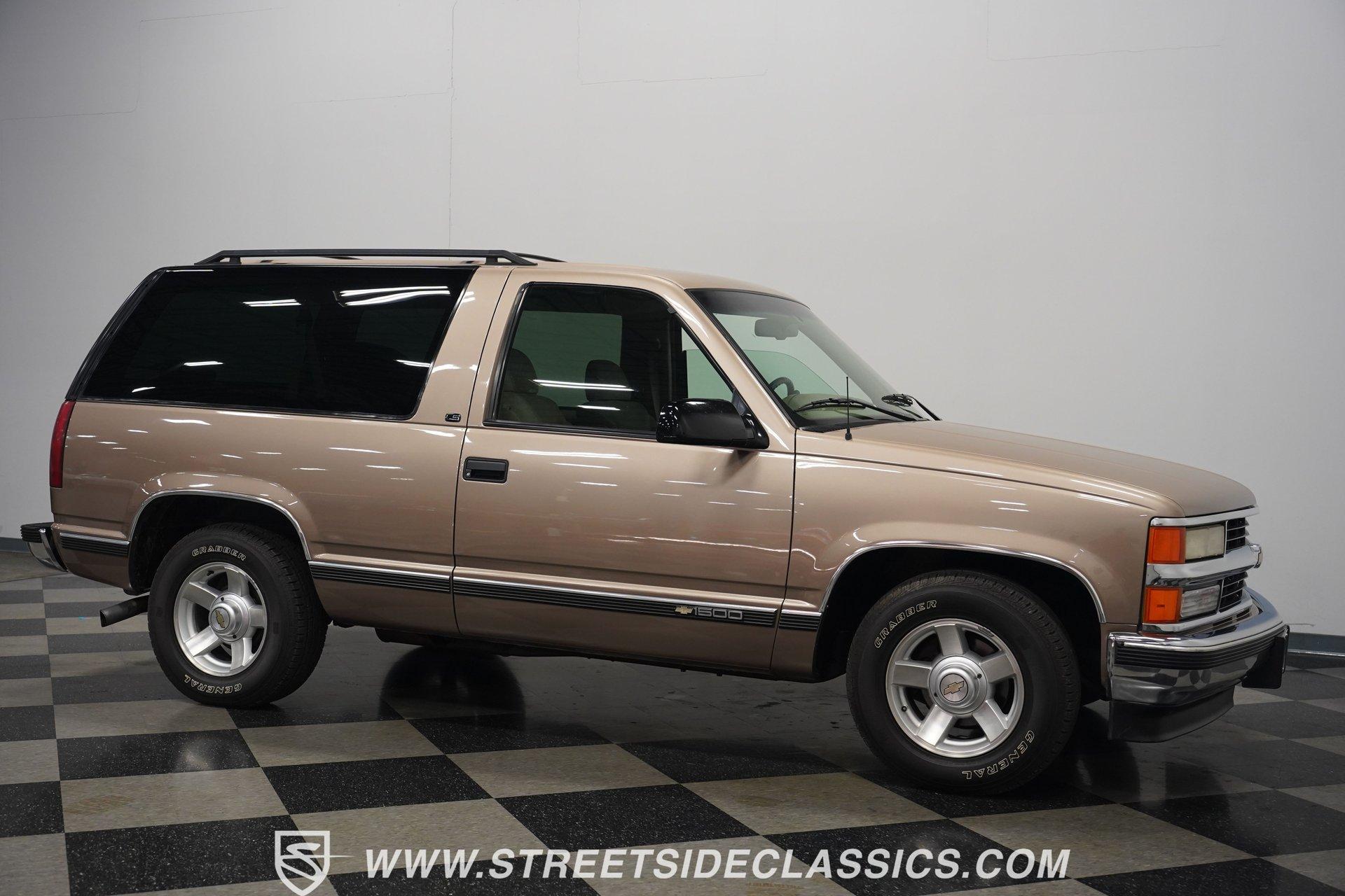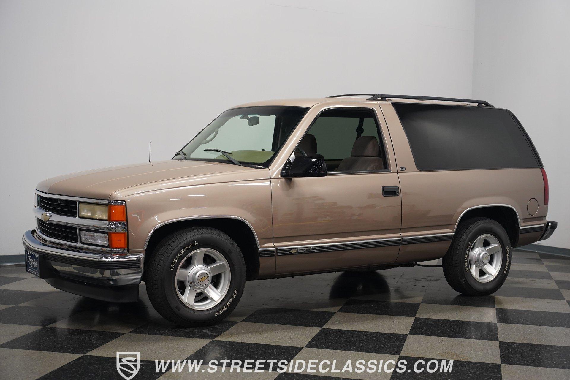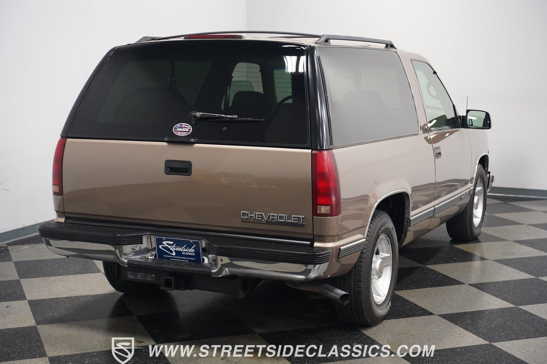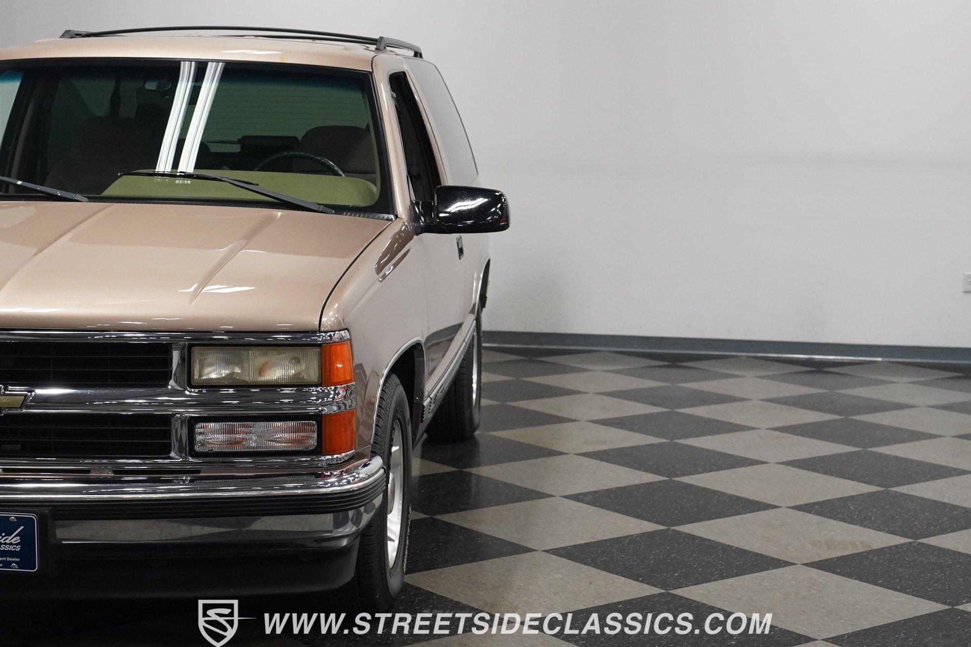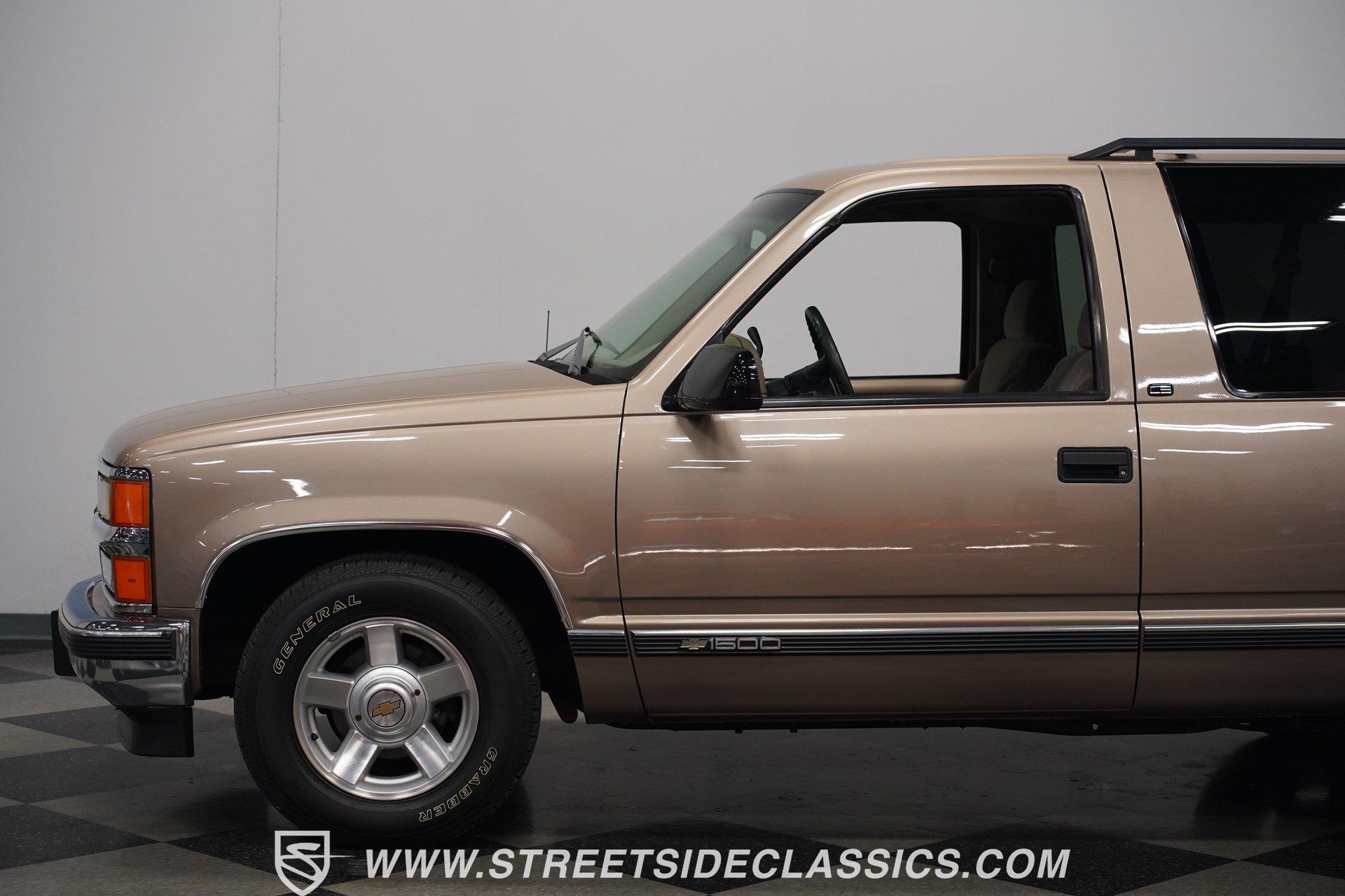 The two-door configuration of this 1996 Chevrolet Tahoe makes it an exclusive find, designed for those who value both style and capability. The Light Autumnwood Metallic finish amplifies its bold presence, achieved through a complete professional respray. The elevated stance, supported by 16-inch alloy wheels and 235/70R16 tires, gives this SUV its trail-ready posture. The clean lines of the two-door body style create an athletic profile that's perfect for both city streets and backroad adventures. The neutral cloth interior welcomes occupants with supportive bucket seats that offer excellent visibility of the terrain ahead. The thoughtfully laid out cockpit places every control within easy reach, from the column shifter to the tilt steering wheel. Power windows and locks add convenience, while the AM/FM cassette player provides the soundtrack for your next expedition. The center console offers additional storage for essential gear. The 5.7-liter V8 engine delivers power through the responsive 4L60E 4-speed automatic transmission. The combination of power steering and front disc brakes translates to precise control on any surface. The factory-style dual-to-single exhaust system provides the right note for this capable machine. Coil springs with shocks up front and leaf springs in the rear maintain stability, while the 3.42 rear axle ratio balances performance and efficiency. HIGHLIGHTS: 5.7 Liter V8 Engine 4L60E 4-Speed Automatic Transmission Electronic Fuel Injection Power Steering Front Disc Brakes 3.42 Rear Axle Ratio Coil Spring Front Suspension Leaf Spring Rear Suspension Dual to Single Exhaust Light Autumnwood Metallic Paint 16-inch Alloy Wheels in 235/70R16 Tires Full Professional Respray Neutral Interior with Bucket Seats Column Shift Power Windows Power Locks Tilt Steering Wheel Center Console AM/FM Cassette Player Owner's Manual This 1996 Chevrolet Tahoe two-door combines V8 power, impressive capability, and comfort into one versatile package. Perfect for both daily driving and weekend exploration, this SUV delivers exactly what you need. Call today!