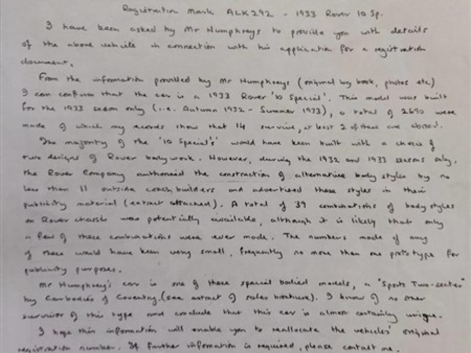 A Rare opportunity to buy one of only a handful of Rover 10 Specials. Registered in 1933 ALK292 the car was built by Carbodies of Coventry and described as a Sports 2 seater with single dicky seat with the rear of the car boat shaped. The car was taken off the road and professionally restored between 1990 /1992. According to the Rover Register it would seem that this is the only survivor making it somewhat unique. Now in need of some TLC the car is being offered up for sale. If you would like to view the car and make an offer please call Gasoline Alley Ltd and organize an appointment.