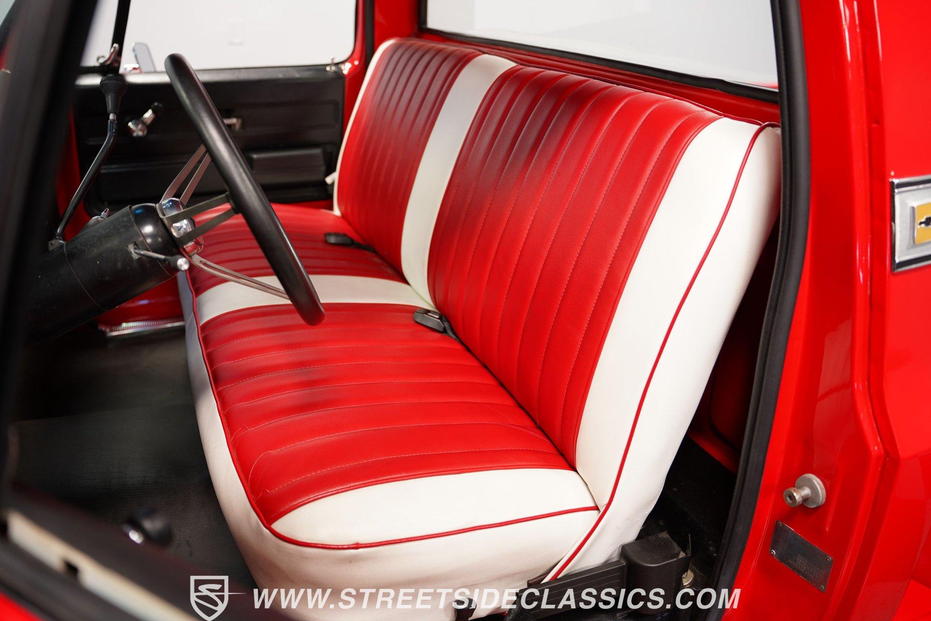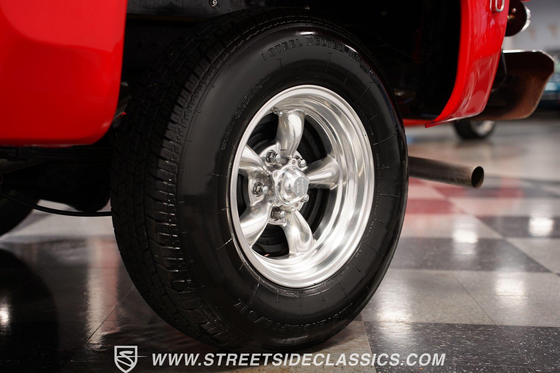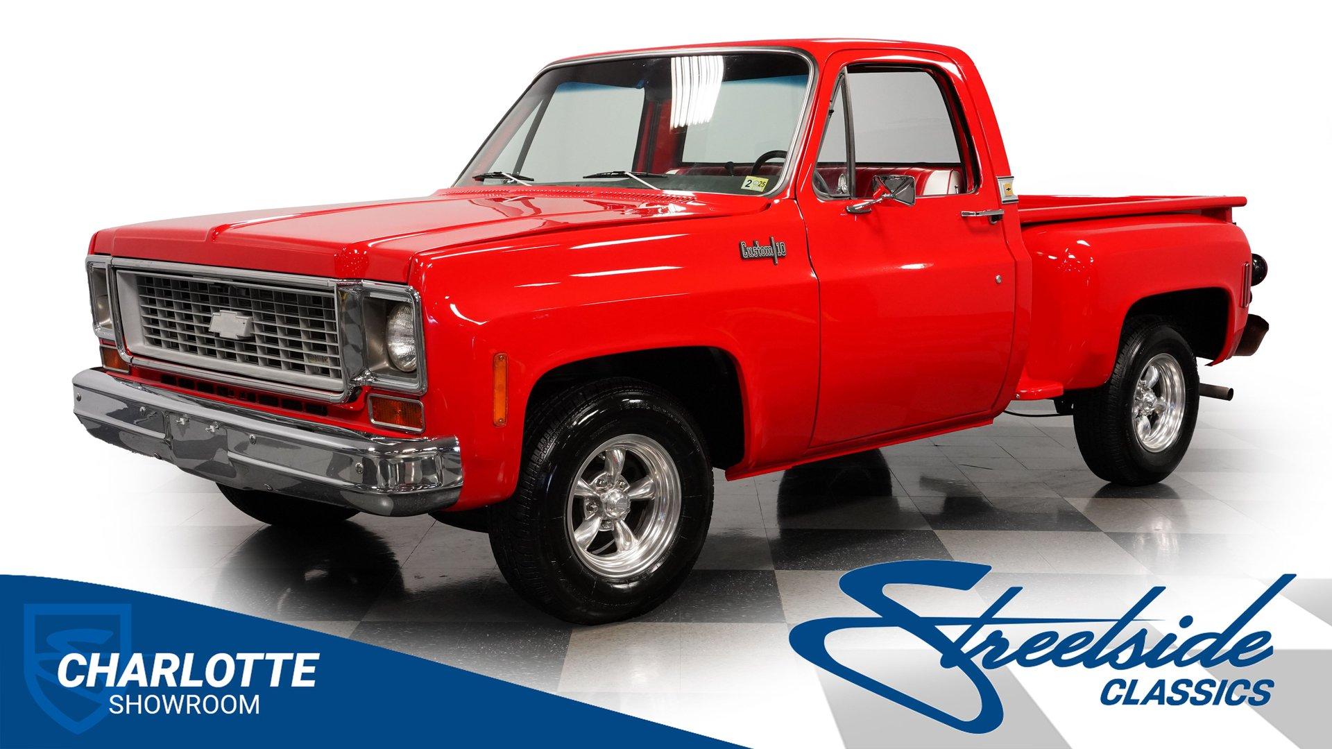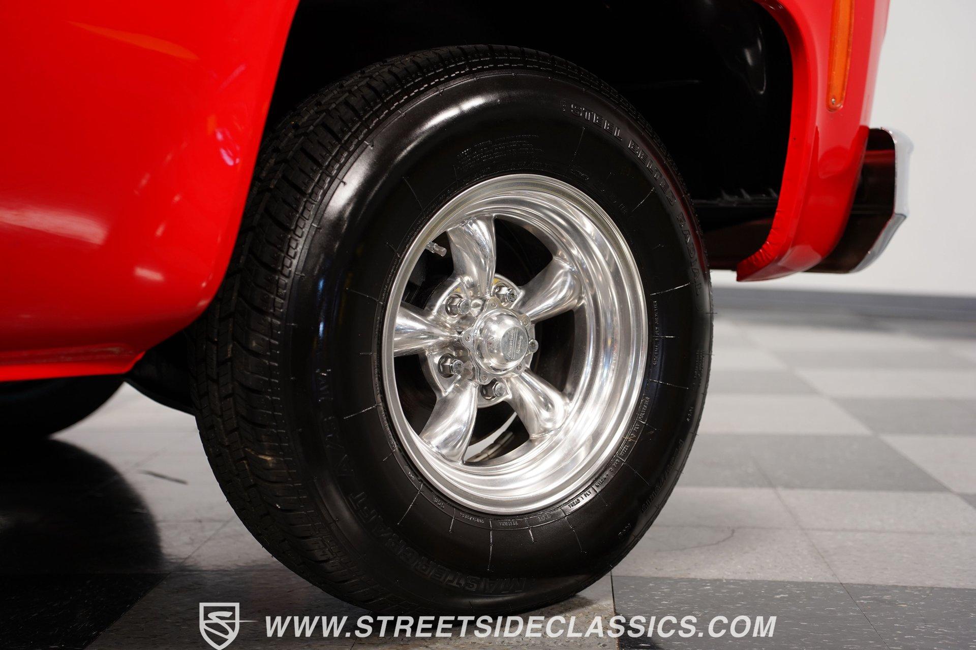This 1973 Chevrolet C10 rolls with bold red paint and style, marking the first year of the iconic "Squarebody" design. The custom wood bed adds a rugged yet refined element, while 15-inch American Racing wheels fill the wheel wells with authority. The clean lines are amplified by long tube headers extending through the sides, accompanied by 235/75R15 tires on all four corners. The red finish plays well against the chrome bumpers and trim, creating a classic pickup aesthetic. The red and white vinyl interior brings the cabin a clean, two-tone look. A bench seat provides ample room, while the column shifter keeps the floor clear. The dash features original gauges beneath a newer dash pad, complemented by factory heat controls and an AM radio. Power steering makes maneuvering effortless, while rubber floor mats protect the cabin's foundation. A 350 V8 engine, bored .030 over, teams with a TH350 automatic transmission to deliver impressive performance. The powerplant breathes through an Edelbrock four-barrel carburetor and wears matching valve covers. Long tube headers feed into an aftermarket exhaust system for added output. Power disc brakes up front provide strong stopping capability, while the 12-bolt rear end puts the power down effectively. The suspension utilizes control arms with coil springs up front and traditional leaf springs in the rear. HIGHLIGHTS: 350 V8 (.bored .030) TH350 Automatic Transmission Edelbrock 4-Barrel Carburetor Long Tube Headers and aftermarket exhaust 12-Bolt Rear End Power Disc Brakes 15" American Racing Wheels in 235/75R15 Tires Custom Wood Bed Power Steering AM Radio New Dash Pad This 1973 Chevrolet C10 combines classic truck capability with the power of a 350 V8. The red paint, custom wood bed, and American Racing wheels create a strong street presence. Get behind the wheel of this first-year Squarebody. Call today!