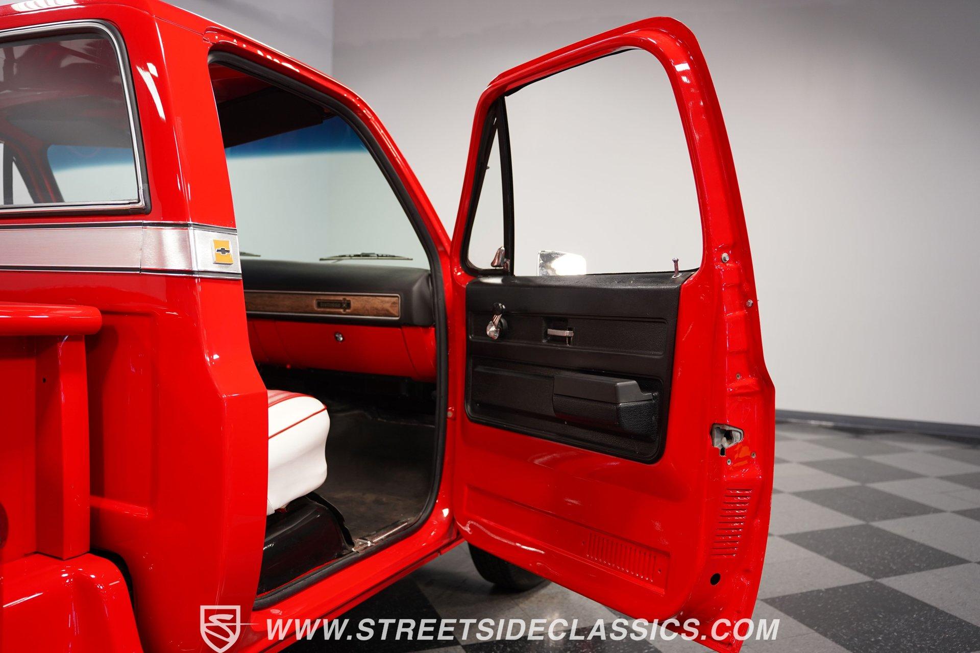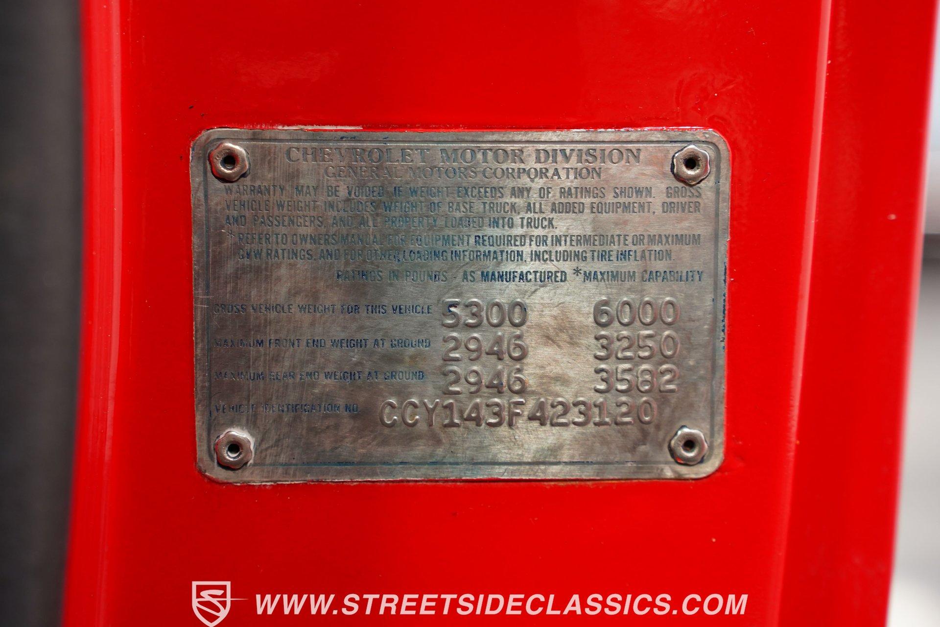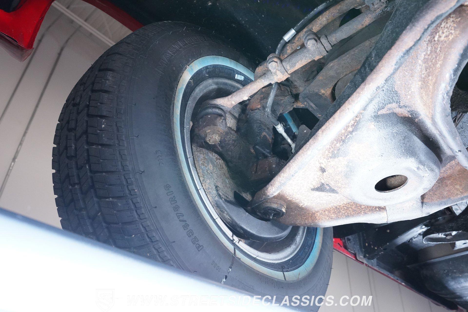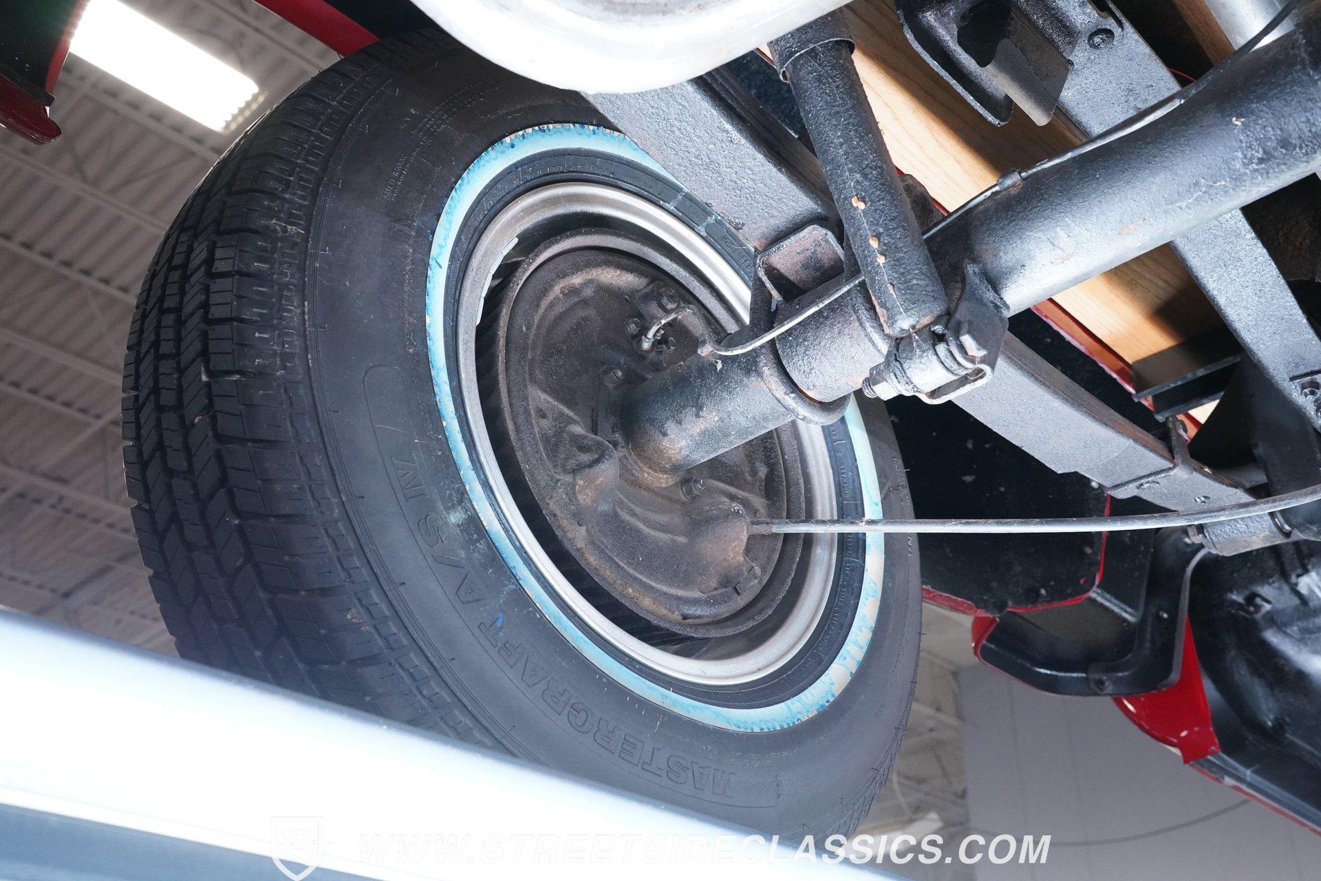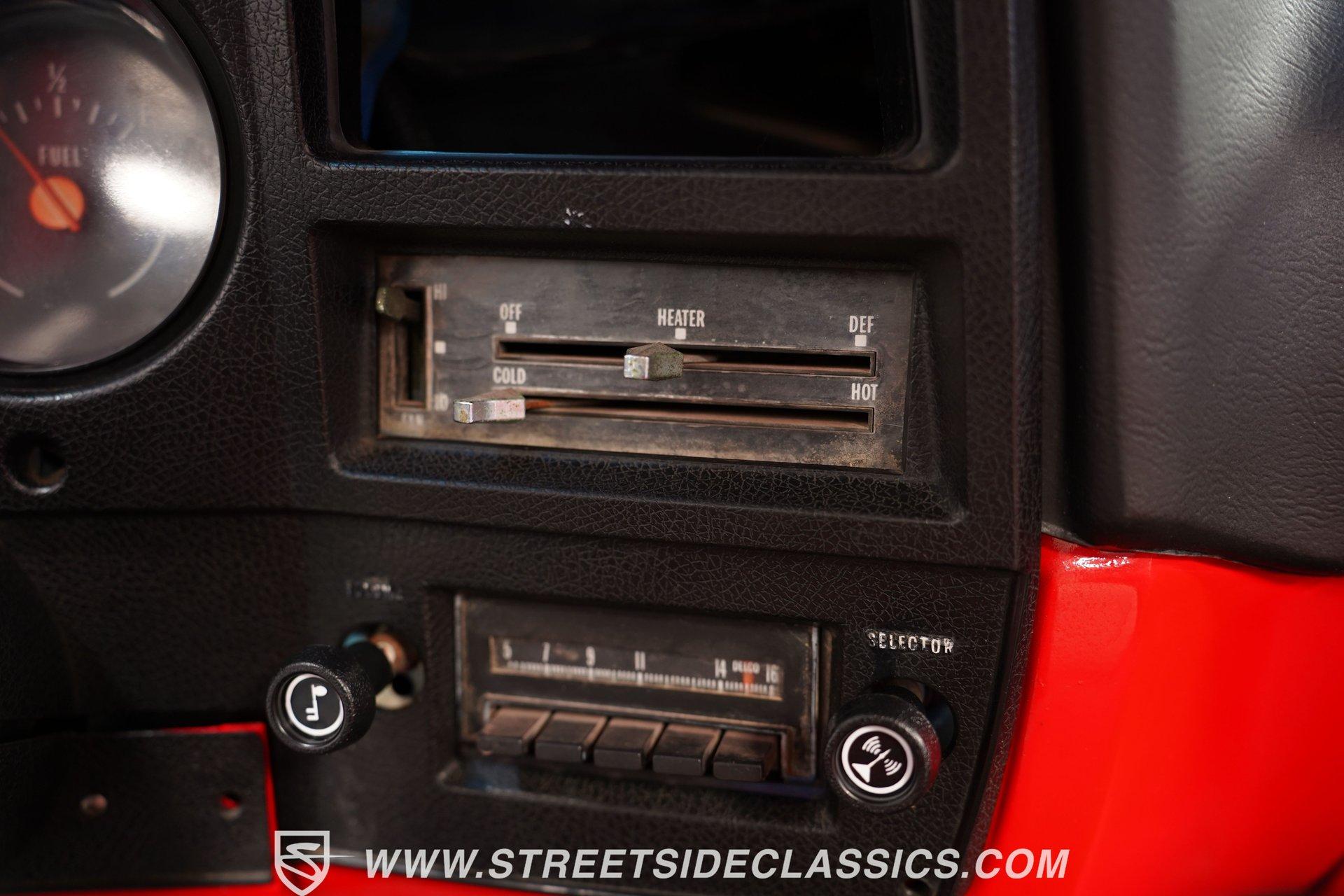 This 1973 Chevrolet C10 rolls with bold red paint and style, marking the first year of the iconic "Squarebody" design. The custom wood bed adds a rugged yet refined element, while 15-inch American Racing wheels fill the wheel wells with authority. The clean lines are amplified by long tube headers extending through the sides, accompanied by 235/75R15 tires on all four corners. The red finish plays well against the chrome bumpers and trim, creating a classic pickup aesthetic. The red and white vinyl interior brings the cabin a clean, two-tone look. A bench seat provides ample room, while the column shifter keeps the floor clear. The dash features original gauges beneath a newer dash pad, complemented by factory heat controls and an AM radio. Power steering makes maneuvering effortless, while rubber floor mats protect the cabin's foundation. A 350 V8 engine, bored .030 over, teams with a TH350 automatic transmission to deliver impressive performance. The powerplant breathes through an Edelbrock four-barrel carburetor and wears matching valve covers. Long tube headers feed into an aftermarket exhaust system for added output. Power disc brakes up front provide strong stopping capability, while the 12-bolt rear end puts the power down effectively. The suspension utilizes control arms with coil springs up front and traditional leaf springs in the rear. HIGHLIGHTS: 350 V8 (.bored .030) TH350 Automatic Transmission Edelbrock 4-Barrel Carburetor Long Tube Headers and aftermarket exhaust 12-Bolt Rear End Power Disc Brakes 15" American Racing Wheels in 235/75R15 Tires Custom Wood Bed Power Steering AM Radio New Dash Pad This 1973 Chevrolet C10 combines classic truck capability with the power of a 350 V8. The red paint, custom wood bed, and American Racing wheels create a strong street presence. Get behind the wheel of this first-year Squarebody. Call today!