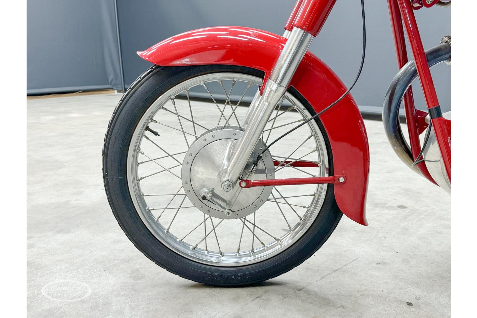 The motorcycle is in remarkable condition, with a beautiful paint finish and well-preserved chrome details. The craftsmanship put into Italian motorcycles at the time is evident here. The bike is a joy to look at and still shows the charm that made this model so popular in the 1950s.
