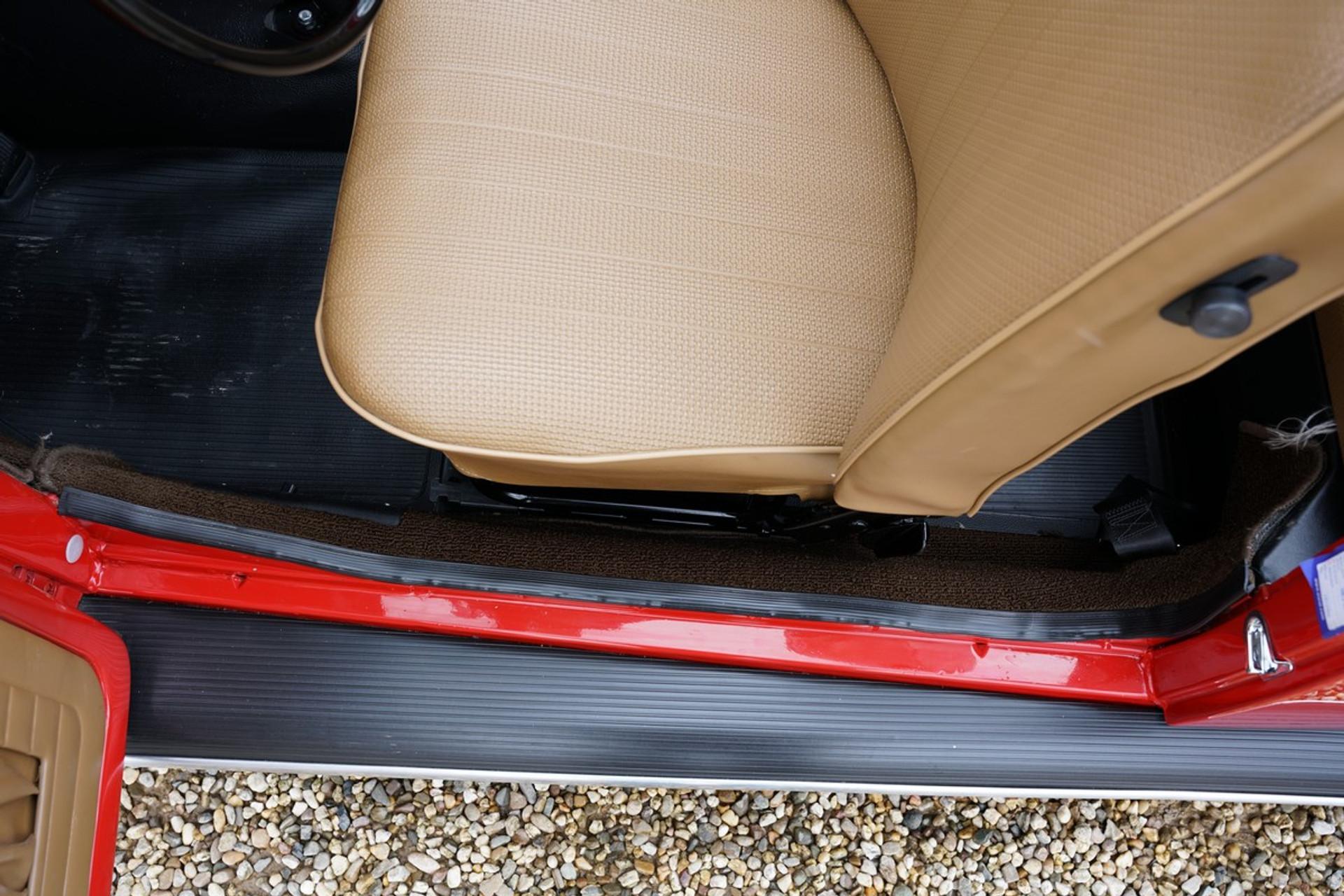 the original rims shod in correctly sized tyres. A new brown coloured hood was fitted as part of the restoration. The neatly fitting hood is in good shape. The VW was also given new brightwork, new lights, doorhandles as well as new rubber on the foot boards.