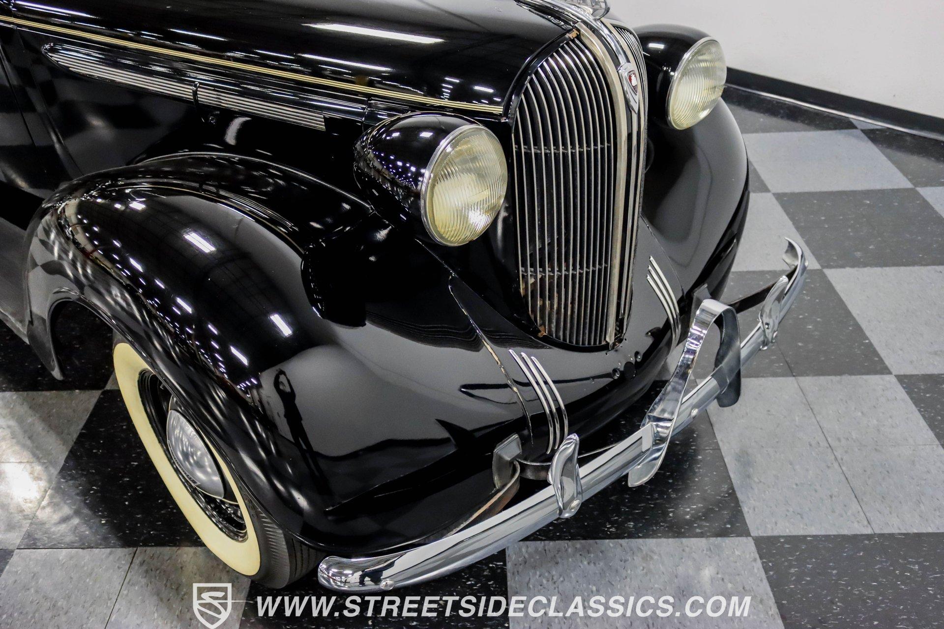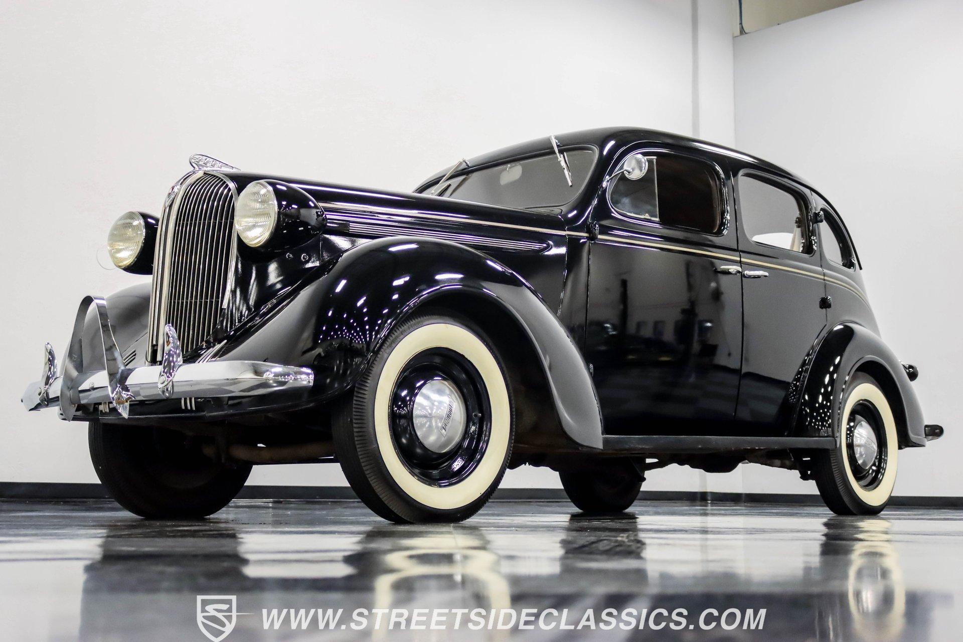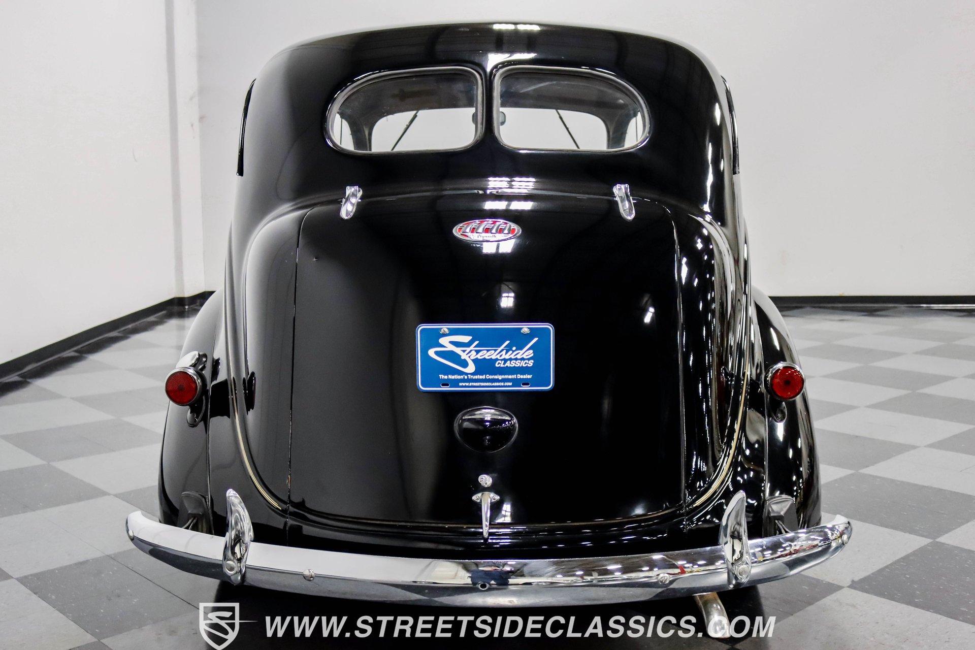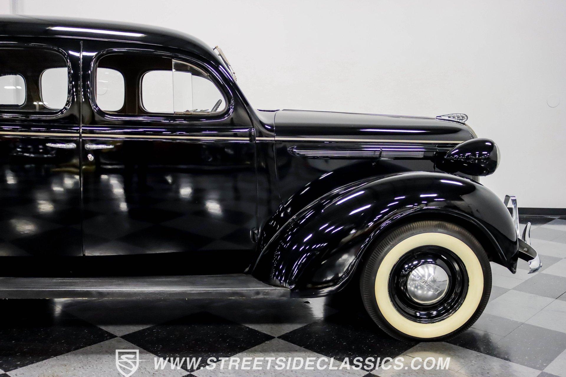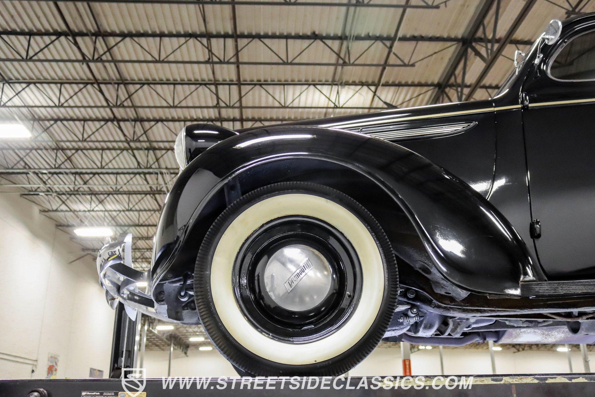 This 1938 Plymouth Deluxe spent 32 years preserved in a South Texas private museum collection until 2023. A survivor with an older repaint, the black exterior still makes quite a bold impression, accented by wide whitewall 6.00-16 Coker Classic tires mounted on 16-inch steel wheels with chrome hubcaps. The painted pinstripes add a custom touch to the classic body lines, while the chrome trim and bumpers display their luster against the dark paint. A tan mohair interior creates a refined atmosphere throughout the cabin. Original factory controls and gauges outfit the dash, while the floor-mounted shifter gives easy access to gear changes. The bench seats offer plenty of room, and back seat passengers get added security with seatbelts. An original heater box completes the authentic pre-war cabin layout. The 201 cubic inch inline-six cylinder engine runs through a 3-speed manual transmission, with a Carter carburetor still displaying its original "Mfr for Chrysler Corp" markings. The mechanical composition stays true with factory manifolds and a single exhaust system featuring a factory-style replacement muffler. Leaf springs with shocks and a sway bar up front work with the solid rear axle and leaf spring setup for proper handling. HIGHLIGHTS: 201 CI Inline 6 Cylinder Engine 3 Speed Manual Transmission Carter Single Barrel Carburetor Factory Manifolds Factory Style Replacement Muffler Black Paint w/ Painted Pinstripes Chrome Trim and Bumpers 16-inch Steel Wheels with Chrome Hubcaps 6.00-16 Coker Classic Wide Whitewall Tires Tan Mohair Interior with Bench Seats Factory Controls and Gauges Original Heater Box Shop Manual This 1938 Plymouth Deluxe 4 Door Sedan combines classic pre-war styling, a proven inline-six engine, and authentic details preserved through decades of museum care. Call today!