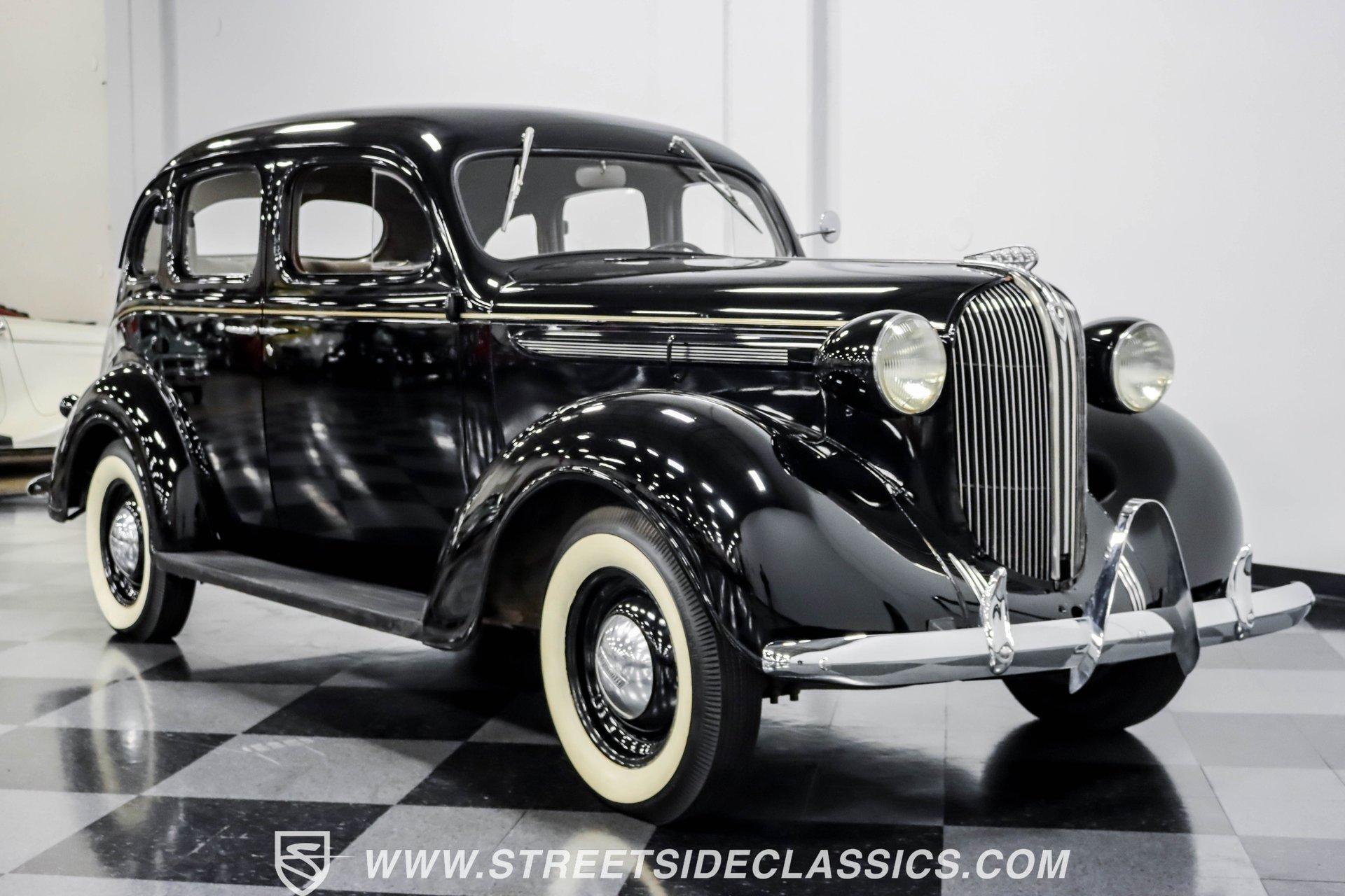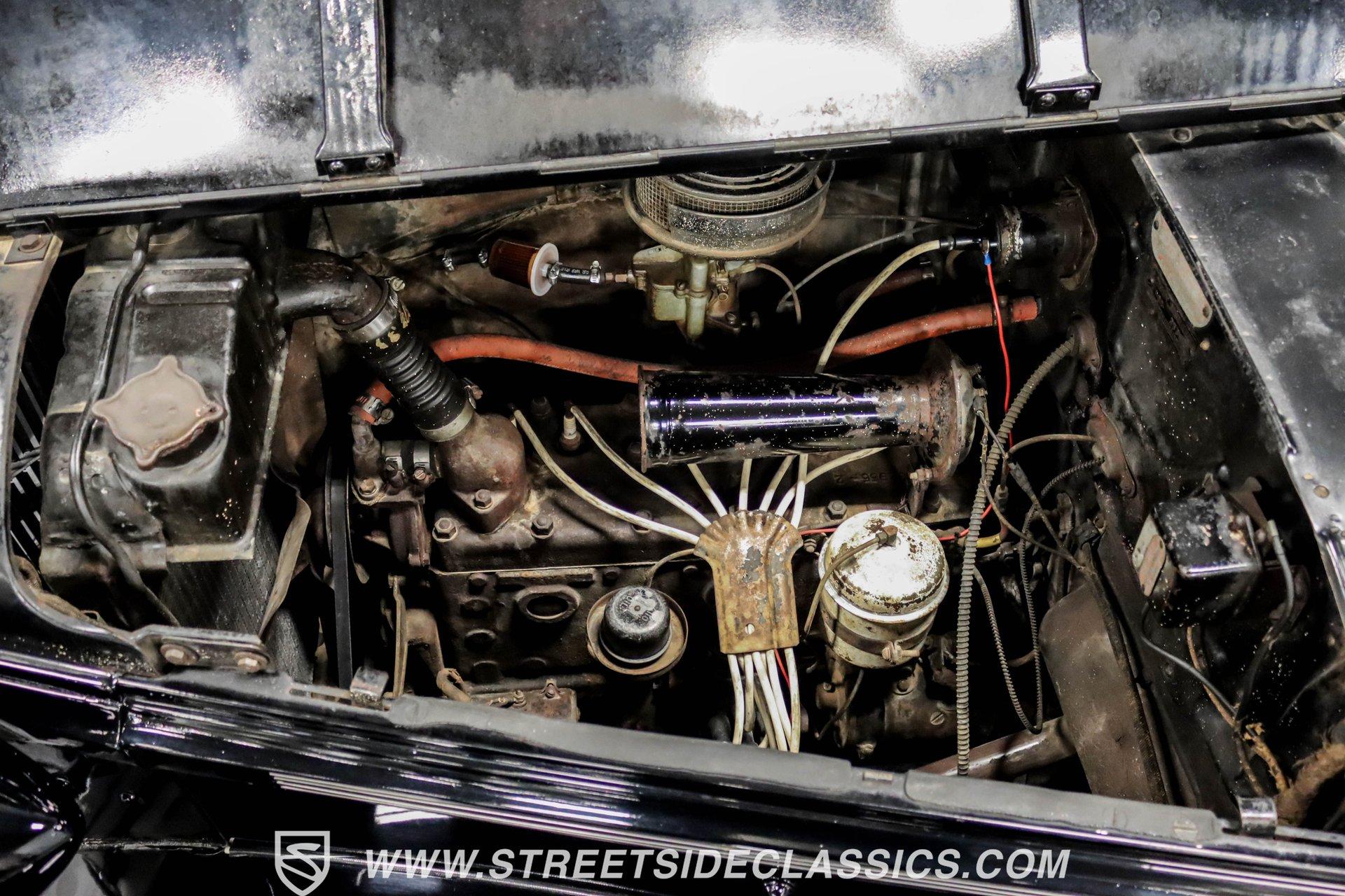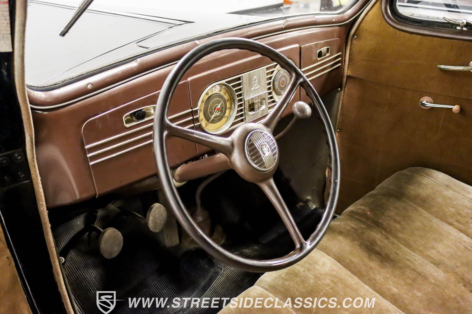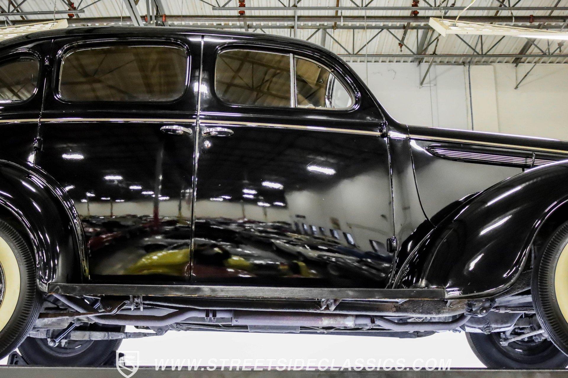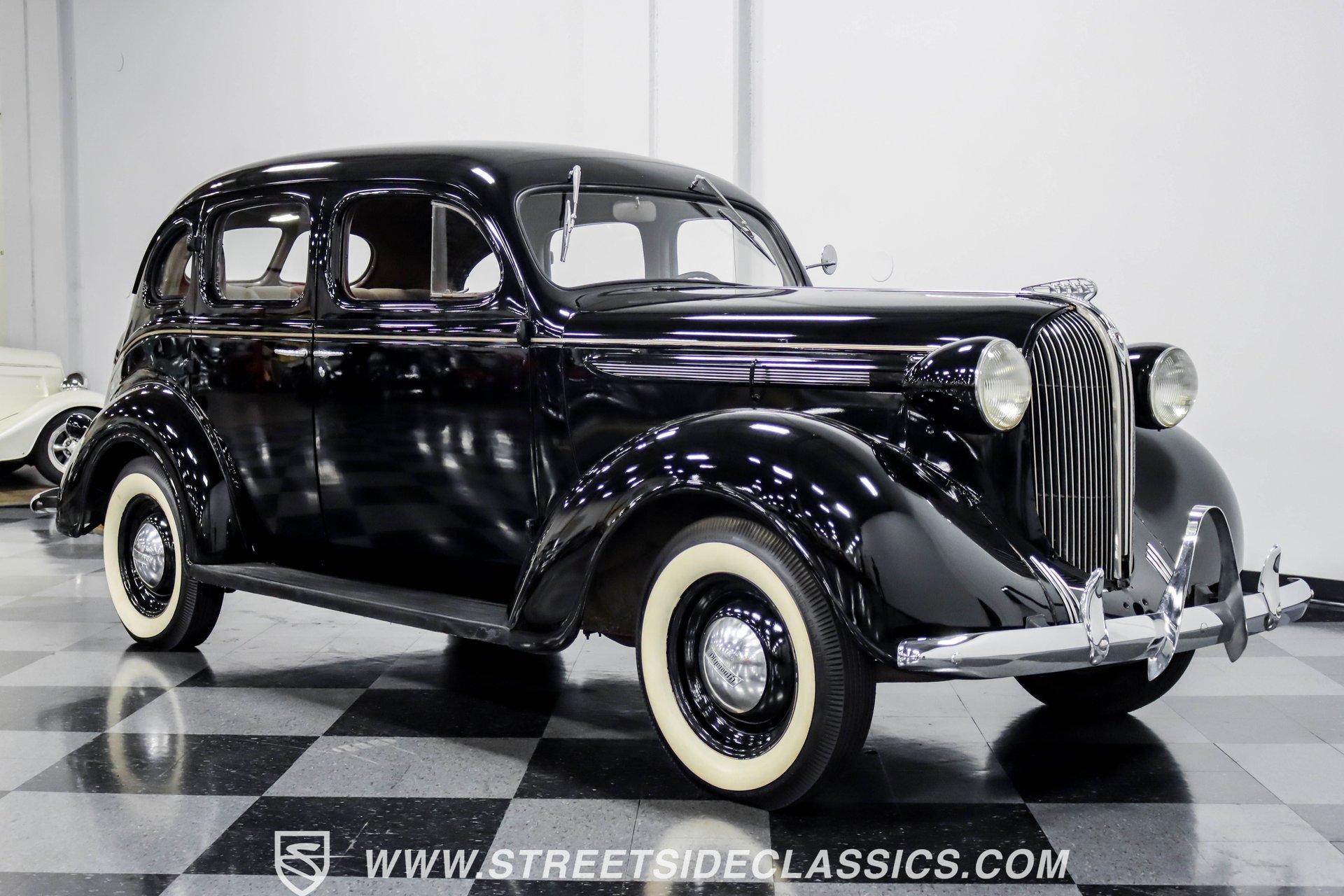 This 1938 Plymouth Deluxe spent 32 years preserved in a South Texas private museum collection until 2023. A survivor with an older repaint, the black exterior still makes quite a bold impression, accented by wide whitewall 6.00-16 Coker Classic tires mounted on 16-inch steel wheels with chrome hubcaps. The painted pinstripes add a custom touch to the classic body lines, while the chrome trim and bumpers display their luster against the dark paint. A tan mohair interior creates a refined atmosphere throughout the cabin. Original factory controls and gauges outfit the dash, while the floor-mounted shifter gives easy access to gear changes. The bench seats offer plenty of room, and back seat passengers get added security with seatbelts. An original heater box completes the authentic pre-war cabin layout. The 201 cubic inch inline-six cylinder engine runs through a 3-speed manual transmission, with a Carter carburetor still displaying its original "Mfr for Chrysler Corp" markings. The mechanical composition stays true with factory manifolds and a single exhaust system featuring a factory-style replacement muffler. Leaf springs with shocks and a sway bar up front work with the solid rear axle and leaf spring setup for proper handling. HIGHLIGHTS: 201 CI Inline 6 Cylinder Engine 3 Speed Manual Transmission Carter Single Barrel Carburetor Factory Manifolds Factory Style Replacement Muffler Black Paint w/ Painted Pinstripes Chrome Trim and Bumpers 16-inch Steel Wheels with Chrome Hubcaps 6.00-16 Coker Classic Wide Whitewall Tires Tan Mohair Interior with Bench Seats Factory Controls and Gauges Original Heater Box Shop Manual This 1938 Plymouth Deluxe 4 Door Sedan combines classic pre-war styling, a proven inline-six engine, and authentic details preserved through decades of museum care. Call today!