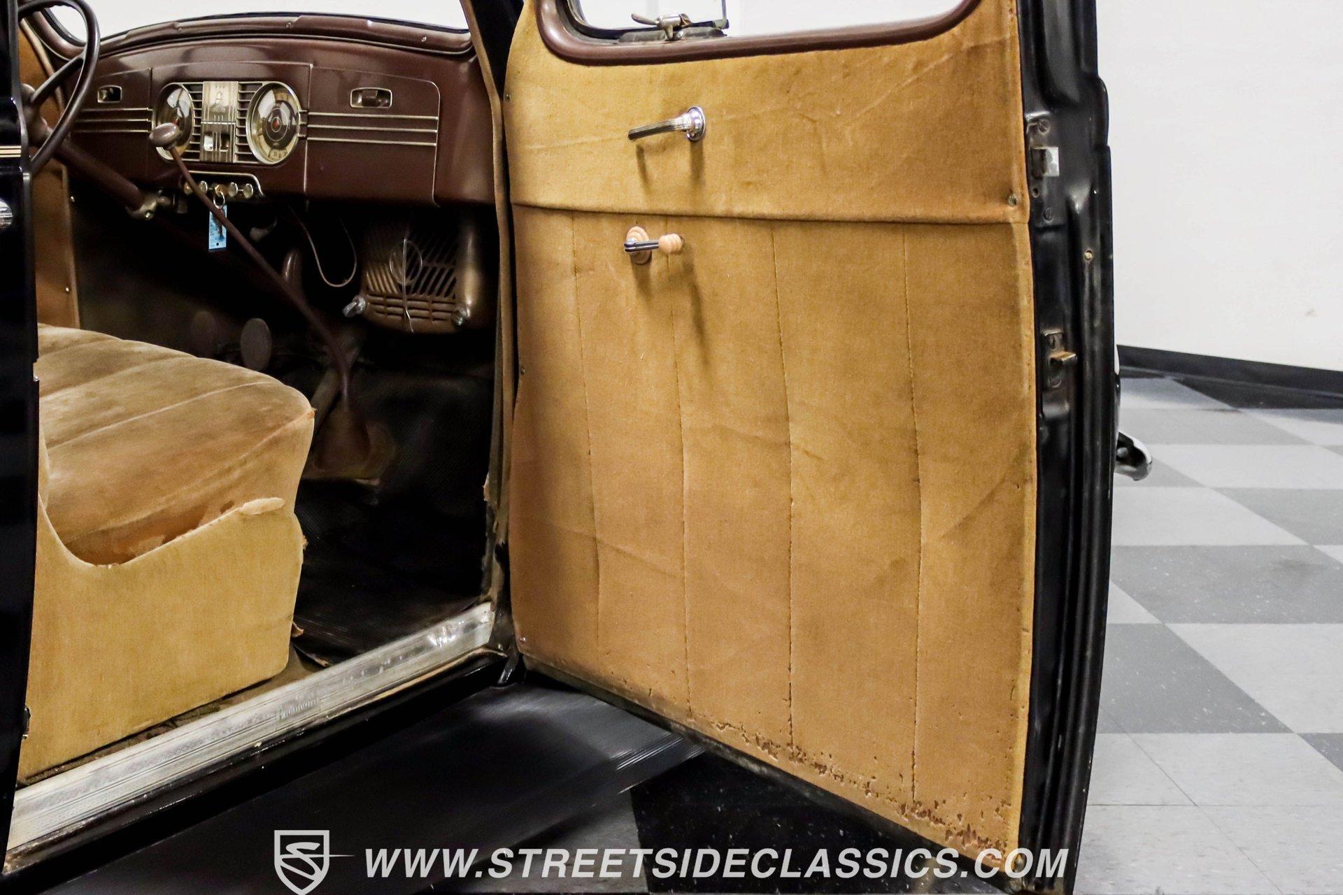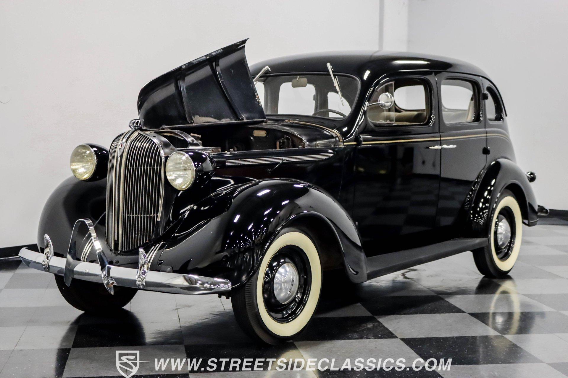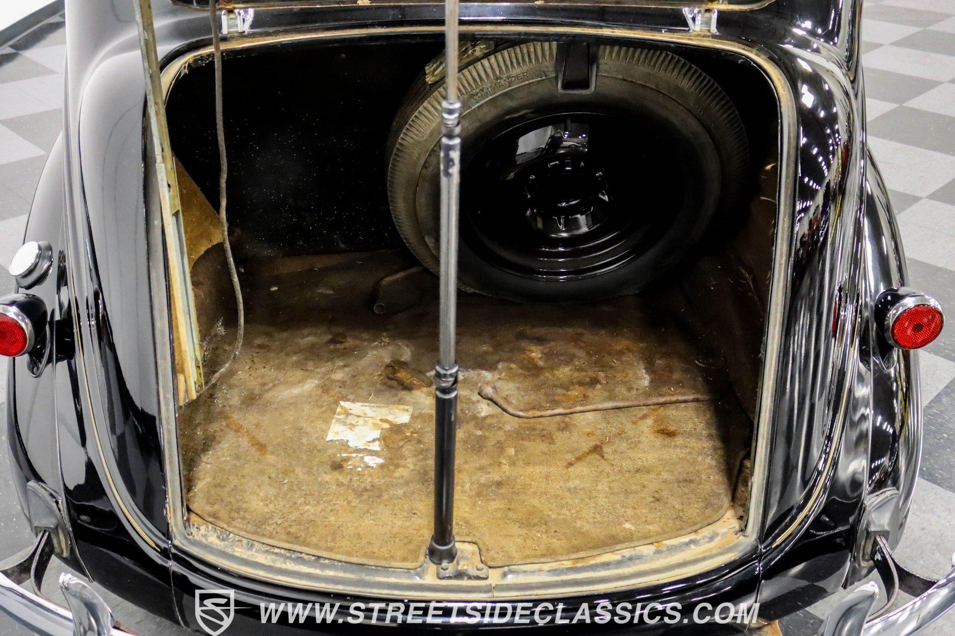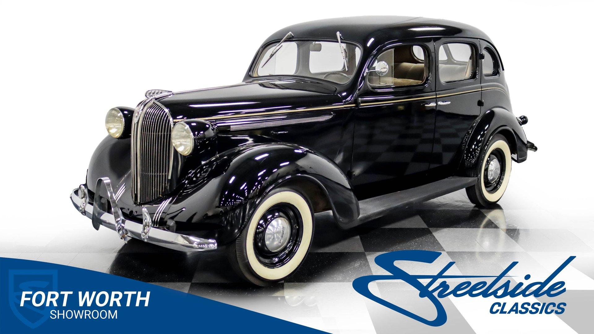 This 1938 Plymouth Deluxe spent 32 years preserved in a South Texas private museum collection until 2023. A survivor with an older repaint, the black exterior still makes quite a bold impression, accented by wide whitewall 6.00-16 Coker Classic tires mounted on 16-inch steel wheels with chrome hubcaps. The painted pinstripes add a custom touch to the classic body lines, while the chrome trim and bumpers display their luster against the dark paint. A tan mohair interior creates a refined atmosphere throughout the cabin. Original factory controls and gauges outfit the dash, while the floor-mounted shifter gives easy access to gear changes. The bench seats offer plenty of room, and back seat passengers get added security with seatbelts. An original heater box completes the authentic pre-war cabin layout. The 201 cubic inch inline-six cylinder engine runs through a 3-speed manual transmission, with a Carter carburetor still displaying its original "Mfr for Chrysler Corp" markings. The mechanical composition stays true with factory manifolds and a single exhaust system featuring a factory-style replacement muffler. Leaf springs with shocks and a sway bar up front work with the solid rear axle and leaf spring setup for proper handling. HIGHLIGHTS: 201 CI Inline 6 Cylinder Engine 3 Speed Manual Transmission Carter Single Barrel Carburetor Factory Manifolds Factory Style Replacement Muffler Black Paint w/ Painted Pinstripes Chrome Trim and Bumpers 16-inch Steel Wheels with Chrome Hubcaps 6.00-16 Coker Classic Wide Whitewall Tires Tan Mohair Interior with Bench Seats Factory Controls and Gauges Original Heater Box Shop Manual This 1938 Plymouth Deluxe 4 Door Sedan combines classic pre-war styling, a proven inline-six engine, and authentic details preserved through decades of museum care. Call today!