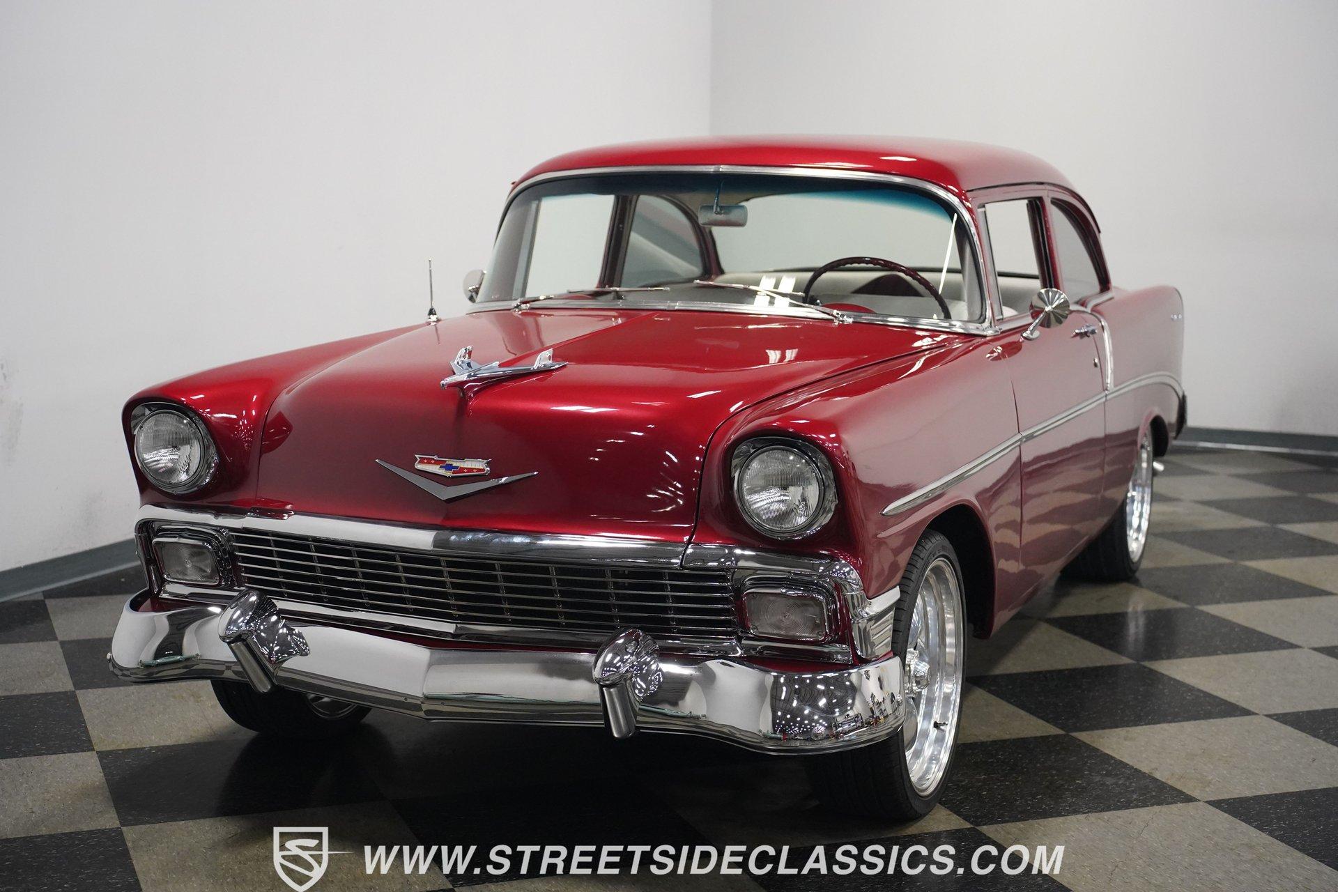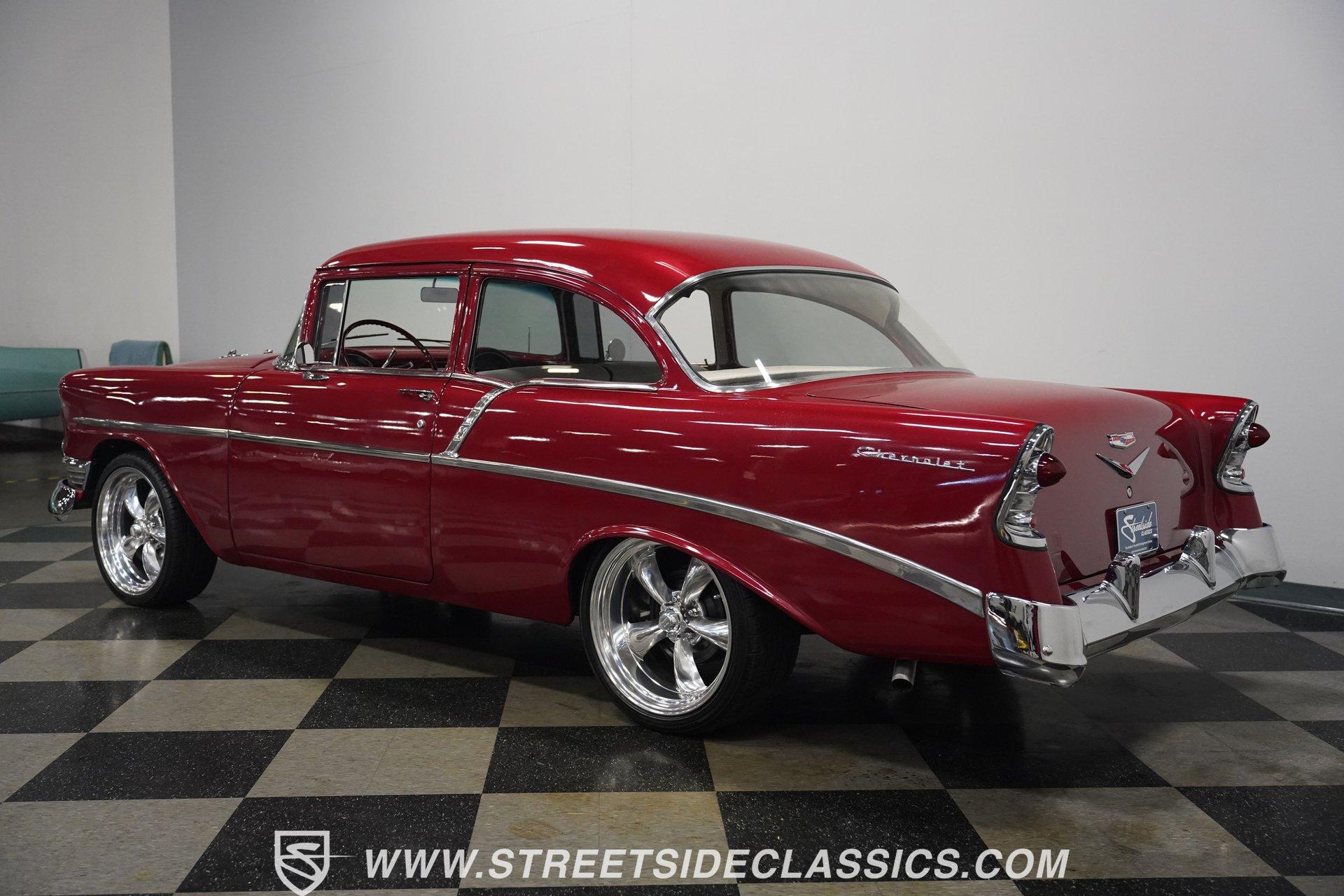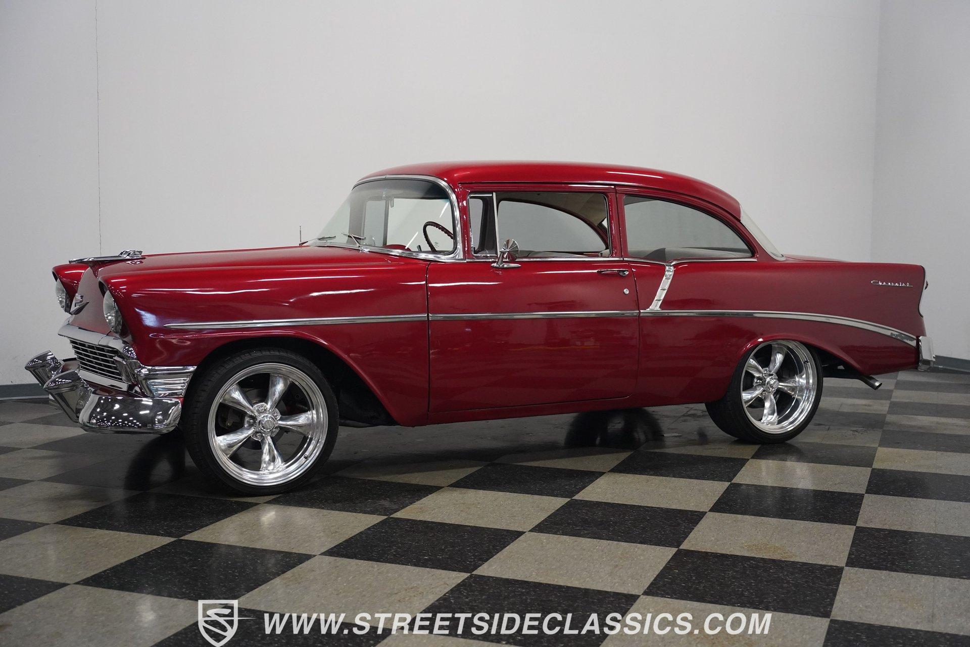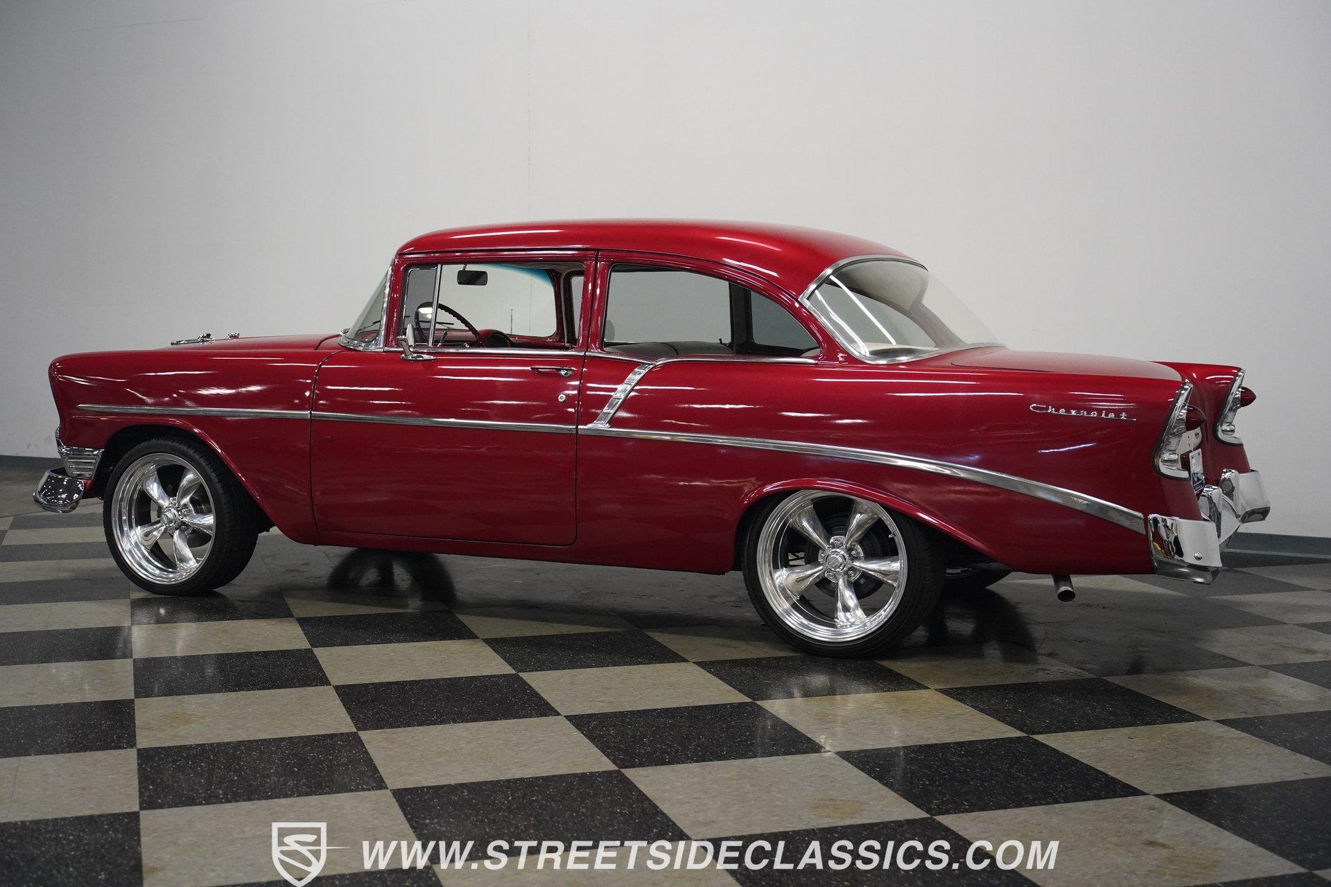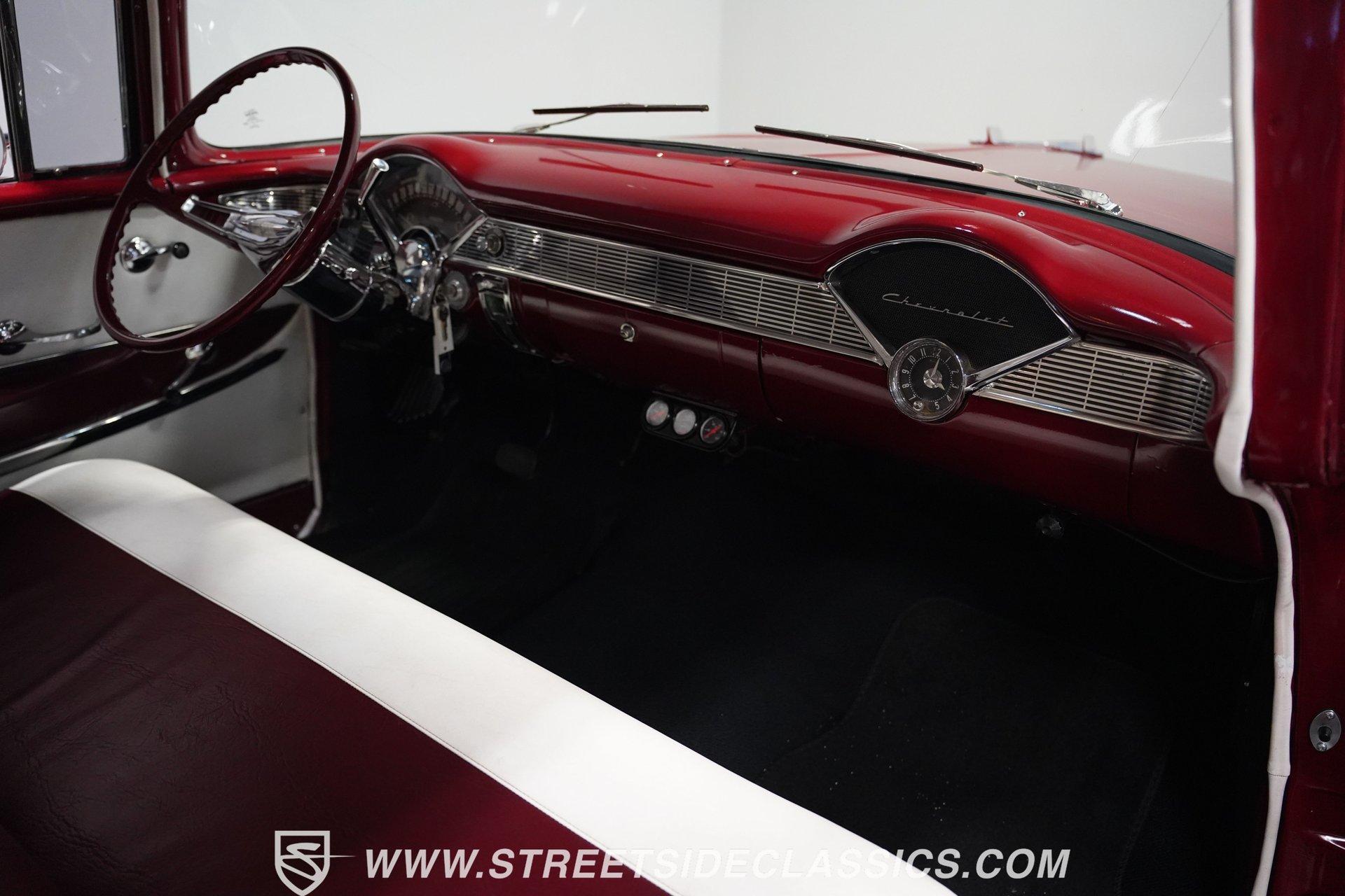 This 1956 Chevrolet 210 rolls on massive American Racing 20-inch wheels, creating a street-dominating stance that announces its arrival from blocks away. The dark red paint accentuates every crisp body line, while the polished chrome trim adds brilliant contrast to this classic's exterior. The wide rubber setup features 245/35ZR20 tires up front and aggressive 275/35ZR20 tires in the rear. The dual exhaust exits cleanly through the rear bumper, completing this two-door's powerful profile. The maroon and white interior combination reflects the precision and style of 1950s American craftsmanship, updated with carefully chosen modifications. The vinyl bench seat anchors the cabin, while the tilt steering column puts you in complete control. The auxiliary gauges mounted below the dash deliver crucial performance data. Power steering allows for quick directional changes, while the stock original gauge cluster maintains the period-correct appeal. A 350 V8 engine amplifies this Chevy's performance capabilities, drawing air through an Edelbrock 1405 carburetor with manual choke. The TH350 3-speed automatic transmission distributes power to the rear end. The chassis features power front disc brakes for rapid deceleration, while the dual exhaust system with Thrush mufflers produces a deep, resonant tone. The aluminum radiator maintains optimal temperature control during extended driving sessions. HIGHLIGHTS: 350 V8 Engine TH350 3-Speed Automatic Transmission Edelbrock 1405 Carburetor with Manual Choke Power Front Disc Brakes Dual Exhaust with Thrush Mufflers Aluminum Radiator Power Steering Dark Red Paint 20-inch American Racing Wheels with 245/35ZR20 Front, 275/35ZR20 Rear Tires Chrome Trim and Brightwork Dual Exhaust Tips Maroon and White Interior with Bench Seat Tilt Steering Column Auxiliary Gauges Stock Original Gauge Cluster Custom Door Panels Owner's Manual Parts Catalog Wiring Diagram This 1956 Chevrolet 210 combines its 350 V8 power with American Racing wheels and dual Thrush exhaust. The maroon and white interior pairs perfectly with the dark red exterior, making this classic two-door Chevy ready for the road. Call today!