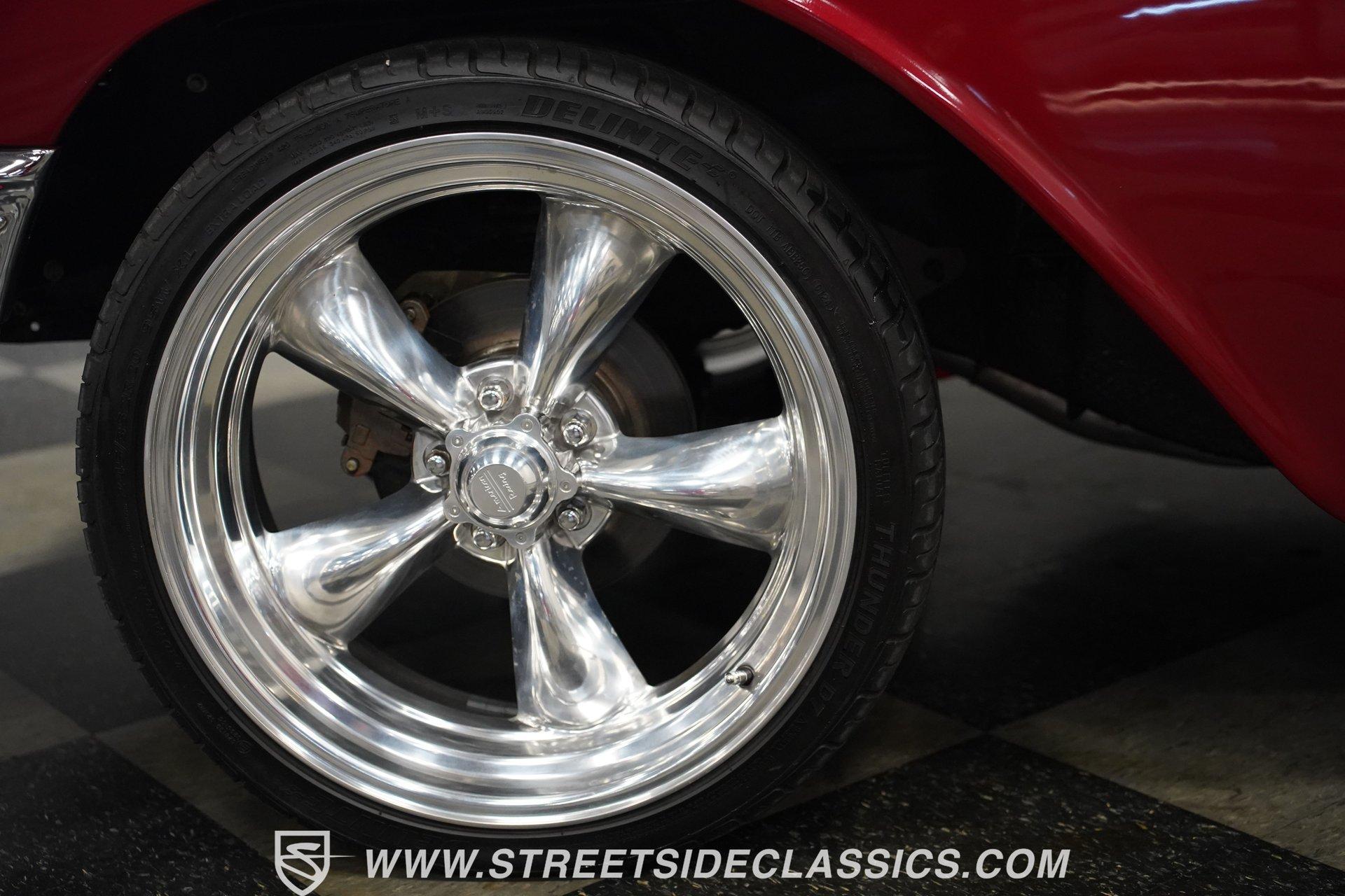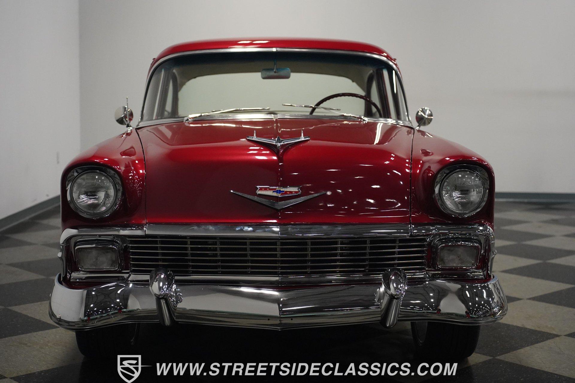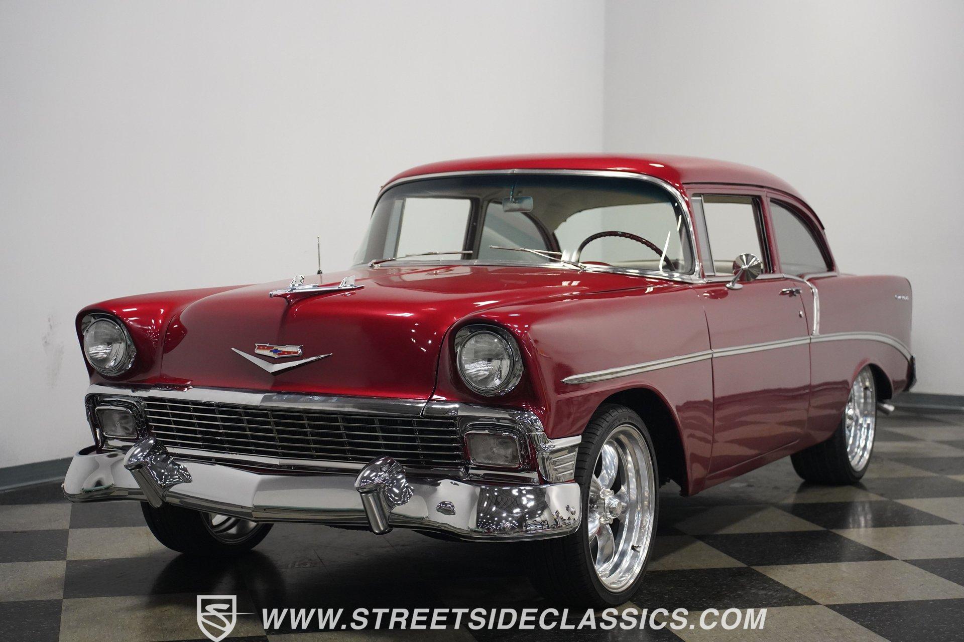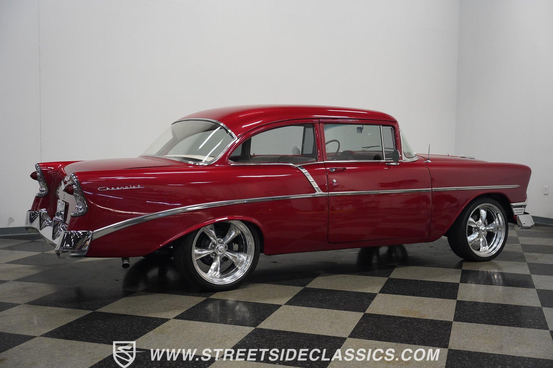 This 1956 Chevrolet 210 rolls on massive American Racing 20-inch wheels, creating a street-dominating stance that announces its arrival from blocks away. The dark red paint accentuates every crisp body line, while the polished chrome trim adds brilliant contrast to this classic's exterior. The wide rubber setup features 245/35ZR20 tires up front and aggressive 275/35ZR20 tires in the rear. The dual exhaust exits cleanly through the rear bumper, completing this two-door's powerful profile. The maroon and white interior combination reflects the precision and style of 1950s American craftsmanship, updated with carefully chosen modifications. The vinyl bench seat anchors the cabin, while the tilt steering column puts you in complete control. The auxiliary gauges mounted below the dash deliver crucial performance data. Power steering allows for quick directional changes, while the stock original gauge cluster maintains the period-correct appeal. A 350 V8 engine amplifies this Chevy's performance capabilities, drawing air through an Edelbrock 1405 carburetor with manual choke. The TH350 3-speed automatic transmission distributes power to the rear end. The chassis features power front disc brakes for rapid deceleration, while the dual exhaust system with Thrush mufflers produces a deep, resonant tone. The aluminum radiator maintains optimal temperature control during extended driving sessions. HIGHLIGHTS: 350 V8 Engine TH350 3-Speed Automatic Transmission Edelbrock 1405 Carburetor with Manual Choke Power Front Disc Brakes Dual Exhaust with Thrush Mufflers Aluminum Radiator Power Steering Dark Red Paint 20-inch American Racing Wheels with 245/35ZR20 Front, 275/35ZR20 Rear Tires Chrome Trim and Brightwork Dual Exhaust Tips Maroon and White Interior with Bench Seat Tilt Steering Column Auxiliary Gauges Stock Original Gauge Cluster Custom Door Panels Owner's Manual Parts Catalog Wiring Diagram This 1956 Chevrolet 210 combines its 350 V8 power with American Racing wheels and dual Thrush exhaust. The maroon and white interior pairs perfectly with the dark red exterior, making this classic two-door Chevy ready for the road. Call today!