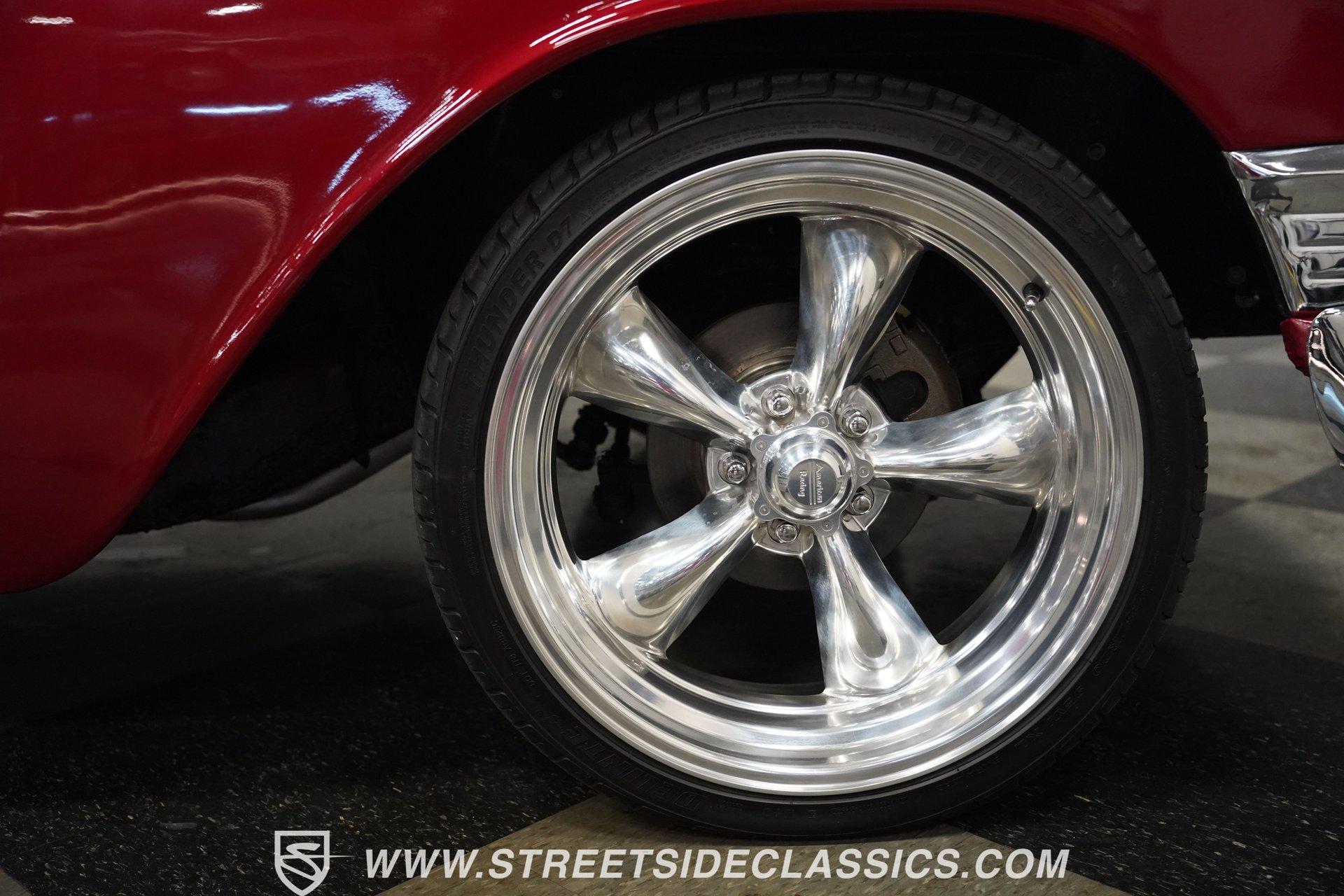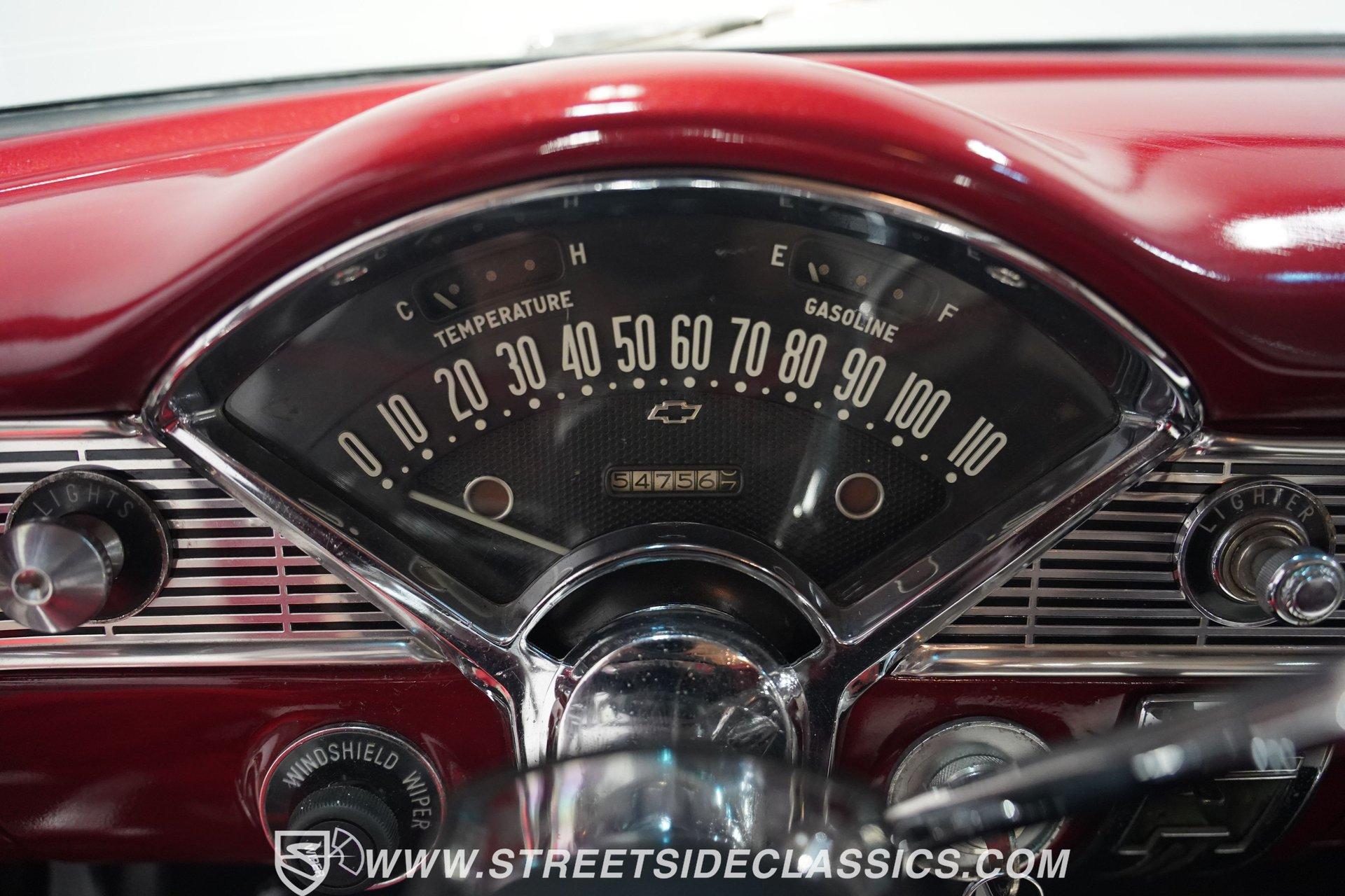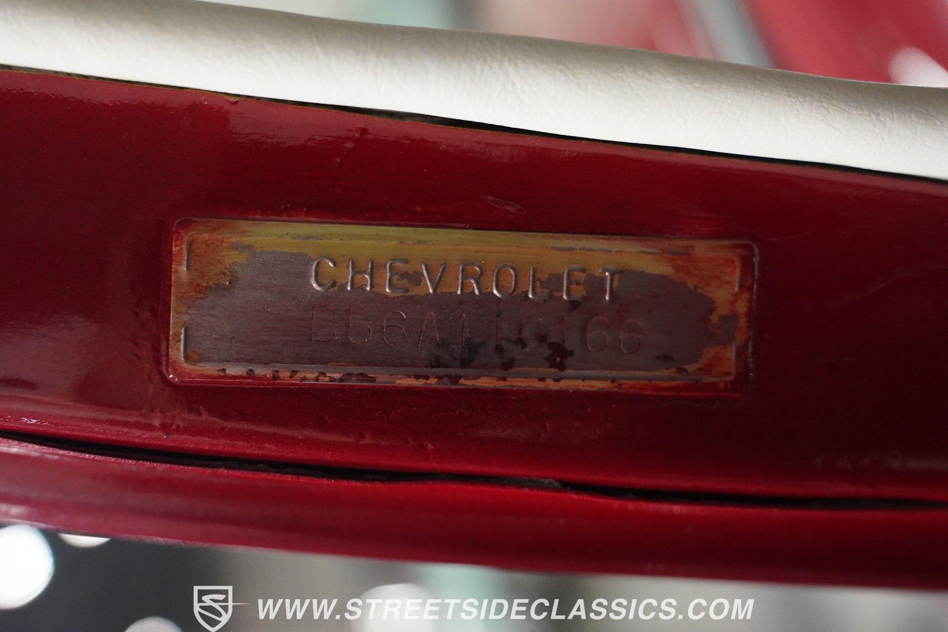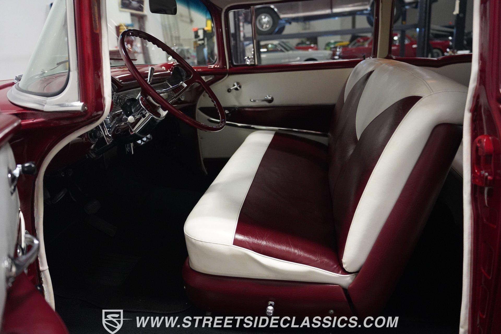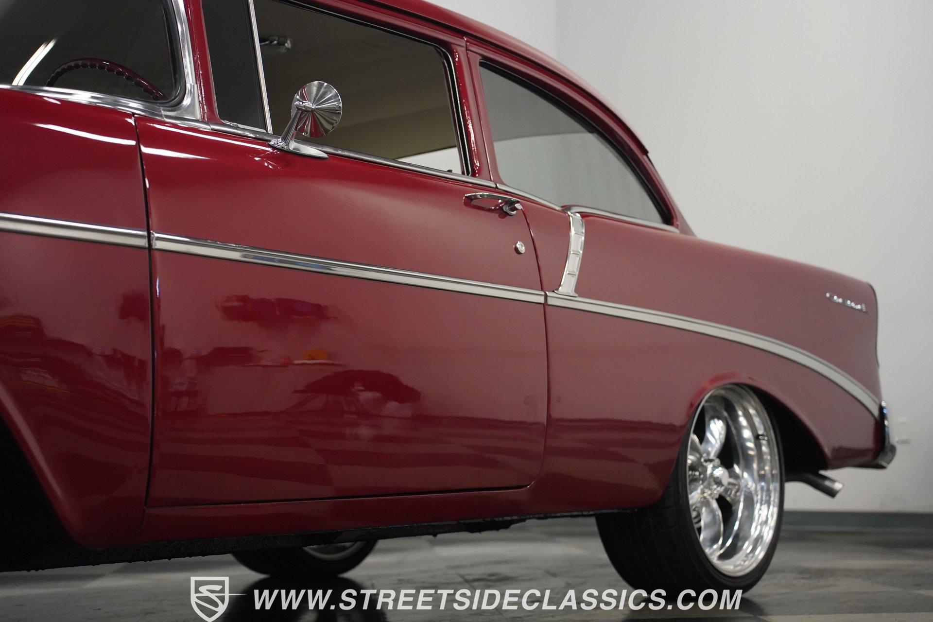 This 1956 Chevrolet 210 rolls on massive American Racing 20-inch wheels, creating a street-dominating stance that announces its arrival from blocks away. The dark red paint accentuates every crisp body line, while the polished chrome trim adds brilliant contrast to this classic's exterior. The wide rubber setup features 245/35ZR20 tires up front and aggressive 275/35ZR20 tires in the rear. The dual exhaust exits cleanly through the rear bumper, completing this two-door's powerful profile. The maroon and white interior combination reflects the precision and style of 1950s American craftsmanship, updated with carefully chosen modifications. The vinyl bench seat anchors the cabin, while the tilt steering column puts you in complete control. The auxiliary gauges mounted below the dash deliver crucial performance data. Power steering allows for quick directional changes, while the stock original gauge cluster maintains the period-correct appeal. A 350 V8 engine amplifies this Chevy's performance capabilities, drawing air through an Edelbrock 1405 carburetor with manual choke. The TH350 3-speed automatic transmission distributes power to the rear end. The chassis features power front disc brakes for rapid deceleration, while the dual exhaust system with Thrush mufflers produces a deep, resonant tone. The aluminum radiator maintains optimal temperature control during extended driving sessions. HIGHLIGHTS: 350 V8 Engine TH350 3-Speed Automatic Transmission Edelbrock 1405 Carburetor with Manual Choke Power Front Disc Brakes Dual Exhaust with Thrush Mufflers Aluminum Radiator Power Steering Dark Red Paint 20-inch American Racing Wheels with 245/35ZR20 Front, 275/35ZR20 Rear Tires Chrome Trim and Brightwork Dual Exhaust Tips Maroon and White Interior with Bench Seat Tilt Steering Column Auxiliary Gauges Stock Original Gauge Cluster Custom Door Panels Owner's Manual Parts Catalog Wiring Diagram This 1956 Chevrolet 210 combines its 350 V8 power with American Racing wheels and dual Thrush exhaust. The maroon and white interior pairs perfectly with the dark red exterior, making this classic two-door Chevy ready for the road. Call today!