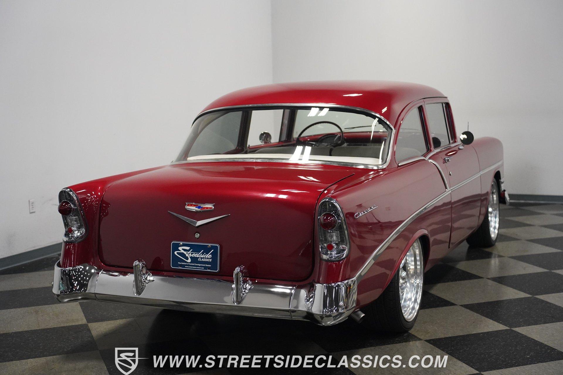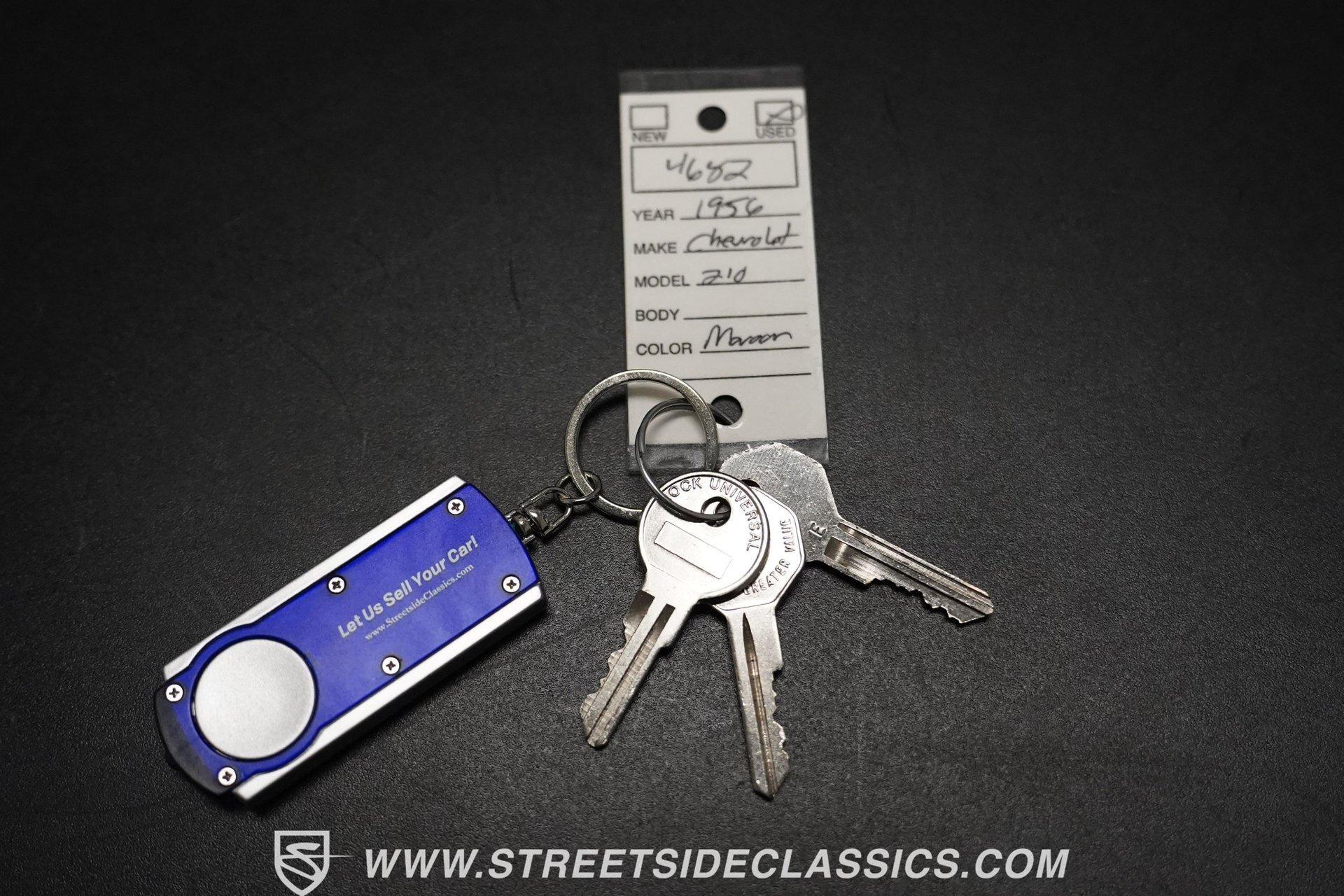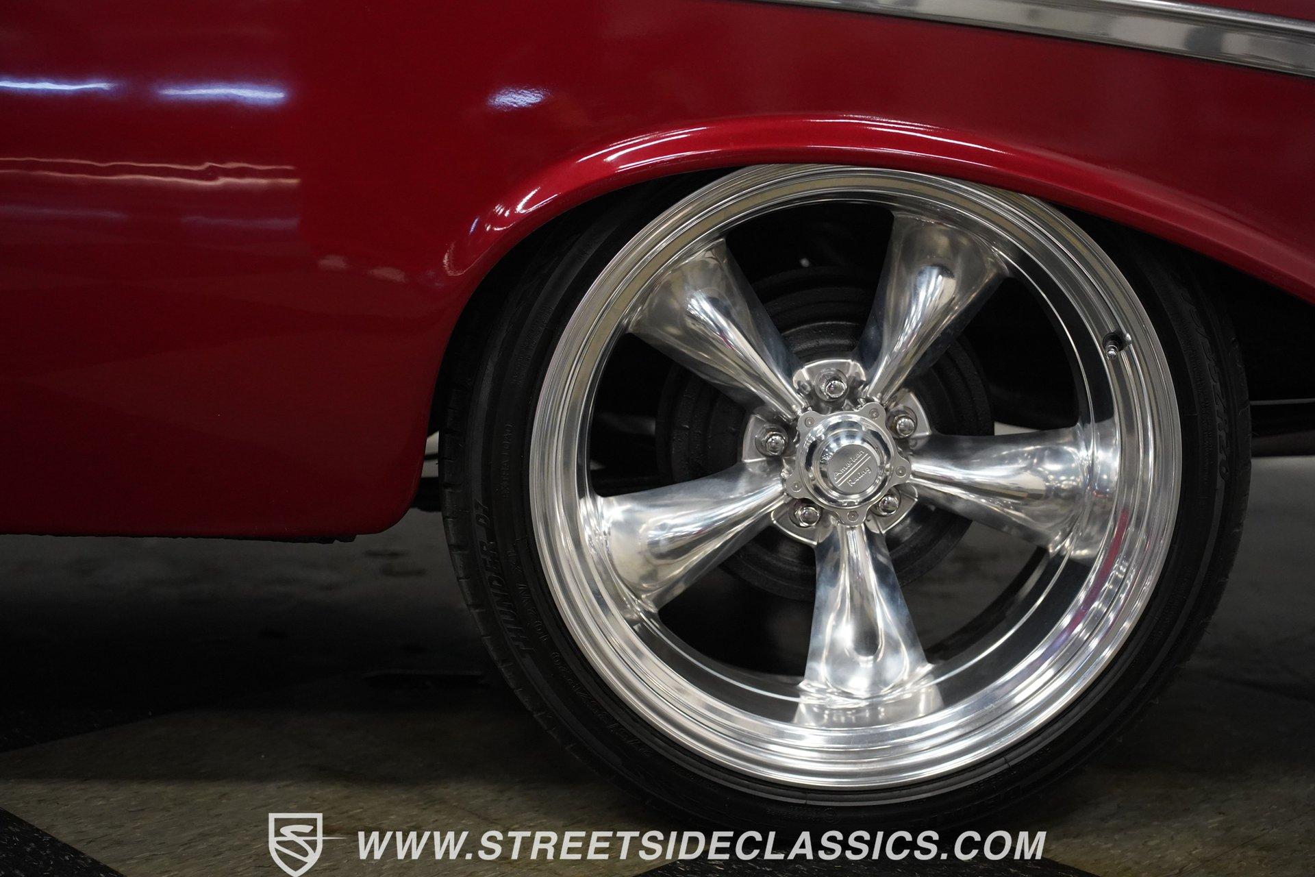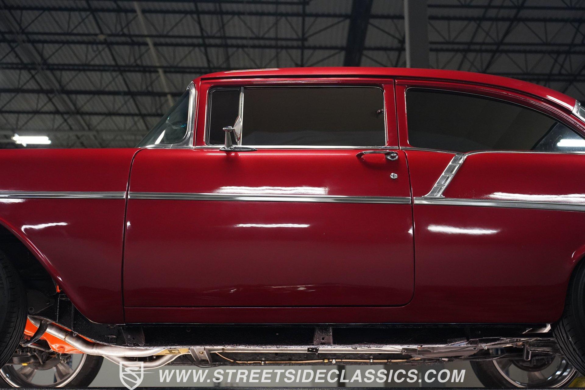 This 1956 Chevrolet 210 rolls on massive American Racing 20-inch wheels, creating a street-dominating stance that announces its arrival from blocks away. The dark red paint accentuates every crisp body line, while the polished chrome trim adds brilliant contrast to this classic's exterior. The wide rubber setup features 245/35ZR20 tires up front and aggressive 275/35ZR20 tires in the rear. The dual exhaust exits cleanly through the rear bumper, completing this two-door's powerful profile. The maroon and white interior combination reflects the precision and style of 1950s American craftsmanship, updated with carefully chosen modifications. The vinyl bench seat anchors the cabin, while the tilt steering column puts you in complete control. The auxiliary gauges mounted below the dash deliver crucial performance data. Power steering allows for quick directional changes, while the stock original gauge cluster maintains the period-correct appeal. A 350 V8 engine amplifies this Chevy's performance capabilities, drawing air through an Edelbrock 1405 carburetor with manual choke. The TH350 3-speed automatic transmission distributes power to the rear end. The chassis features power front disc brakes for rapid deceleration, while the dual exhaust system with Thrush mufflers produces a deep, resonant tone. The aluminum radiator maintains optimal temperature control during extended driving sessions. HIGHLIGHTS: 350 V8 Engine TH350 3-Speed Automatic Transmission Edelbrock 1405 Carburetor with Manual Choke Power Front Disc Brakes Dual Exhaust with Thrush Mufflers Aluminum Radiator Power Steering Dark Red Paint 20-inch American Racing Wheels with 245/35ZR20 Front, 275/35ZR20 Rear Tires Chrome Trim and Brightwork Dual Exhaust Tips Maroon and White Interior with Bench Seat Tilt Steering Column Auxiliary Gauges Stock Original Gauge Cluster Custom Door Panels Owner's Manual Parts Catalog Wiring Diagram This 1956 Chevrolet 210 combines its 350 V8 power with American Racing wheels and dual Thrush exhaust. The maroon and white interior pairs perfectly with the dark red exterior, making this classic two-door Chevy ready for the road. Call today!
